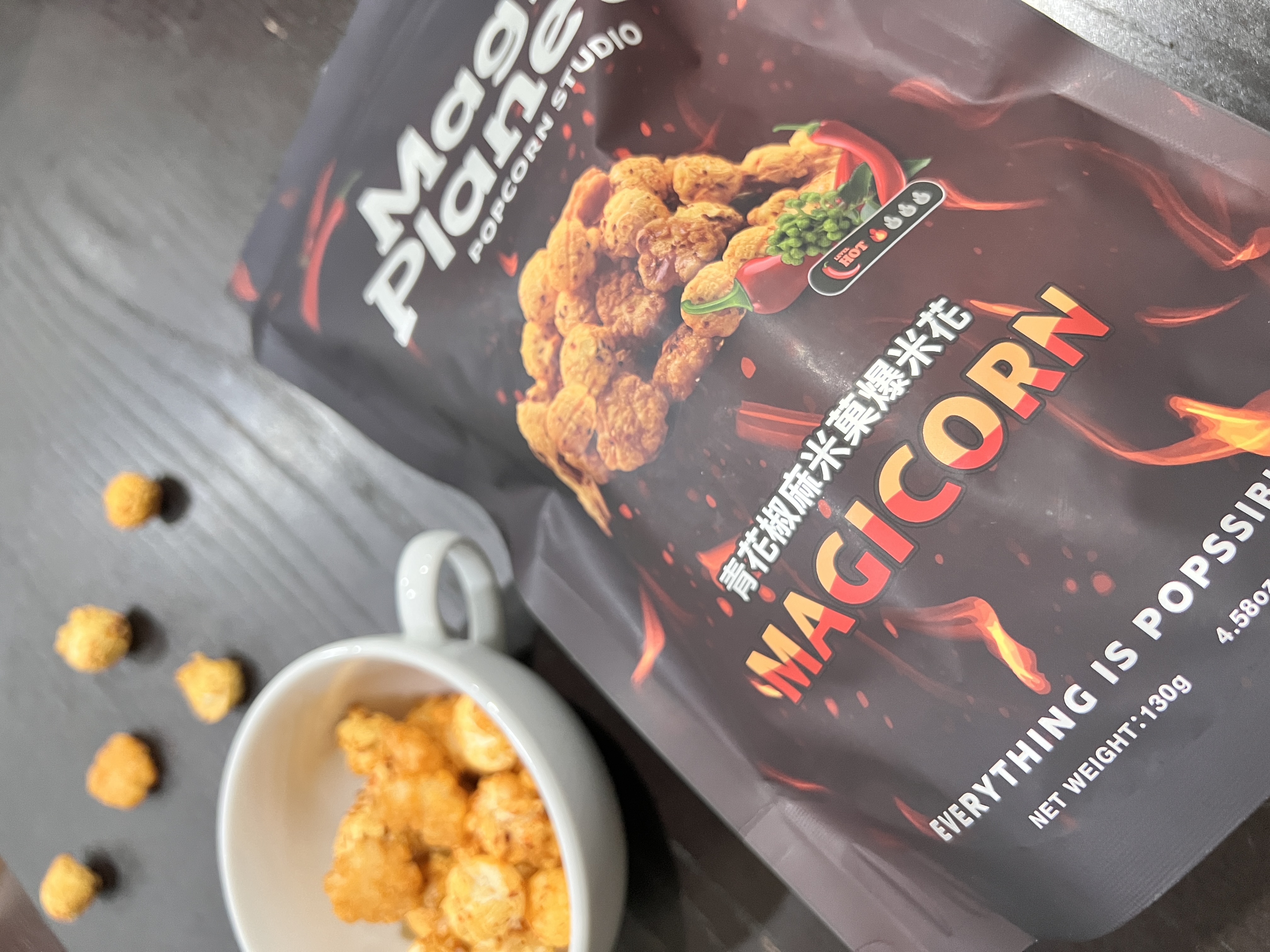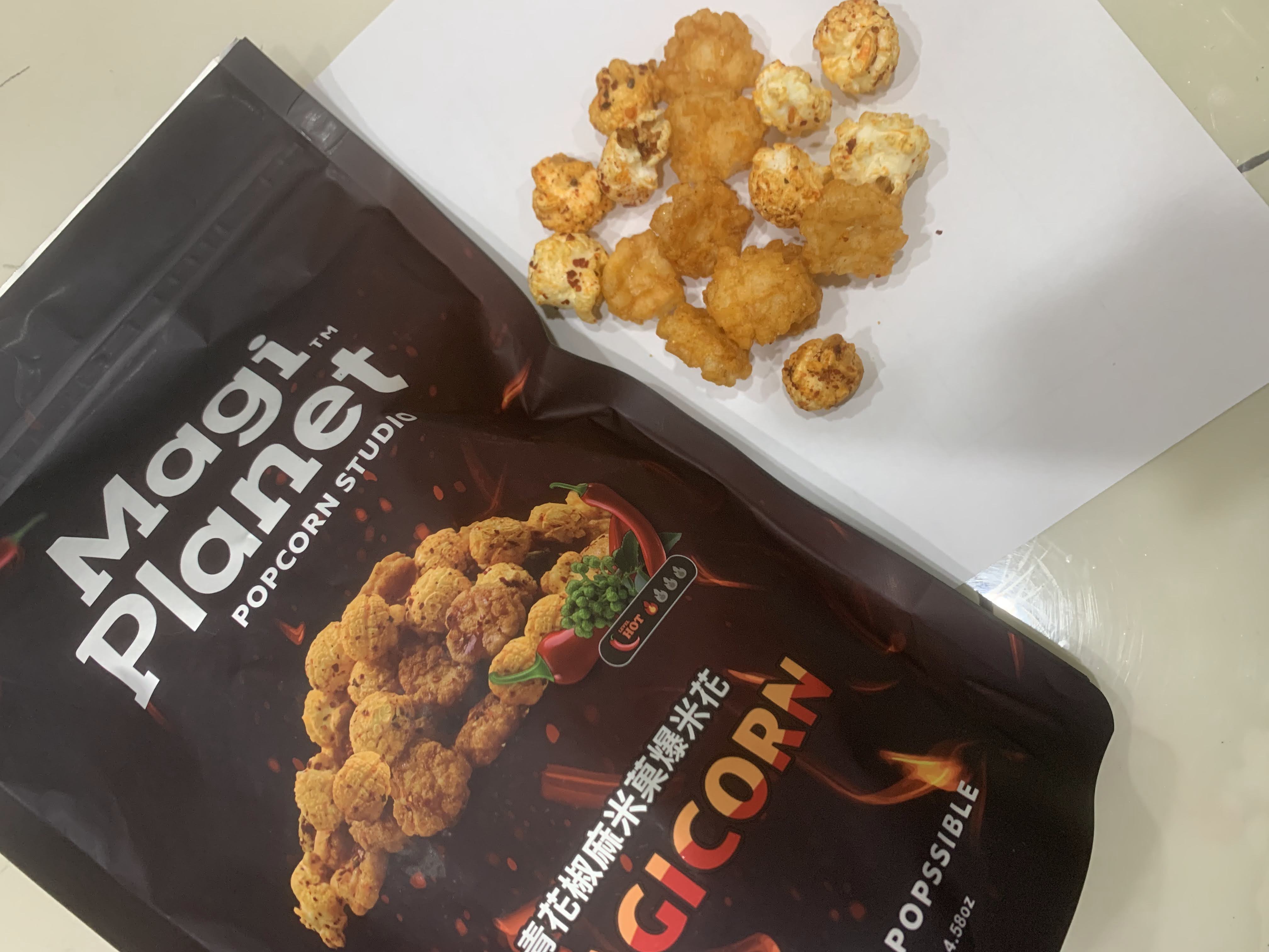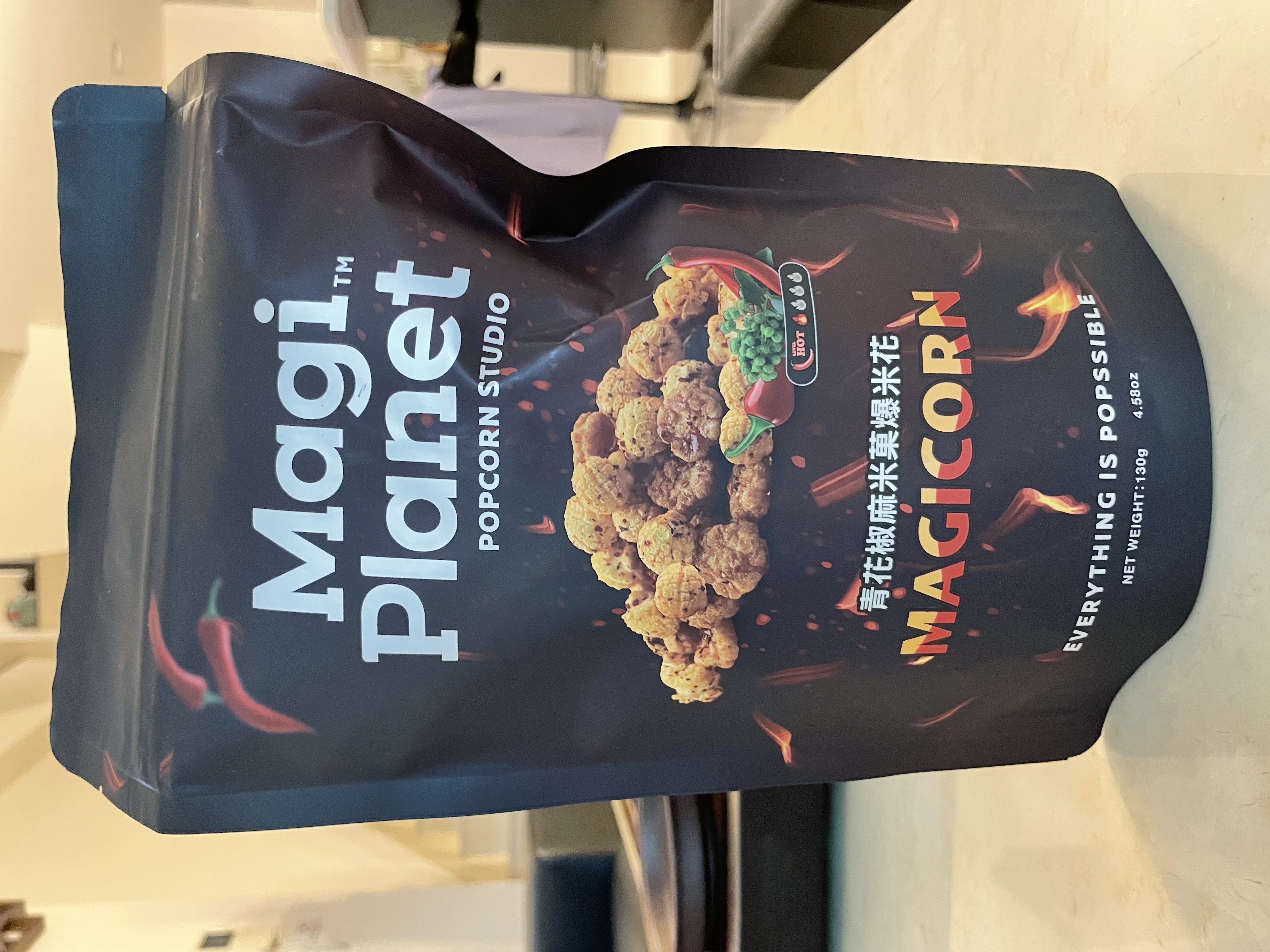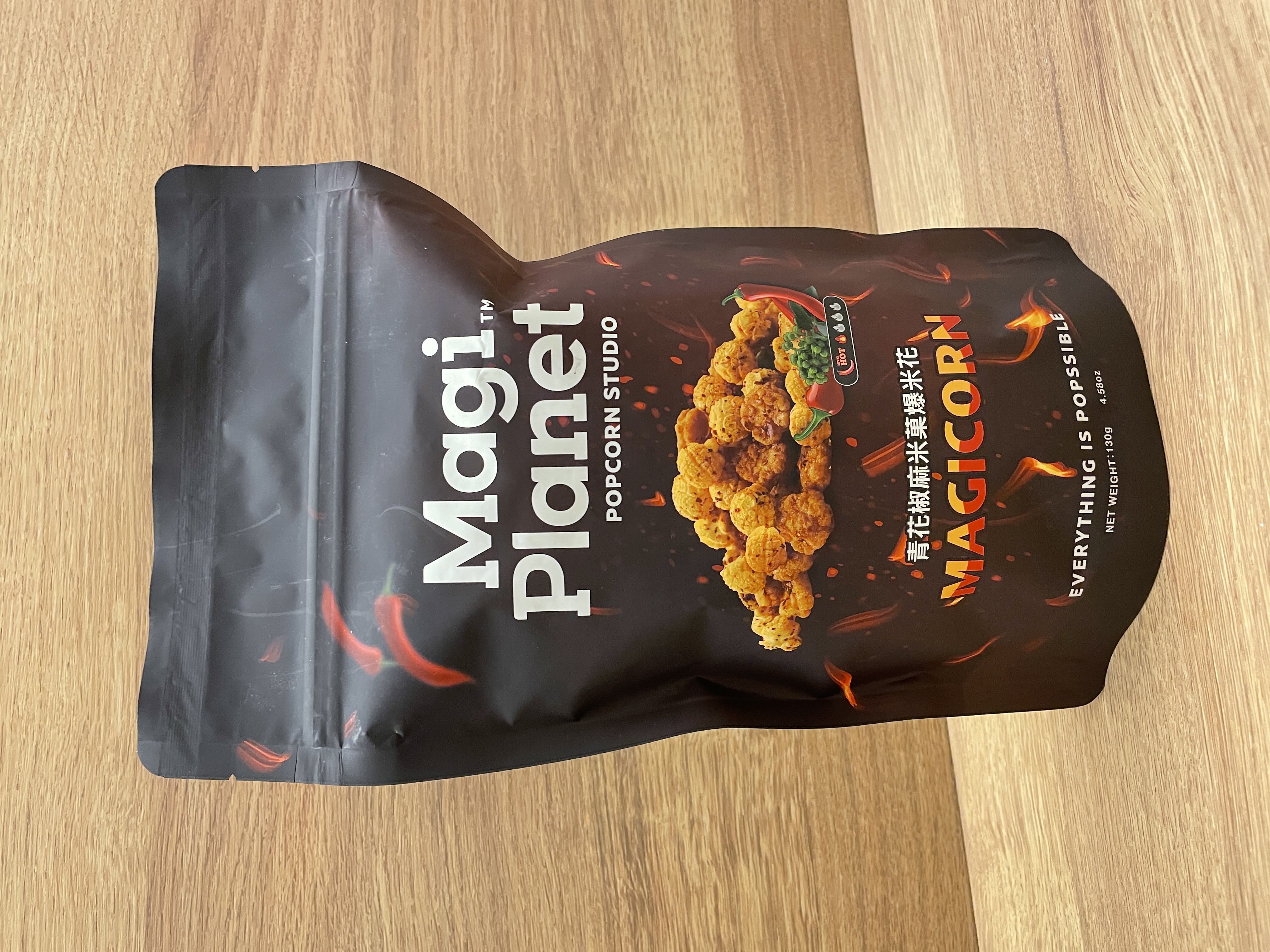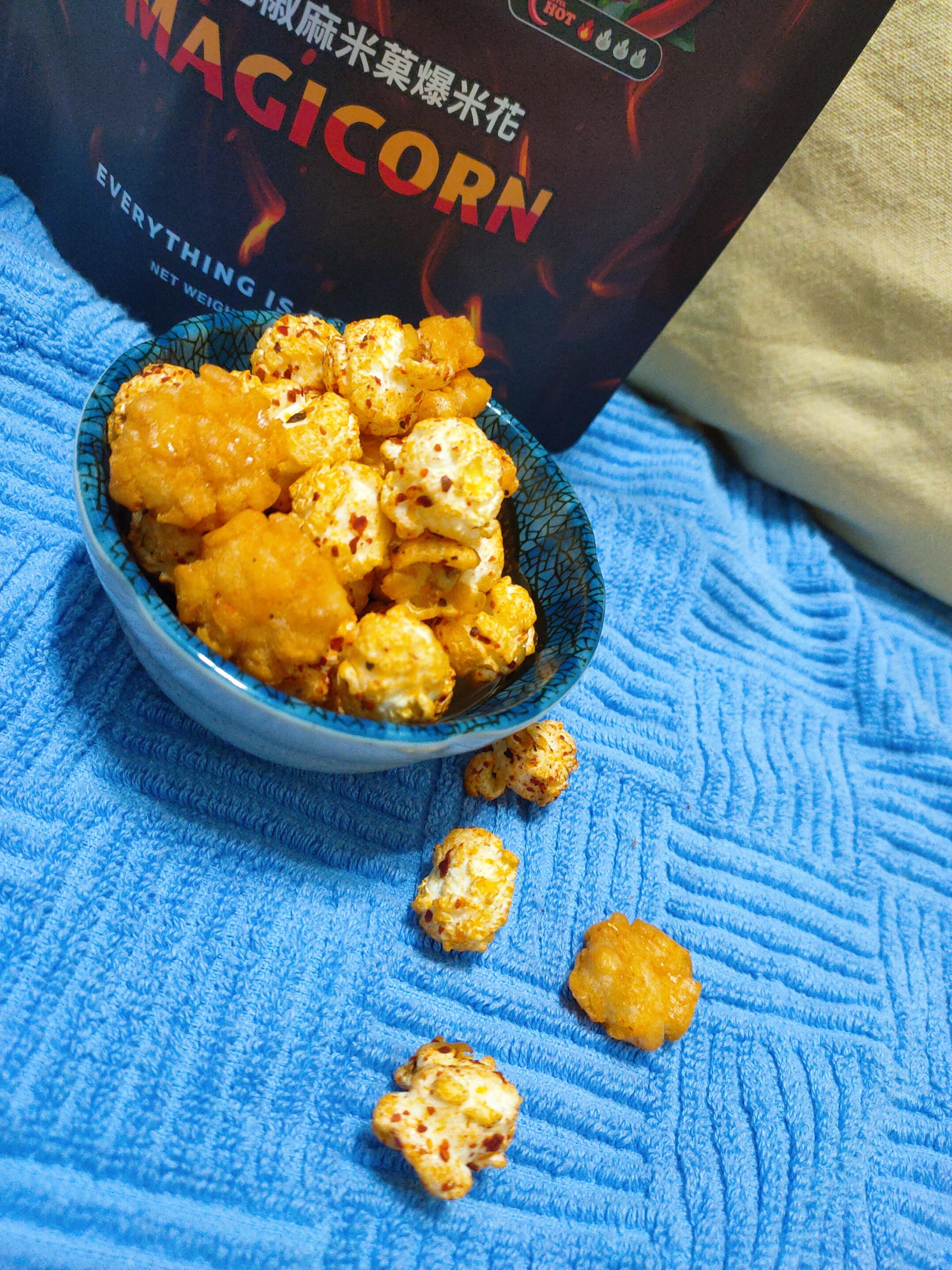 爆米花【 糖 ( 砂糖、葡萄糖、海藻糖)、進口玉米粒( 非基因改造)、棕櫚油、青花椒調味粉[ 椒麻粉( 辣椒粉、花椒粉)、麥芽糊精、酵母抽出物、鹽、醬油粉( 純釀造醬油、麥芽糊精、鹽、砂糖、焦糖色素、琥珀酸二鈉、5'-次黃嘌呤核苷磷酸二鈉、5'-鳥嘌呤核苷磷酸二鈉)、小麥纖維、油性辣椒紅( 紅椒色素、精製葵花油)、花椒萃取物]】
