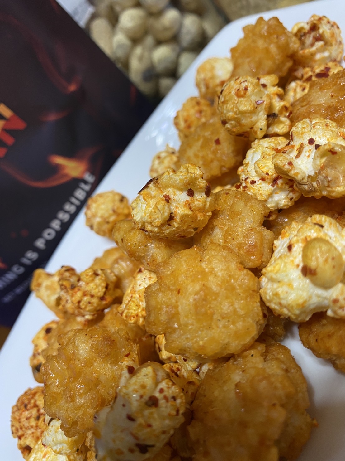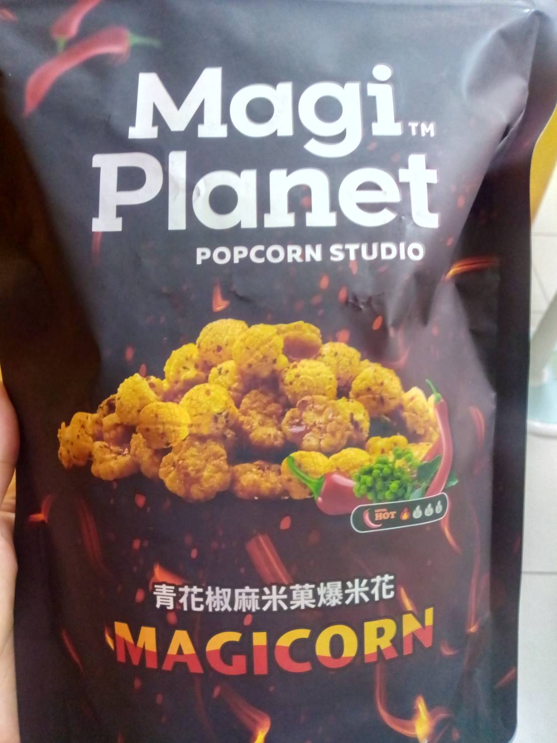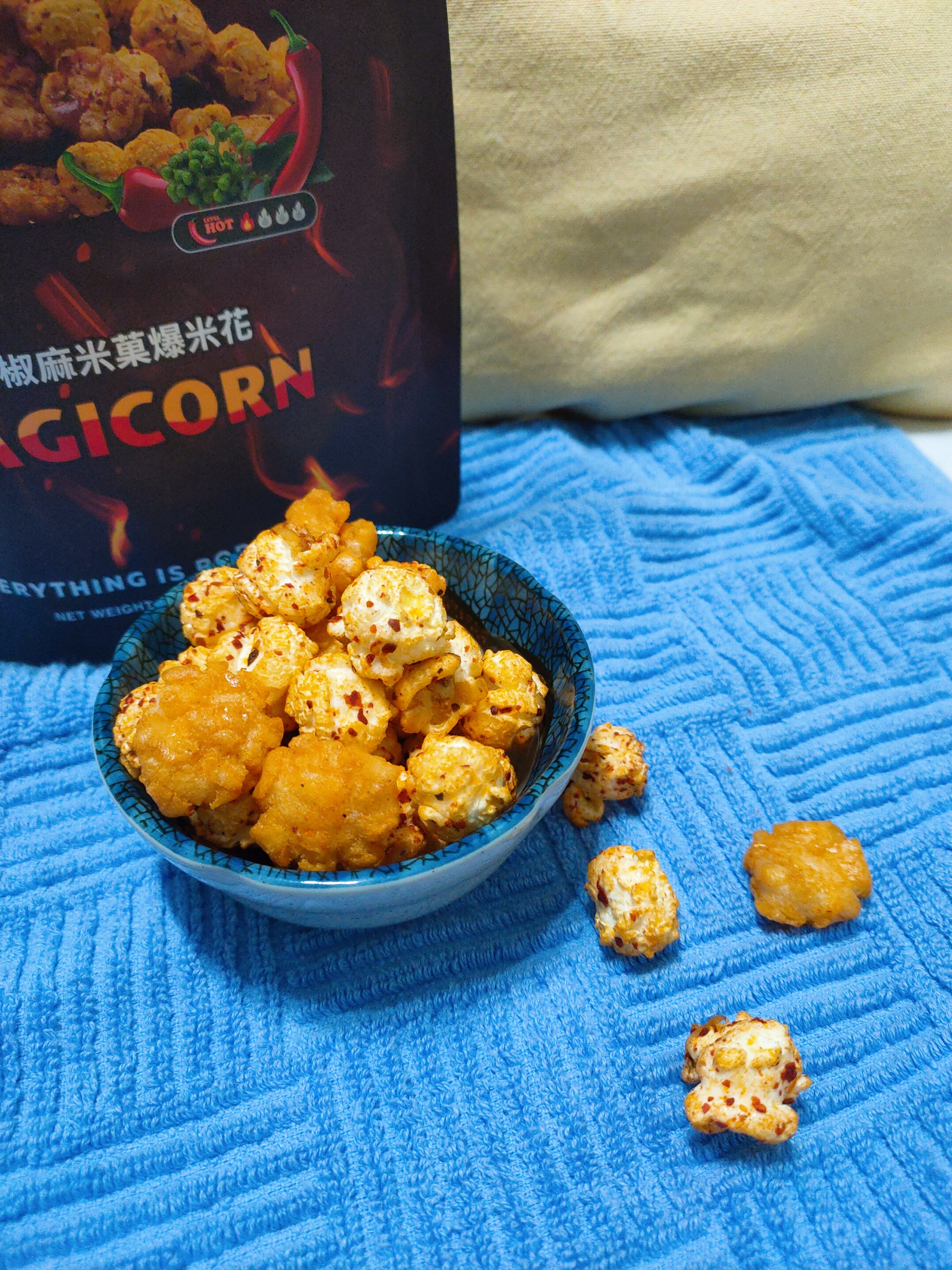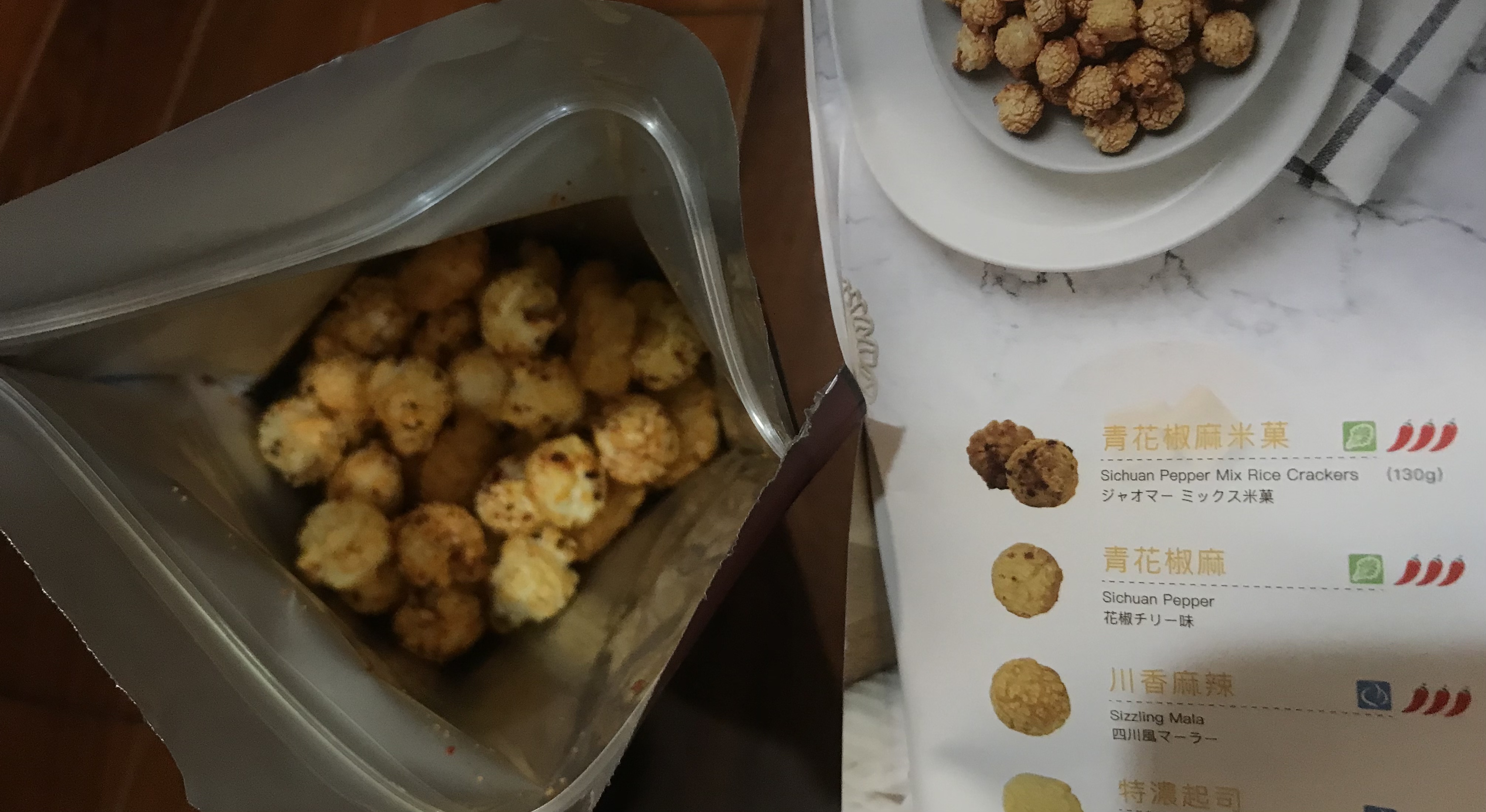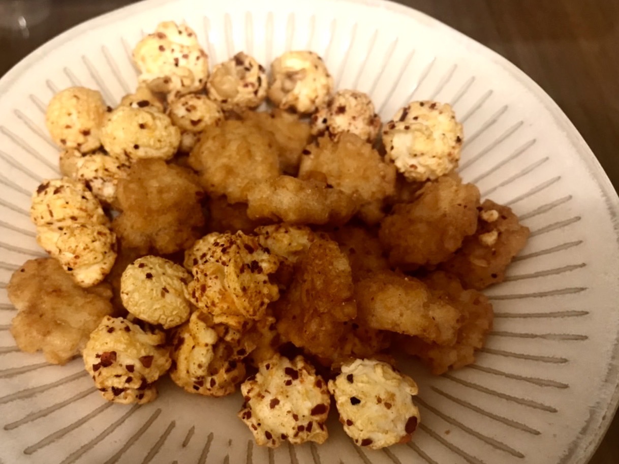 爆米花【 糖 ( 砂糖、葡萄糖、海藻糖)、進口玉米粒( 非基因改造)、棕櫚油、青花椒調味粉[ 椒麻粉( 辣椒粉、花椒粉)、麥芽糊精、酵母抽出物、鹽、醬油粉( 純釀造醬油、麥芽糊精、鹽、砂糖、焦糖色素、琥珀酸二鈉、5'-次黃嘌呤核苷磷酸二鈉、5'-鳥嘌呤核苷磷酸二鈉)、小麥纖維、油性辣椒紅( 紅椒色素、精製葵花油)、花椒萃取物]】