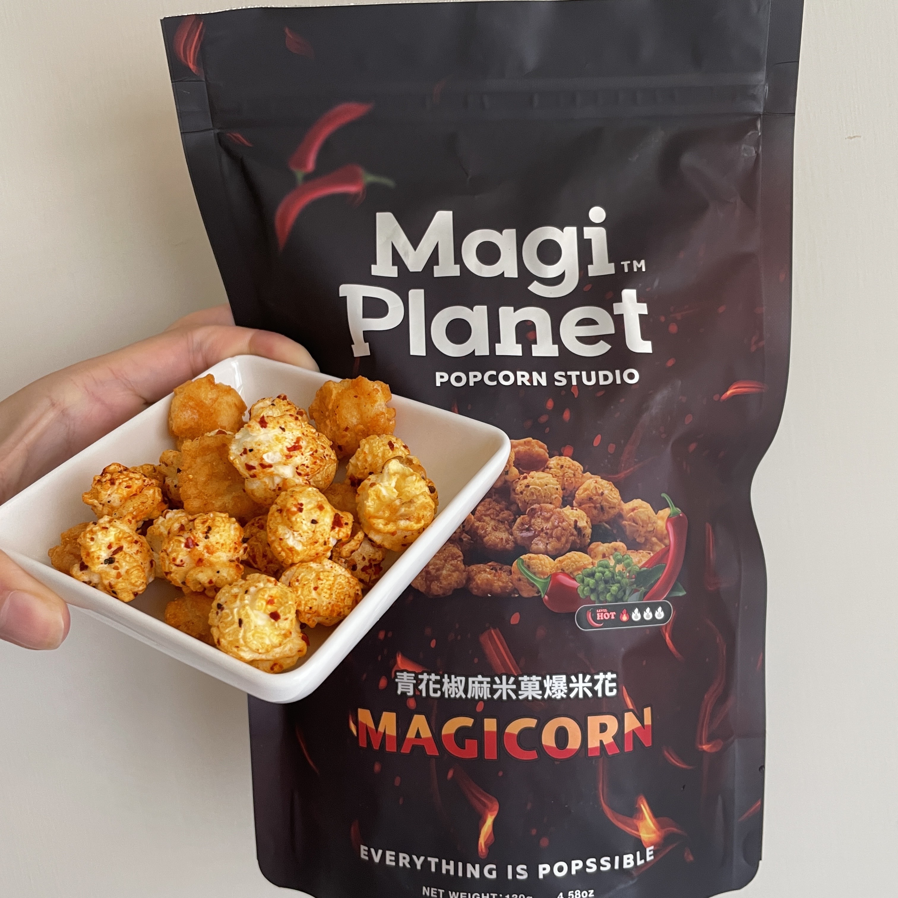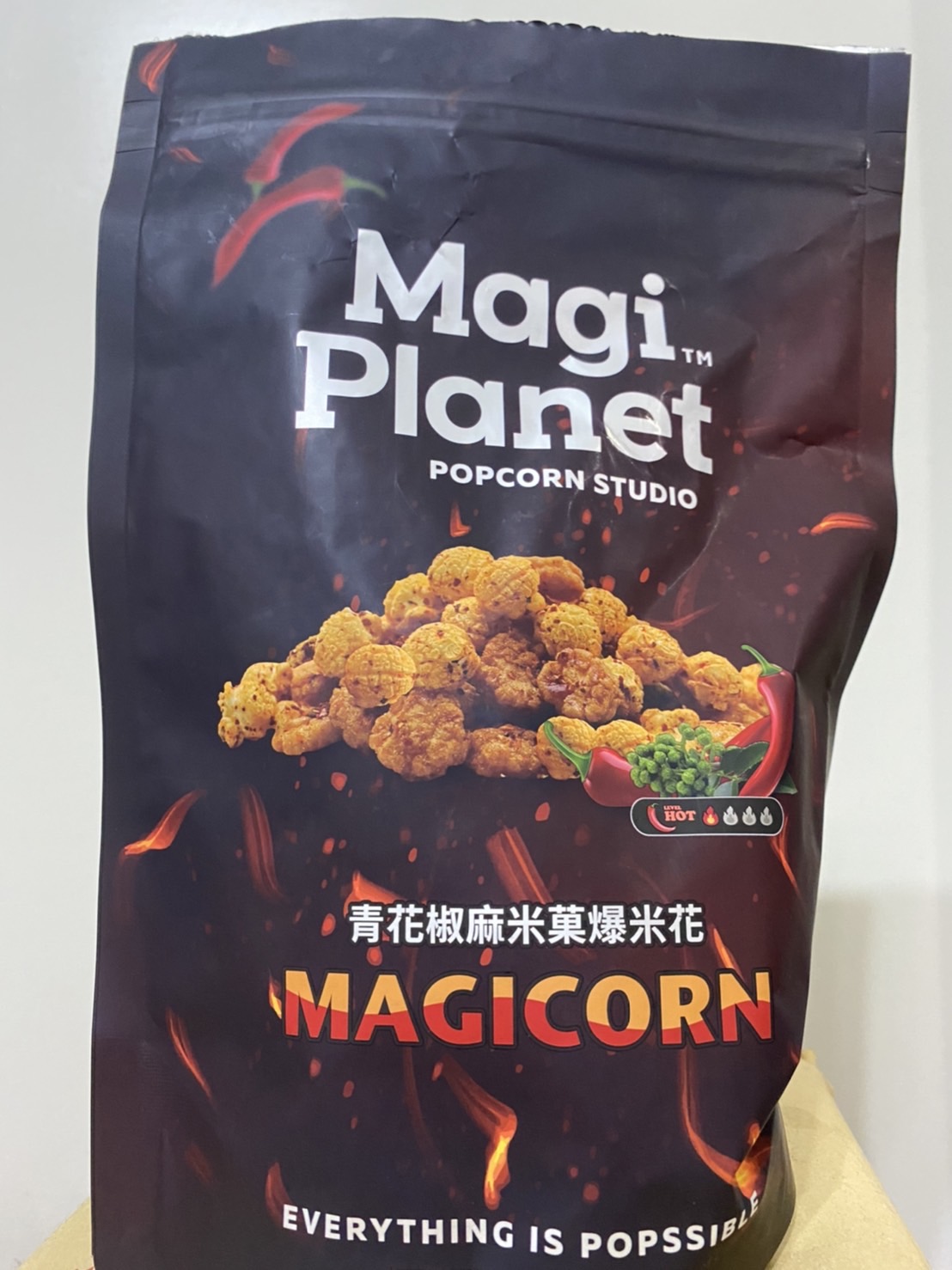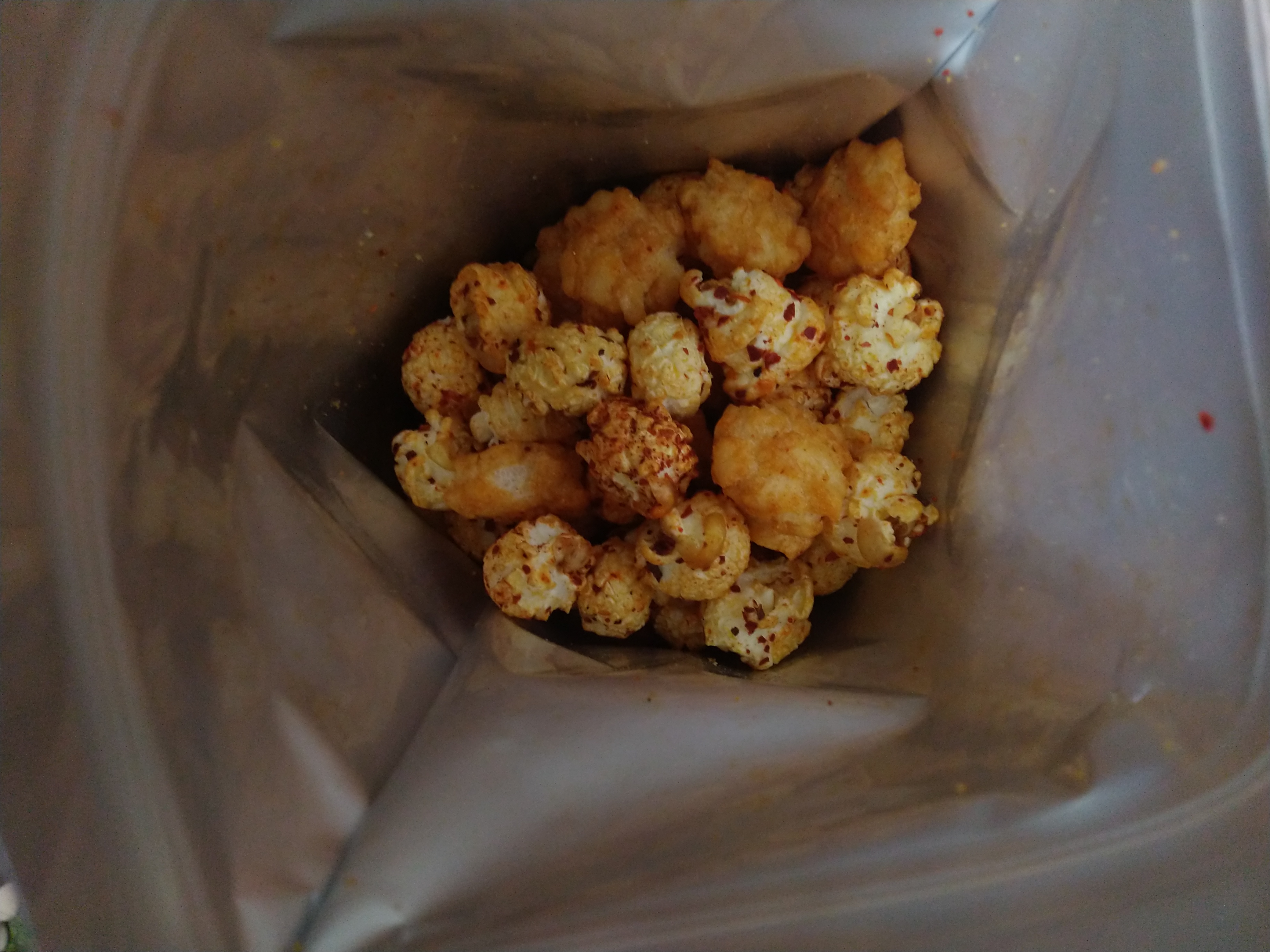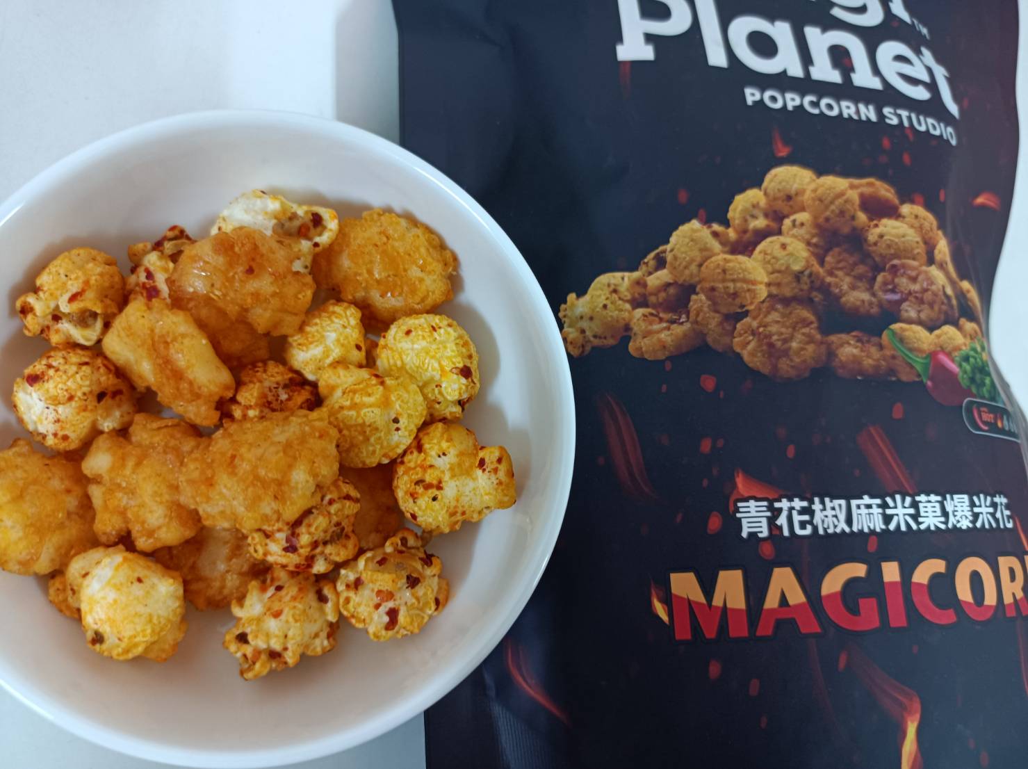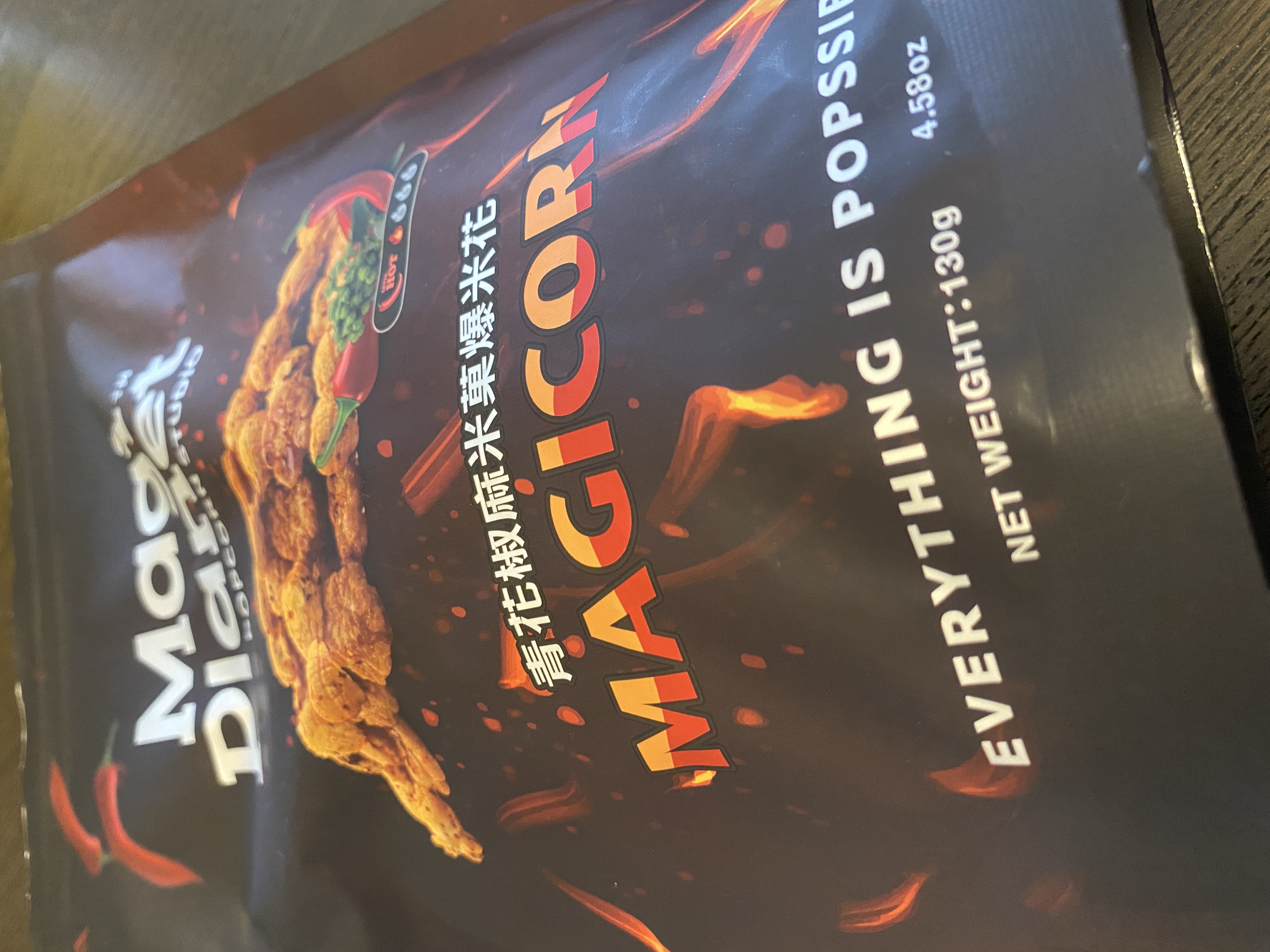 爆米花【 糖 ( 砂糖、葡萄糖、海藻糖)、進口玉米粒( 非基因改造)、棕櫚油、青花椒調味粉[ 椒麻粉( 辣椒粉、花椒粉)、麥芽糊精、酵母抽出物、鹽、醬油粉( 純釀造醬油、麥芽糊精、鹽、砂糖、焦糖色素、琥珀酸二鈉、5'-次黃嘌呤核苷磷酸二鈉、5'-鳥嘌呤核苷磷酸二鈉)、小麥纖維、油性辣椒紅( 紅椒色素、精製葵花油)、花椒萃取物]】