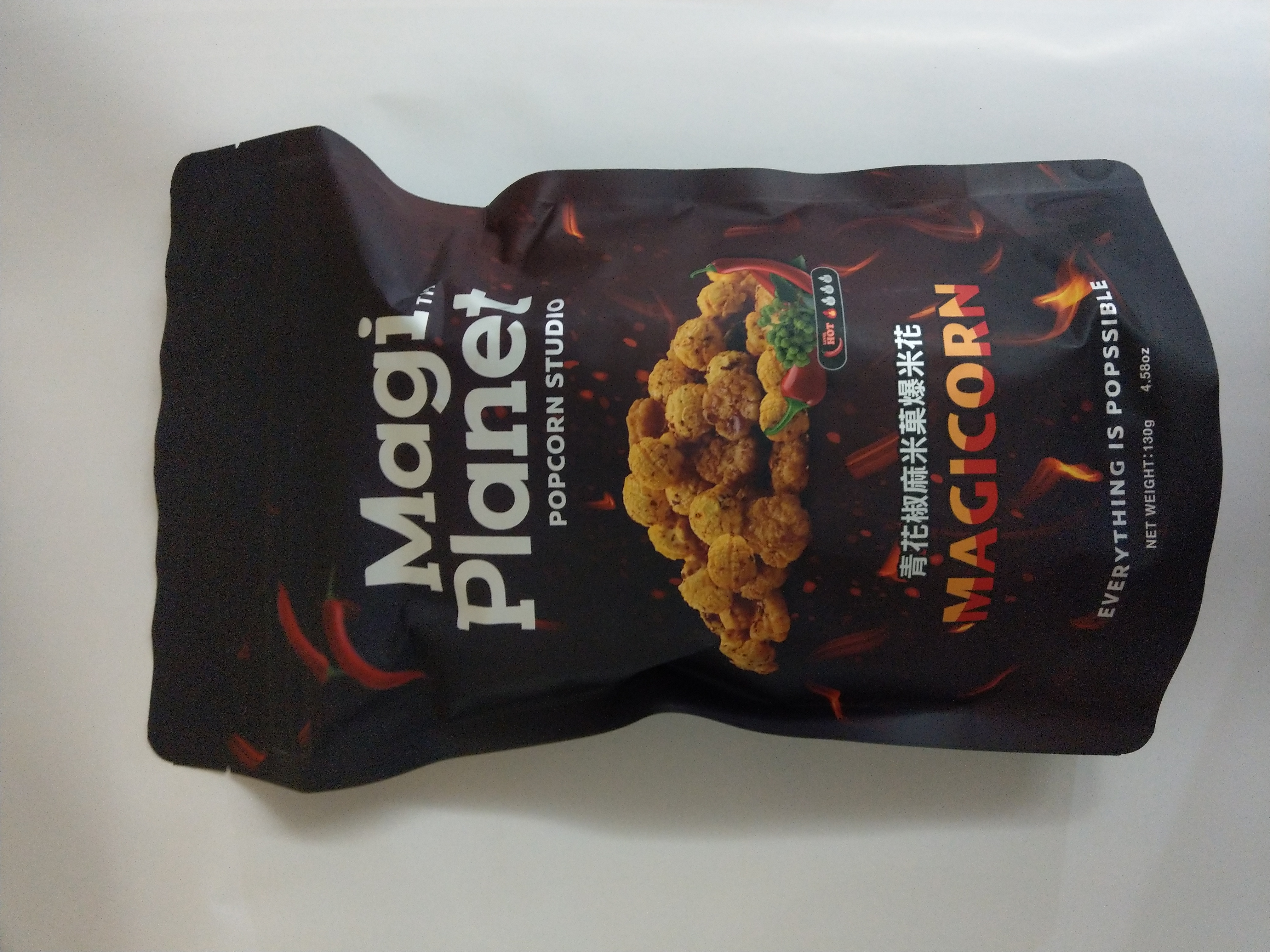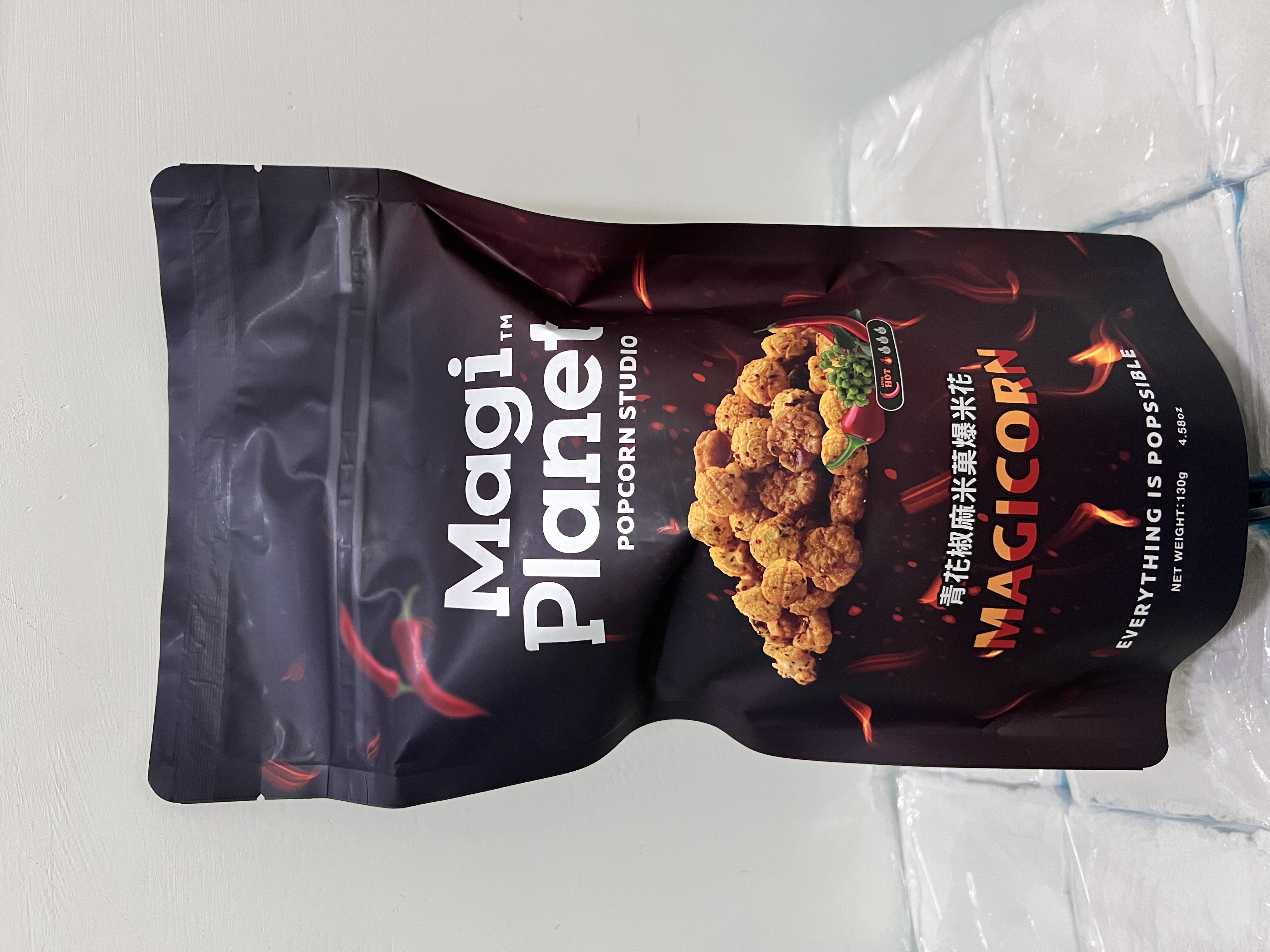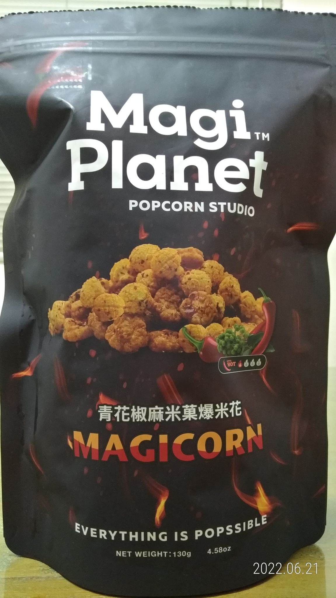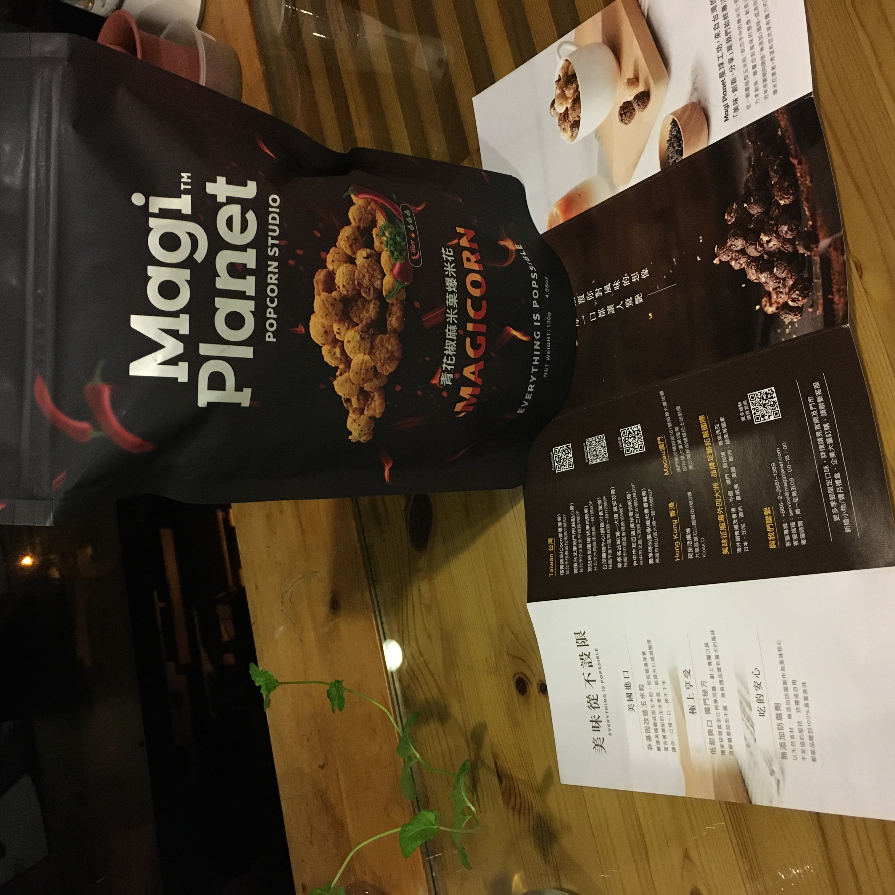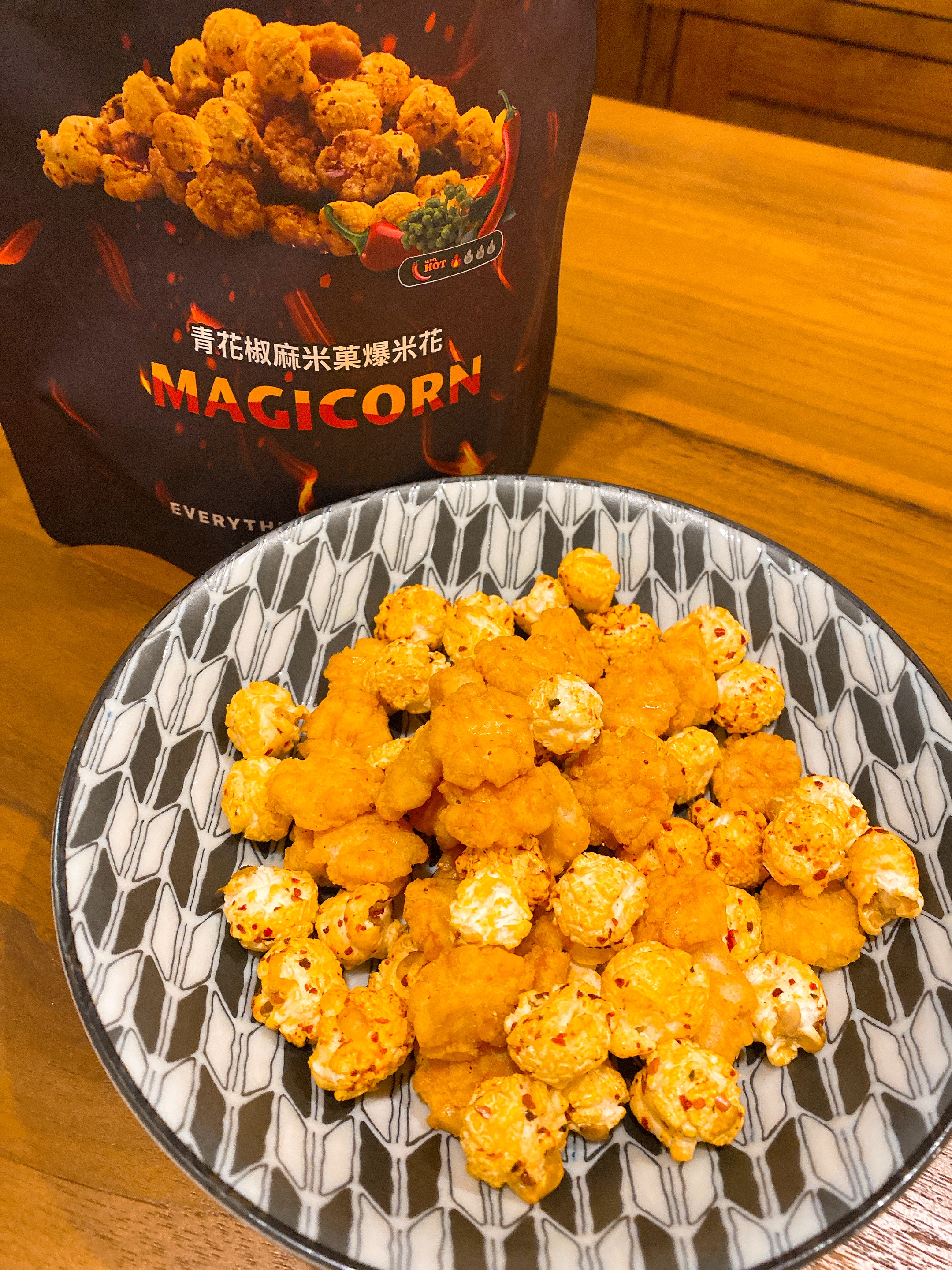 爆米花【 糖 ( 砂糖、葡萄糖、海藻糖)、進口玉米粒( 非基因改造)、棕櫚油、青花椒調味粉[ 椒麻粉( 辣椒粉、花椒粉)、麥芽糊精、酵母抽出物、鹽、醬油粉( 純釀造醬油、麥芽糊精、鹽、砂糖、焦糖色素、琥珀酸二鈉、5'-次黃嘌呤核苷磷酸二鈉、5'-鳥嘌呤核苷磷酸二鈉)、小麥纖維、油性辣椒紅( 紅椒色素、精製葵花油)、花椒萃取物]】