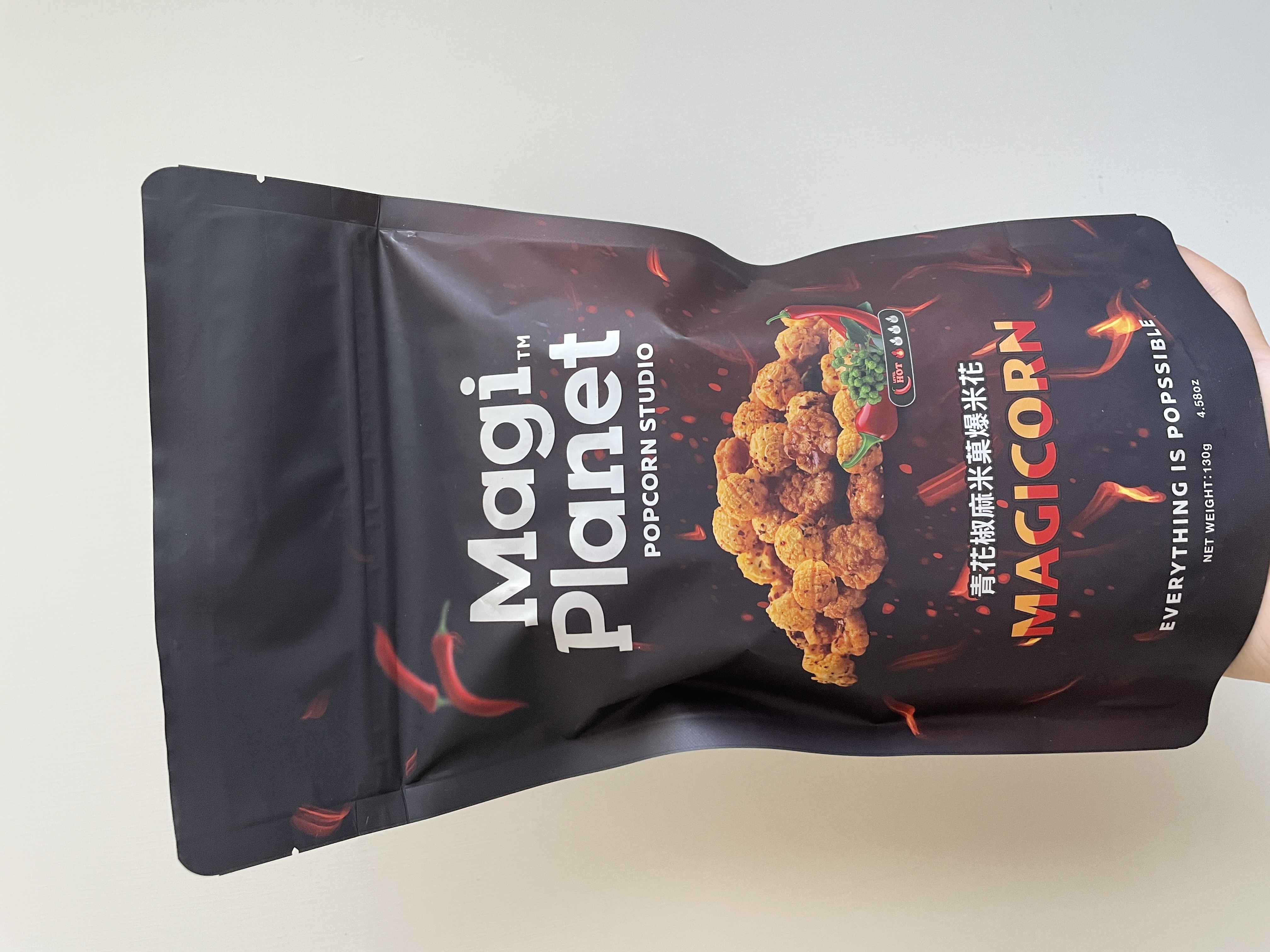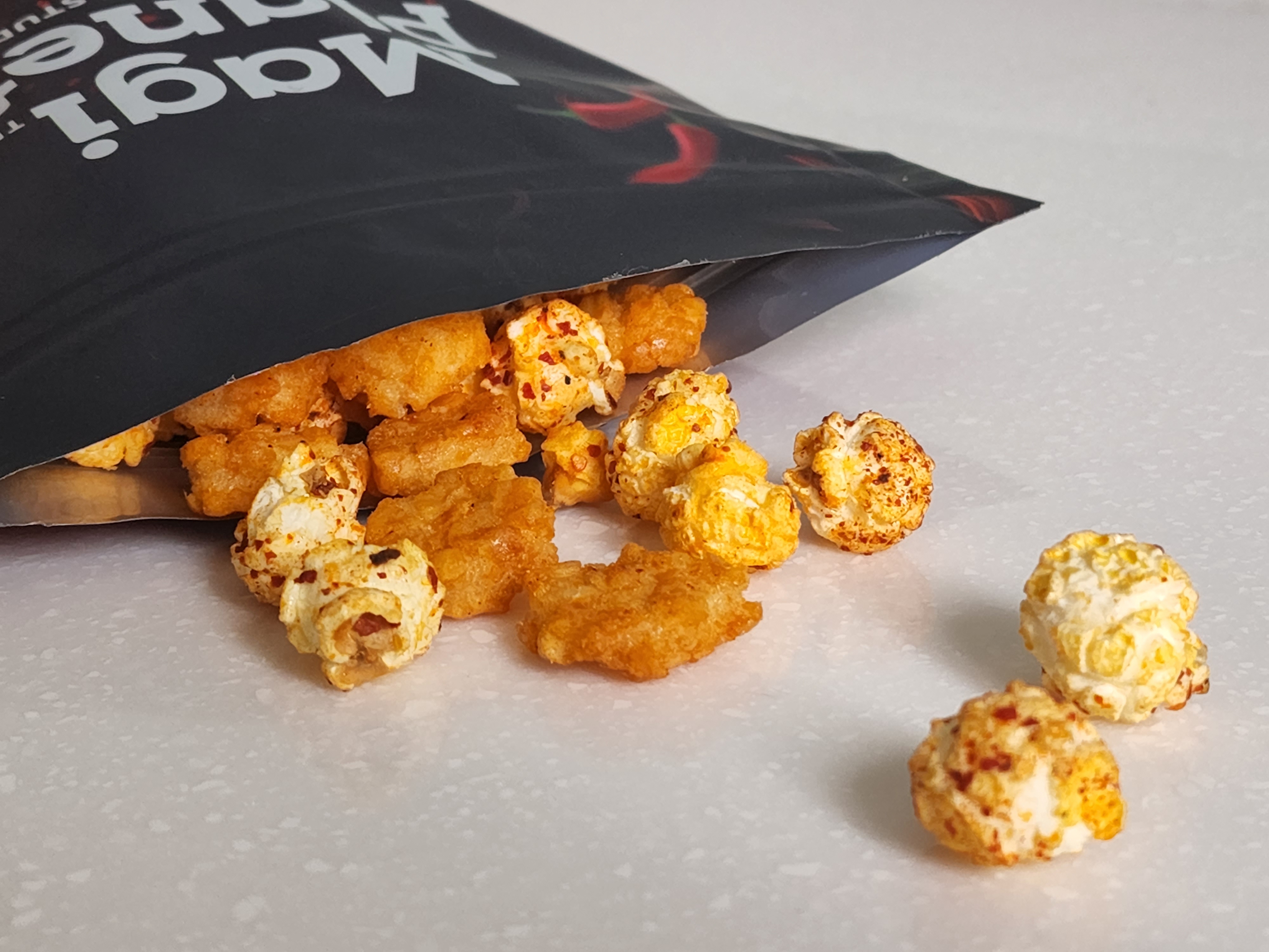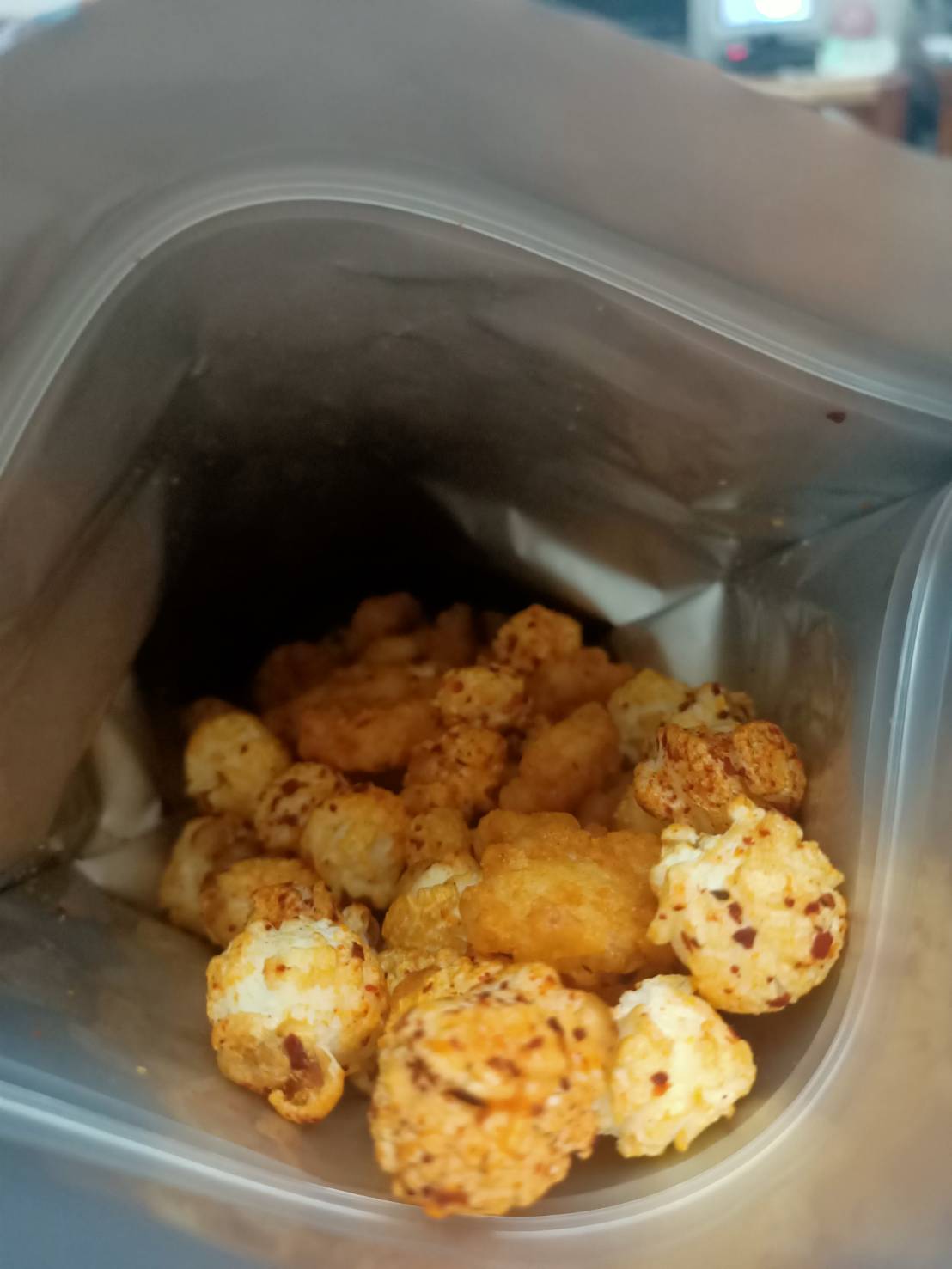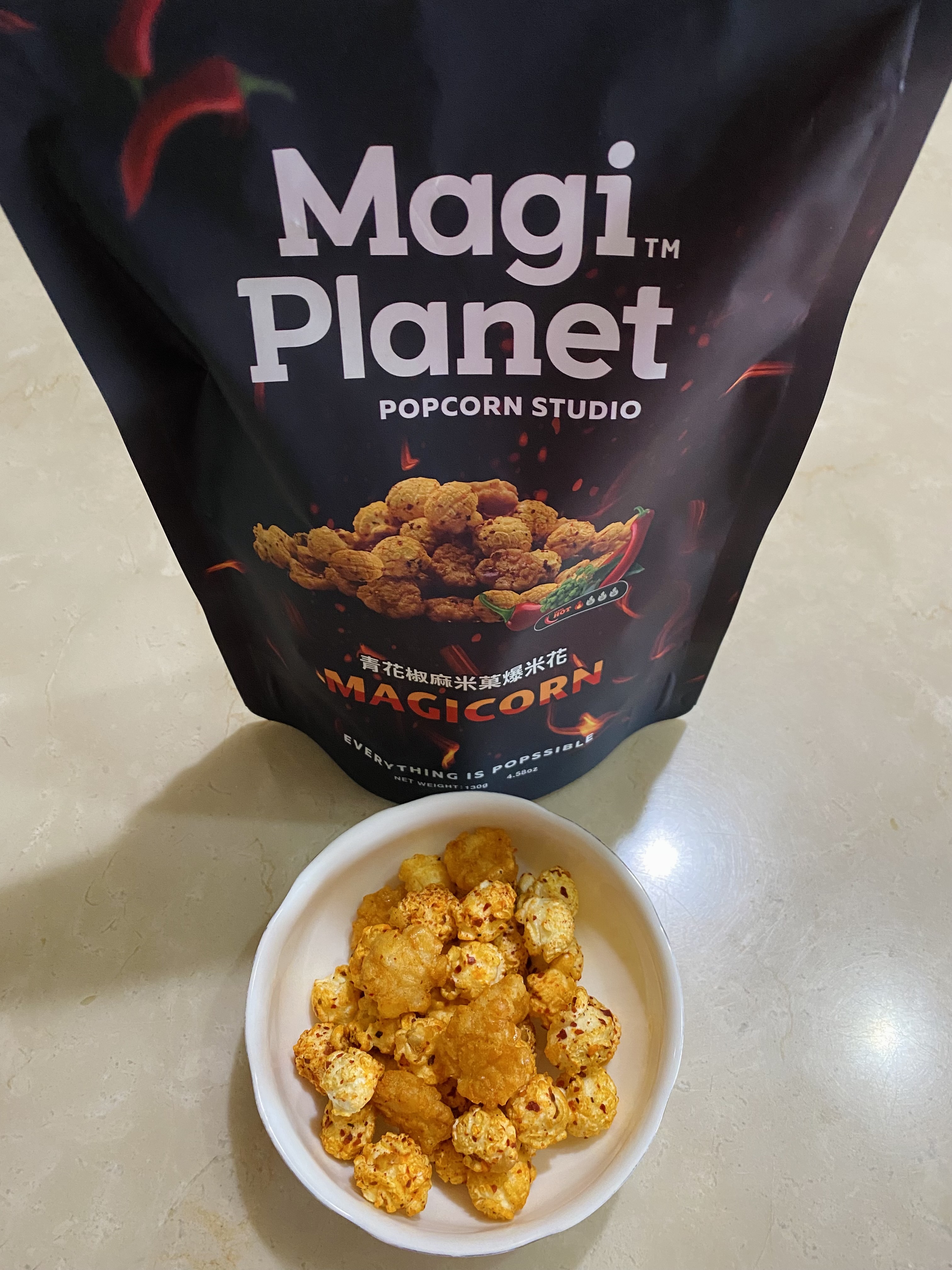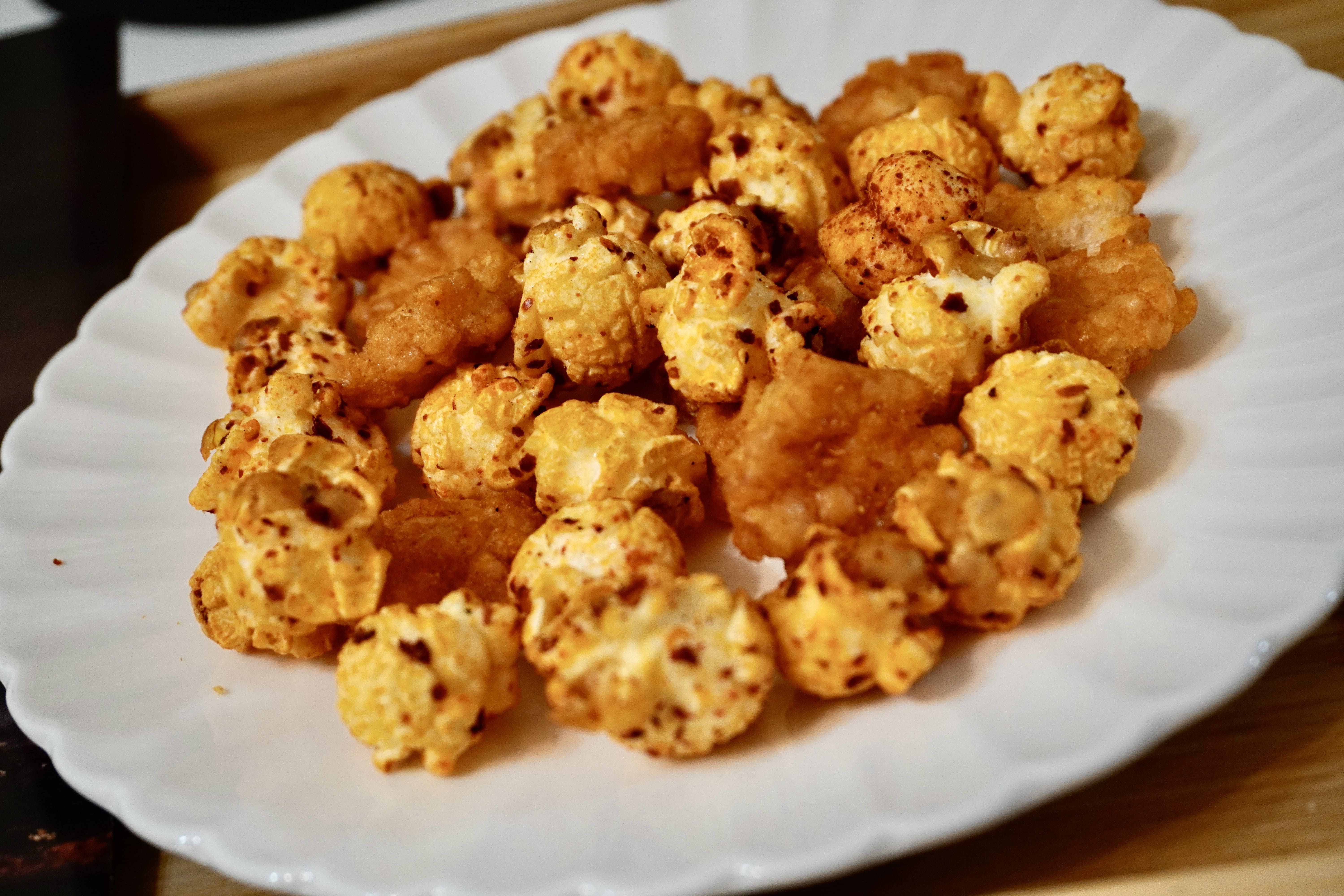 爆米花【 糖 ( 砂糖、葡萄糖、海藻糖)、進口玉米粒( 非基因改造)、棕櫚油、青花椒調味粉[ 椒麻粉( 辣椒粉、花椒粉)、麥芽糊精、酵母抽出物、鹽、醬油粉( 純釀造醬油、麥芽糊精、鹽、砂糖、焦糖色素、琥珀酸二鈉、5'-次黃嘌呤核苷磷酸二鈉、5'-鳥嘌呤核苷磷酸二鈉)、小麥纖維、油性辣椒紅( 紅椒色素、精製葵花油)、花椒萃取物]】