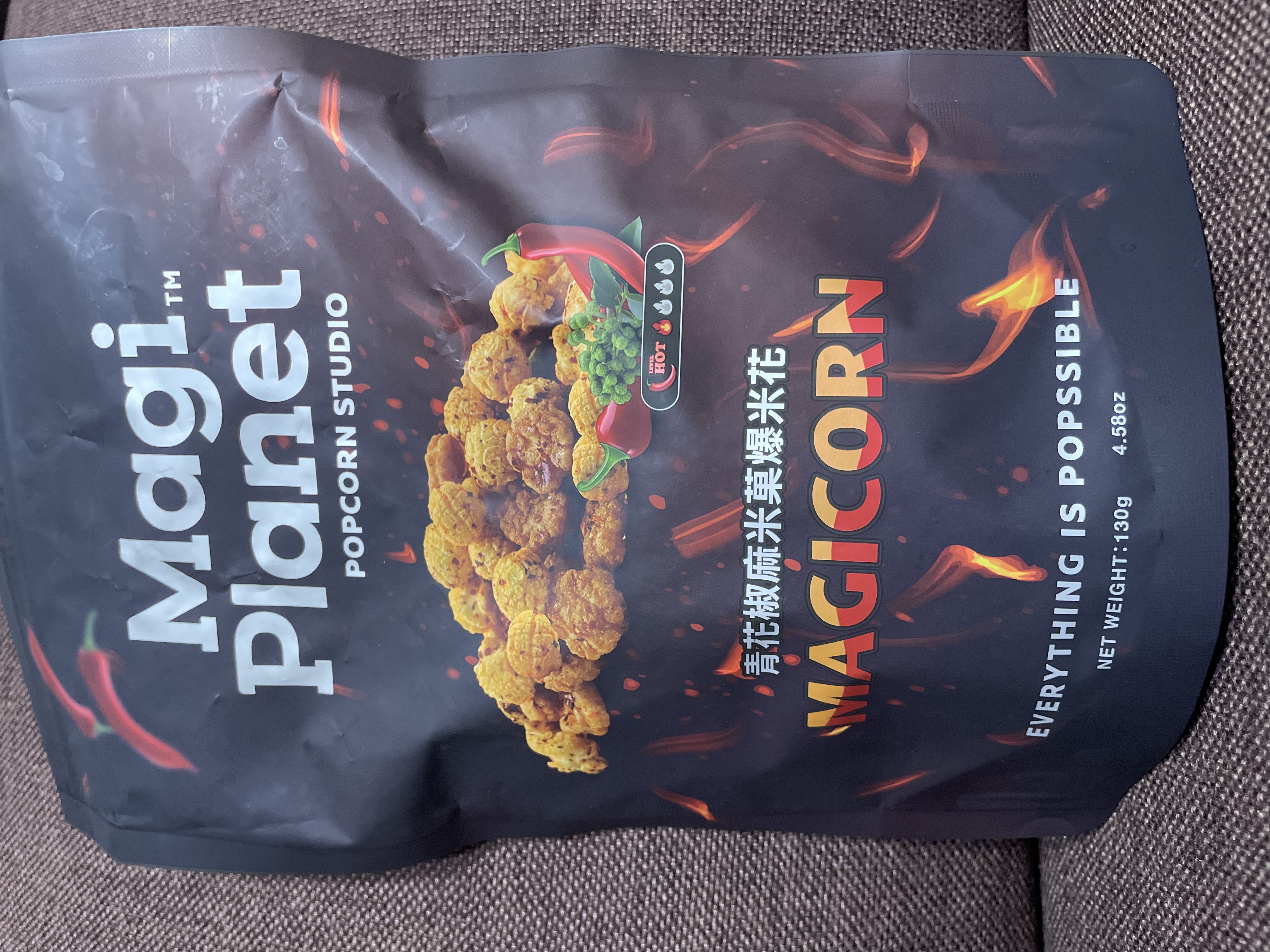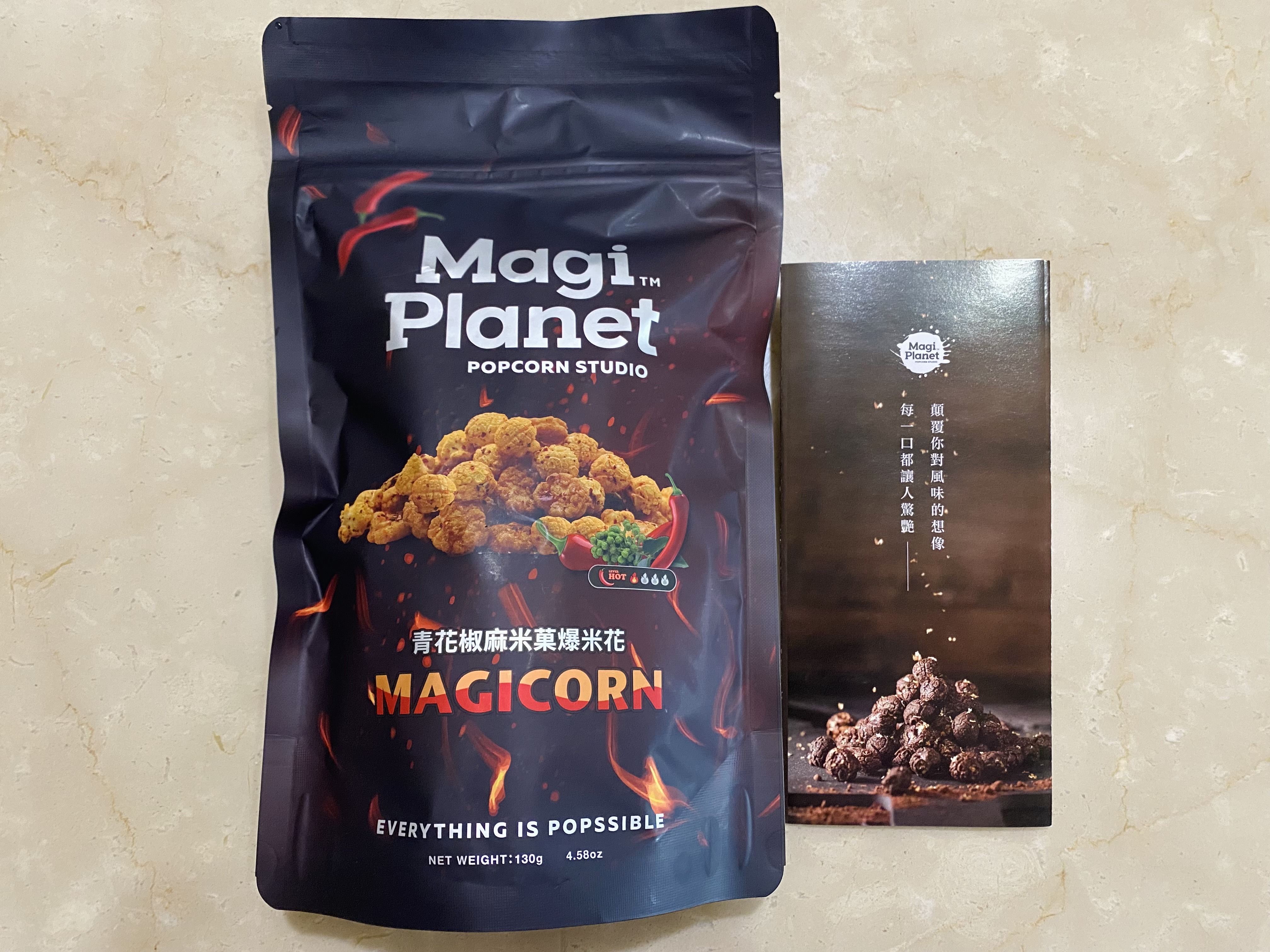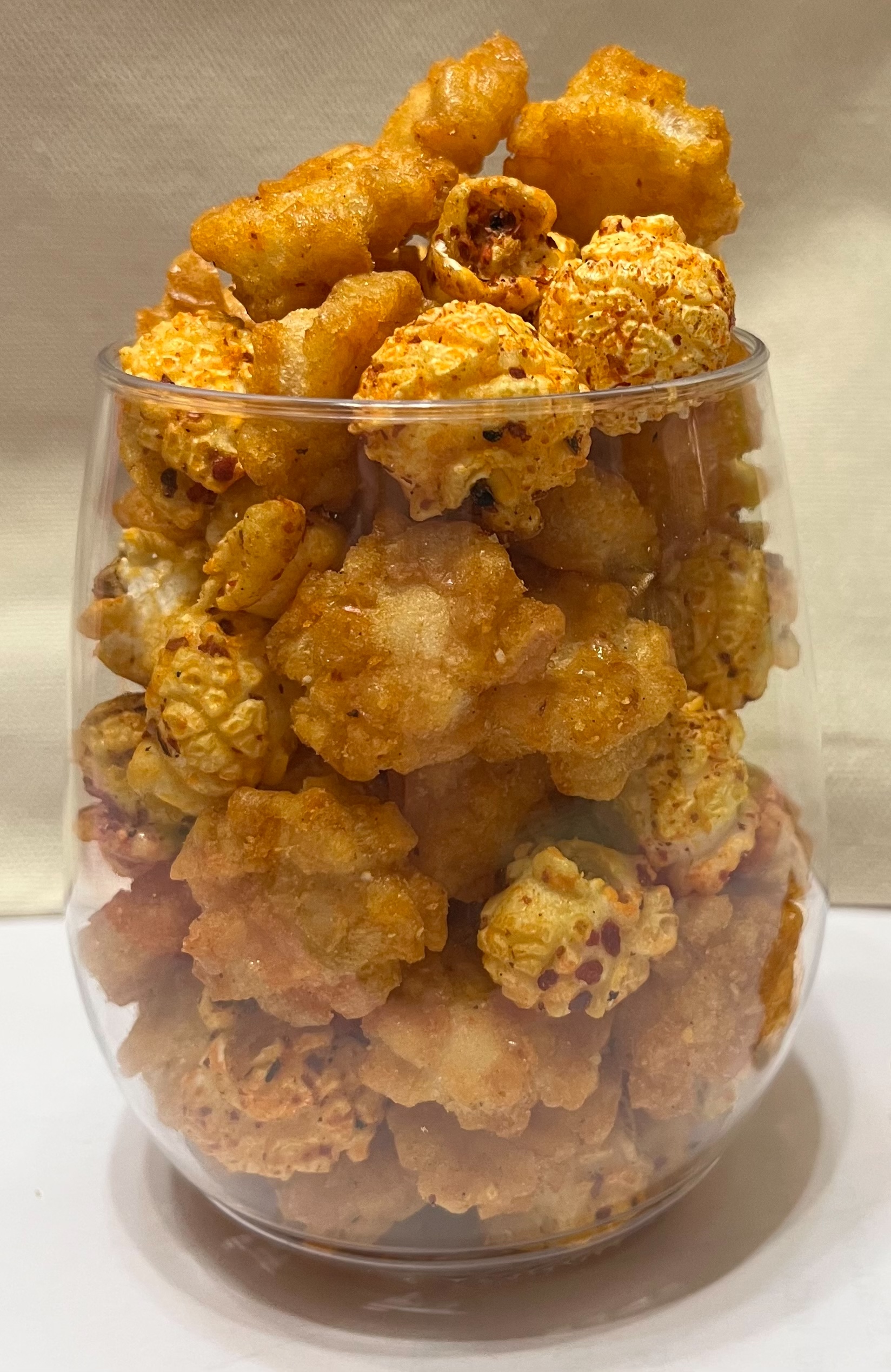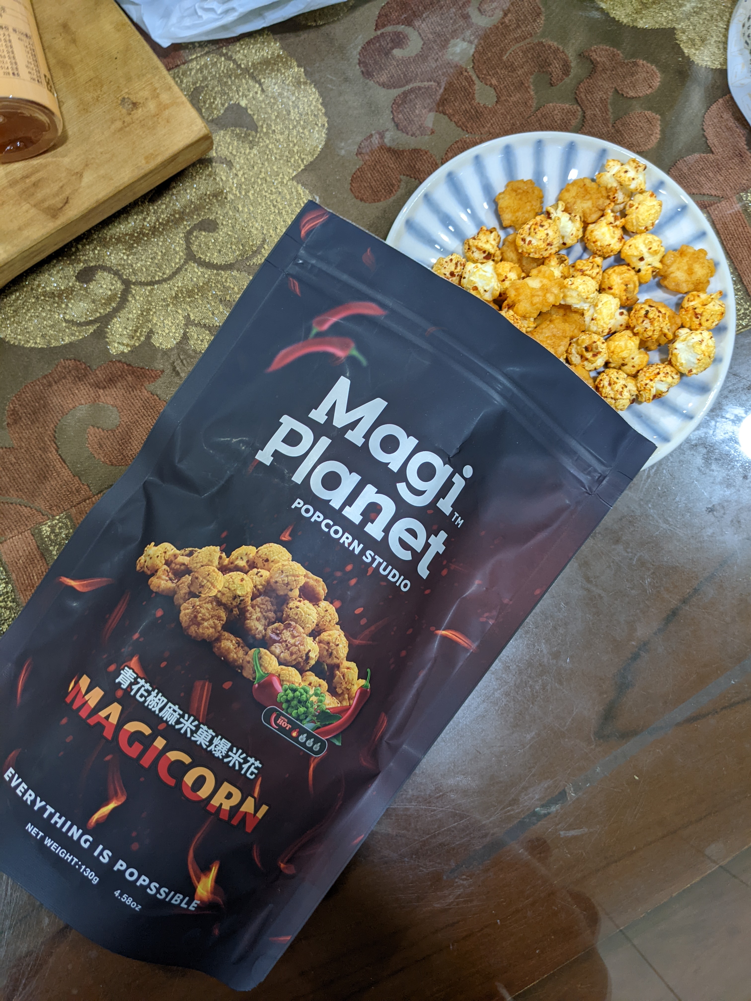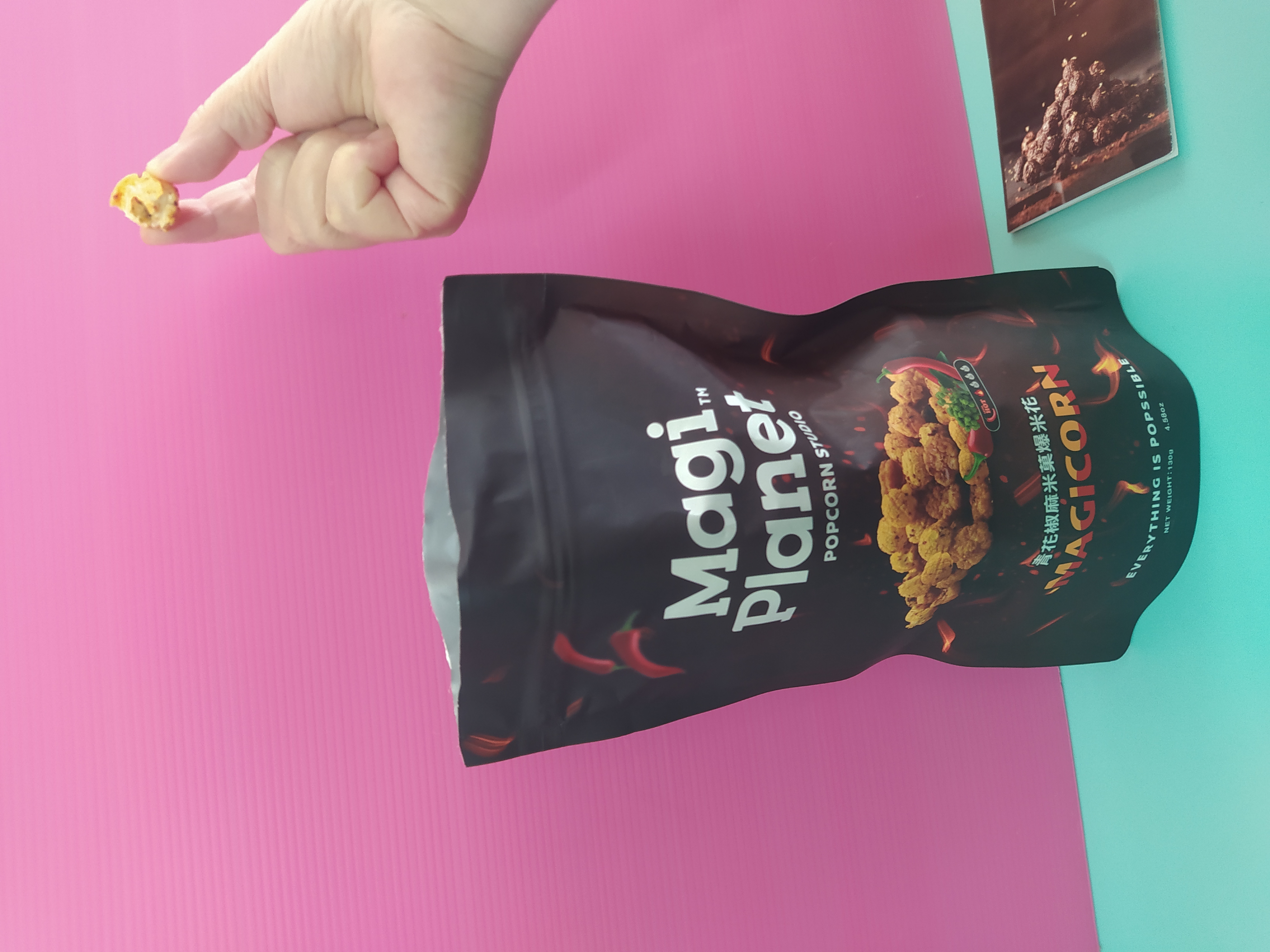 爆米花【 糖 ( 砂糖、葡萄糖、海藻糖)、進口玉米粒( 非基因改造)、棕櫚油、青花椒調味粉[ 椒麻粉( 辣椒粉、花椒粉)、麥芽糊精、酵母抽出物、鹽、醬油粉( 純釀造醬油、麥芽糊精、鹽、砂糖、焦糖色素、琥珀酸二鈉、5'-次黃嘌呤核苷磷酸二鈉、5'-鳥嘌呤核苷磷酸二鈉)、小麥纖維、油性辣椒紅( 紅椒色素、精製葵花油)、花椒萃取物]】