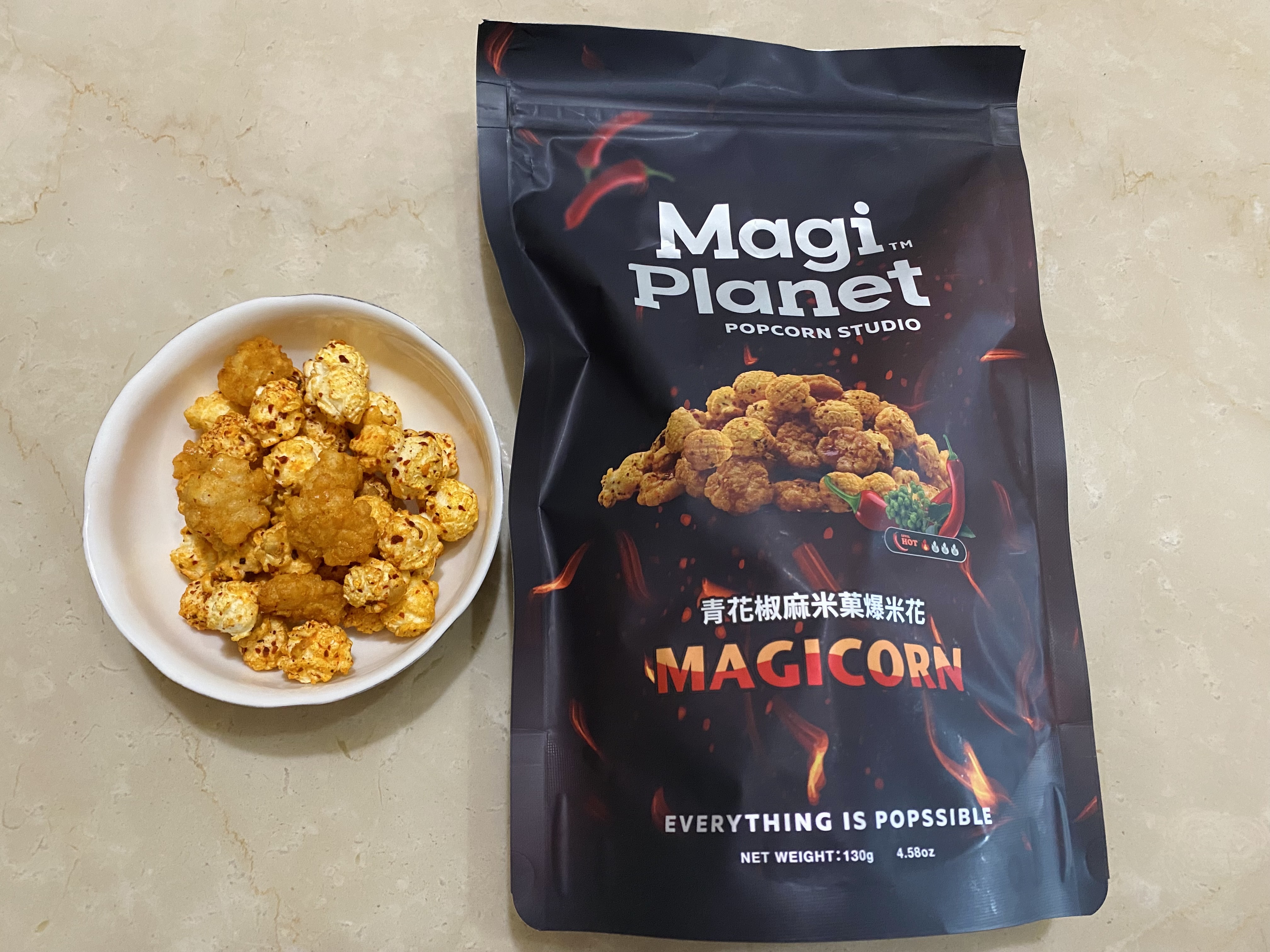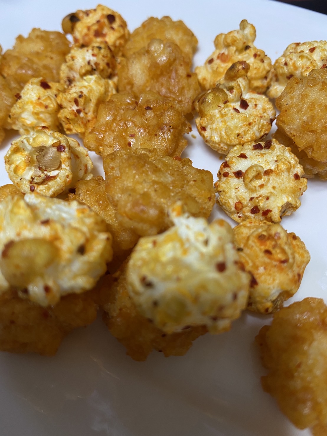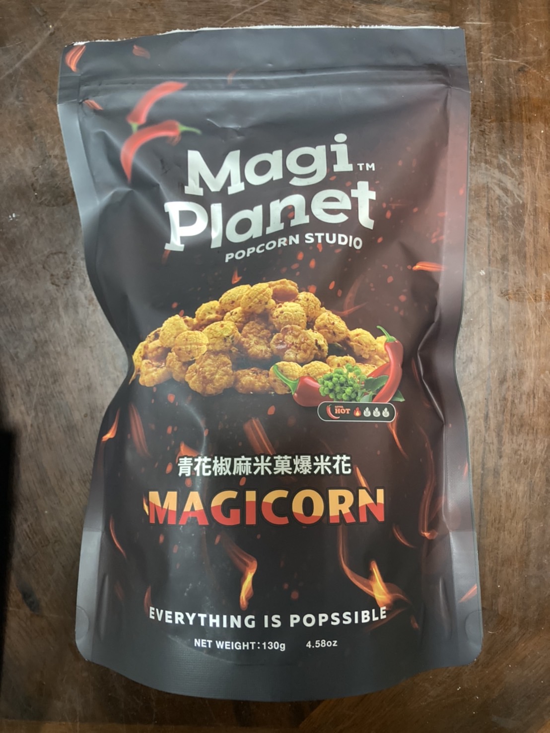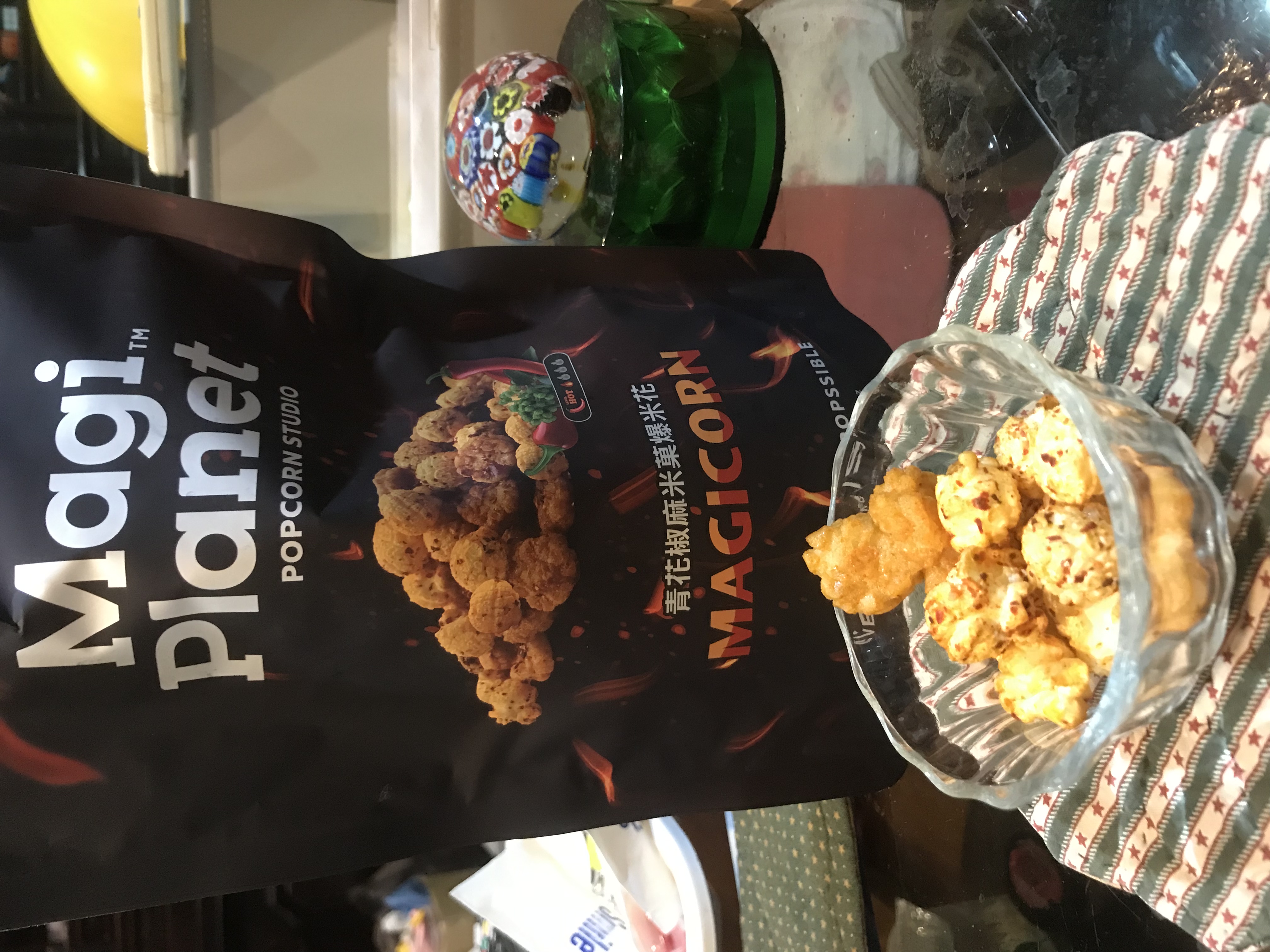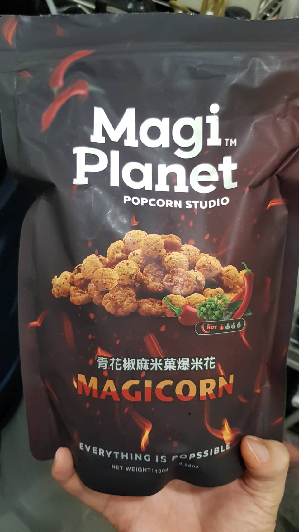 爆米花【 糖 ( 砂糖、葡萄糖、海藻糖)、進口玉米粒( 非基因改造)、棕櫚油、青花椒調味粉[ 椒麻粉( 辣椒粉、花椒粉)、麥芽糊精、酵母抽出物、鹽、醬油粉( 純釀造醬油、麥芽糊精、鹽、砂糖、焦糖色素、琥珀酸二鈉、5'-次黃嘌呤核苷磷酸二鈉、5'-鳥嘌呤核苷磷酸二鈉)、小麥纖維、油性辣椒紅( 紅椒色素、精製葵花油)、花椒萃取物]】