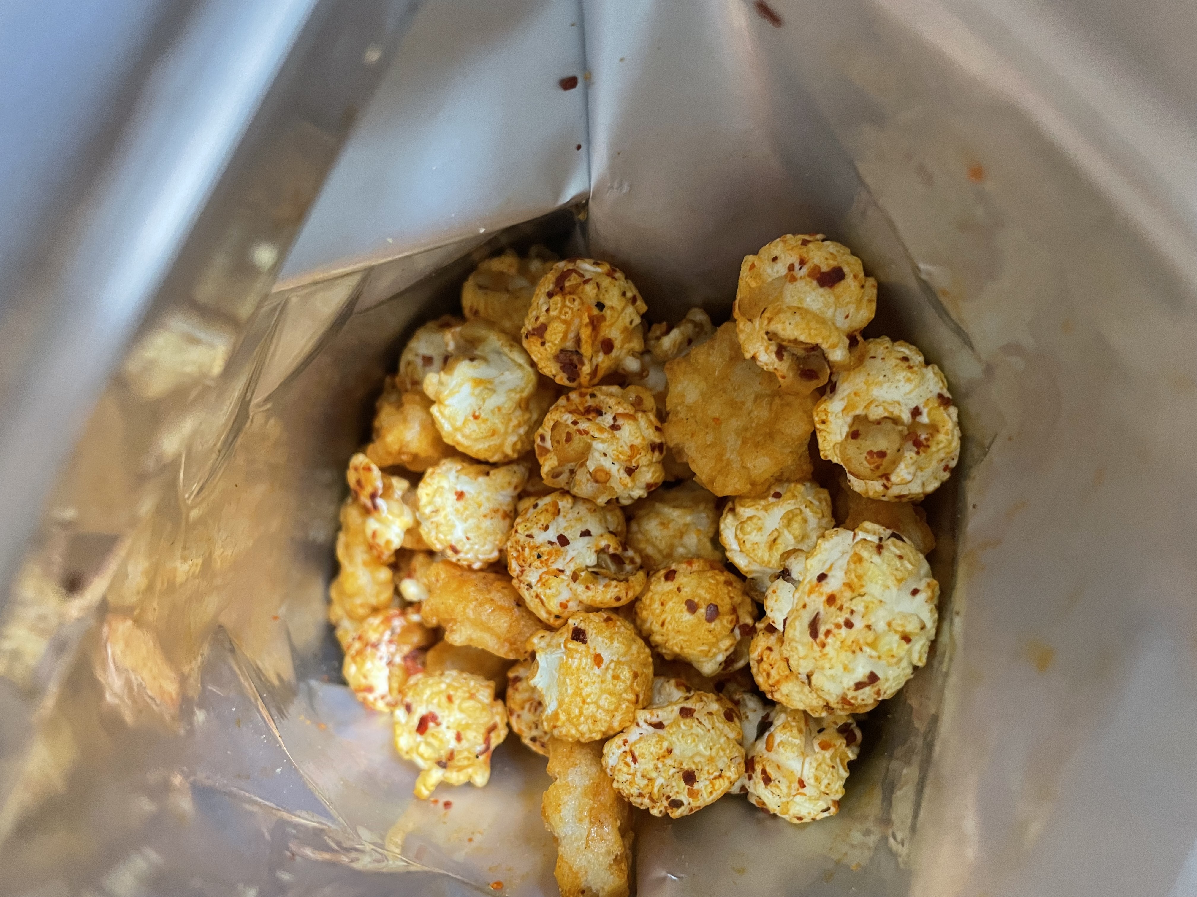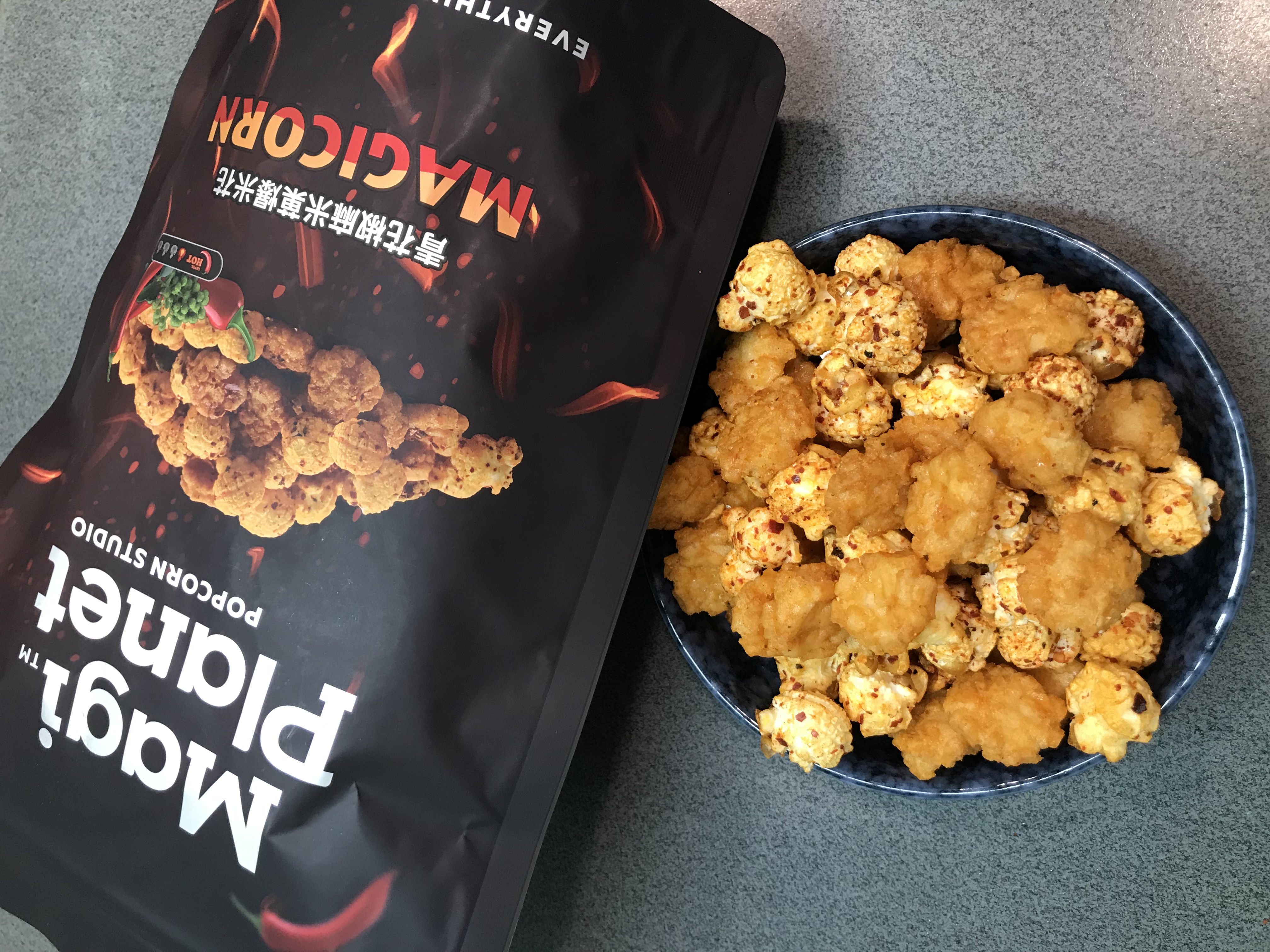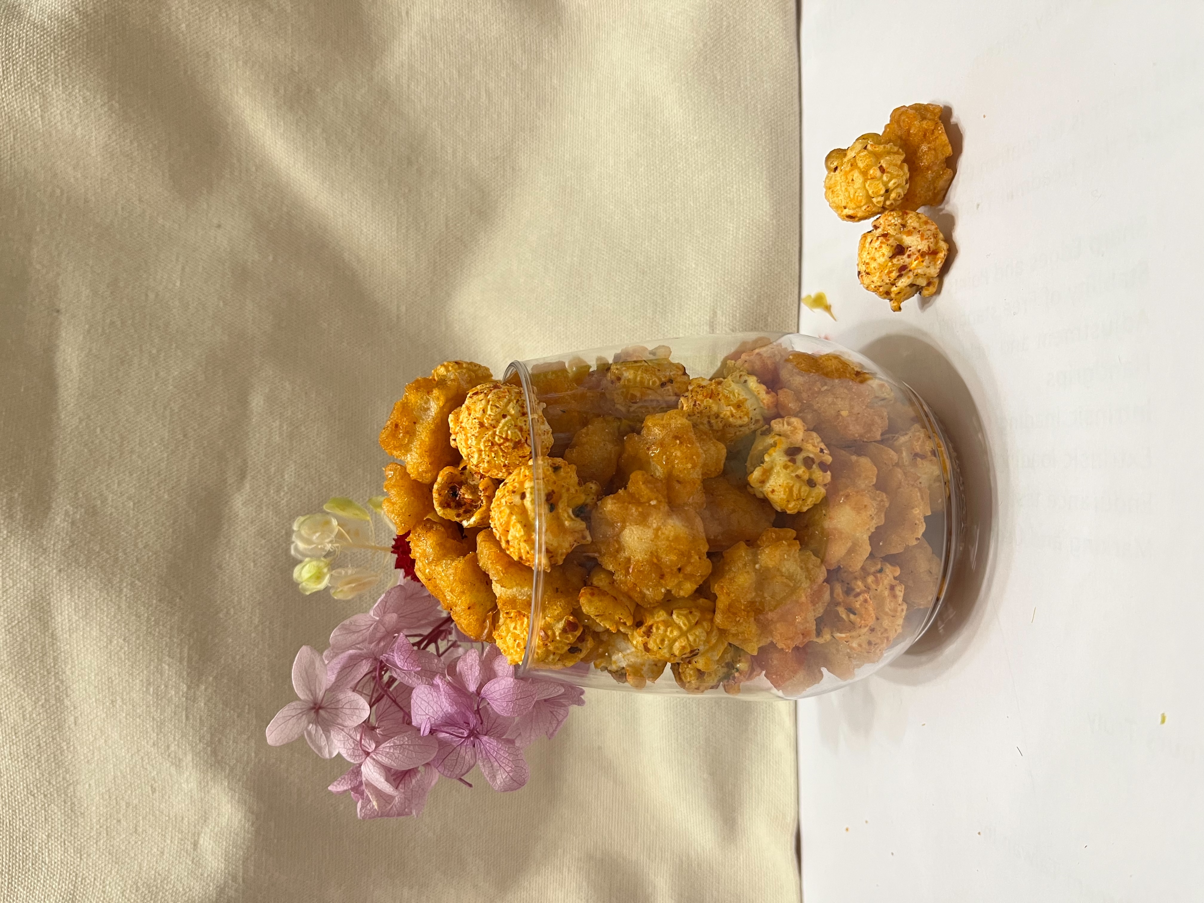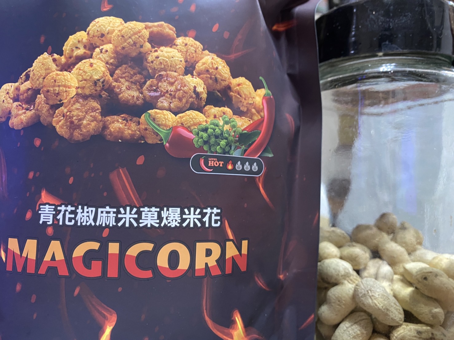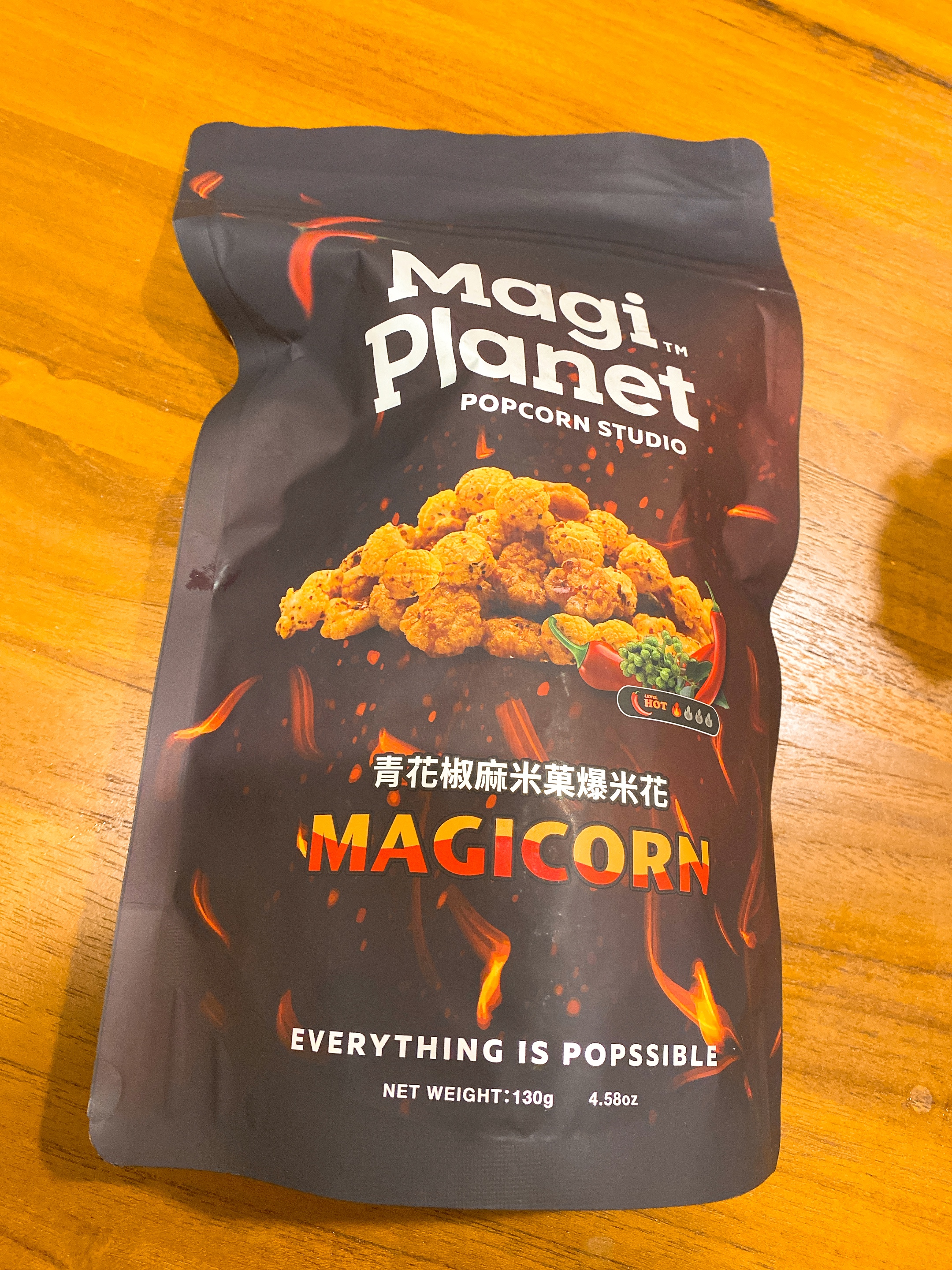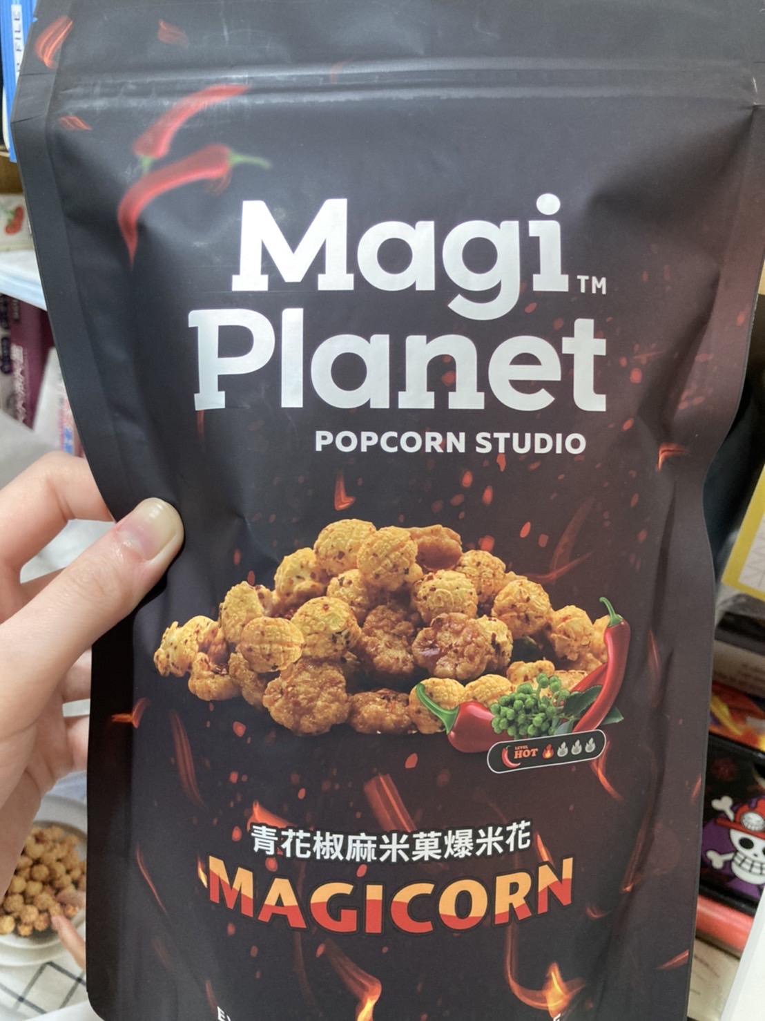 爆米花【 糖 ( 砂糖、葡萄糖、海藻糖)、進口玉米粒( 非基因改造)、棕櫚油、青花椒調味粉[ 椒麻粉( 辣椒粉、花椒粉)、麥芽糊精、酵母抽出物、鹽、醬油粉( 純釀造醬油、麥芽糊精、鹽、砂糖、焦糖色素、琥珀酸二鈉、5'-次黃嘌呤核苷磷酸二鈉、5'-鳥嘌呤核苷磷酸二鈉)、小麥纖維、油性辣椒紅( 紅椒色素、精製葵花油)、花椒萃取物]】