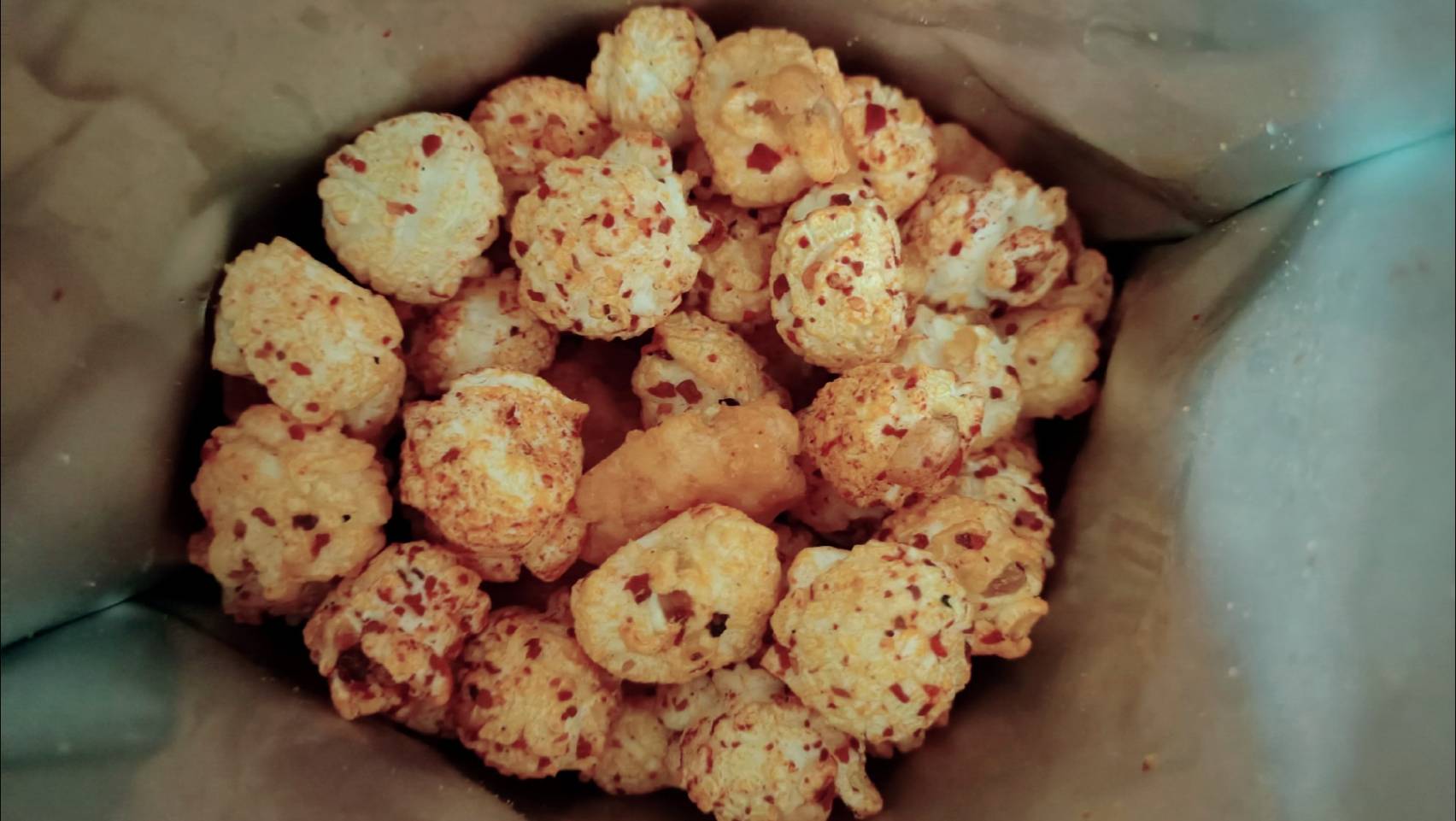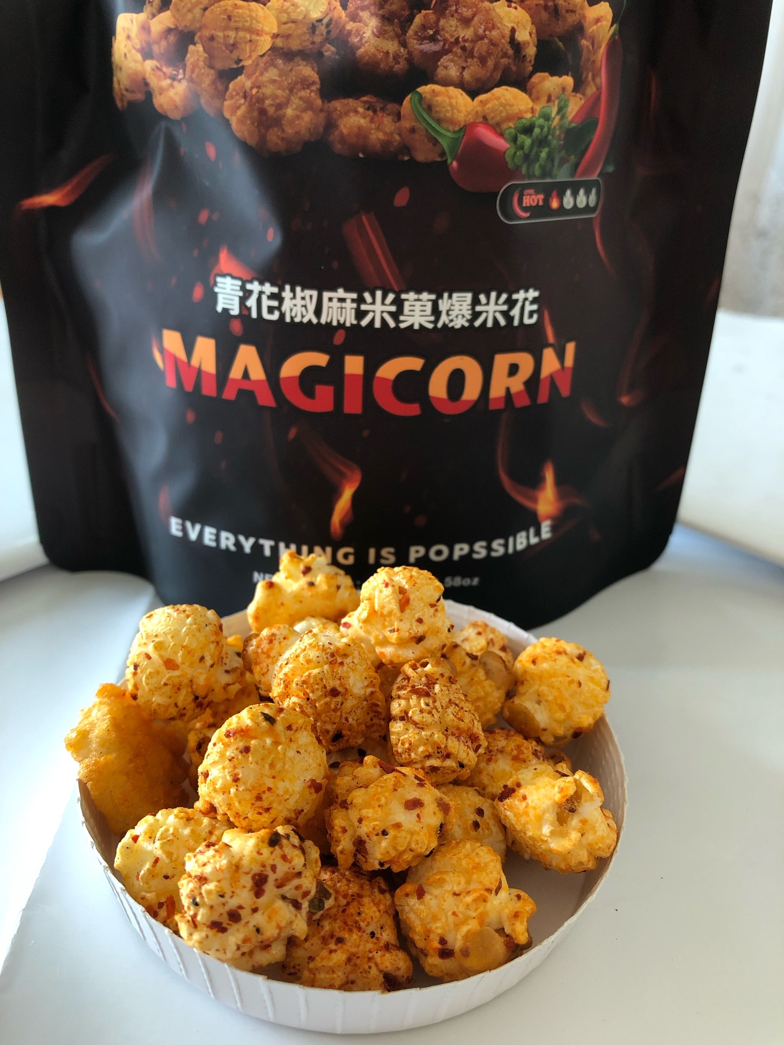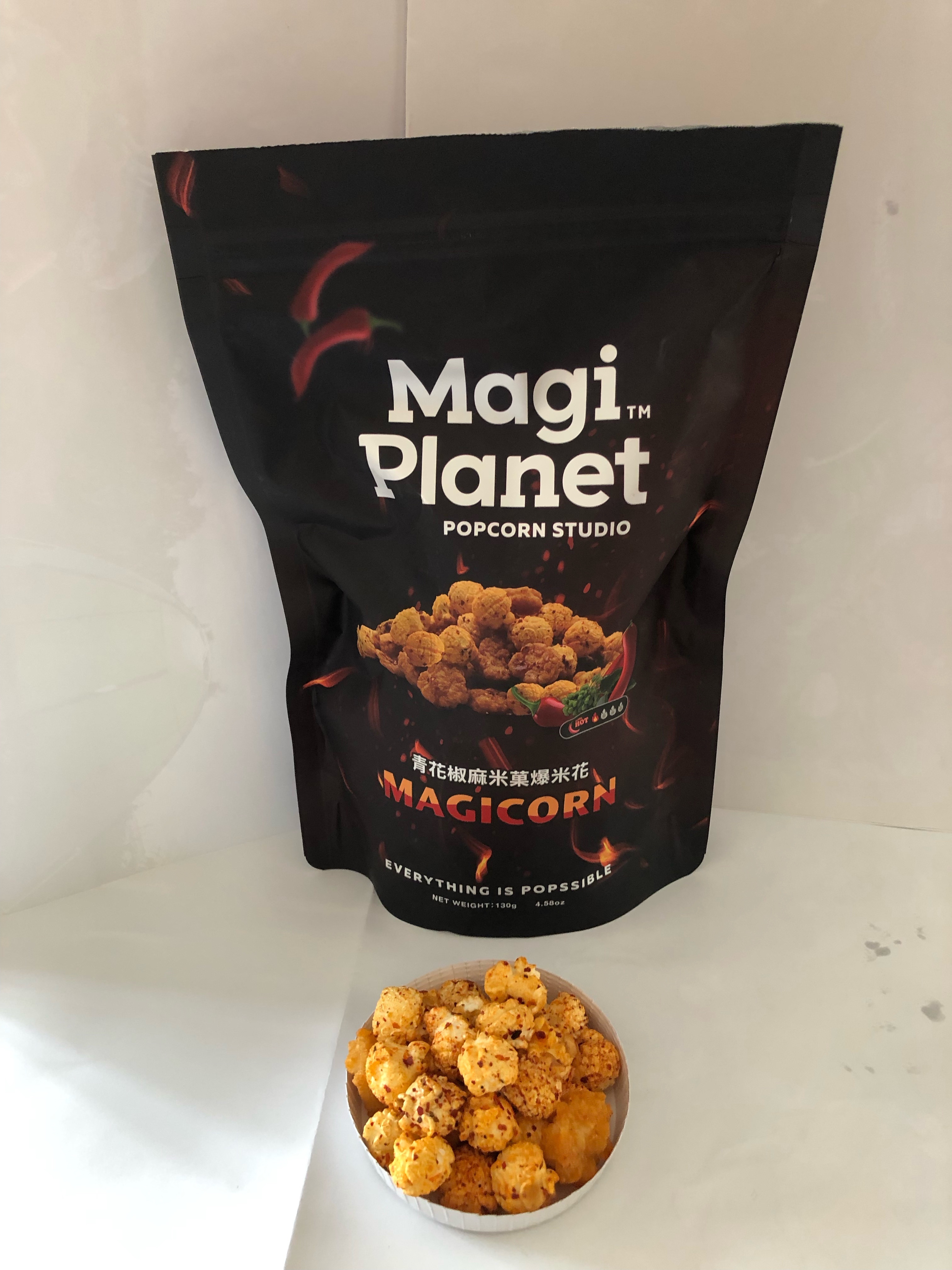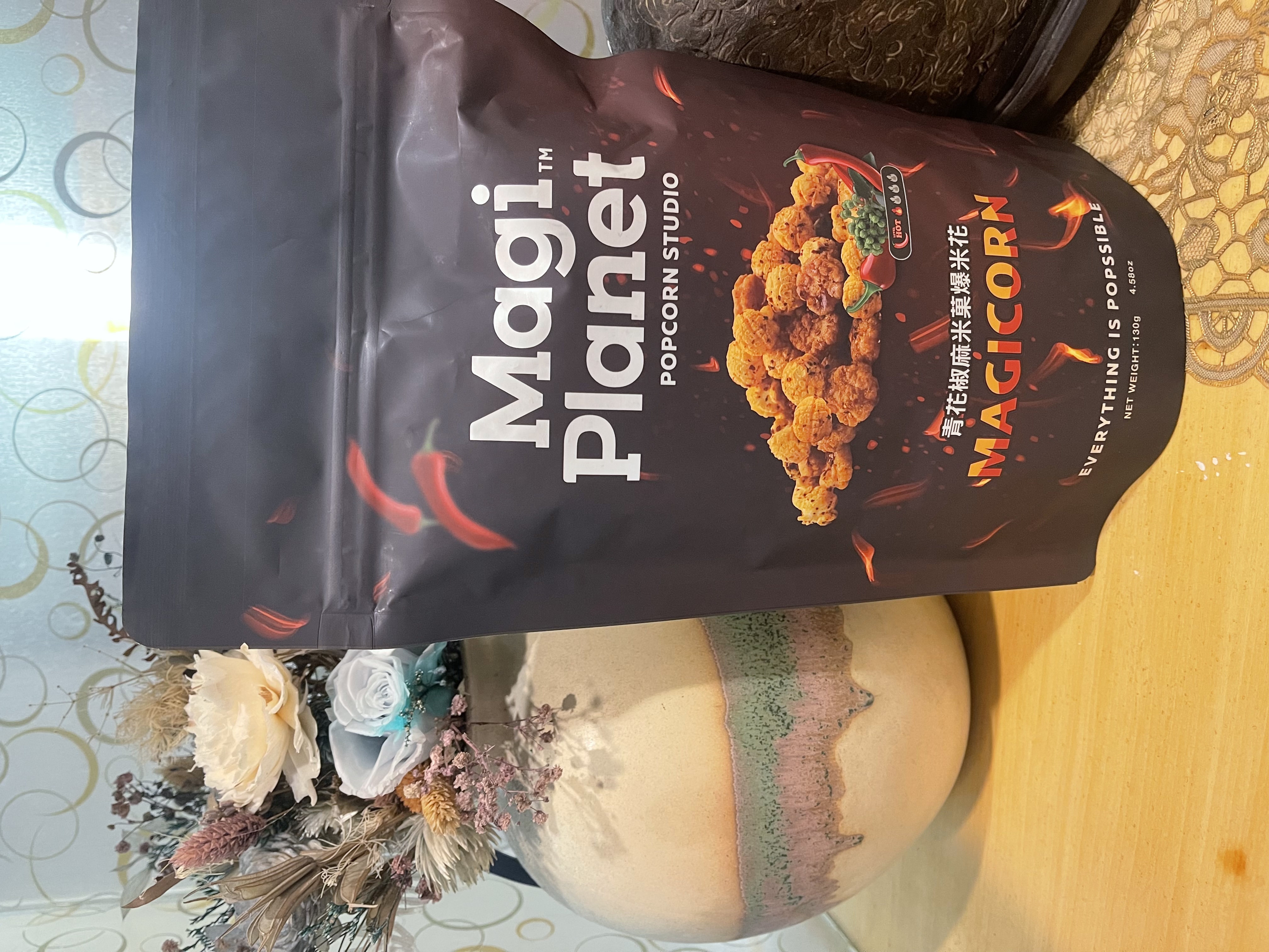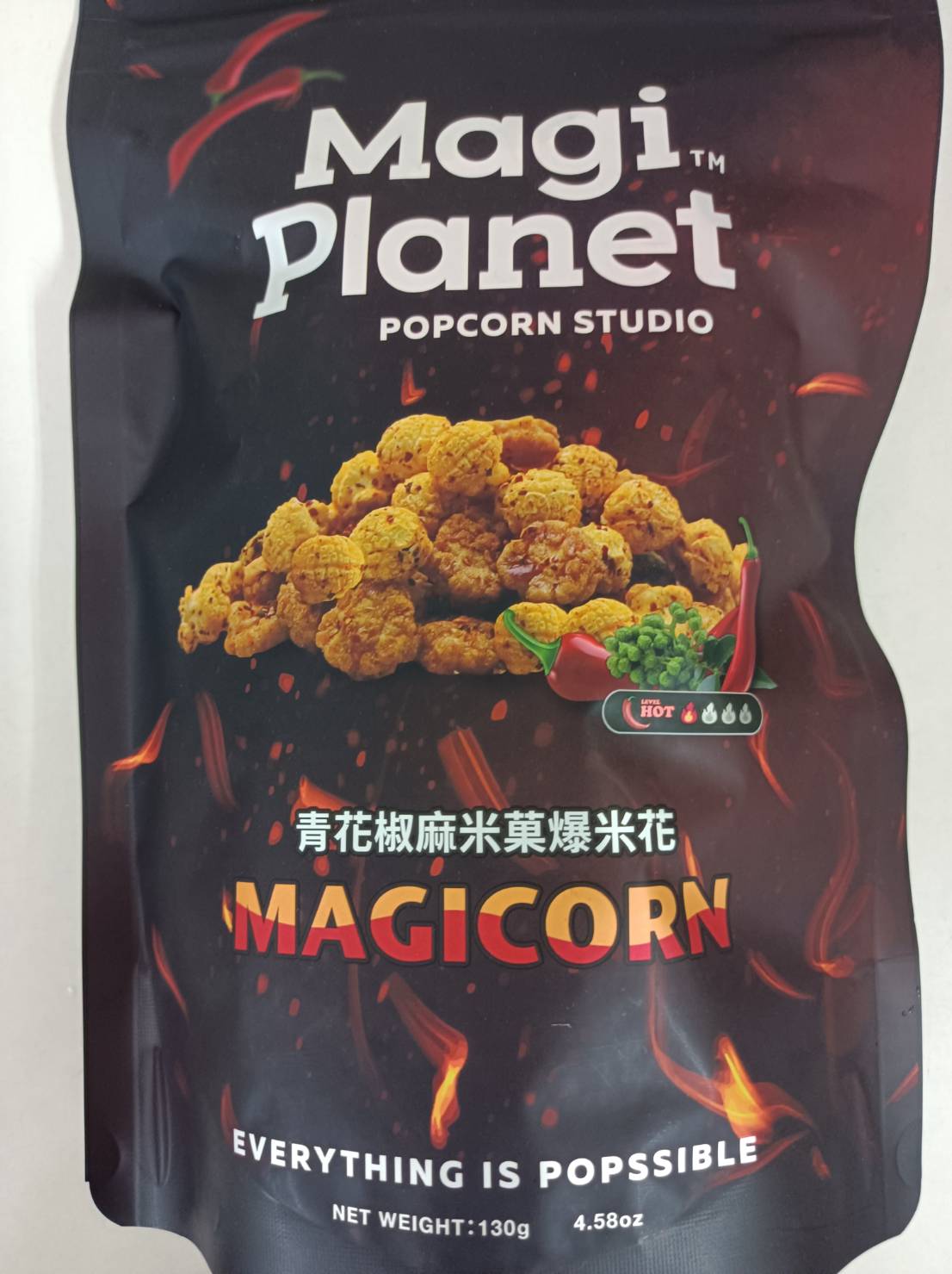 爆米花【 糖 ( 砂糖、葡萄糖、海藻糖)、進口玉米粒( 非基因改造)、棕櫚油、青花椒調味粉[ 椒麻粉( 辣椒粉、花椒粉)、麥芽糊精、酵母抽出物、鹽、醬油粉( 純釀造醬油、麥芽糊精、鹽、砂糖、焦糖色素、琥珀酸二鈉、5'-次黃嘌呤核苷磷酸二鈉、5'-鳥嘌呤核苷磷酸二鈉)、小麥纖維、油性辣椒紅( 紅椒色素、精製葵花油)、花椒萃取物]】