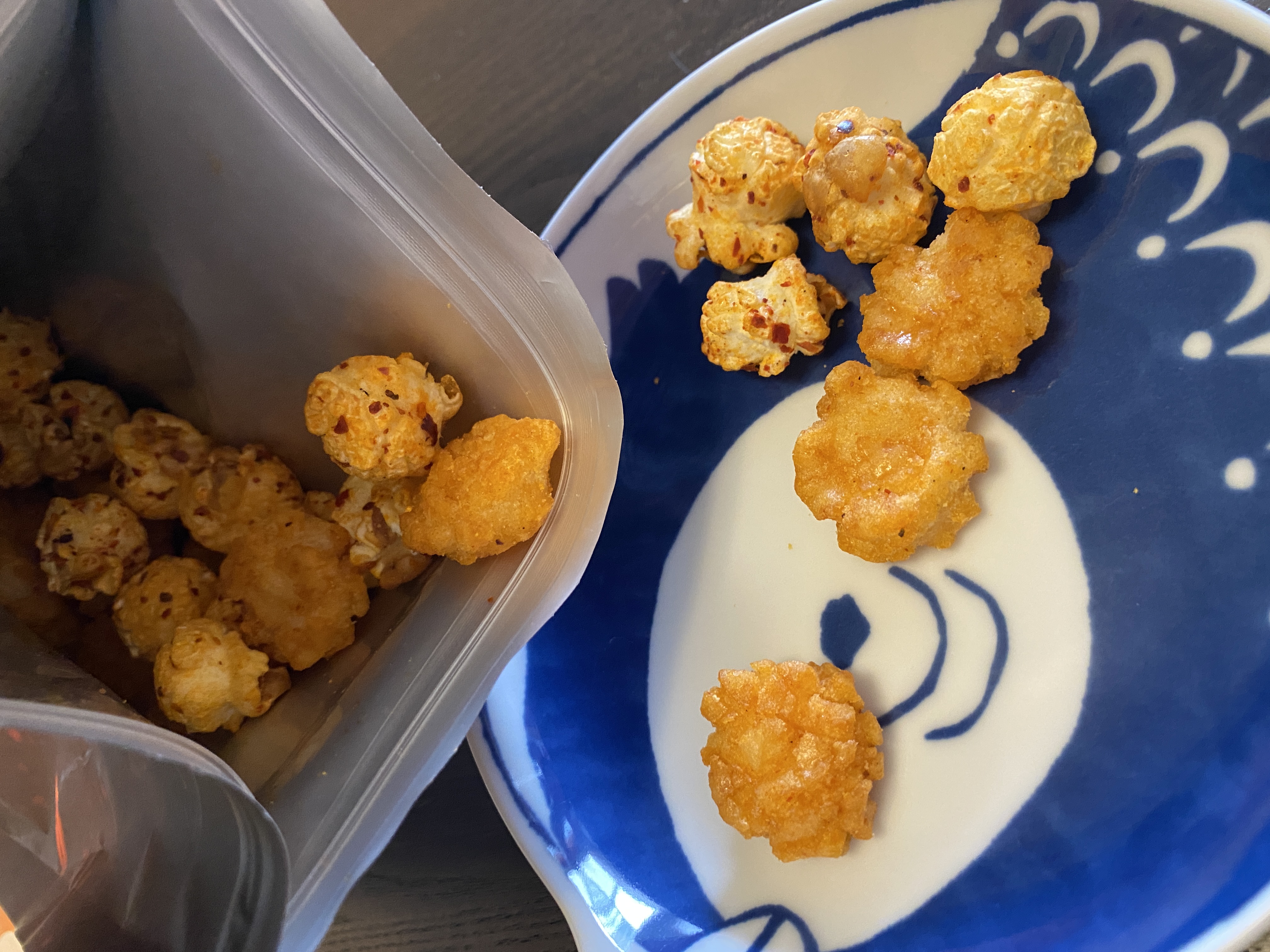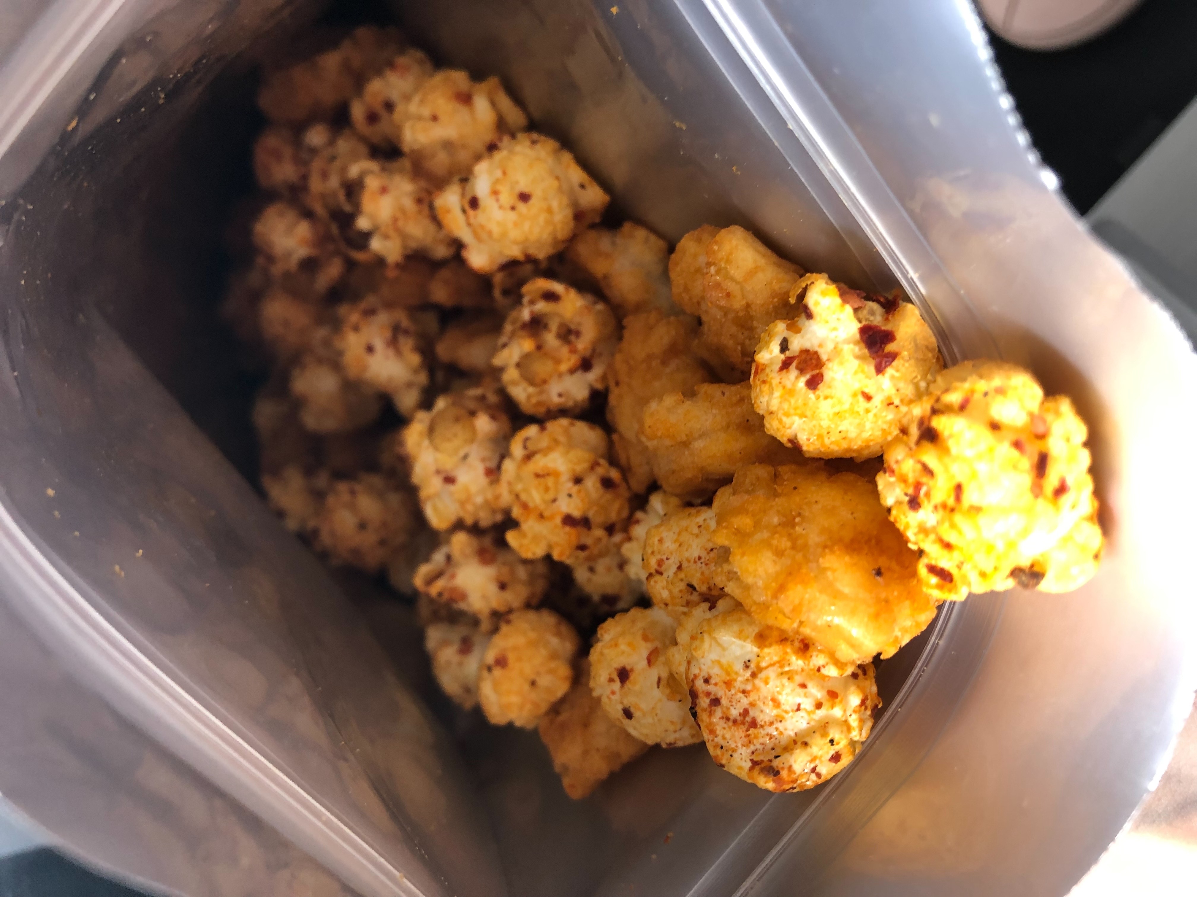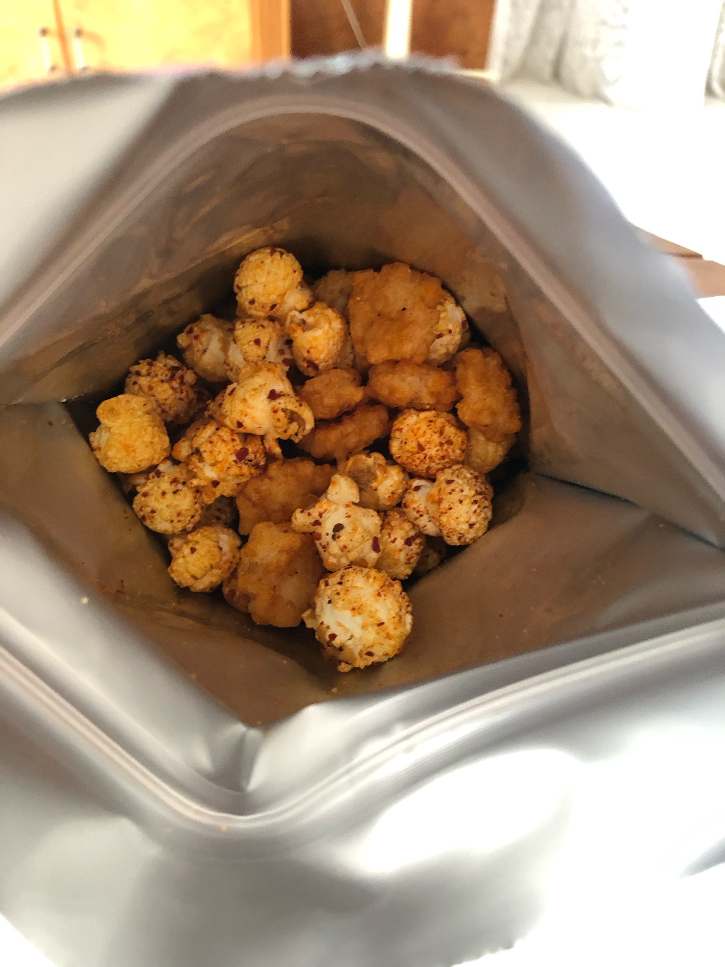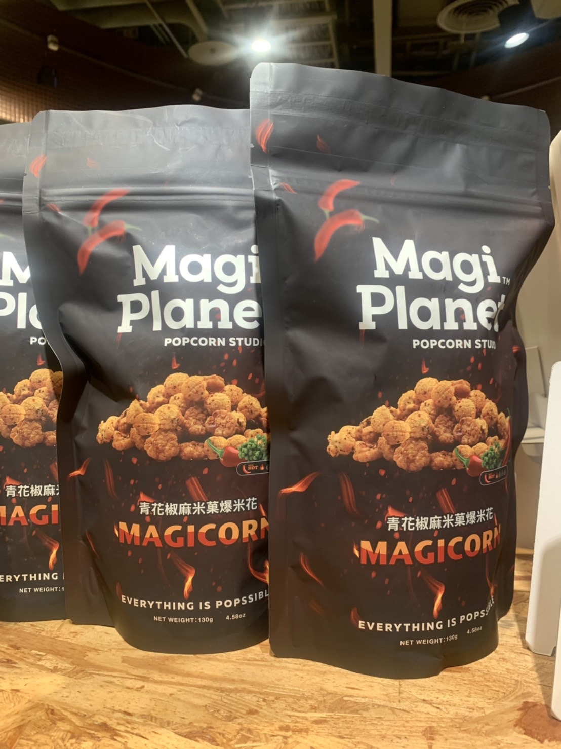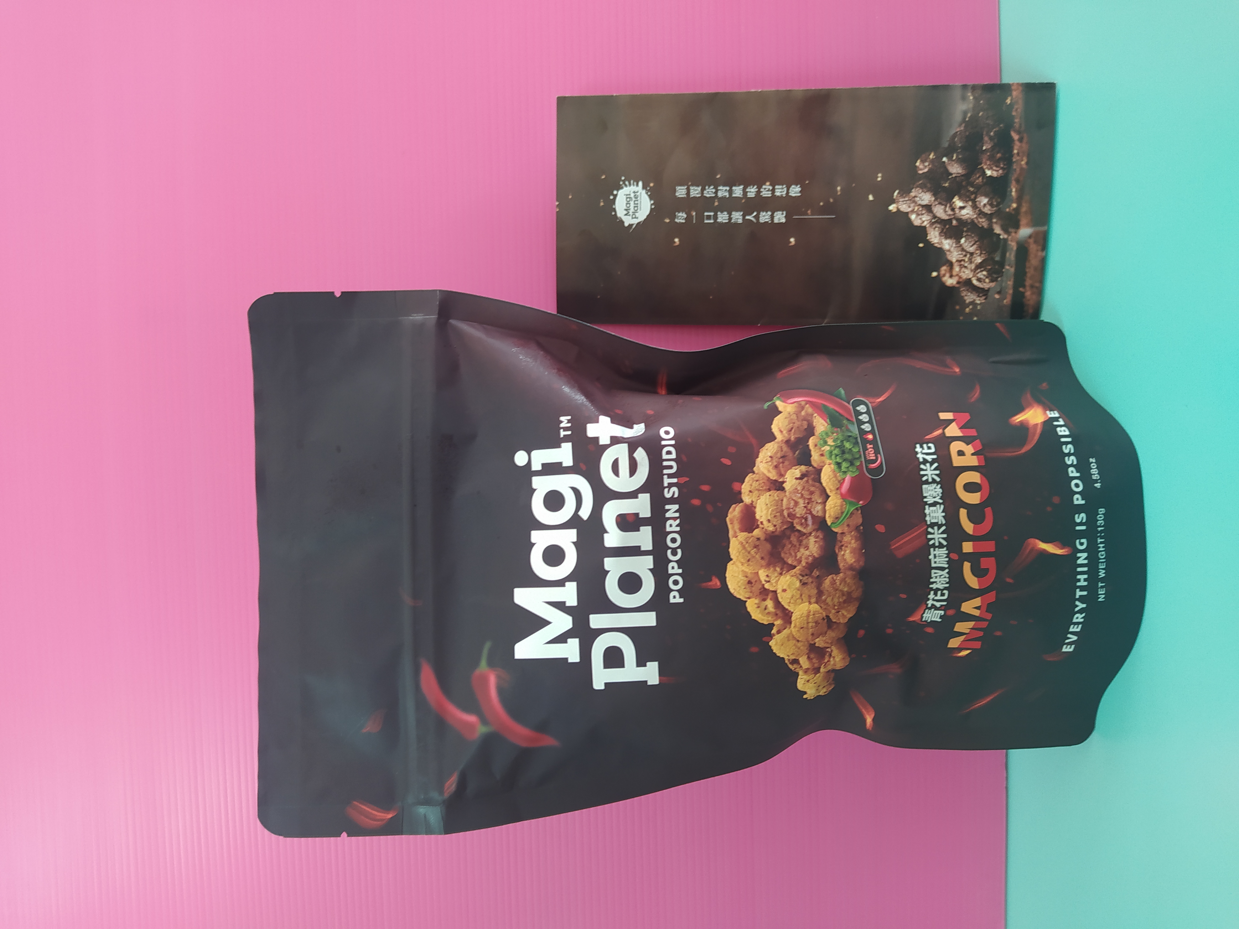 爆米花【 糖 ( 砂糖、葡萄糖、海藻糖)、進口玉米粒( 非基因改造)、棕櫚油、青花椒調味粉[ 椒麻粉( 辣椒粉、花椒粉)、麥芽糊精、酵母抽出物、鹽、醬油粉( 純釀造醬油、麥芽糊精、鹽、砂糖、焦糖色素、琥珀酸二鈉、5'-次黃嘌呤核苷磷酸二鈉、5'-鳥嘌呤核苷磷酸二鈉)、小麥纖維、油性辣椒紅( 紅椒色素、精製葵花油)、花椒萃取物]】