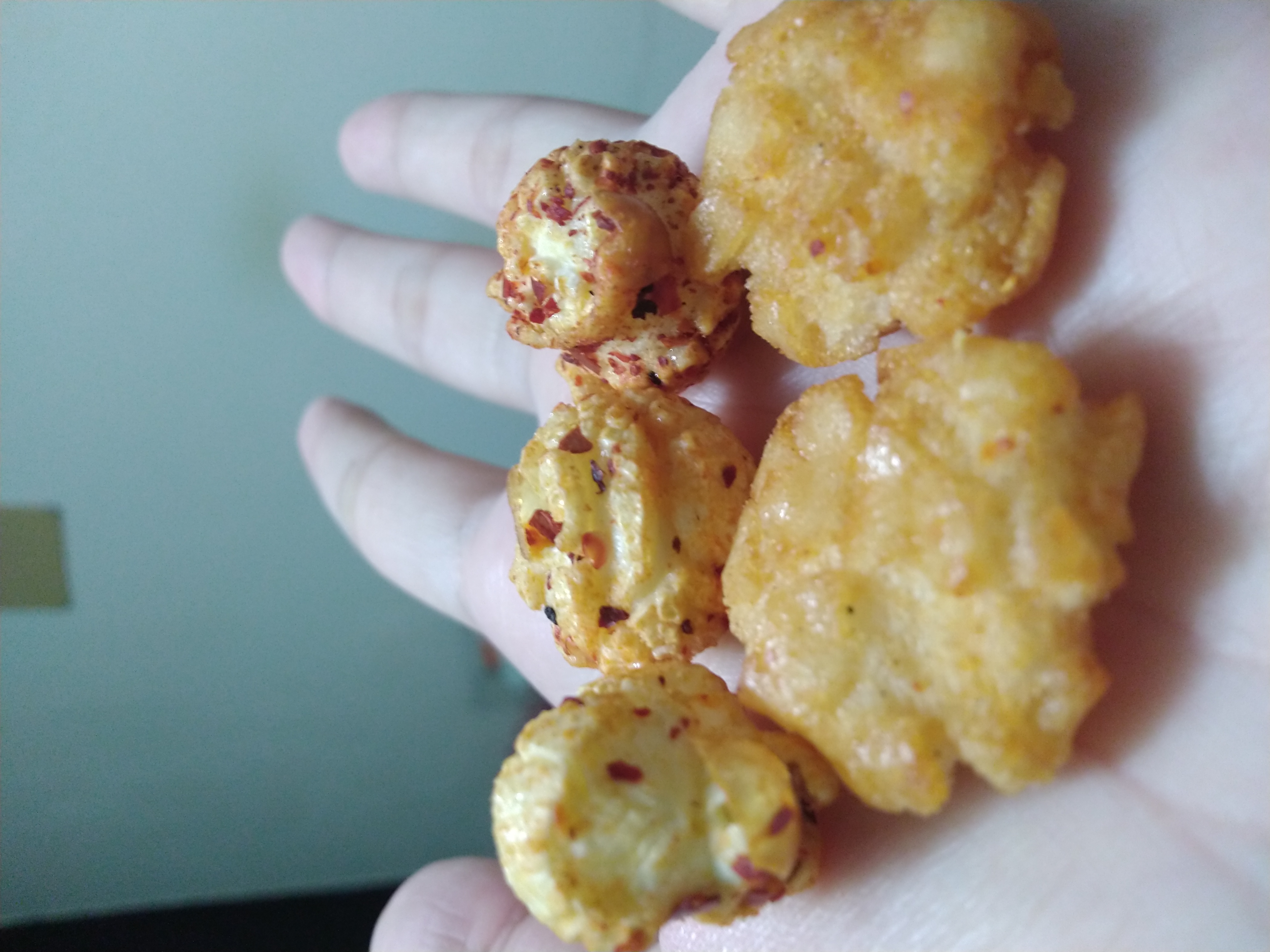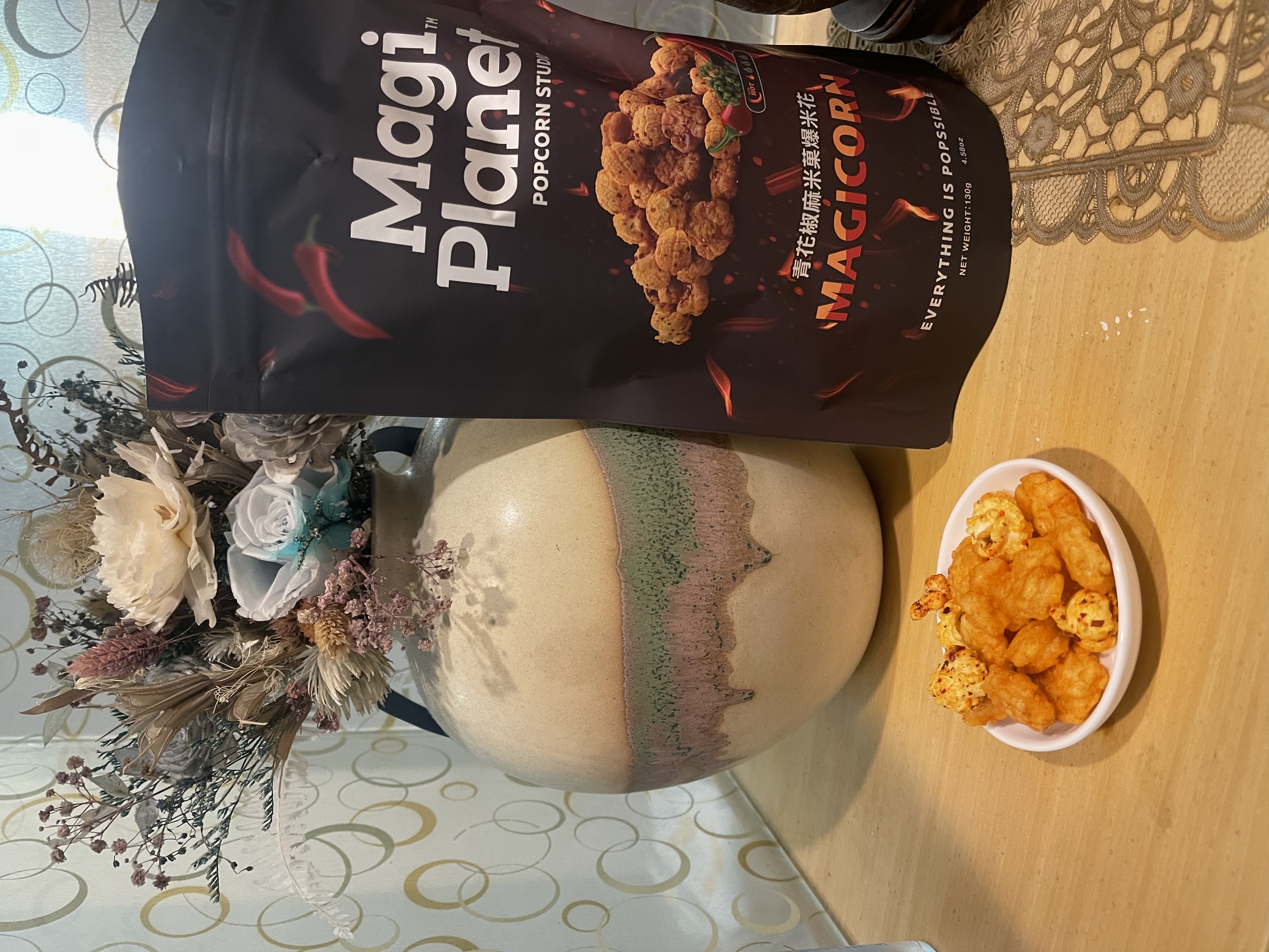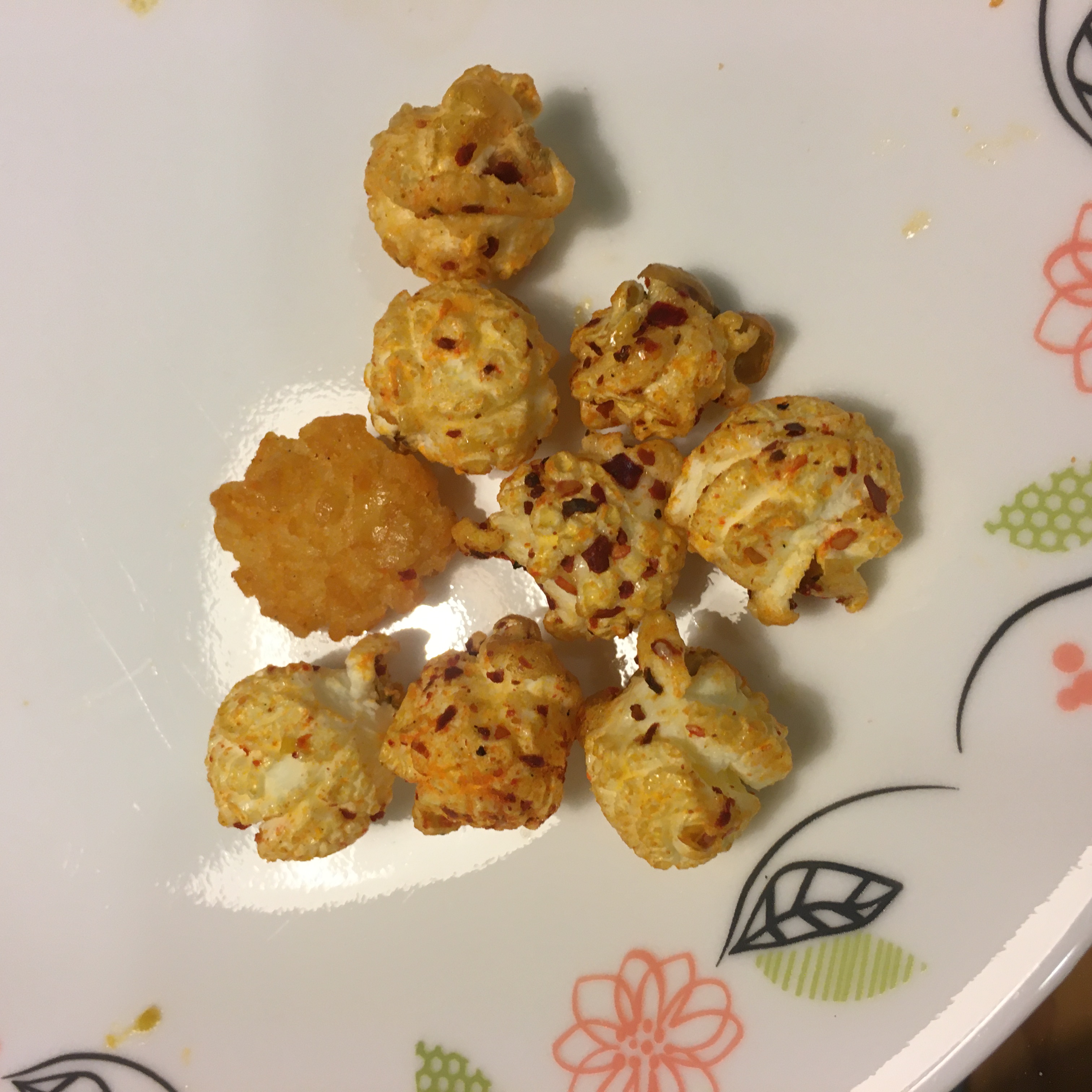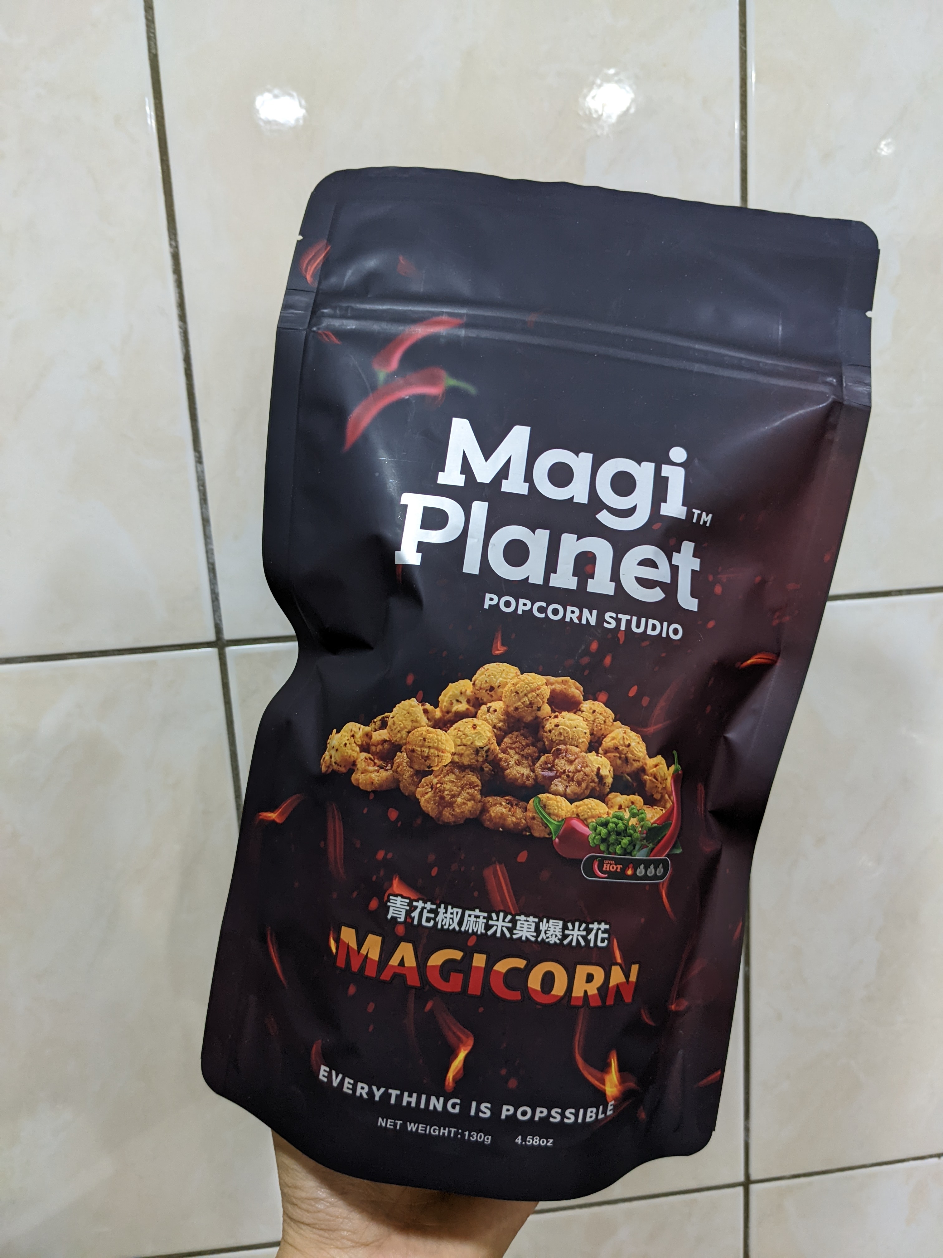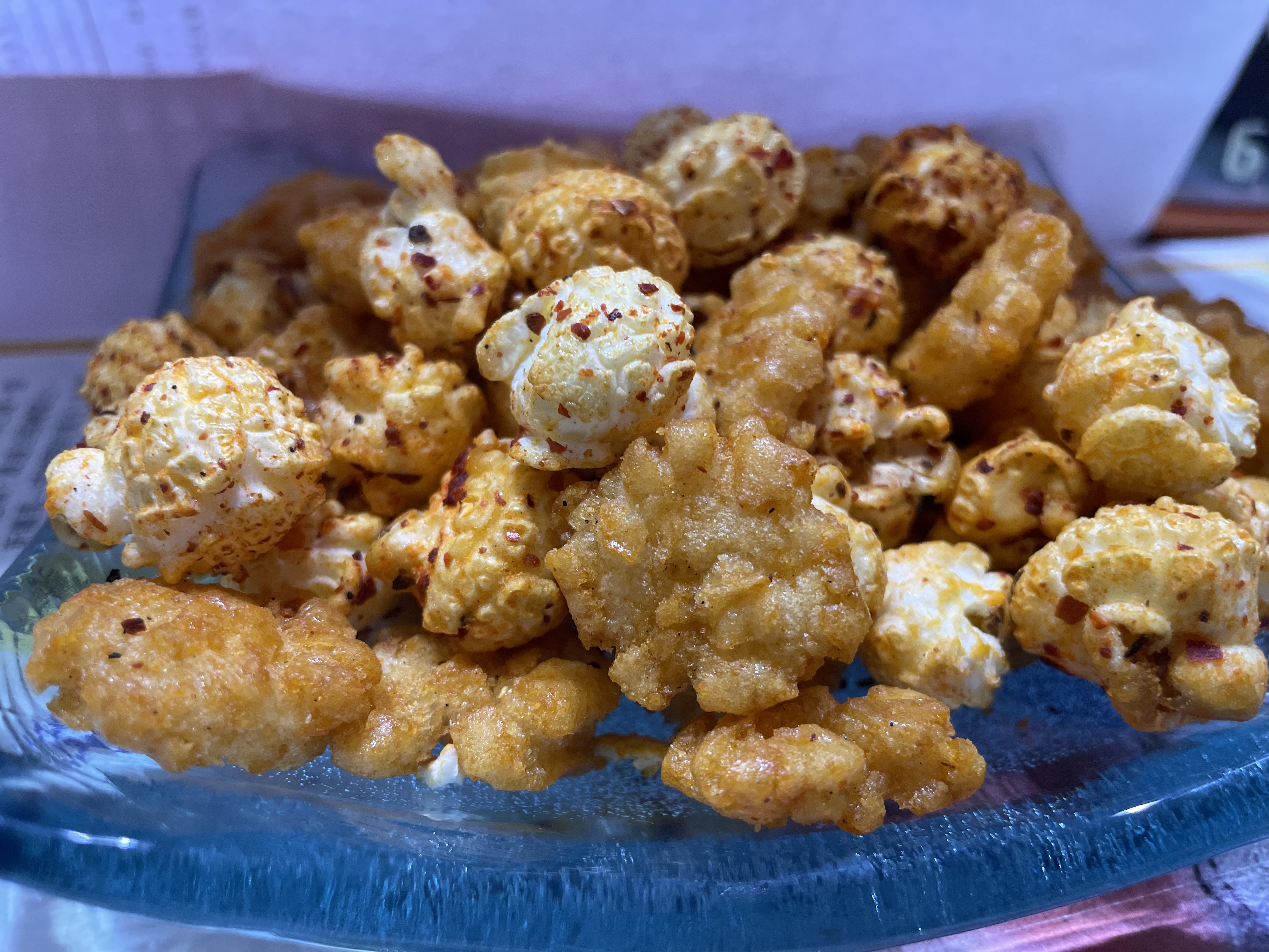 爆米花【 糖 ( 砂糖、葡萄糖、海藻糖)、進口玉米粒( 非基因改造)、棕櫚油、青花椒調味粉[ 椒麻粉( 辣椒粉、花椒粉)、麥芽糊精、酵母抽出物、鹽、醬油粉( 純釀造醬油、麥芽糊精、鹽、砂糖、焦糖色素、琥珀酸二鈉、5'-次黃嘌呤核苷磷酸二鈉、5'-鳥嘌呤核苷磷酸二鈉)、小麥纖維、油性辣椒紅( 紅椒色素、精製葵花油)、花椒萃取物]】