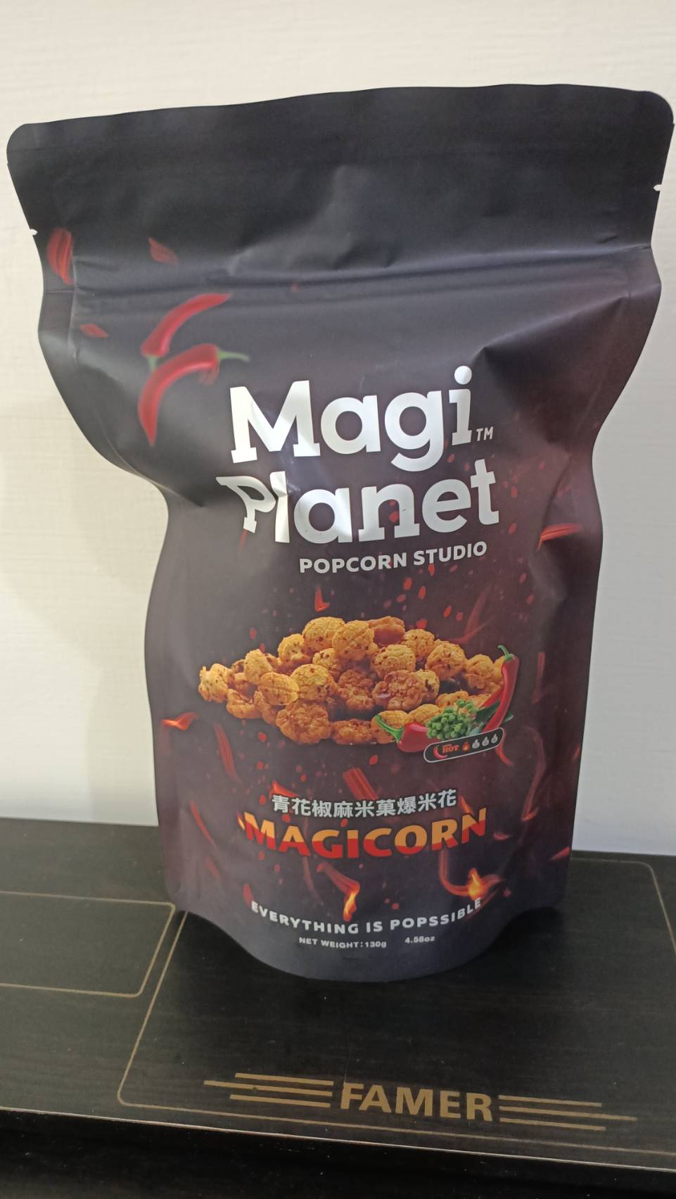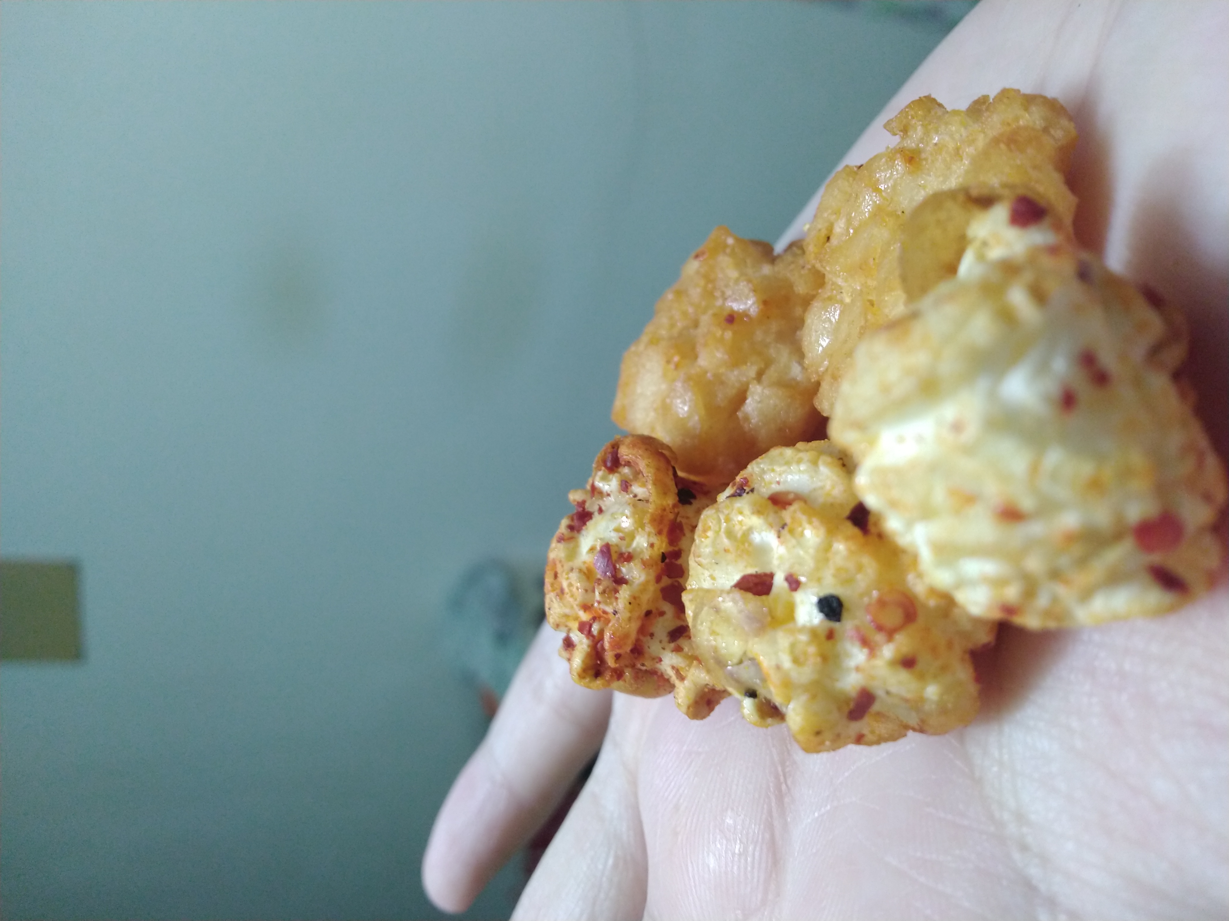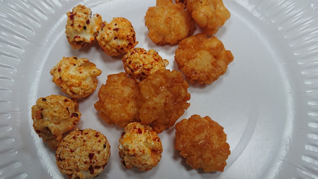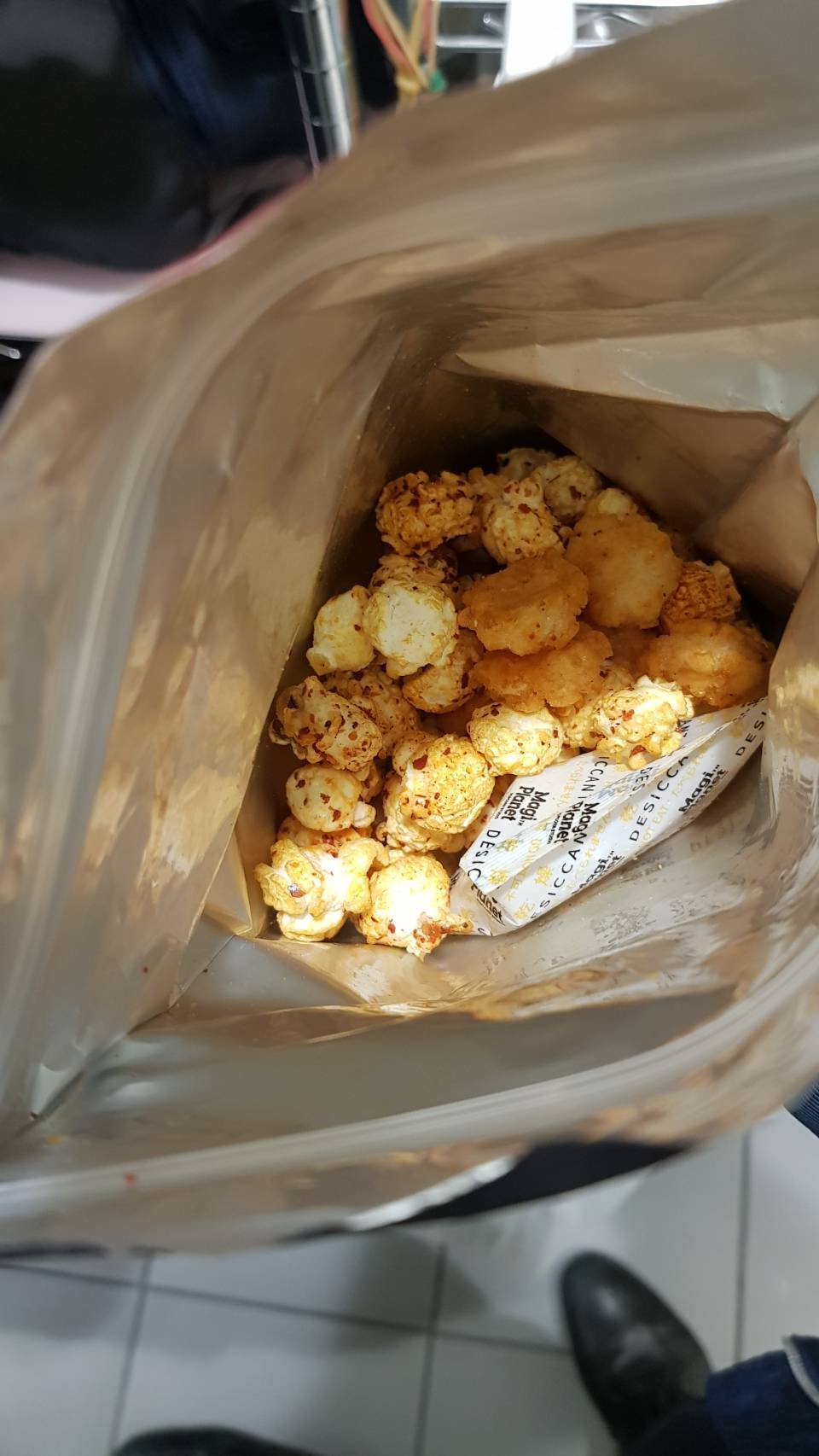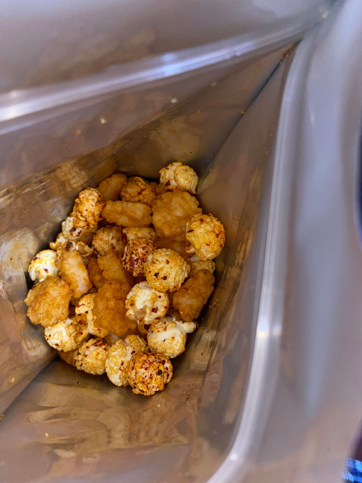 爆米花【 糖 ( 砂糖、葡萄糖、海藻糖)、進口玉米粒( 非基因改造)、棕櫚油、青花椒調味粉[ 椒麻粉( 辣椒粉、花椒粉)、麥芽糊精、酵母抽出物、鹽、醬油粉( 純釀造醬油、麥芽糊精、鹽、砂糖、焦糖色素、琥珀酸二鈉、5'-次黃嘌呤核苷磷酸二鈉、5'-鳥嘌呤核苷磷酸二鈉)、小麥纖維、油性辣椒紅( 紅椒色素、精製葵花油)、花椒萃取物]】