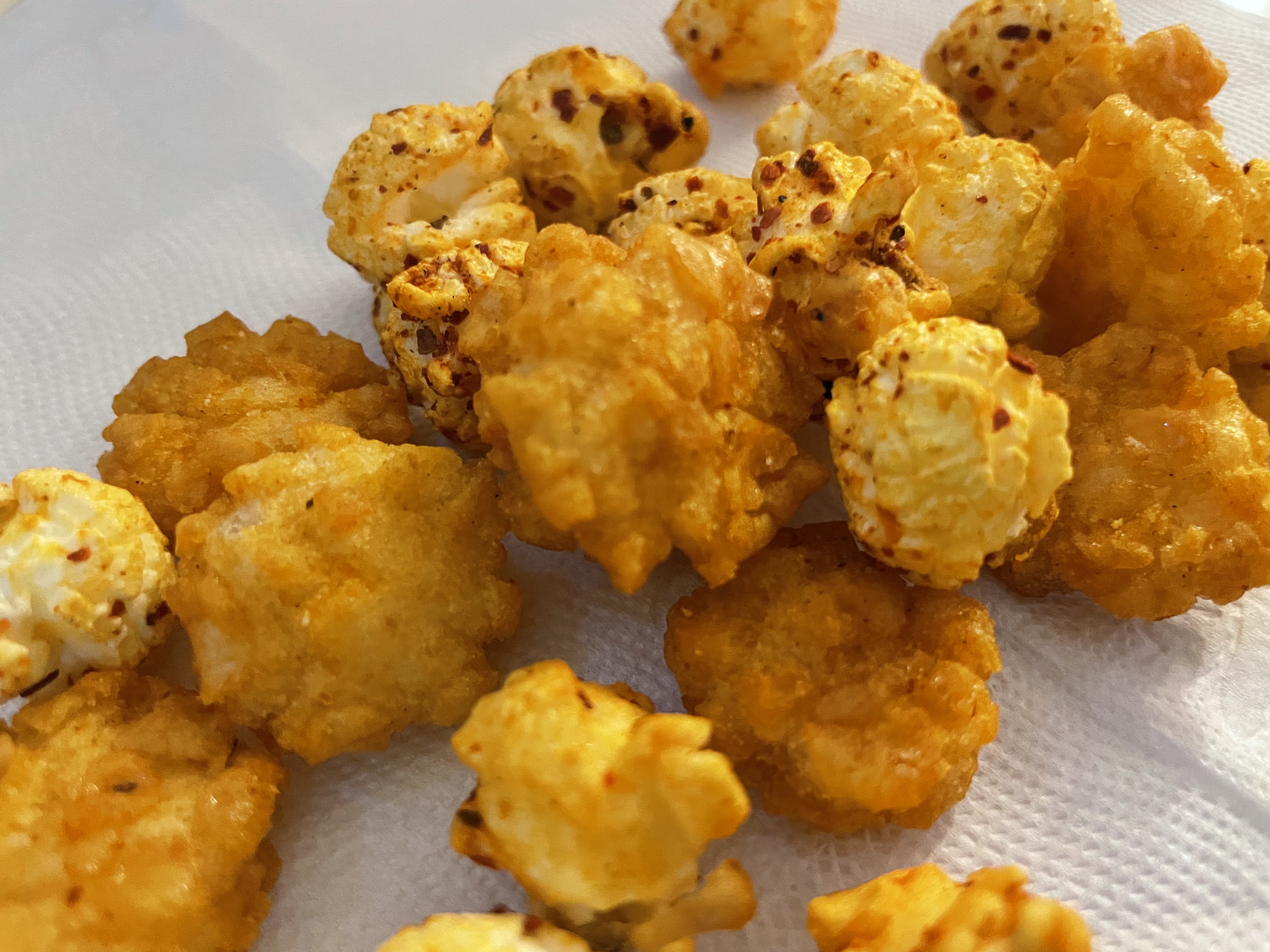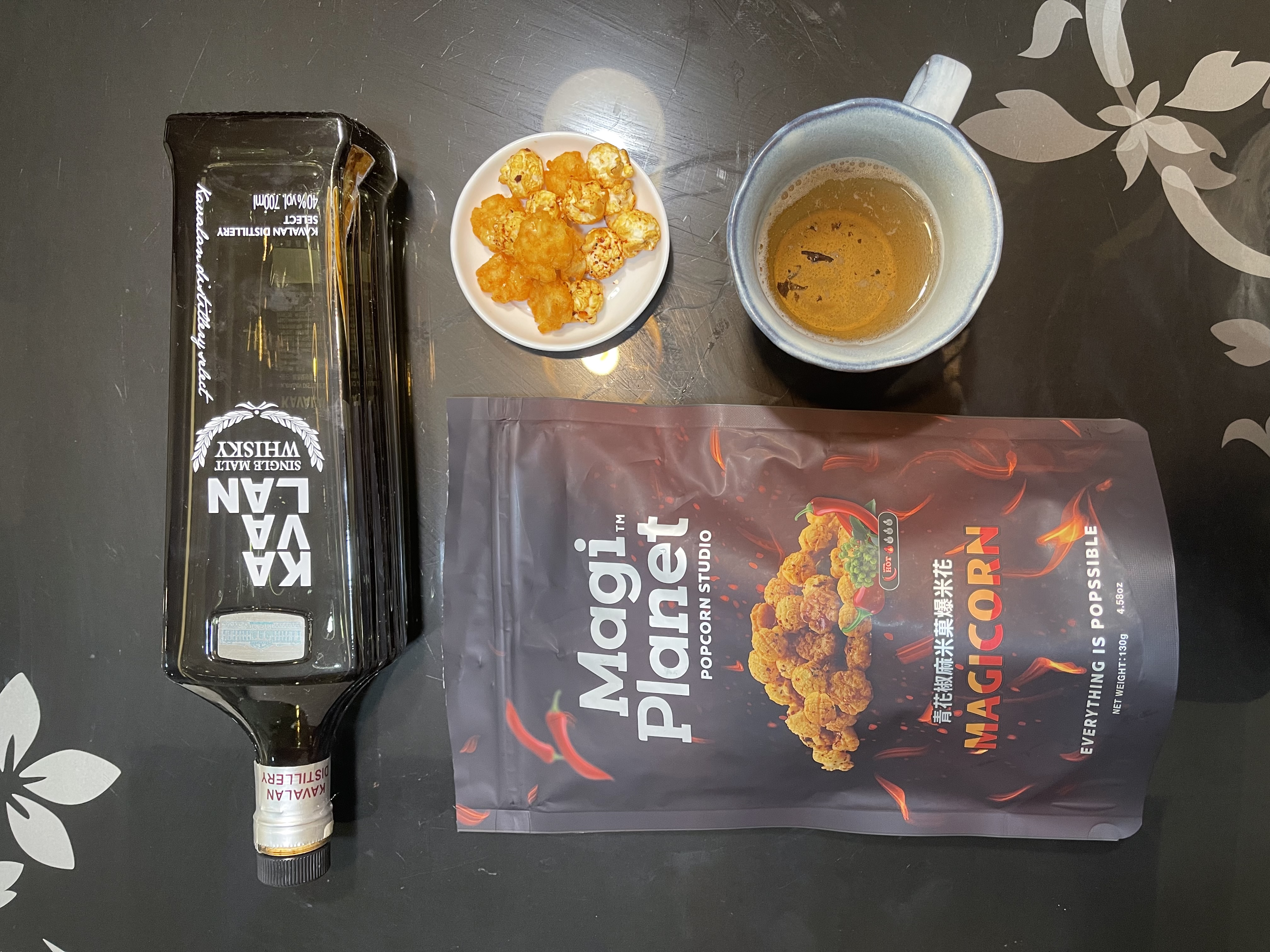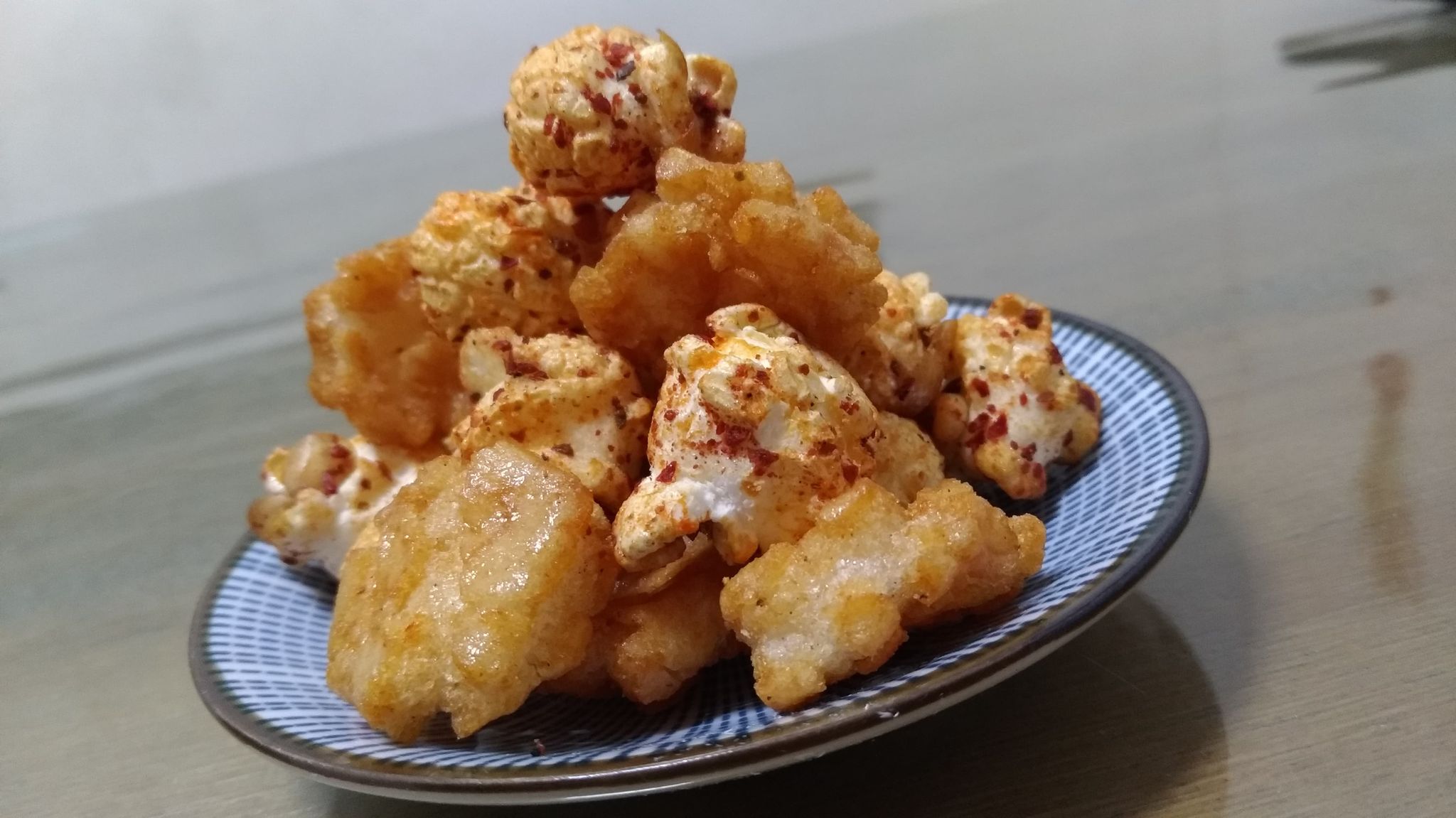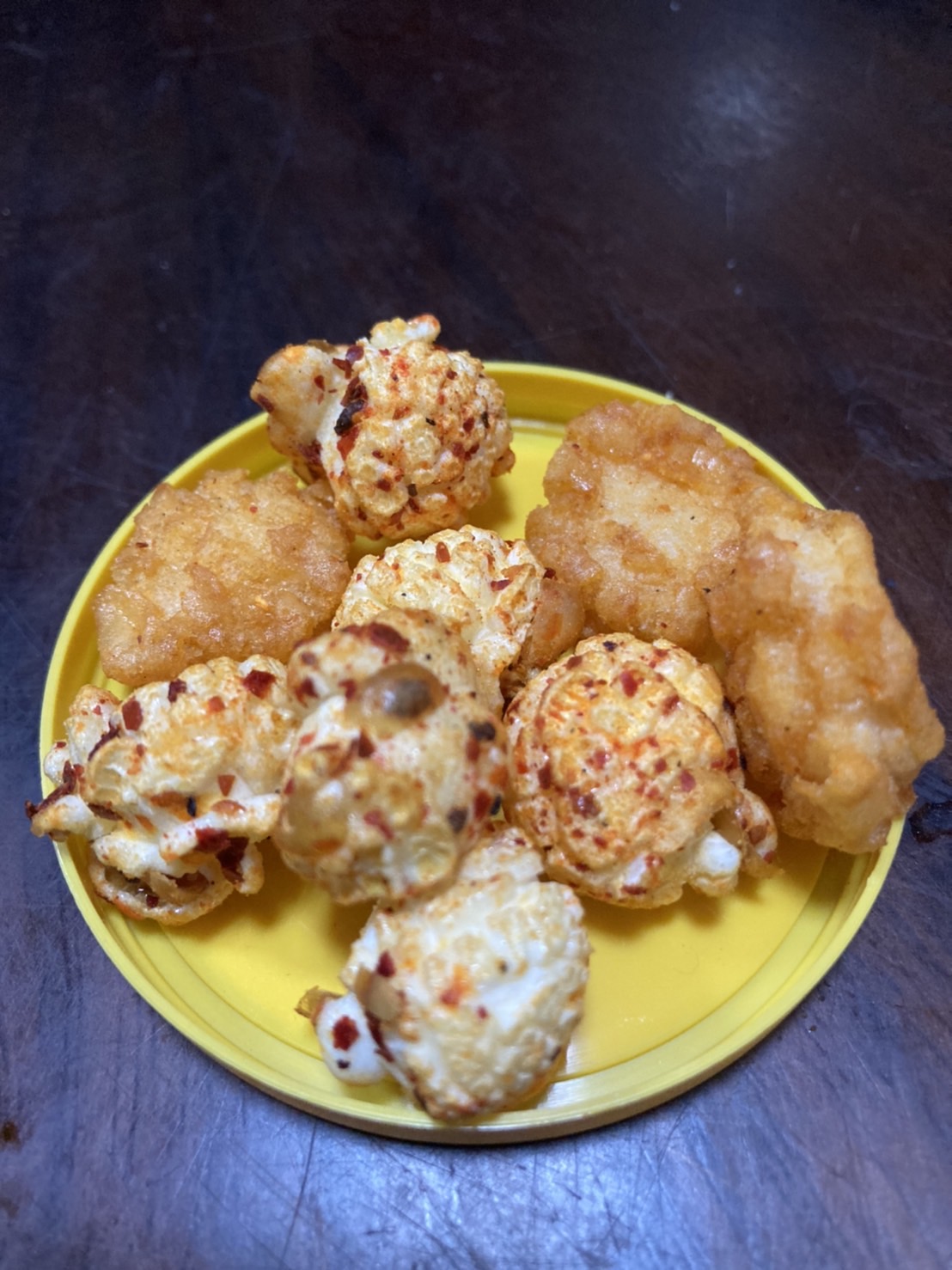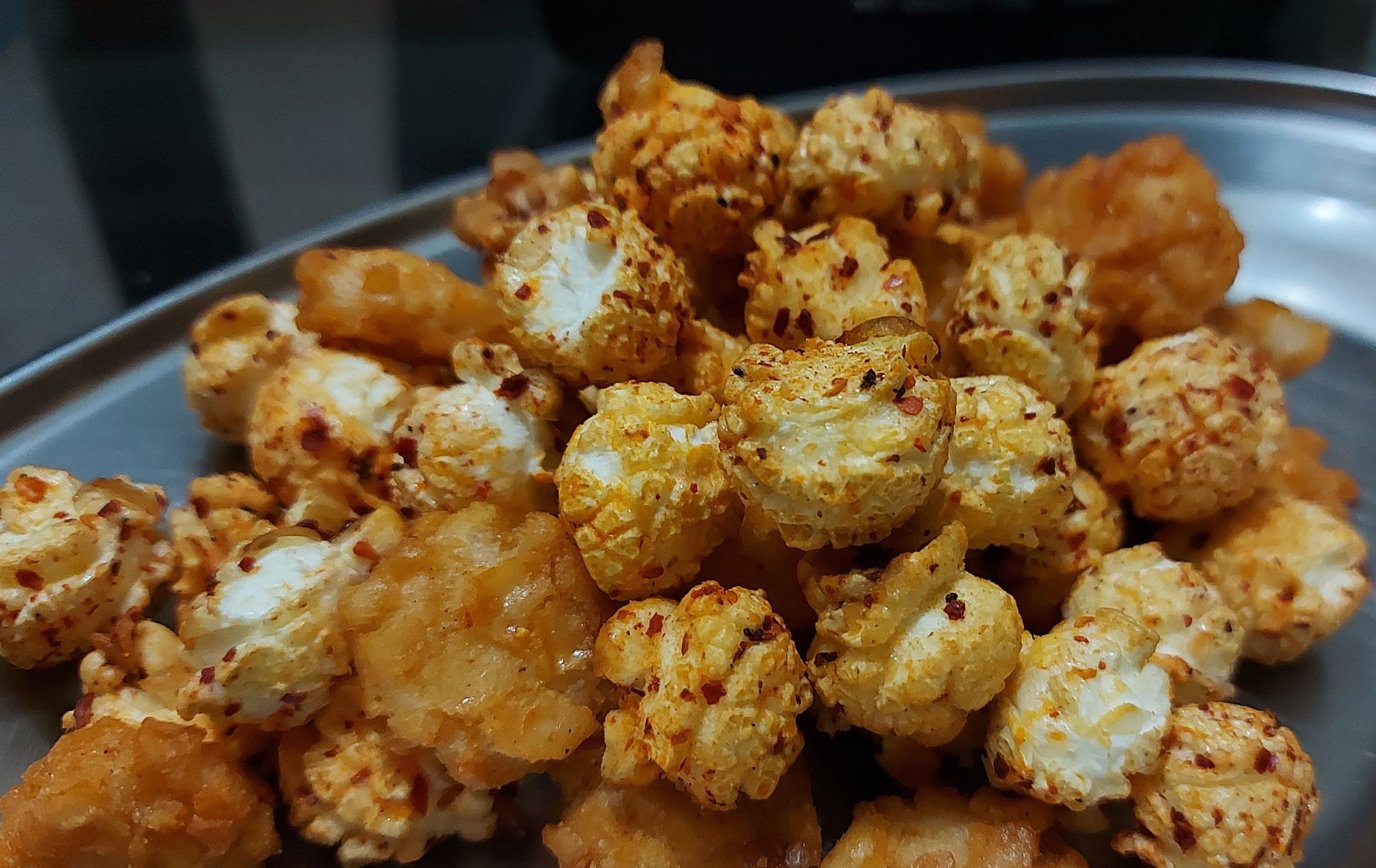 爆米花【 糖 ( 砂糖、葡萄糖、海藻糖)、進口玉米粒( 非基因改造)、棕櫚油、青花椒調味粉[ 椒麻粉( 辣椒粉、花椒粉)、麥芽糊精、酵母抽出物、鹽、醬油粉( 純釀造醬油、麥芽糊精、鹽、砂糖、焦糖色素、琥珀酸二鈉、5'-次黃嘌呤核苷磷酸二鈉、5'-鳥嘌呤核苷磷酸二鈉)、小麥纖維、油性辣椒紅( 紅椒色素、精製葵花油)、花椒萃取物]】