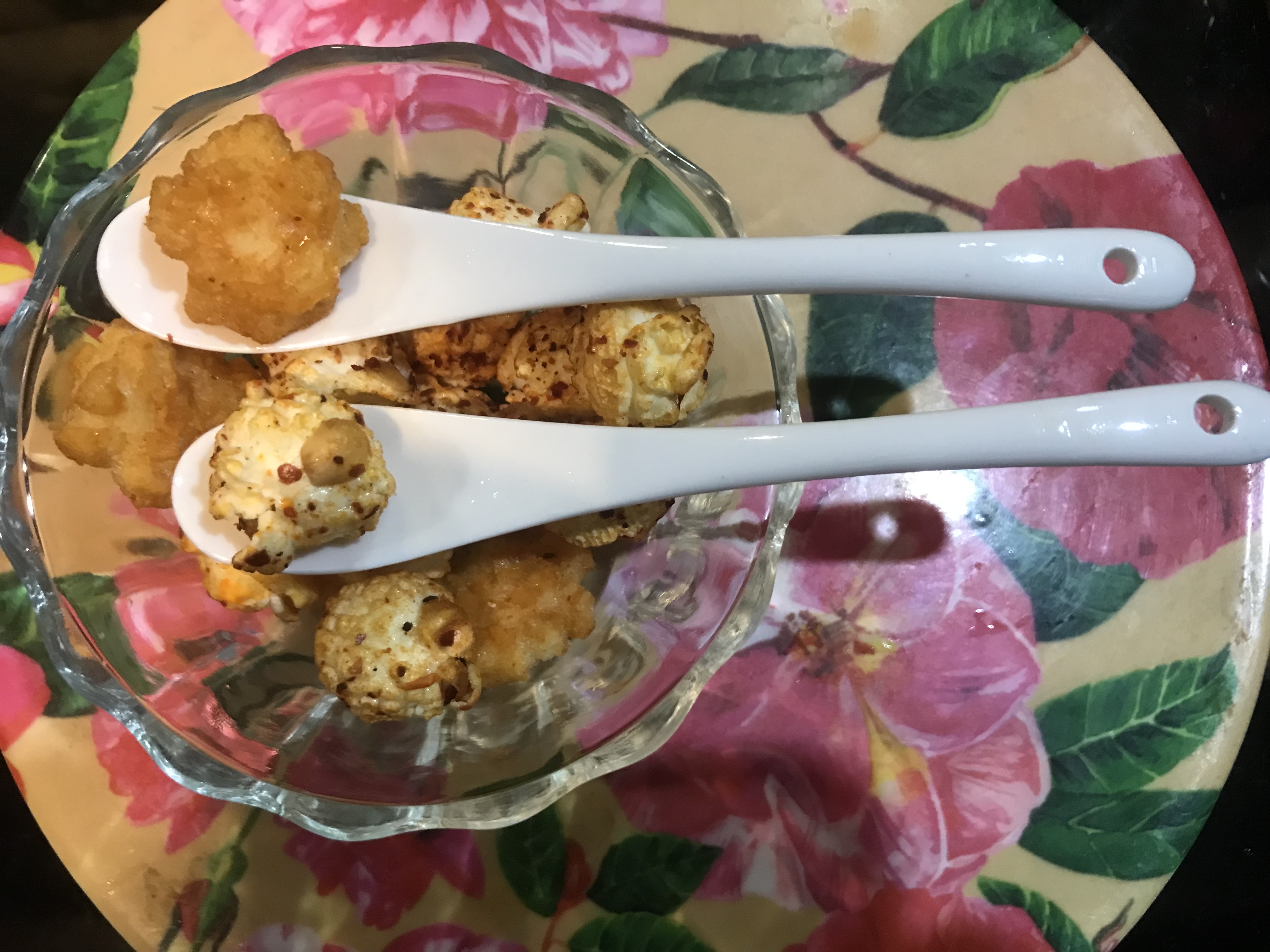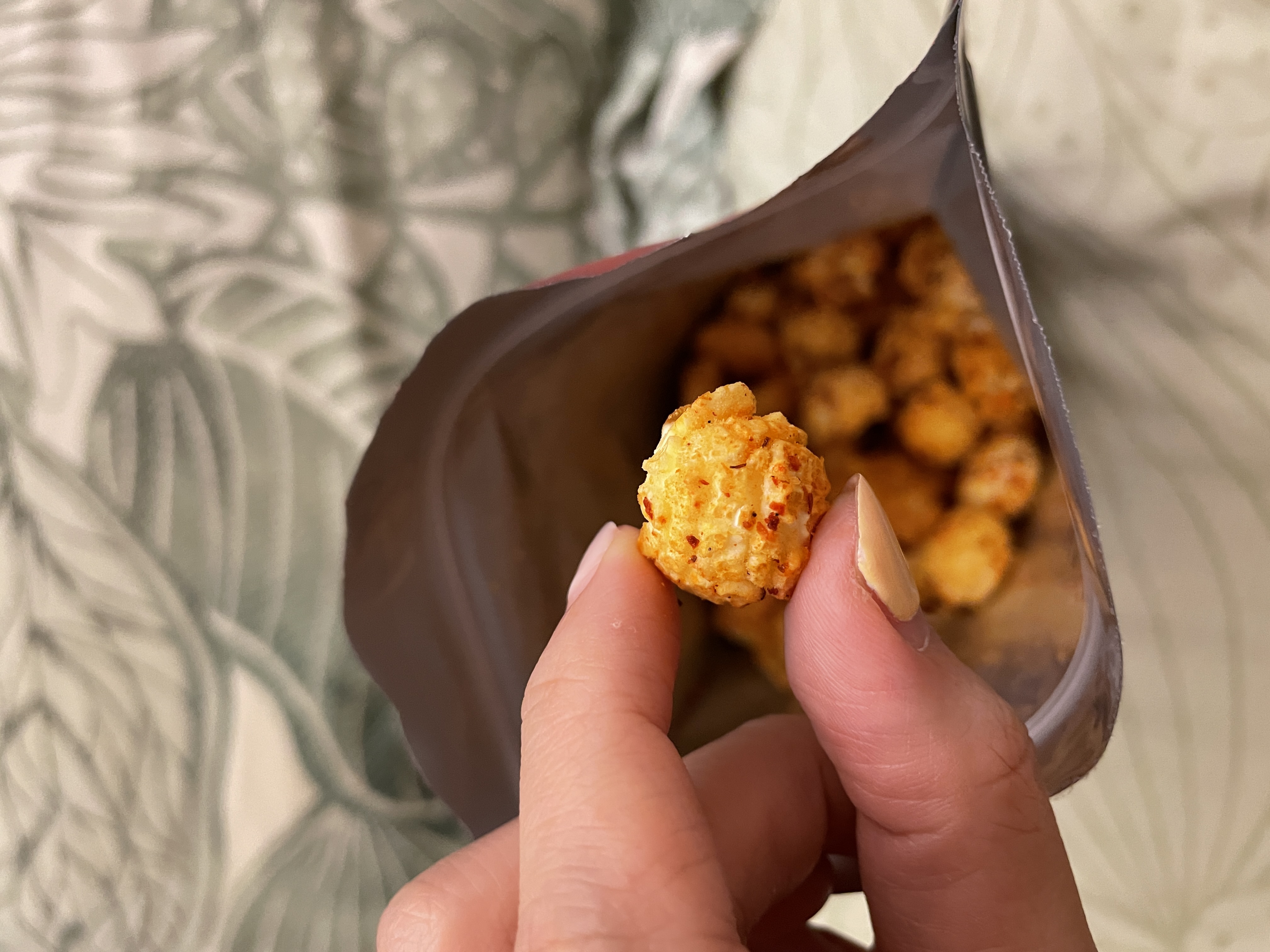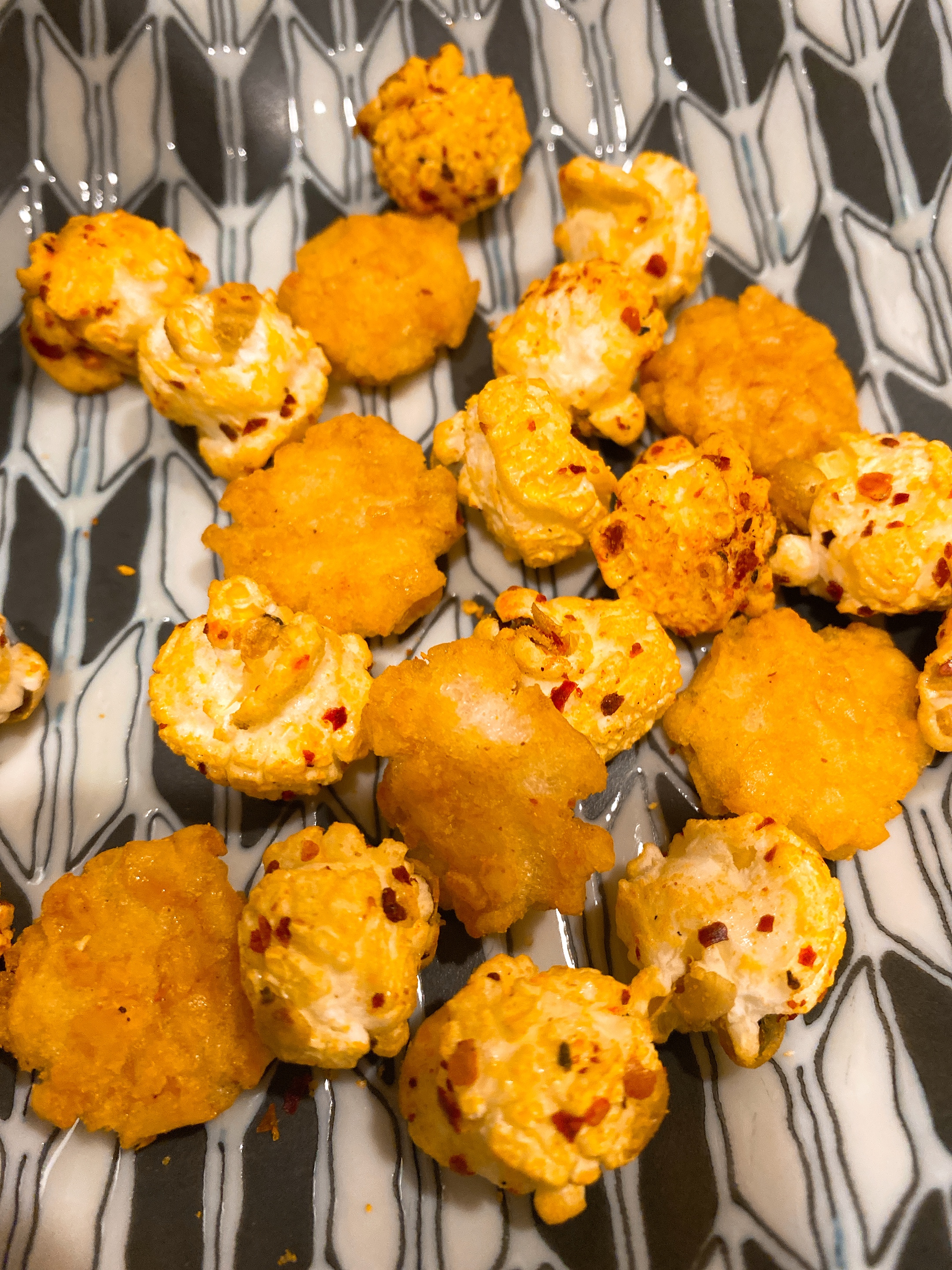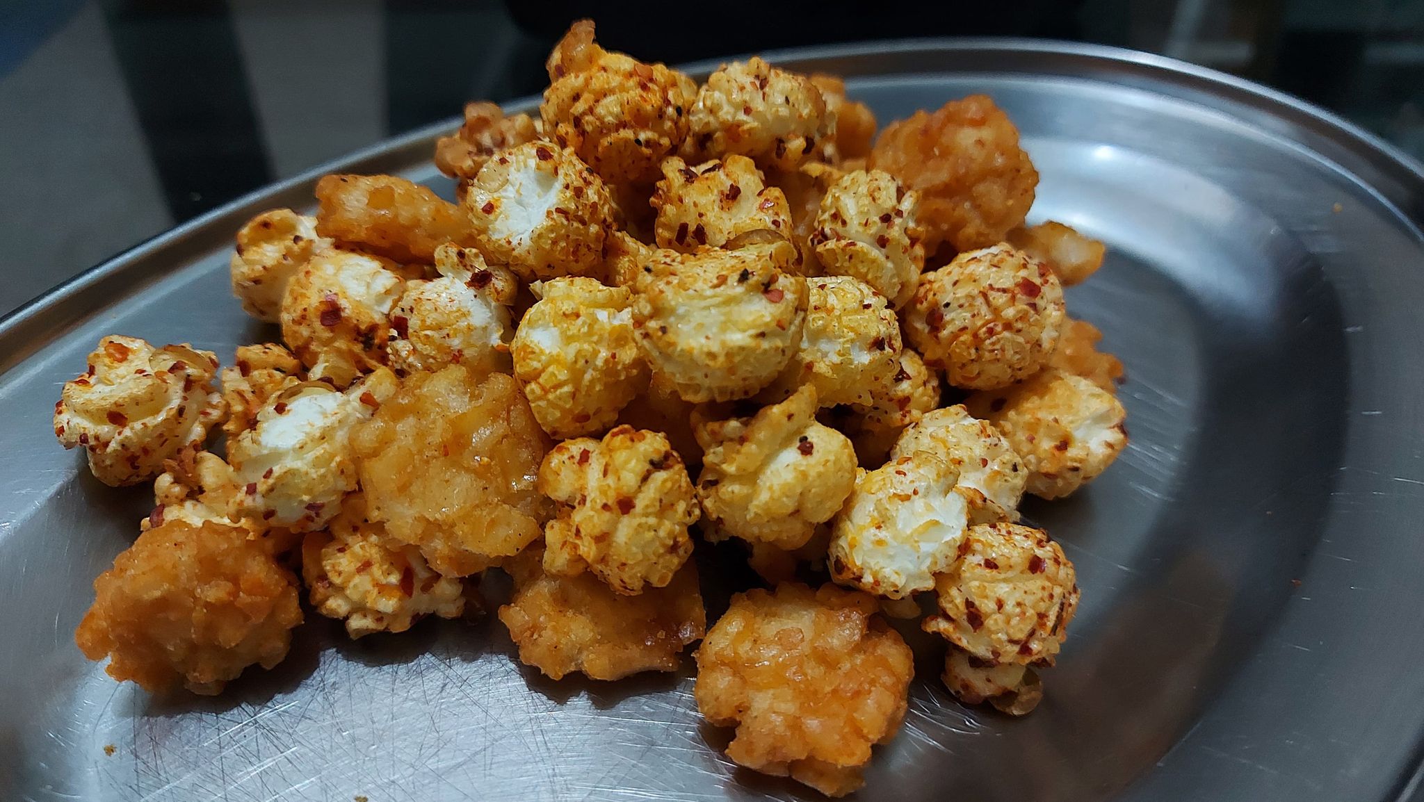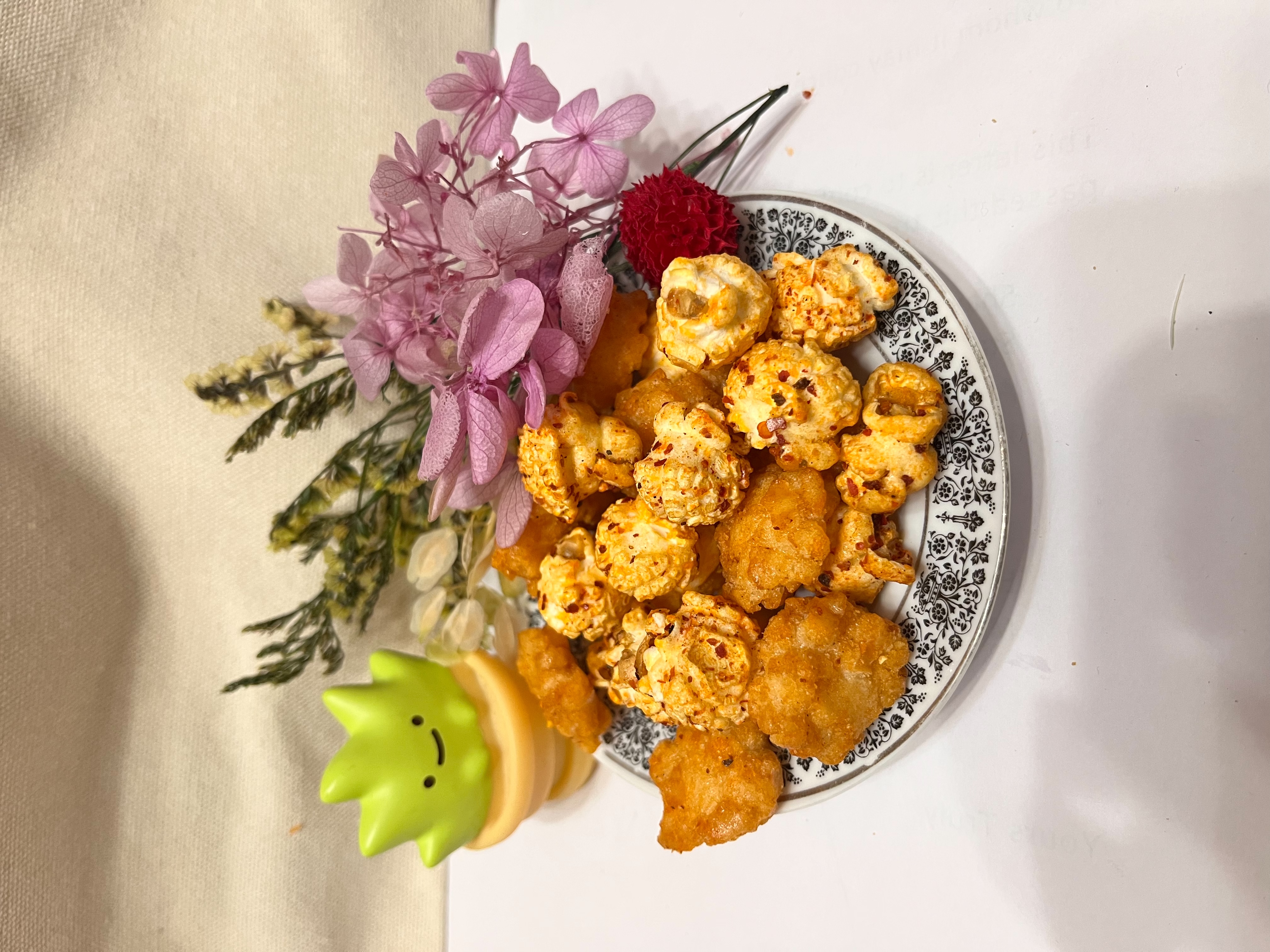 爆米花【 糖 ( 砂糖、葡萄糖、海藻糖)、進口玉米粒( 非基因改造)、棕櫚油、青花椒調味粉[ 椒麻粉( 辣椒粉、花椒粉)、麥芽糊精、酵母抽出物、鹽、醬油粉( 純釀造醬油、麥芽糊精、鹽、砂糖、焦糖色素、琥珀酸二鈉、5'-次黃嘌呤核苷磷酸二鈉、5'-鳥嘌呤核苷磷酸二鈉)、小麥纖維、油性辣椒紅( 紅椒色素、精製葵花油)、花椒萃取物]】