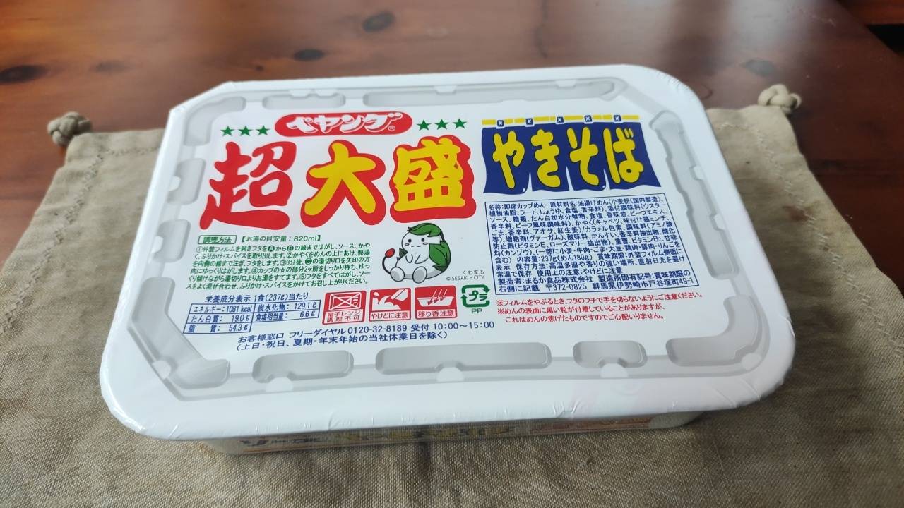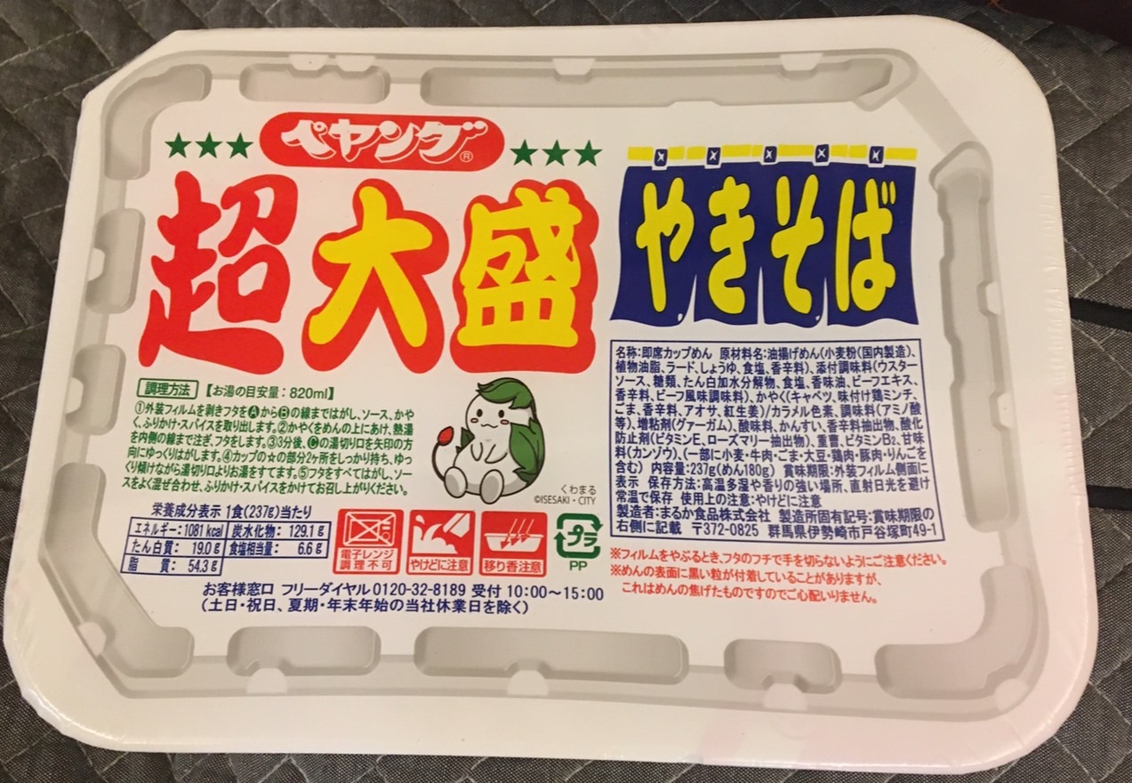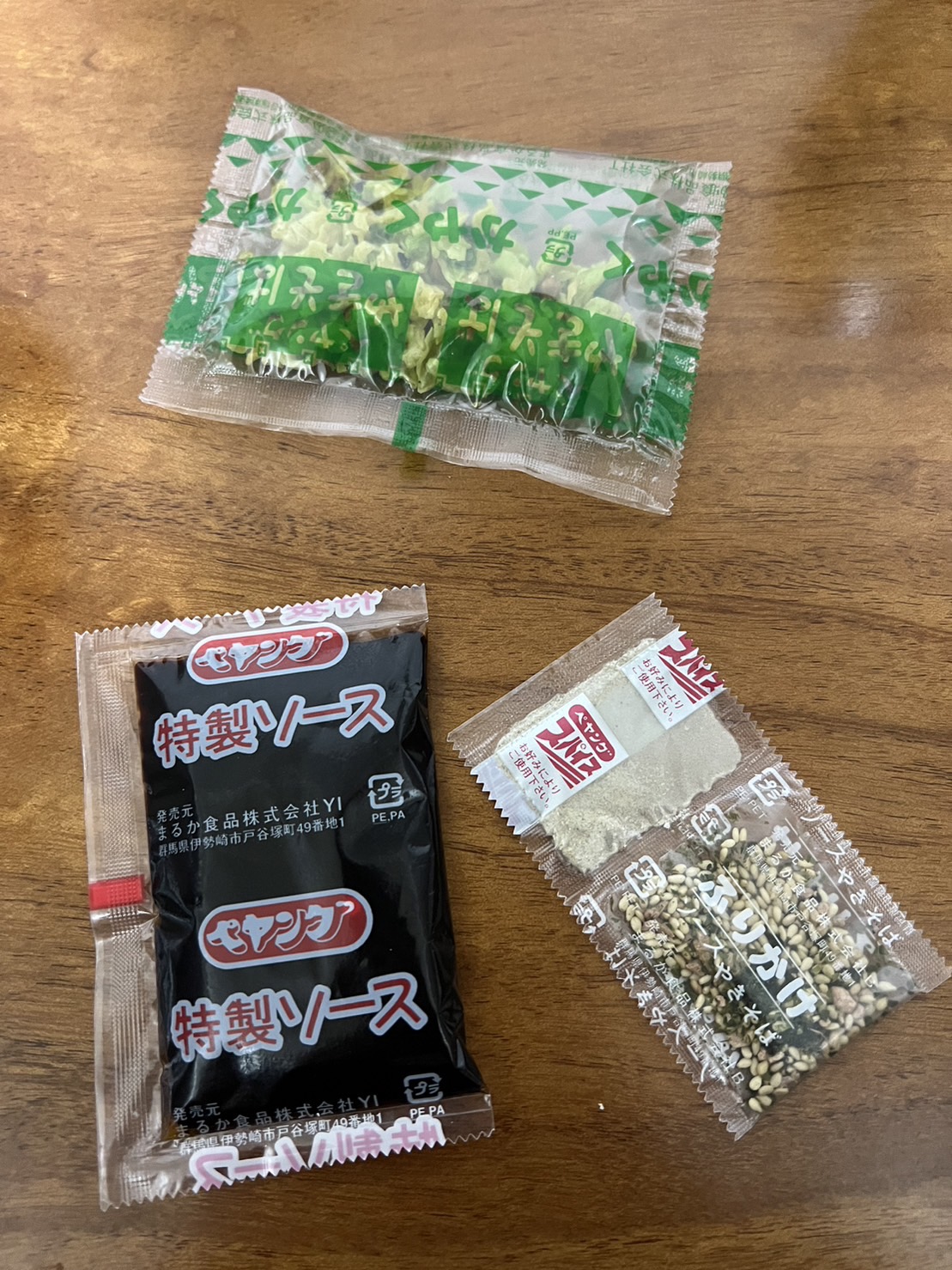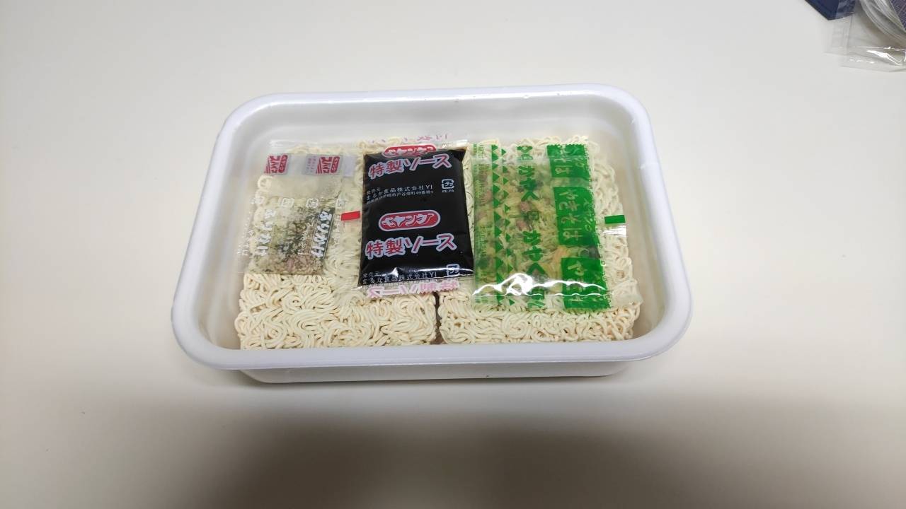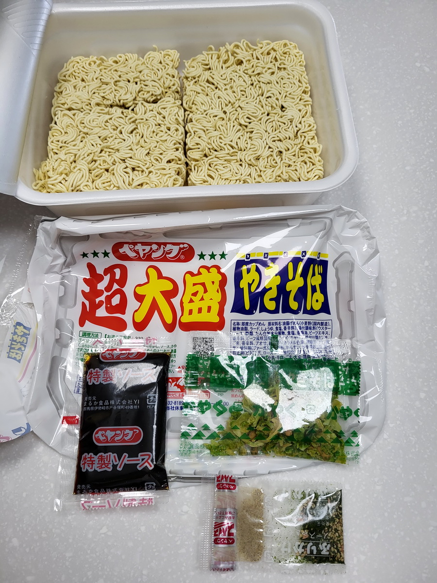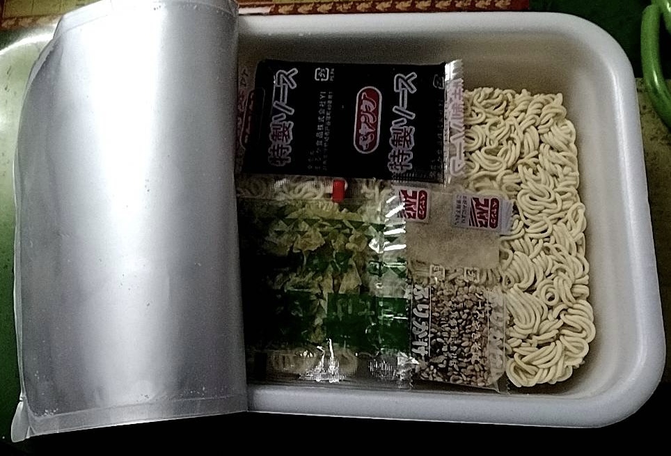 調味炒麵(小麥粉、豬油、植物油、鹽、醬油、香料)、辣醬油、捲心菜、糖、蛋白質水解物、豬肉碎、鹽、香油、芝麻、香料、紅姜、aosa、牛肉提取物、焦糖色素、調味料(氨基酸等)、增稠劑(瓜爾豆膠)、酸味劑、柑橘、抗氧化劑(維生素E)、香料提取物、維生素B2、紫蘇色素、(部分原料有醬油、牛肉、豬肉、蘋果)