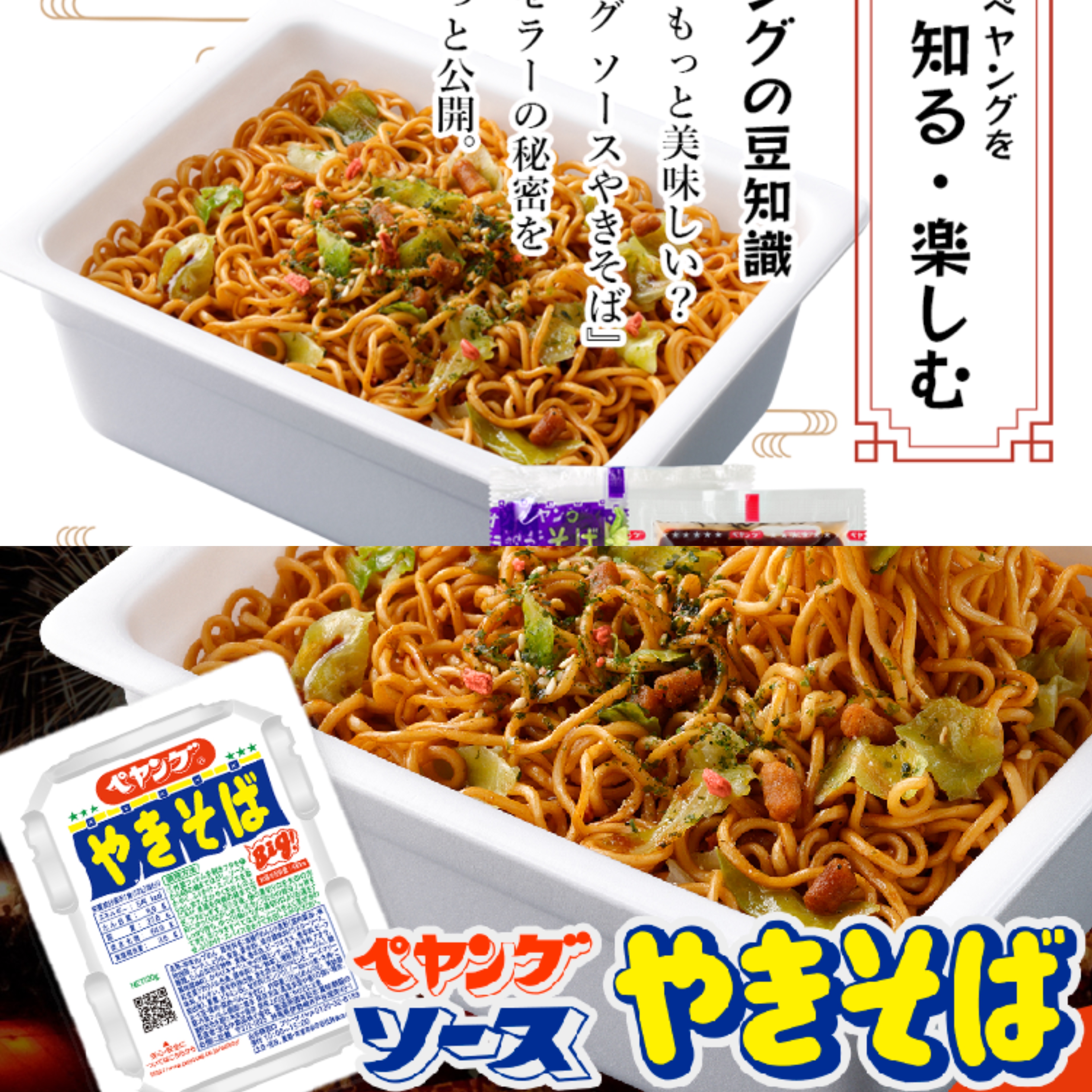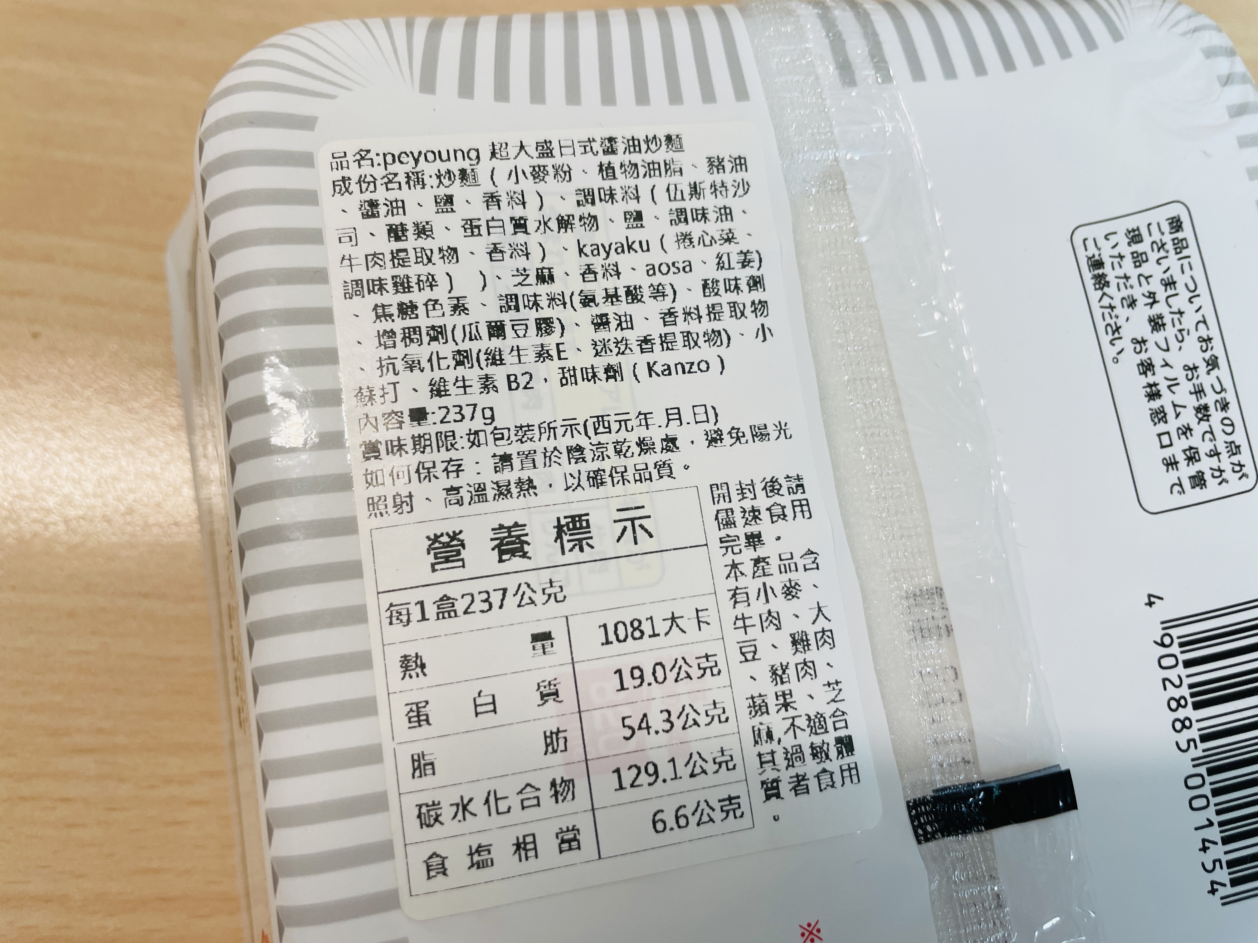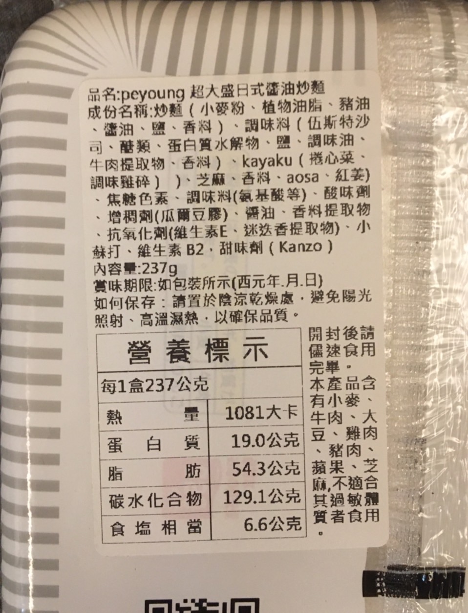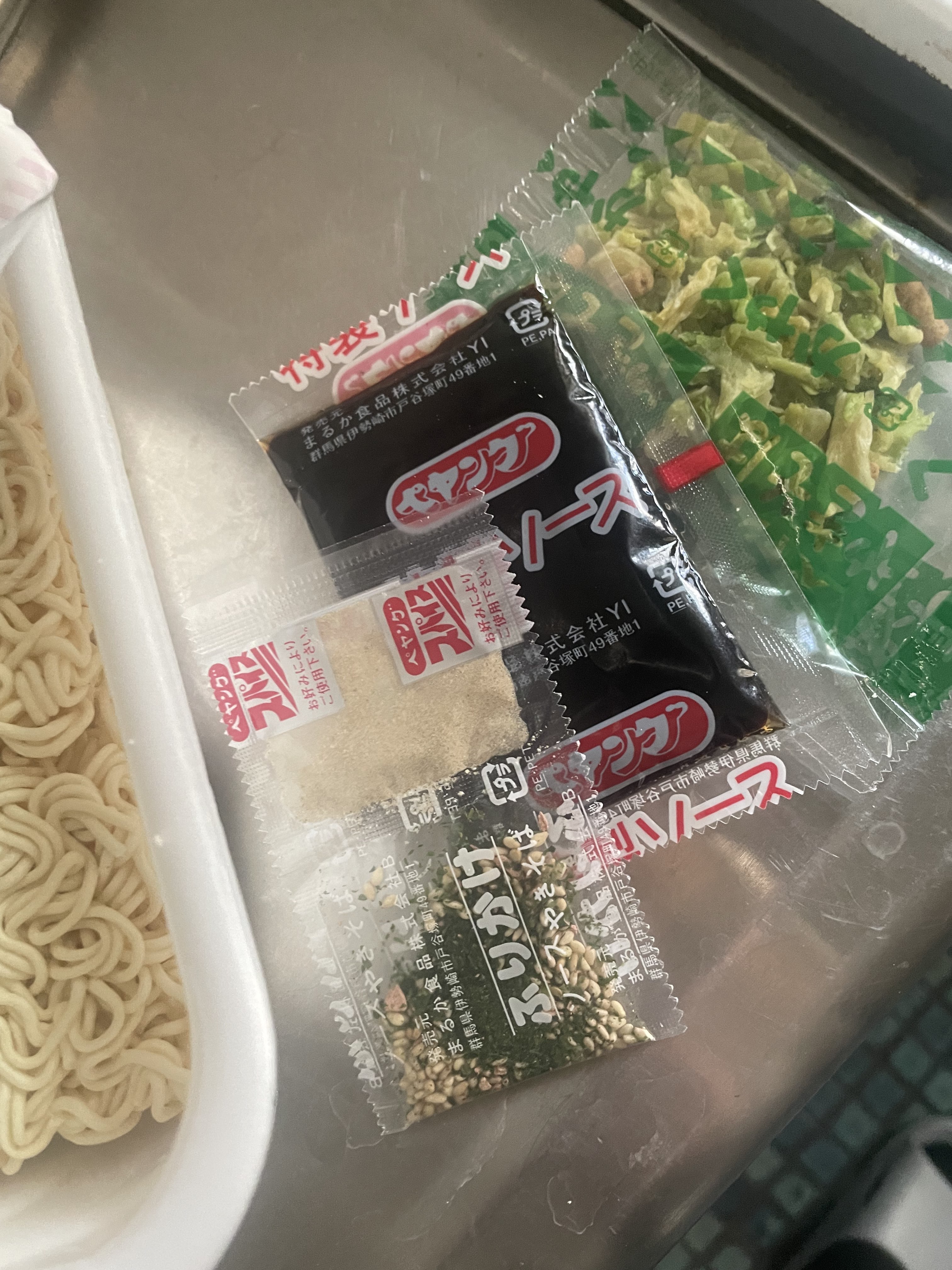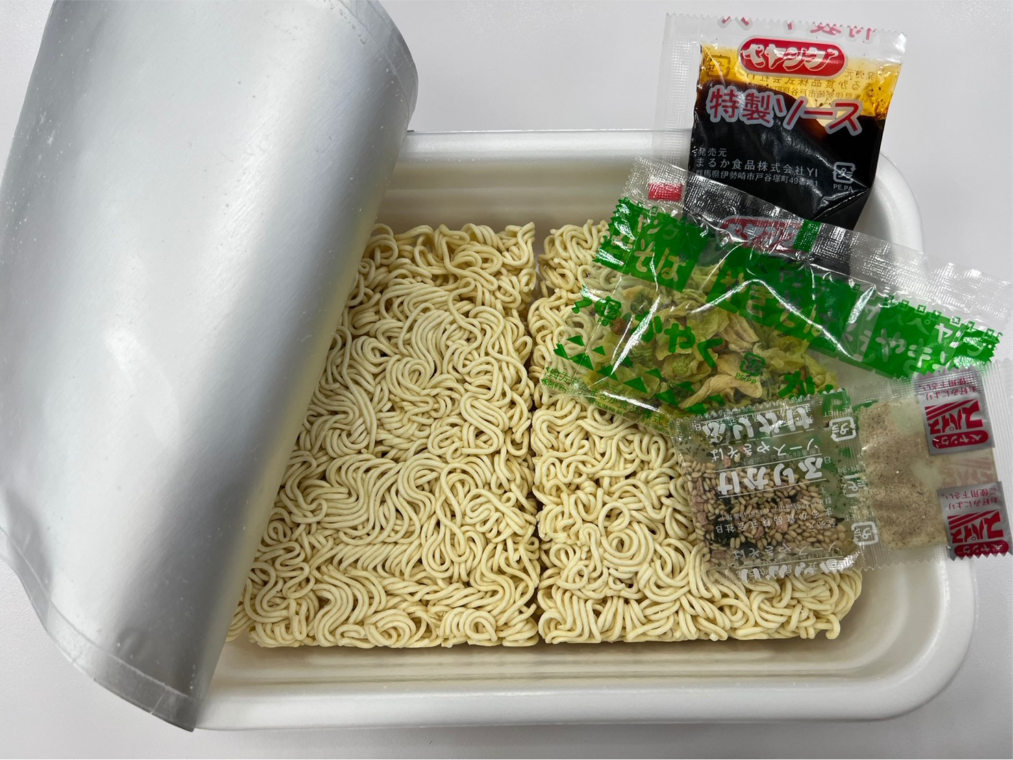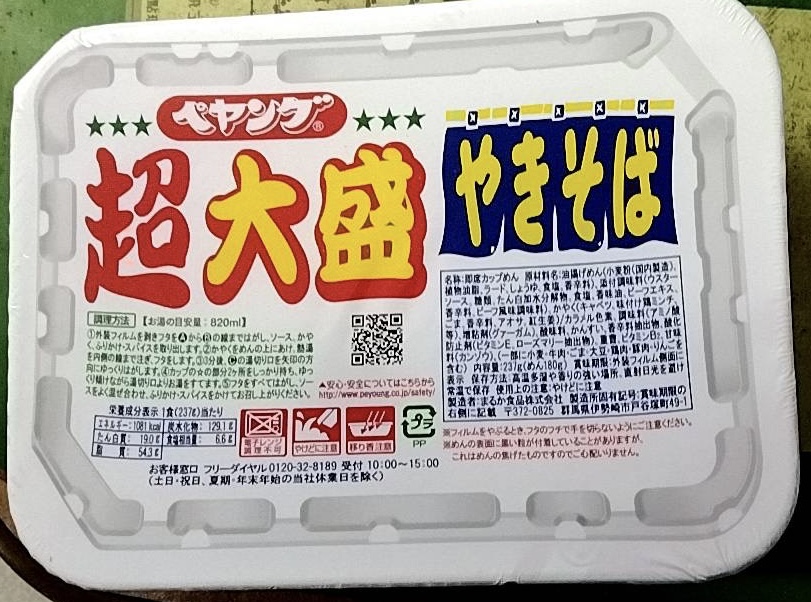 調味炒麵(小麥粉、豬油、植物油、鹽、醬油、香料)、辣醬油、捲心菜、糖、蛋白質水解物、豬肉碎、鹽、香油、芝麻、香料、紅姜、aosa、牛肉提取物、焦糖色素、調味料(氨基酸等)、增稠劑(瓜爾豆膠)、酸味劑、柑橘、抗氧化劑(維生素E)、香料提取物、維生素B2、紫蘇色素、(部分原料有醬油、牛肉、豬肉、蘋果)