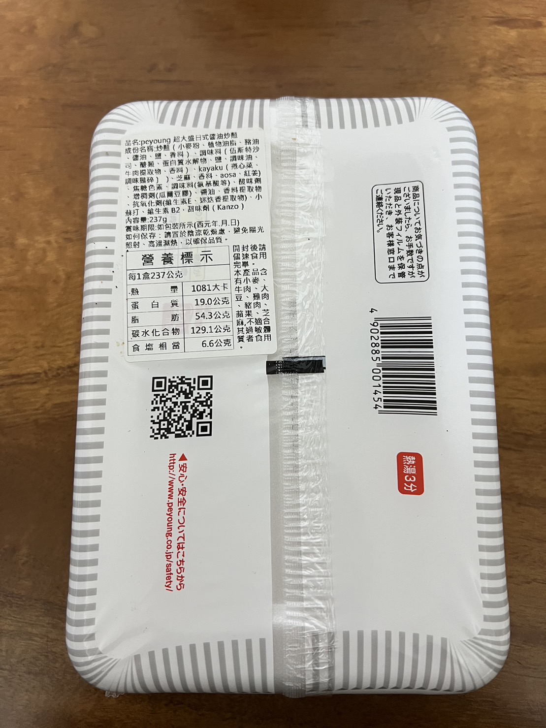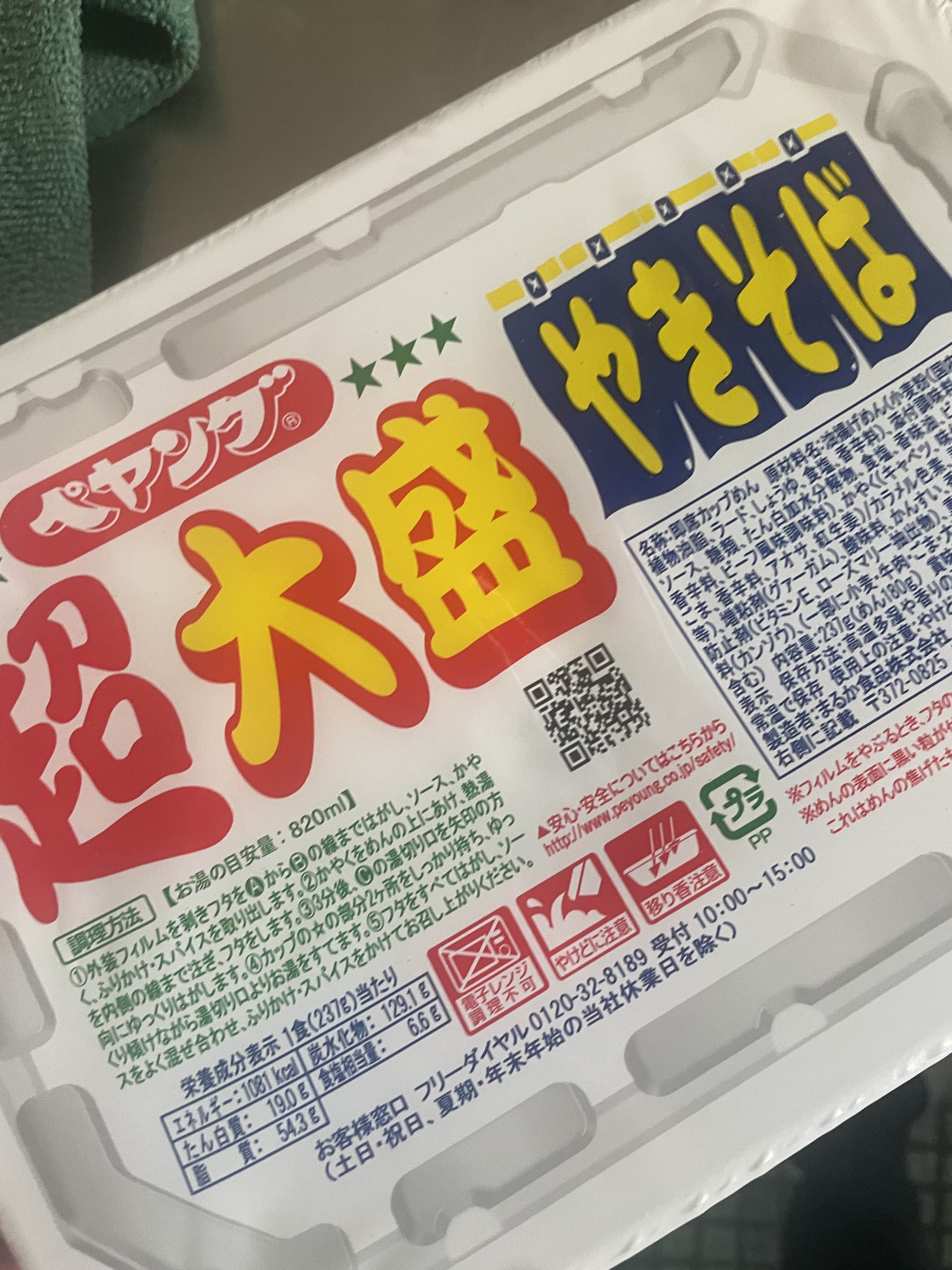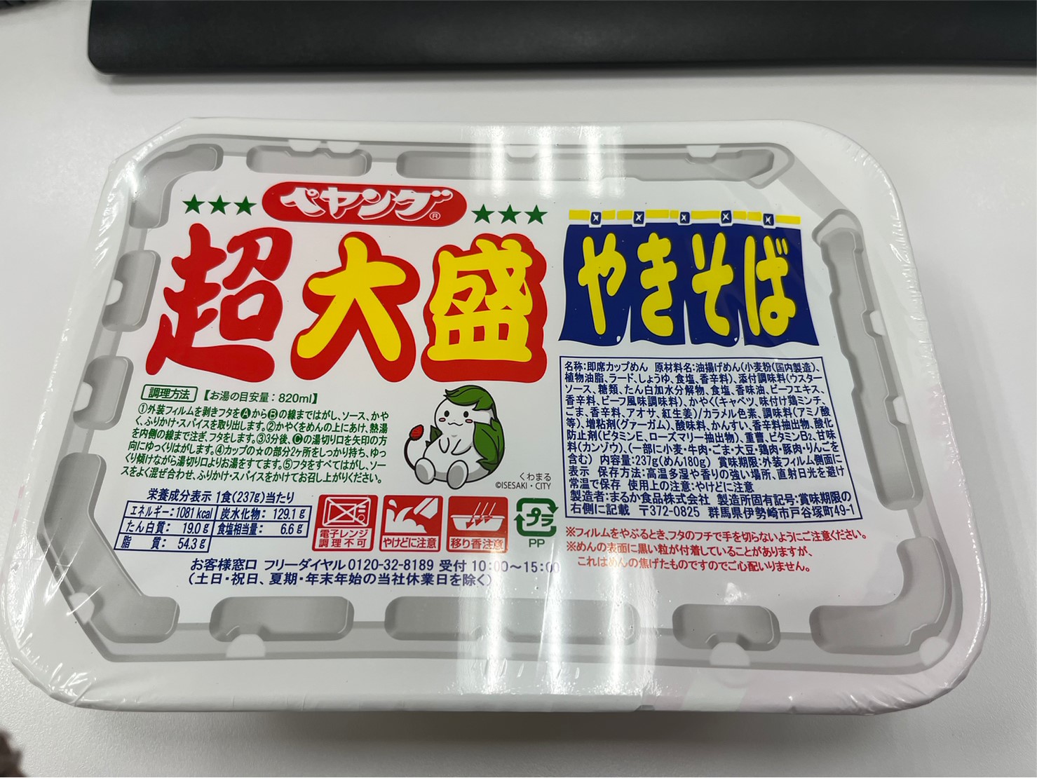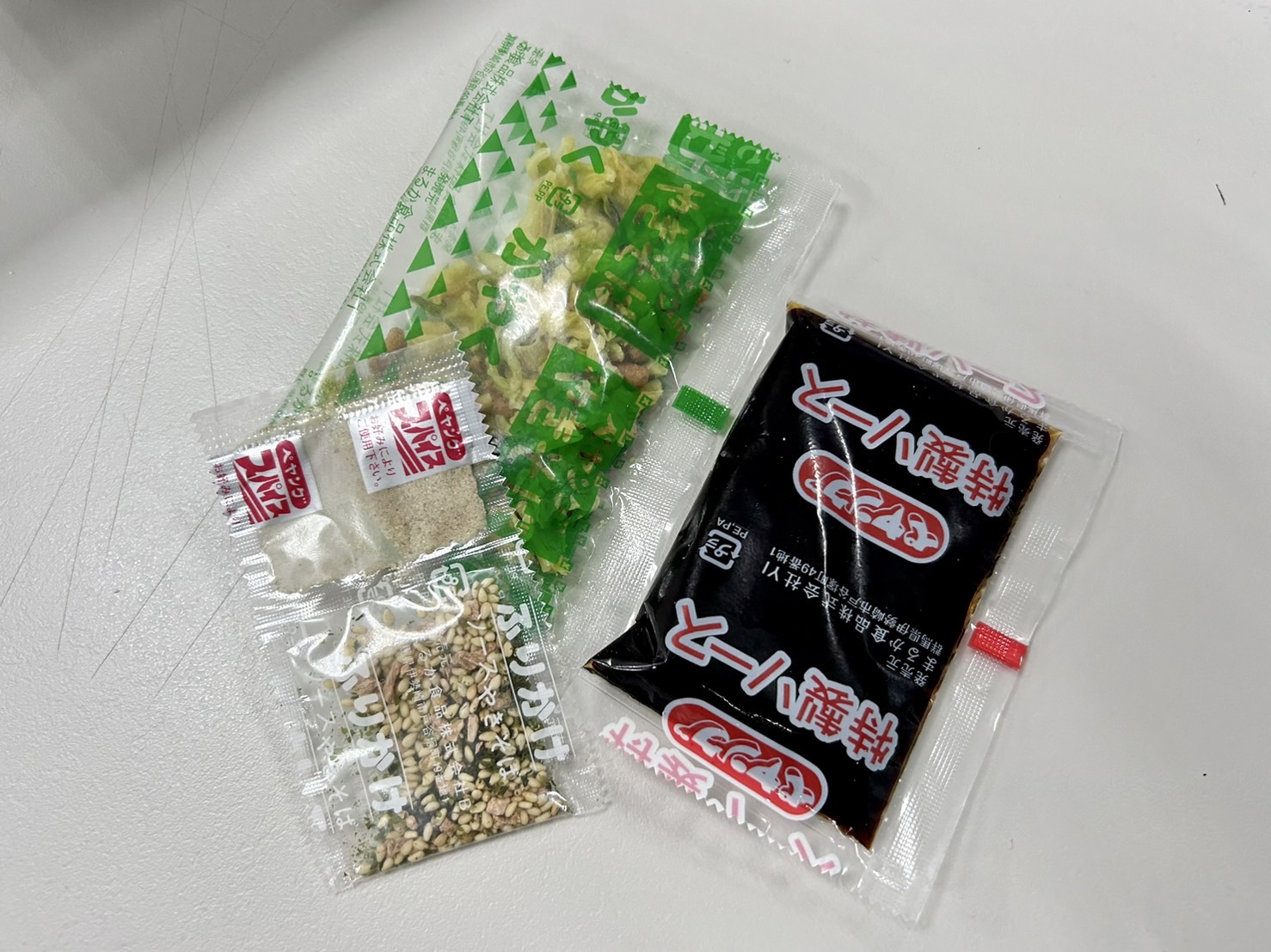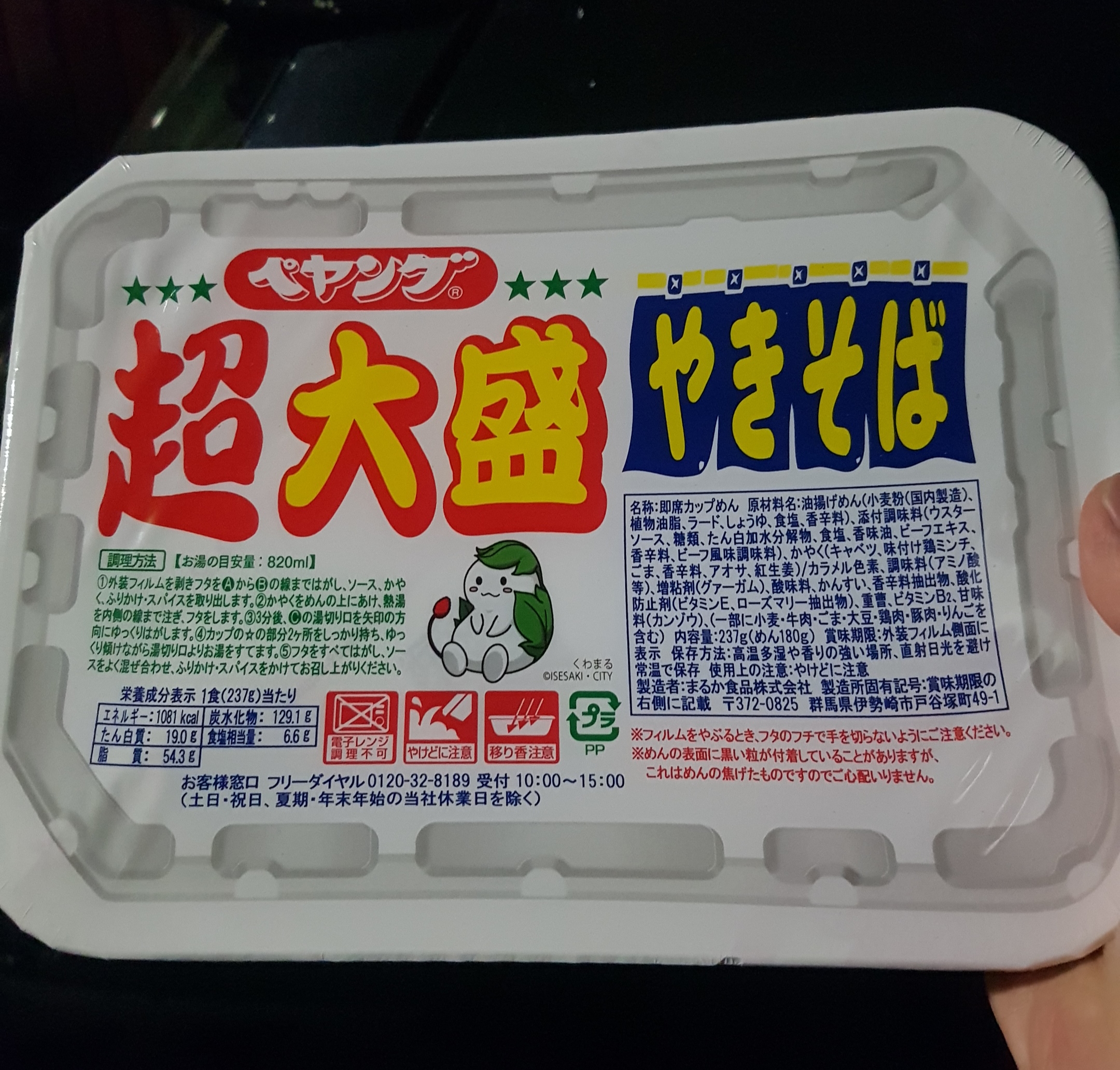 調味炒麵(小麥粉、豬油、植物油、鹽、醬油、香料)、辣醬油、捲心菜、糖、蛋白質水解物、豬肉碎、鹽、香油、芝麻、香料、紅姜、aosa、牛肉提取物、焦糖色素、調味料(氨基酸等)、增稠劑(瓜爾豆膠)、酸味劑、柑橘、抗氧化劑(維生素E)、香料提取物、維生素B2、紫蘇色素、(部分原料有醬油、牛肉、豬肉、蘋果)