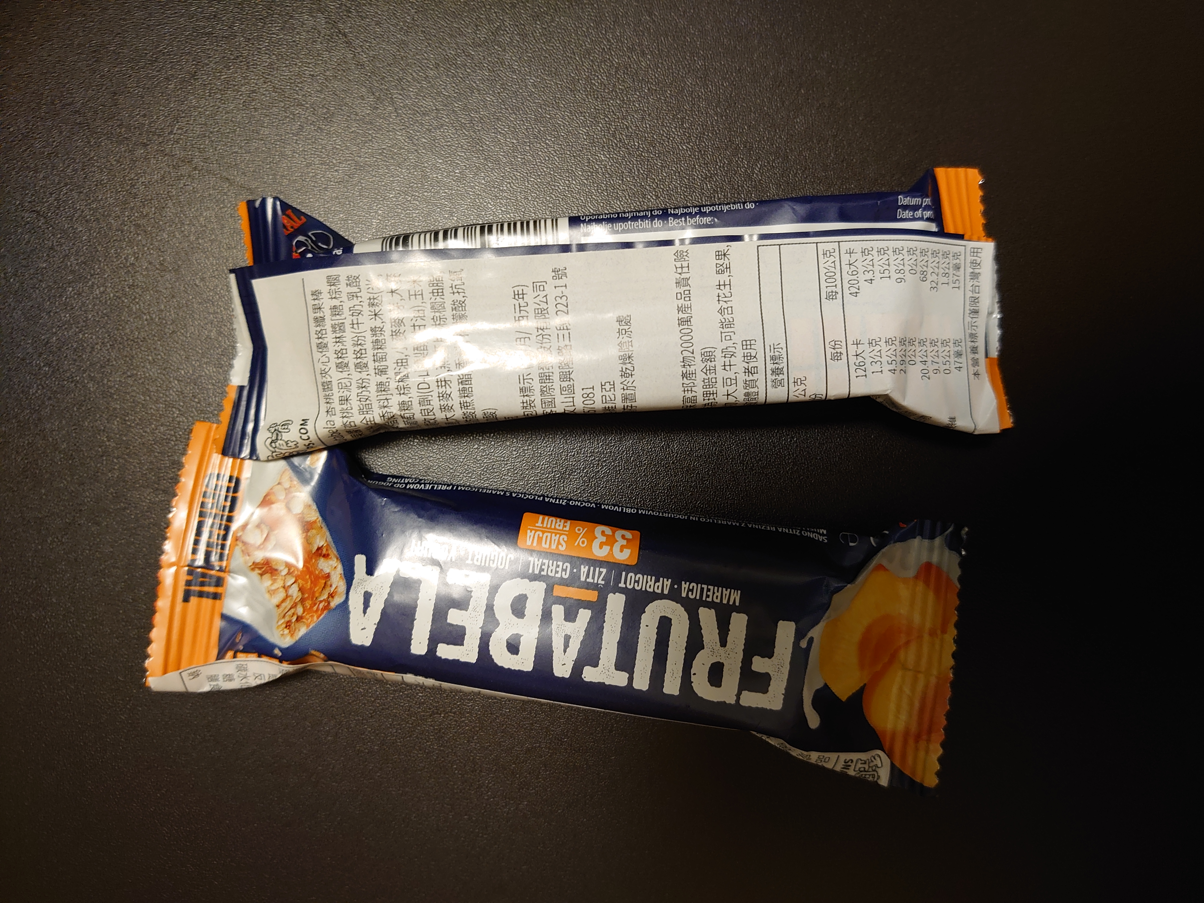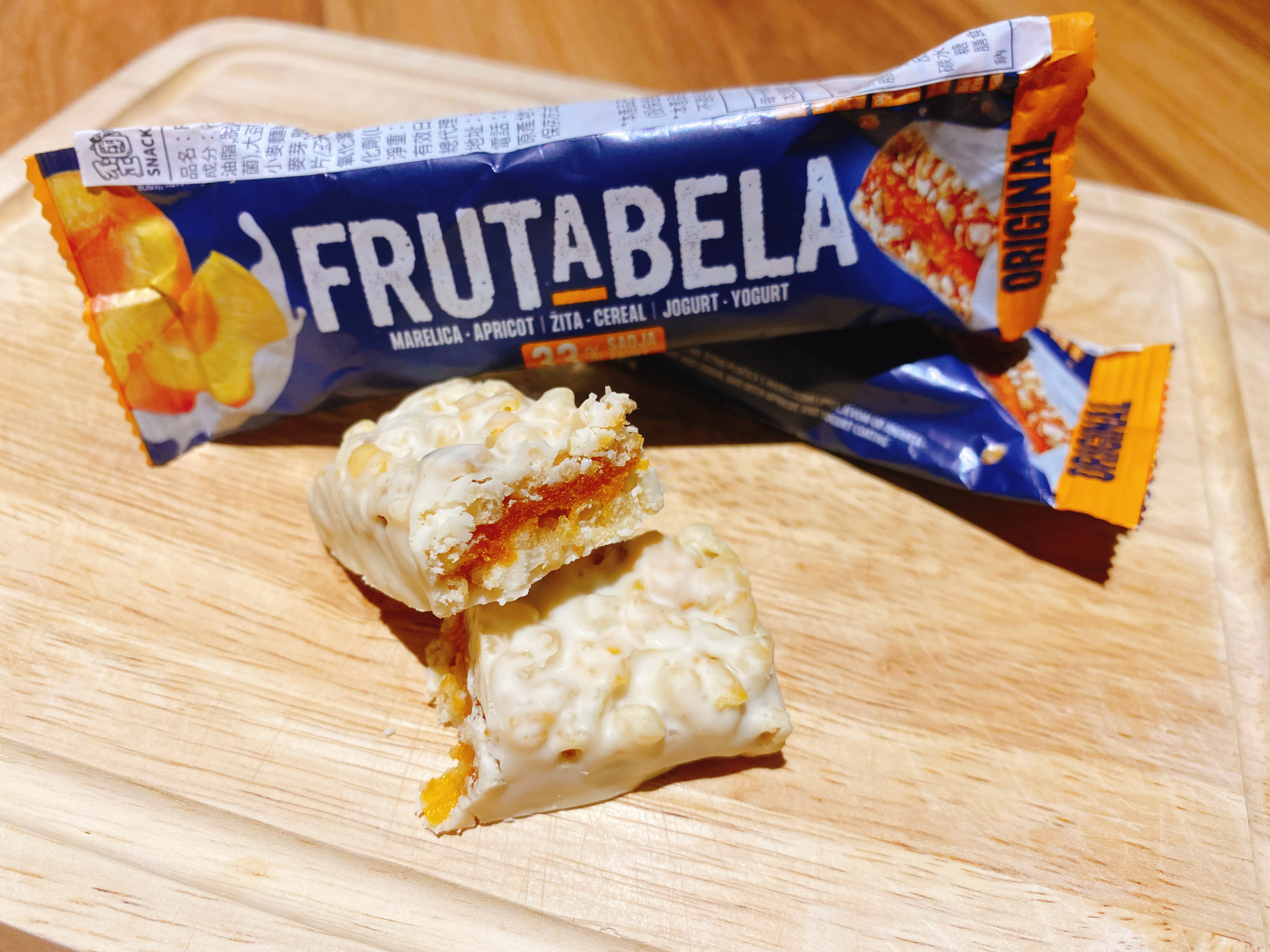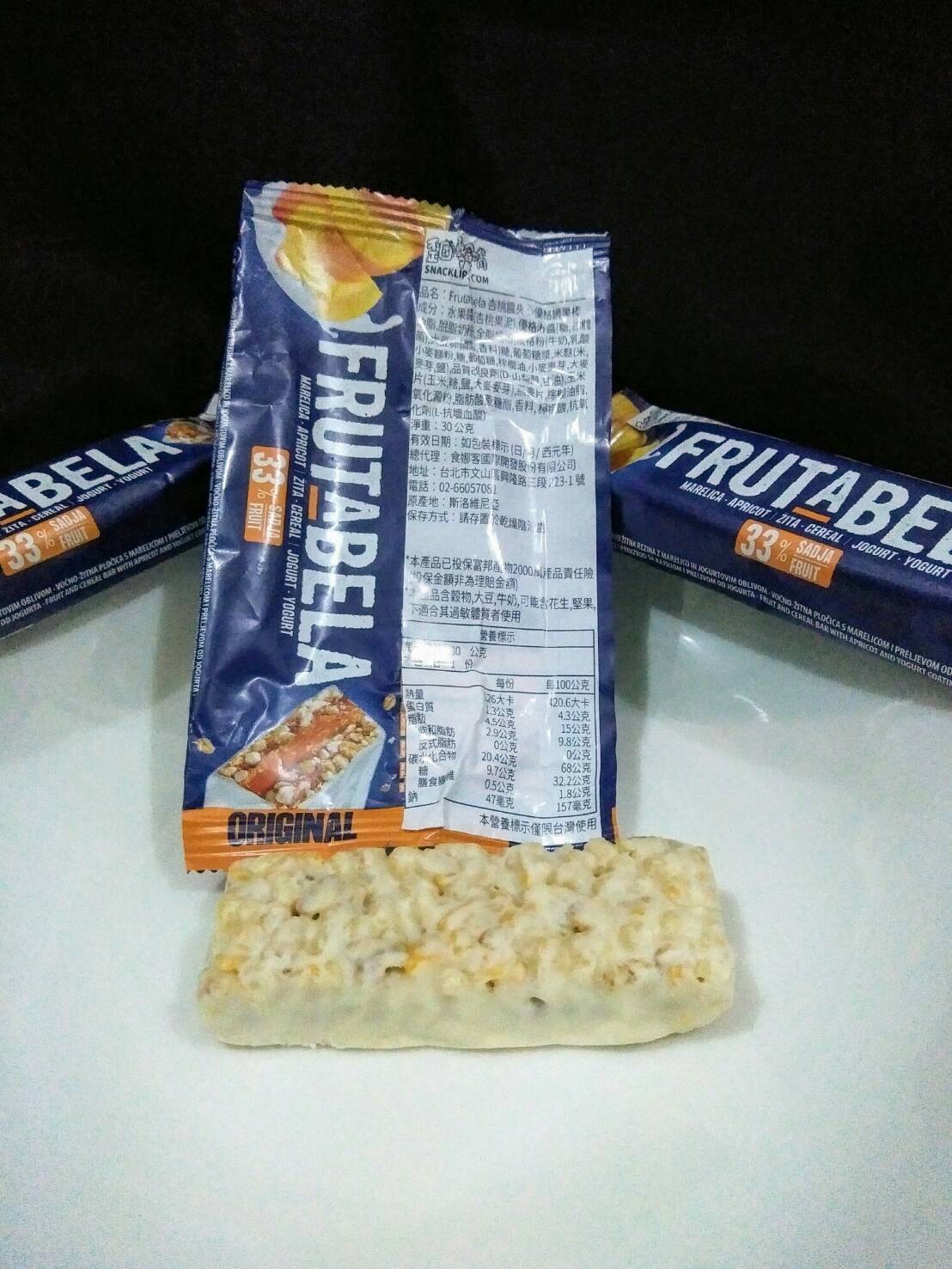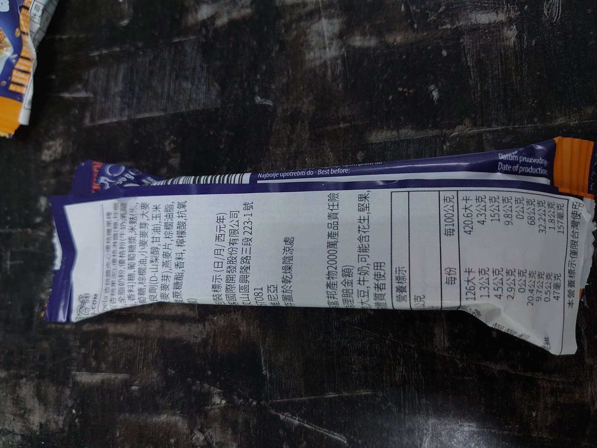 巧克力醬、水果醬、優格淋醬、全脂奶粉、優格粉、大豆卵磷脂、糖、葡萄糖漿、穀物、品質改良劑、甘油、玉米片、燕麥片、棕櫚脂肪、修飾澱粉、檸檬酸、香料、脂肪酸蔗糖酯、抗氧化劑