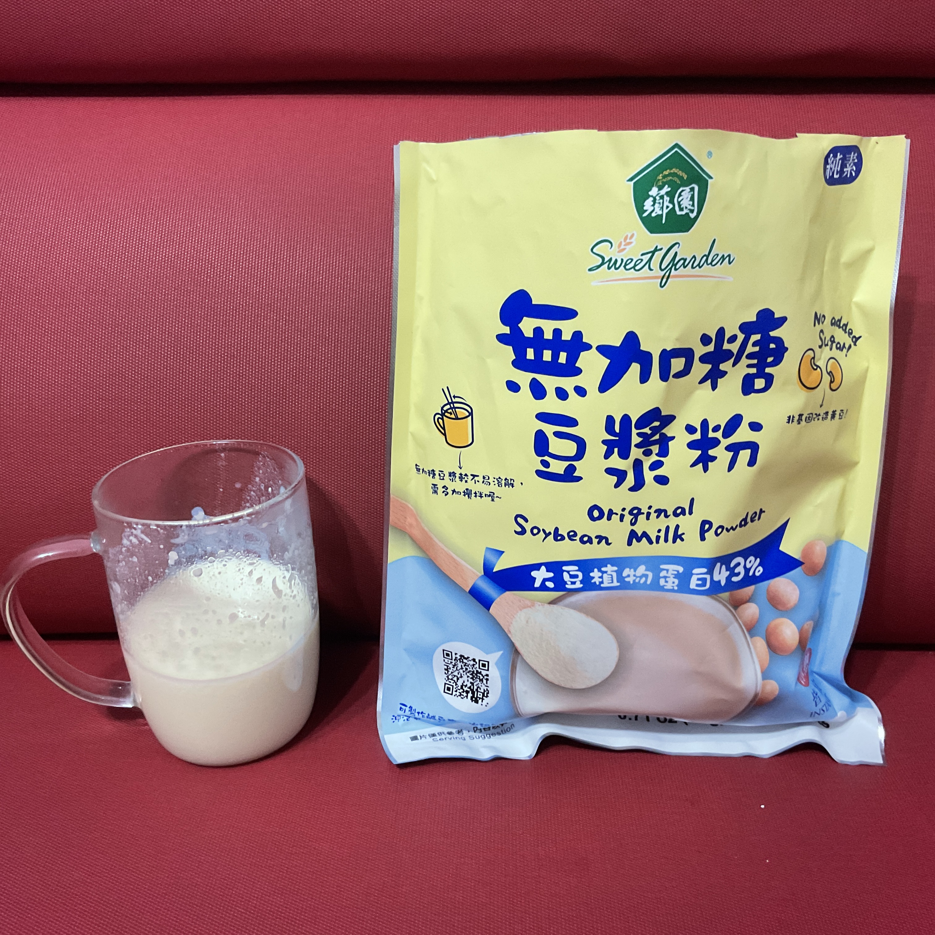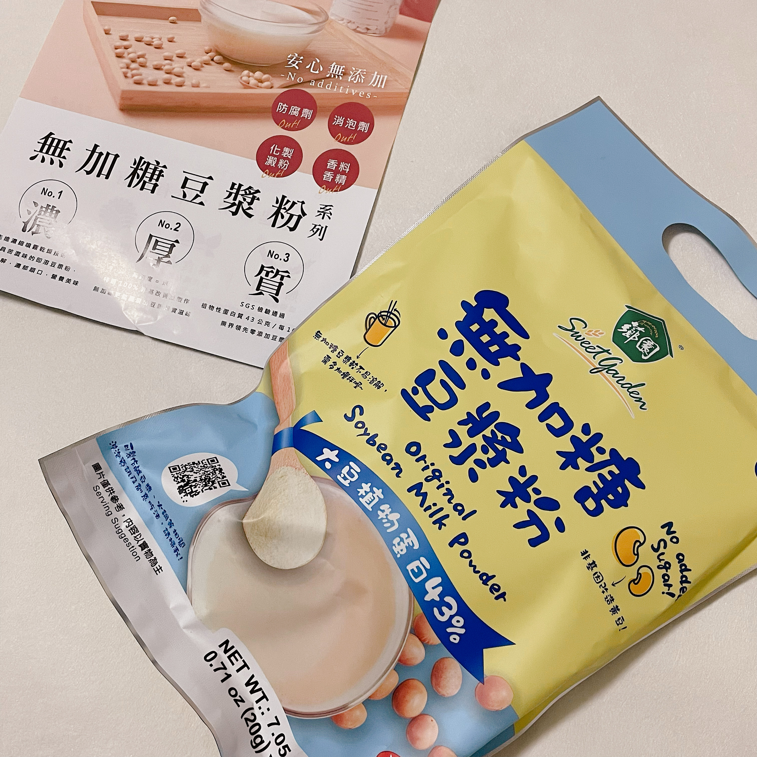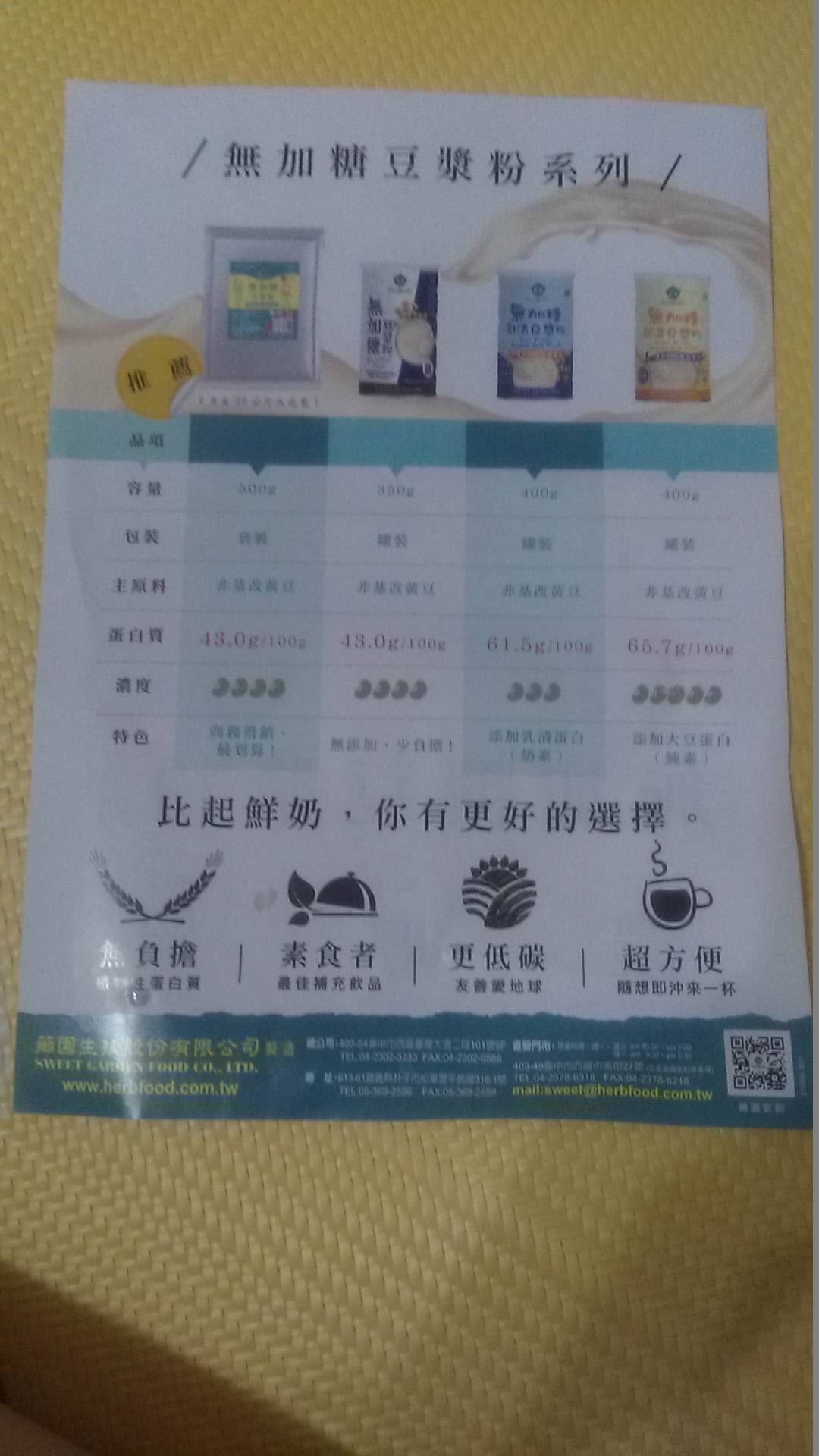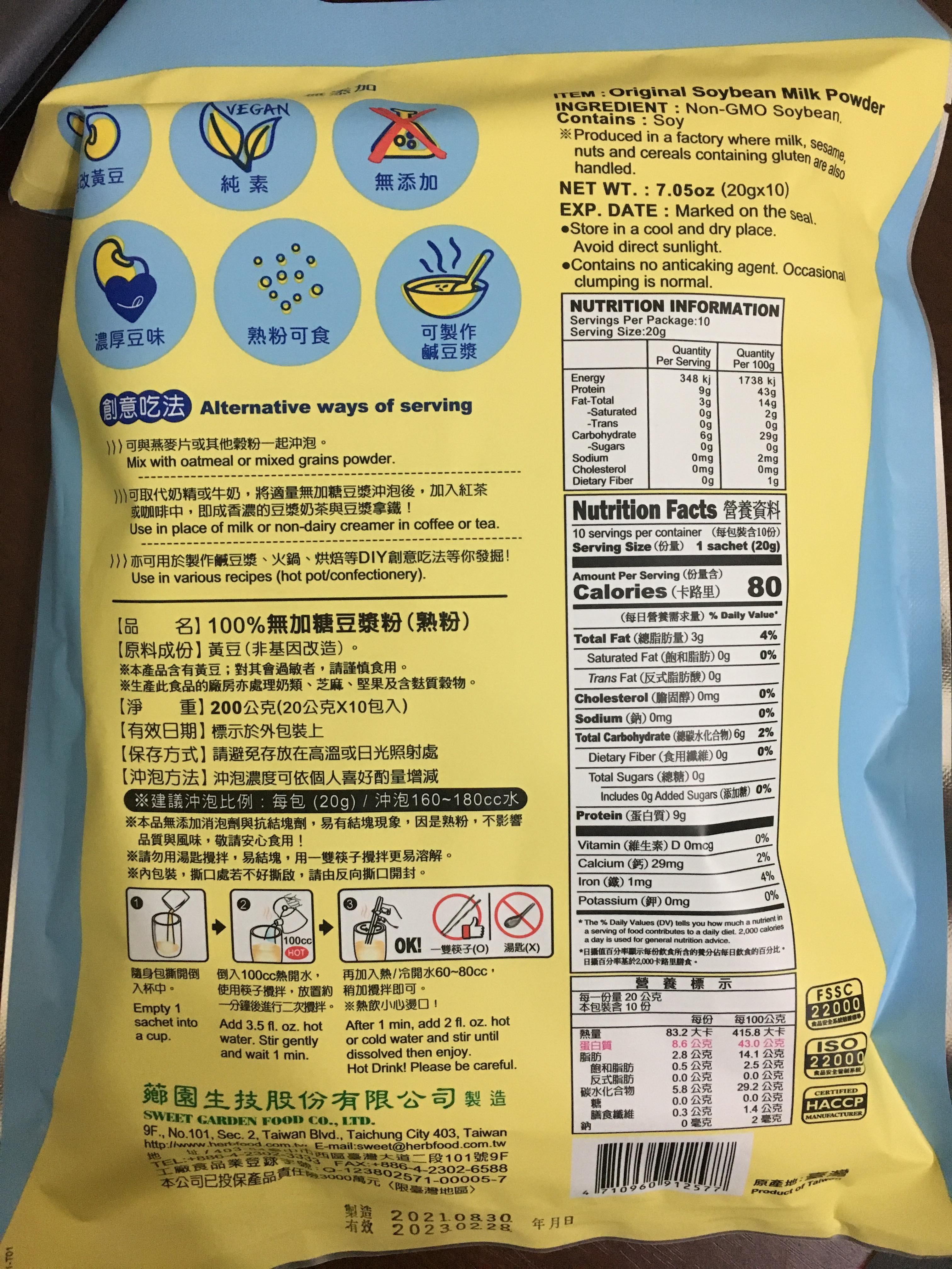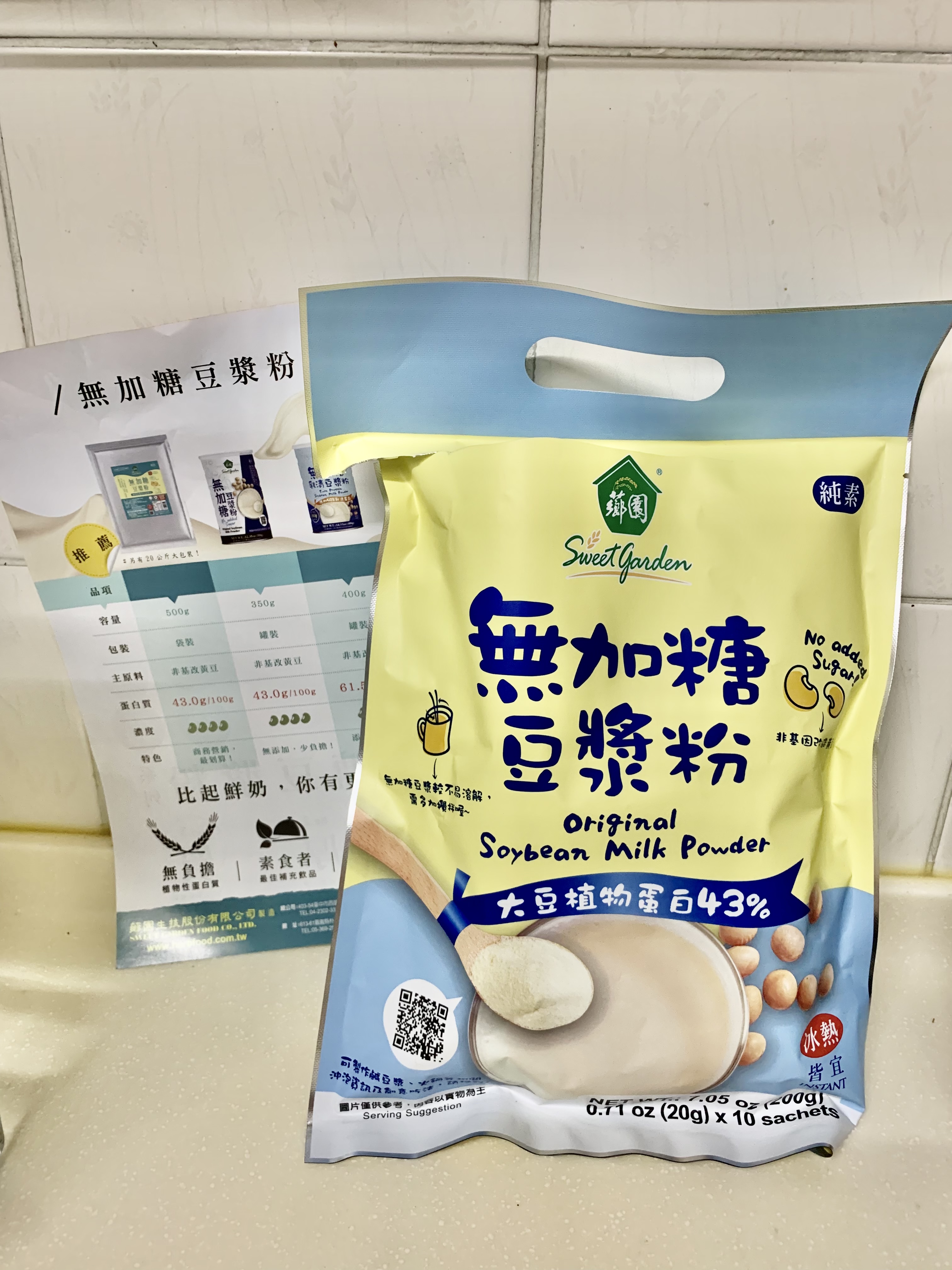 品質嚴選,食安把關——經SGS檢驗通過,含有豐富優質植物性蛋白質,營養標示中每100公克含有43公克的蛋白質,領先市面上一般豆漿含量。