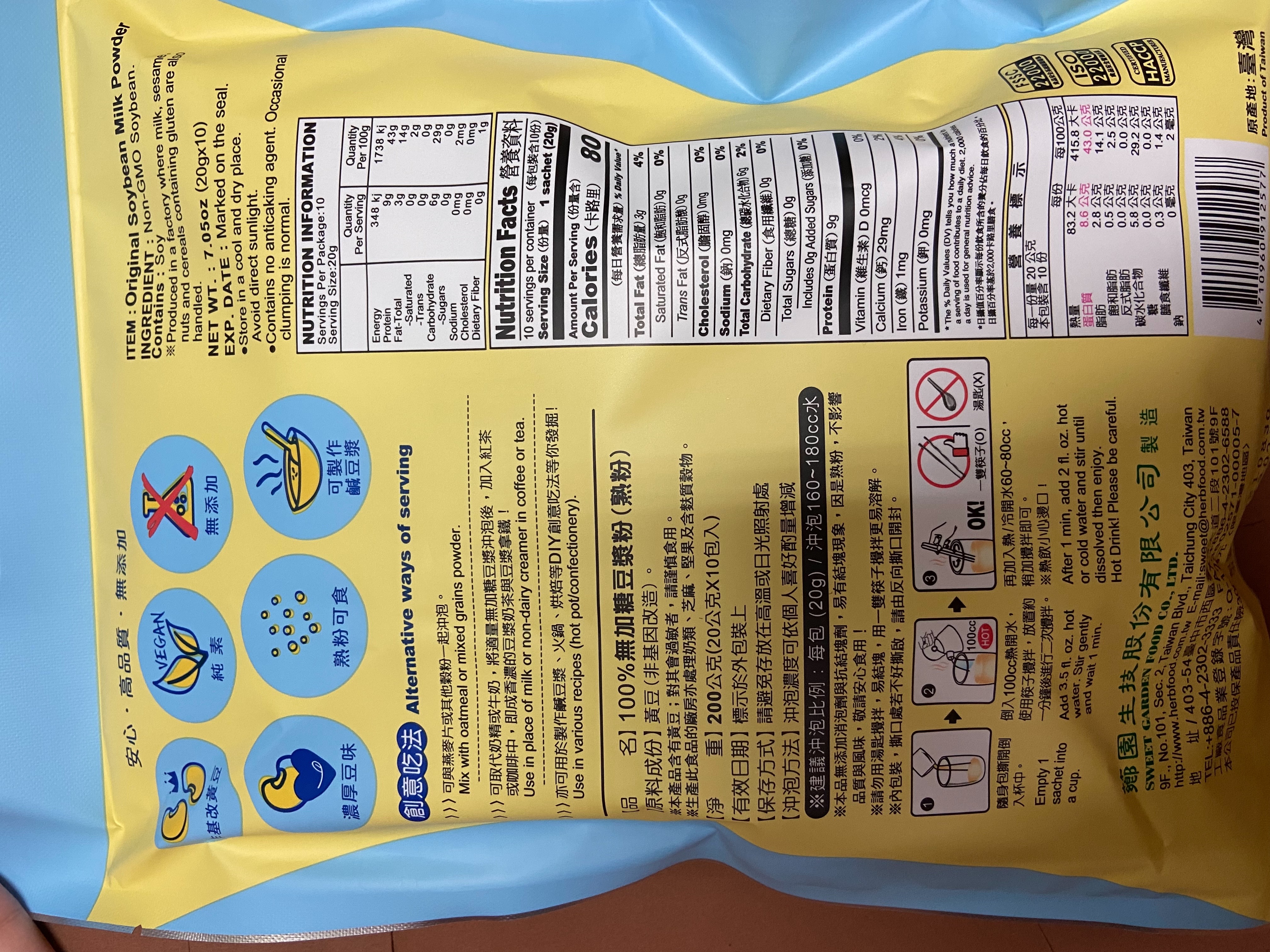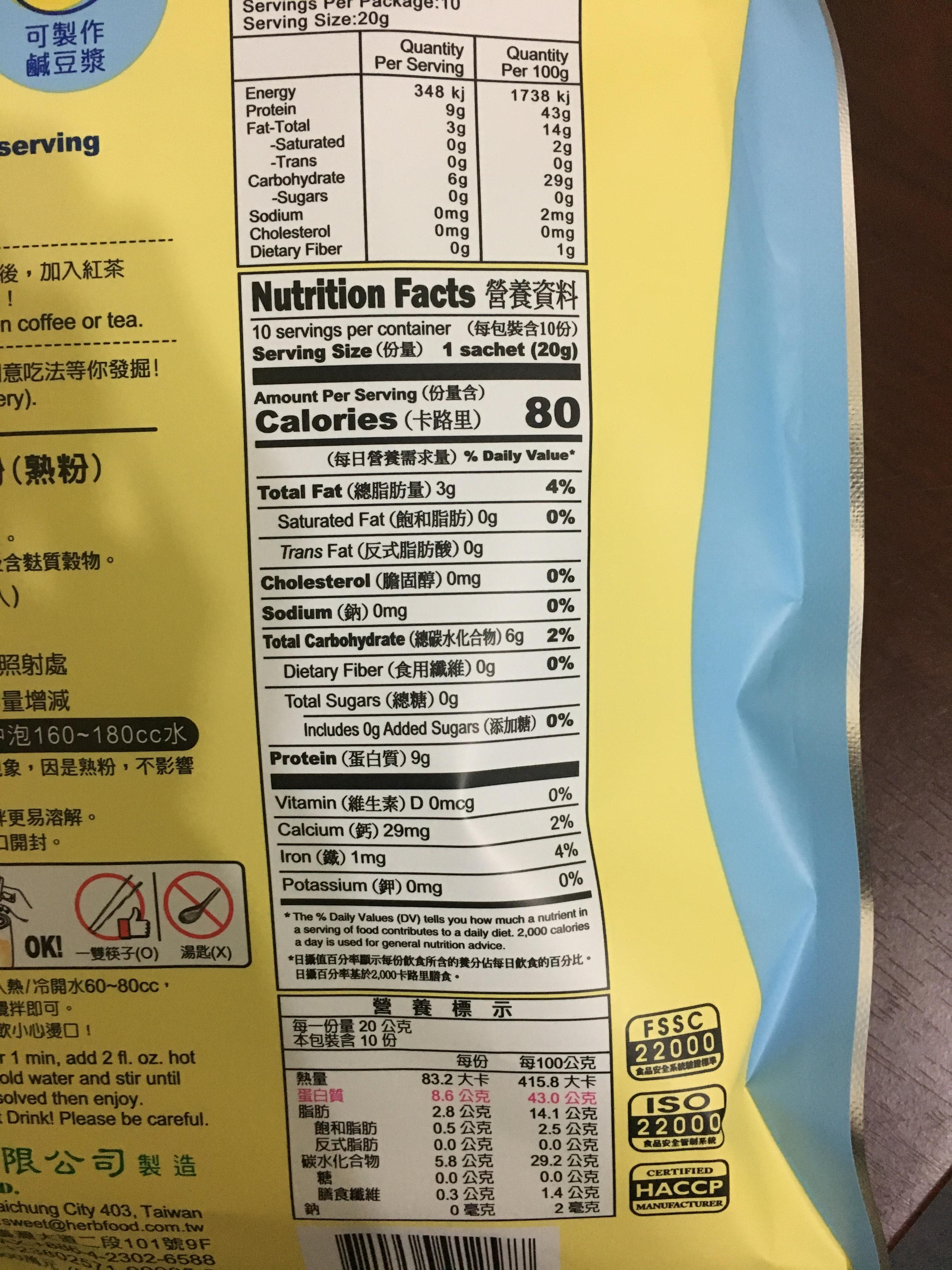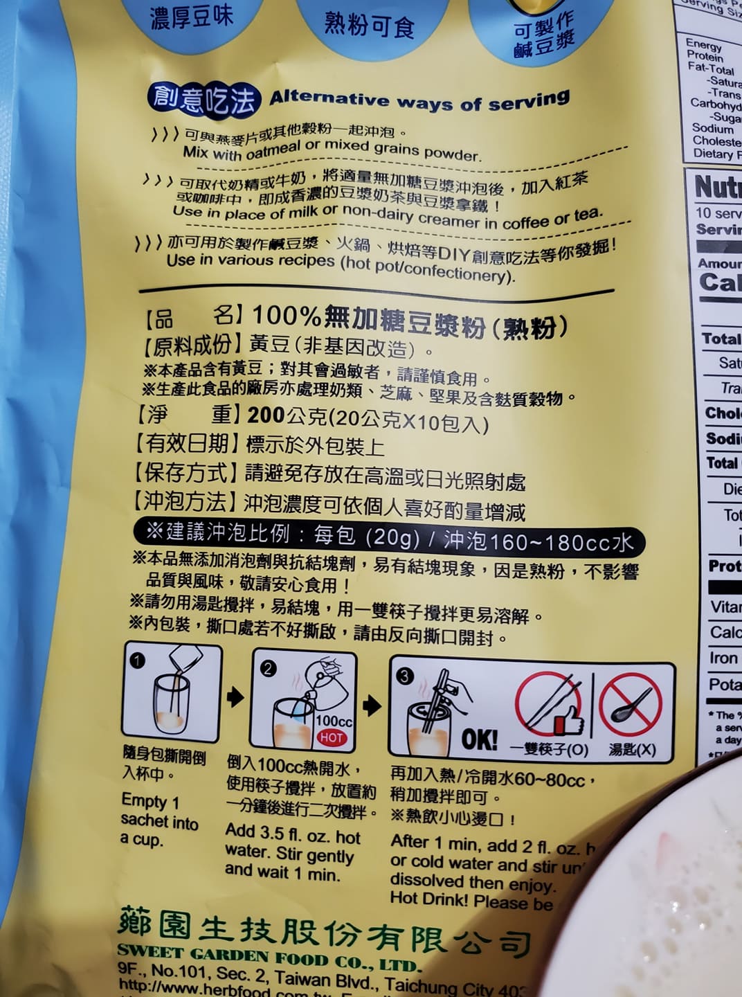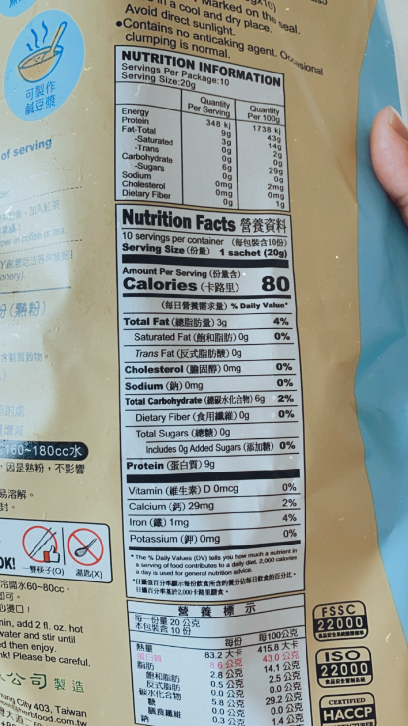 品質嚴選,食安把關——經SGS檢驗通過,含有豐富優質植物性蛋白質,營養標示中每100公克含有43公克的蛋白質,領先市面上一般豆漿含量。