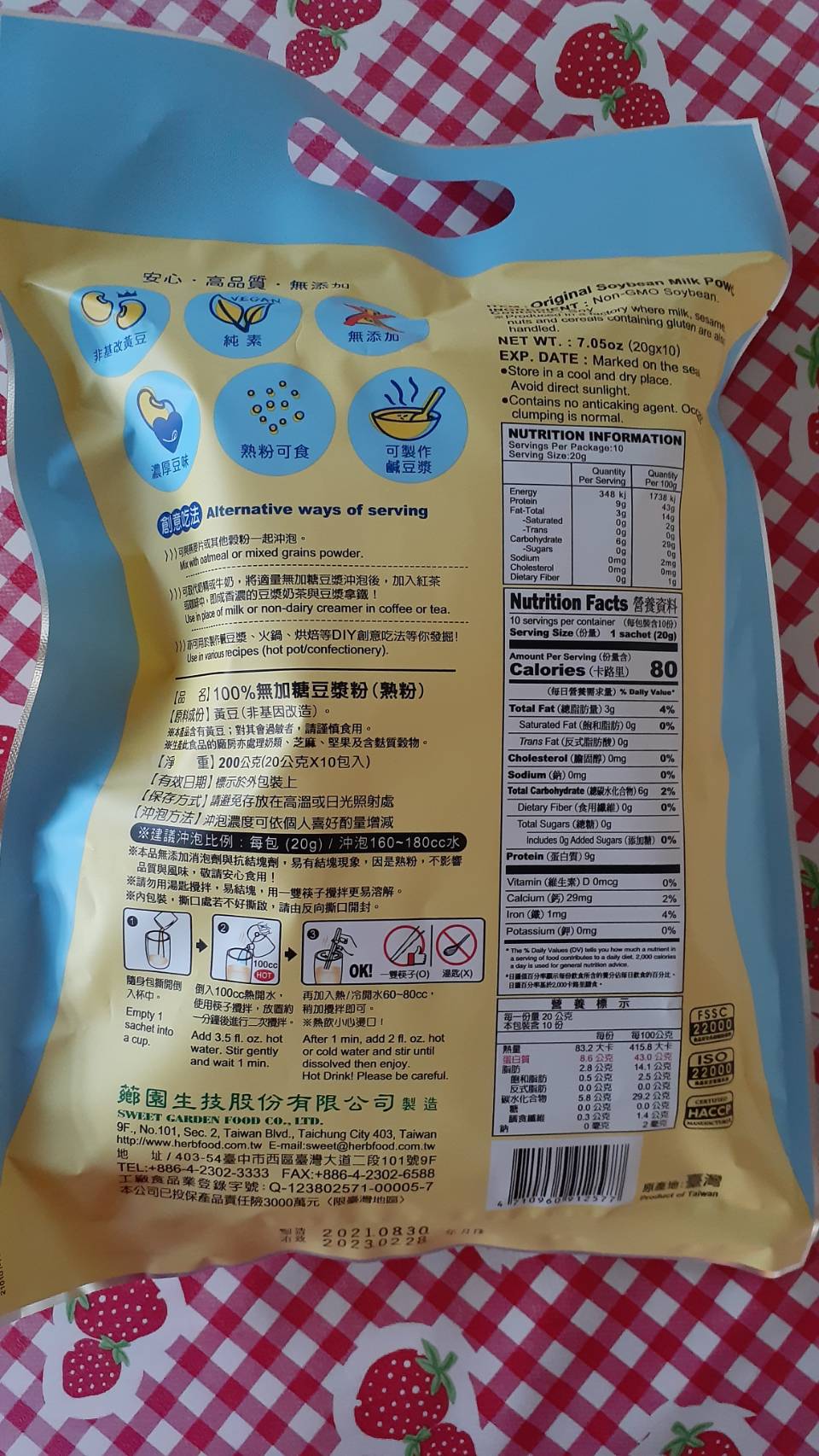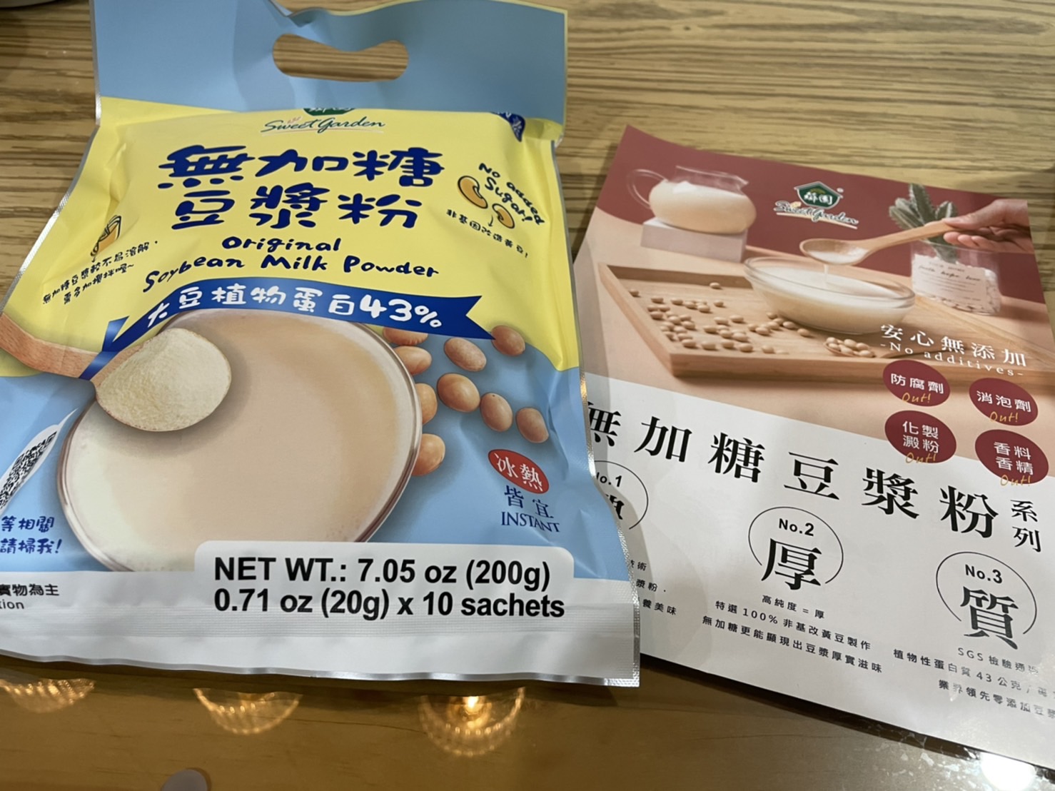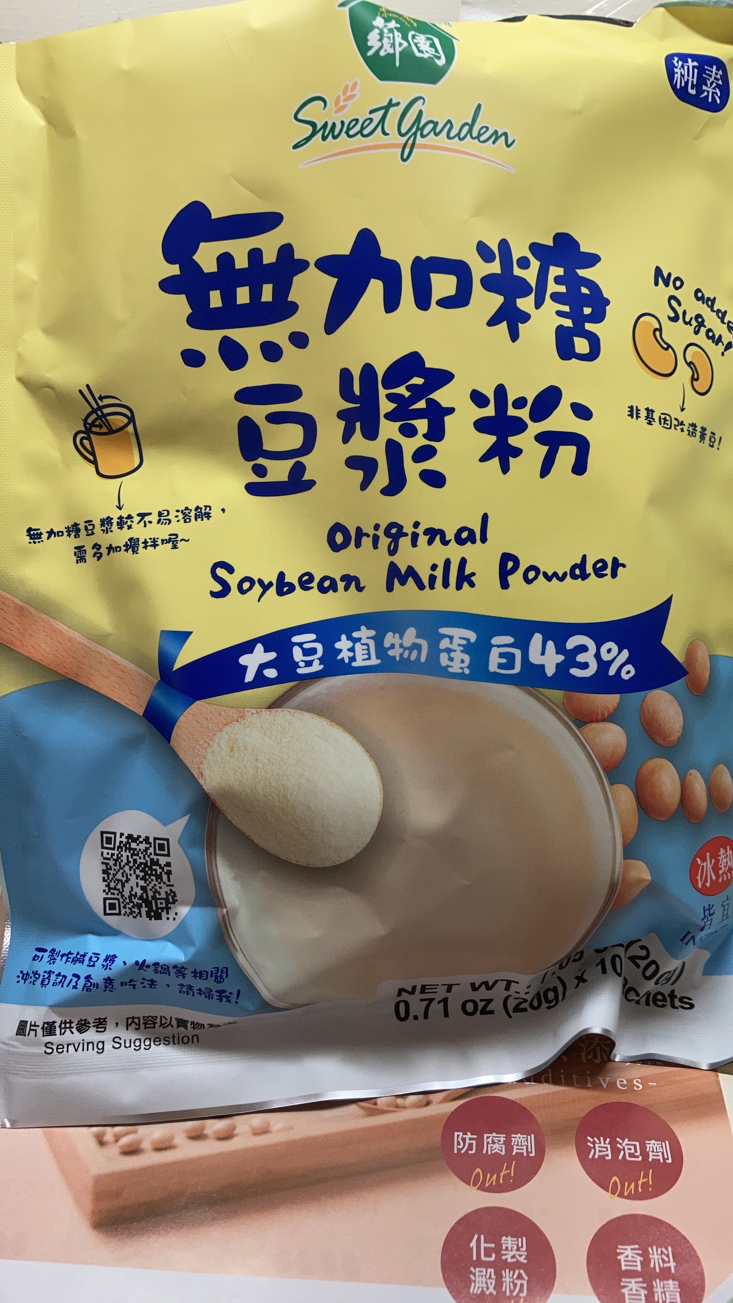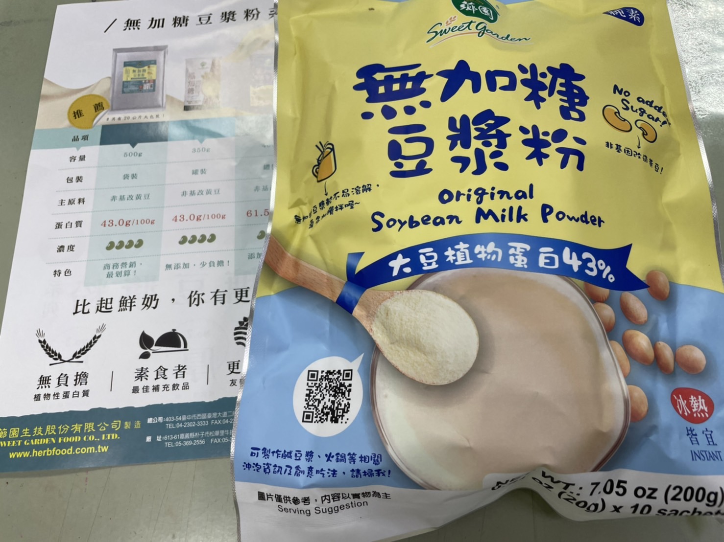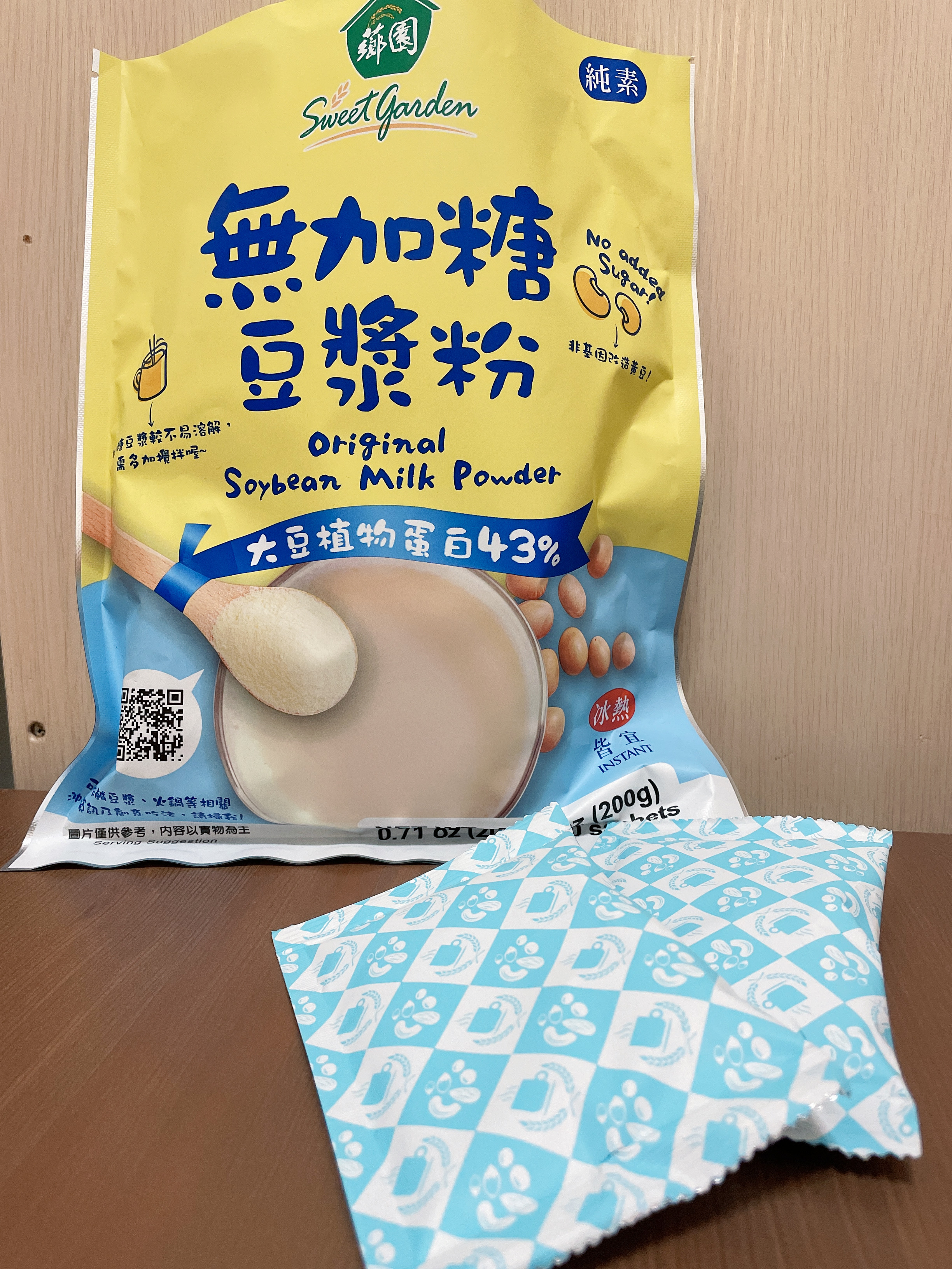 品質嚴選,食安把關——經SGS檢驗通過,含有豐富優質植物性蛋白質,營養標示中每100公克含有43公克的蛋白質,領先市面上一般豆漿含量。