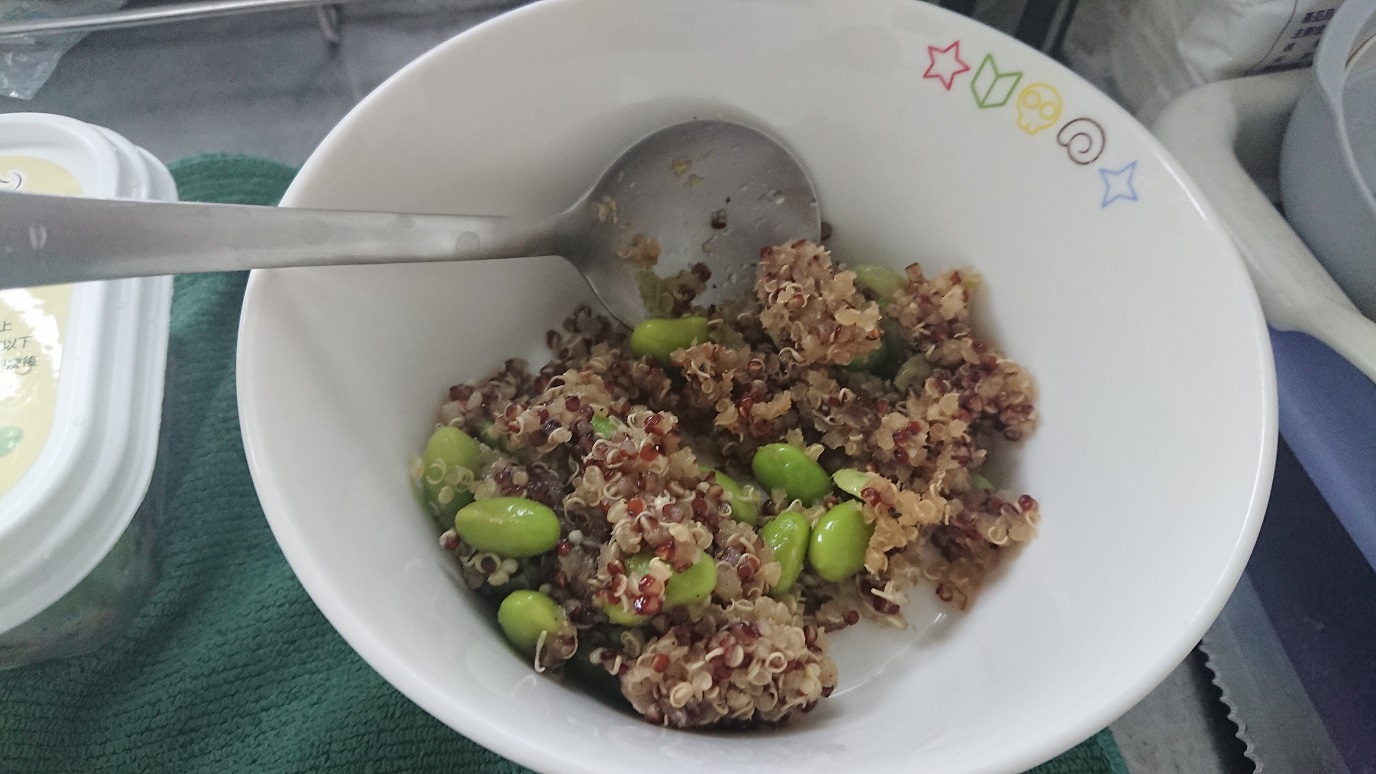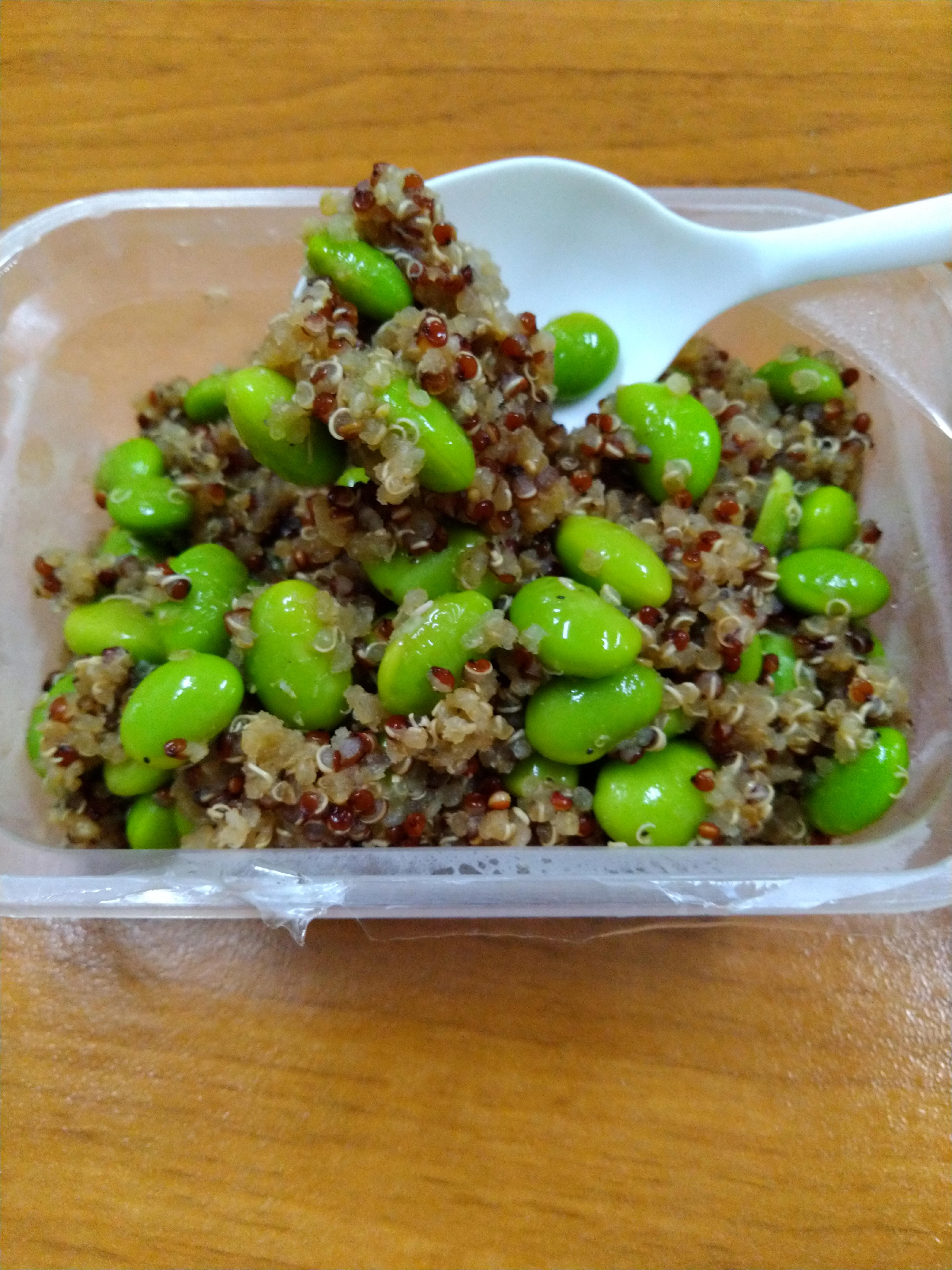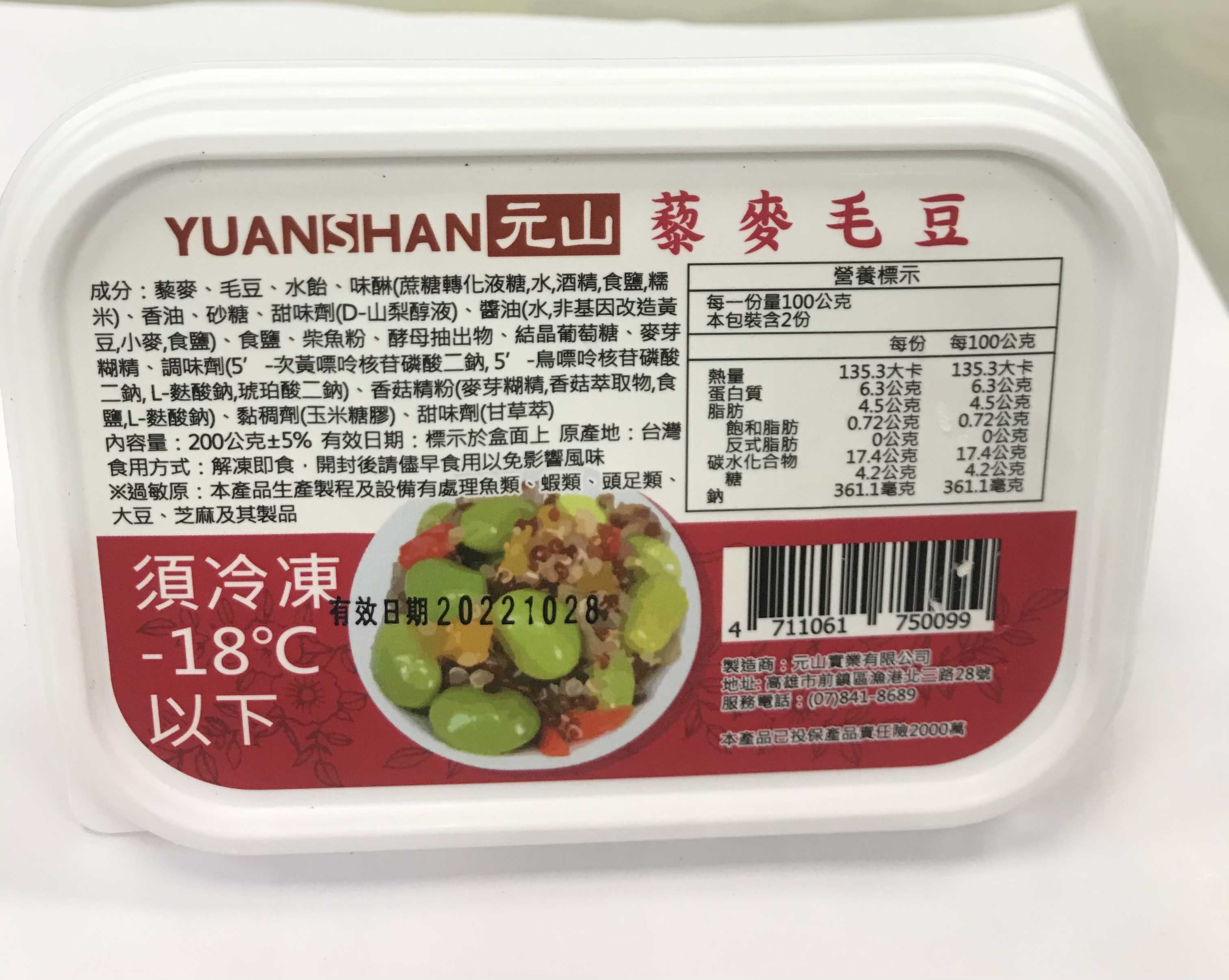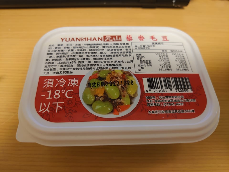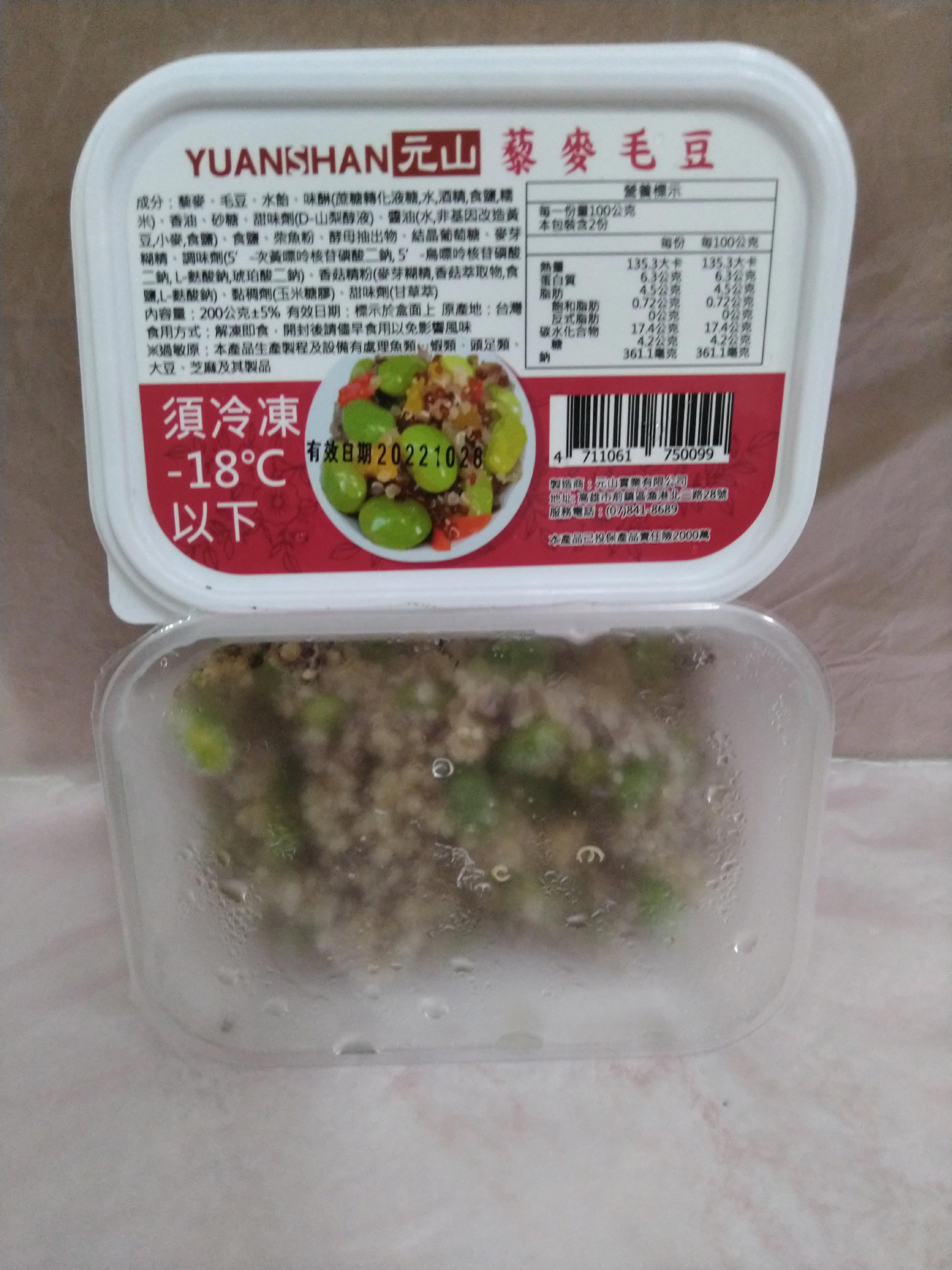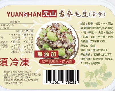 藜麥、毛豆、水飴、味醂、香油、砂糖、甜味劑(D-山梨醇液)、醬油(水,非基因改造黃豆,小麥,食鹽)、食鹽、柴魚粉、酵母抽出物、結晶葡萄糖、麥芽糊精、調味劑(5’-次黃嘌呤核苷磷酸二鈉, 5’-鳥嘌呤核苷磷酸二鈉, L-麩酸鈉,琥珀酸二鈉)、香菇精粉(麥芽糊精,香菇萃取物,食鹽,L-麩酸鈉)、黏稠劑(玉米糖膠)、甜味劑(甘草萃)