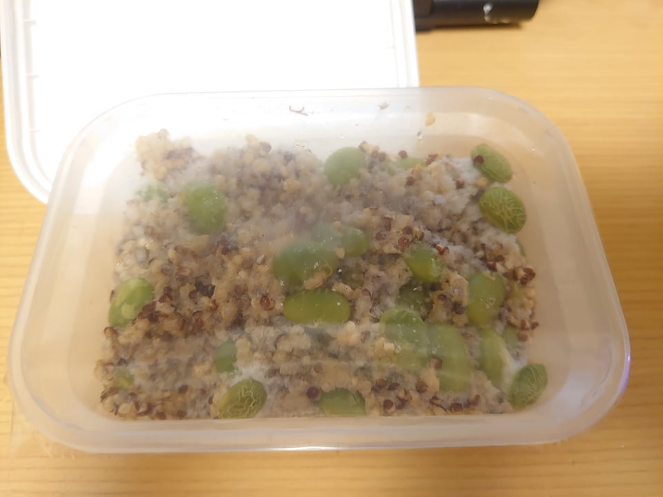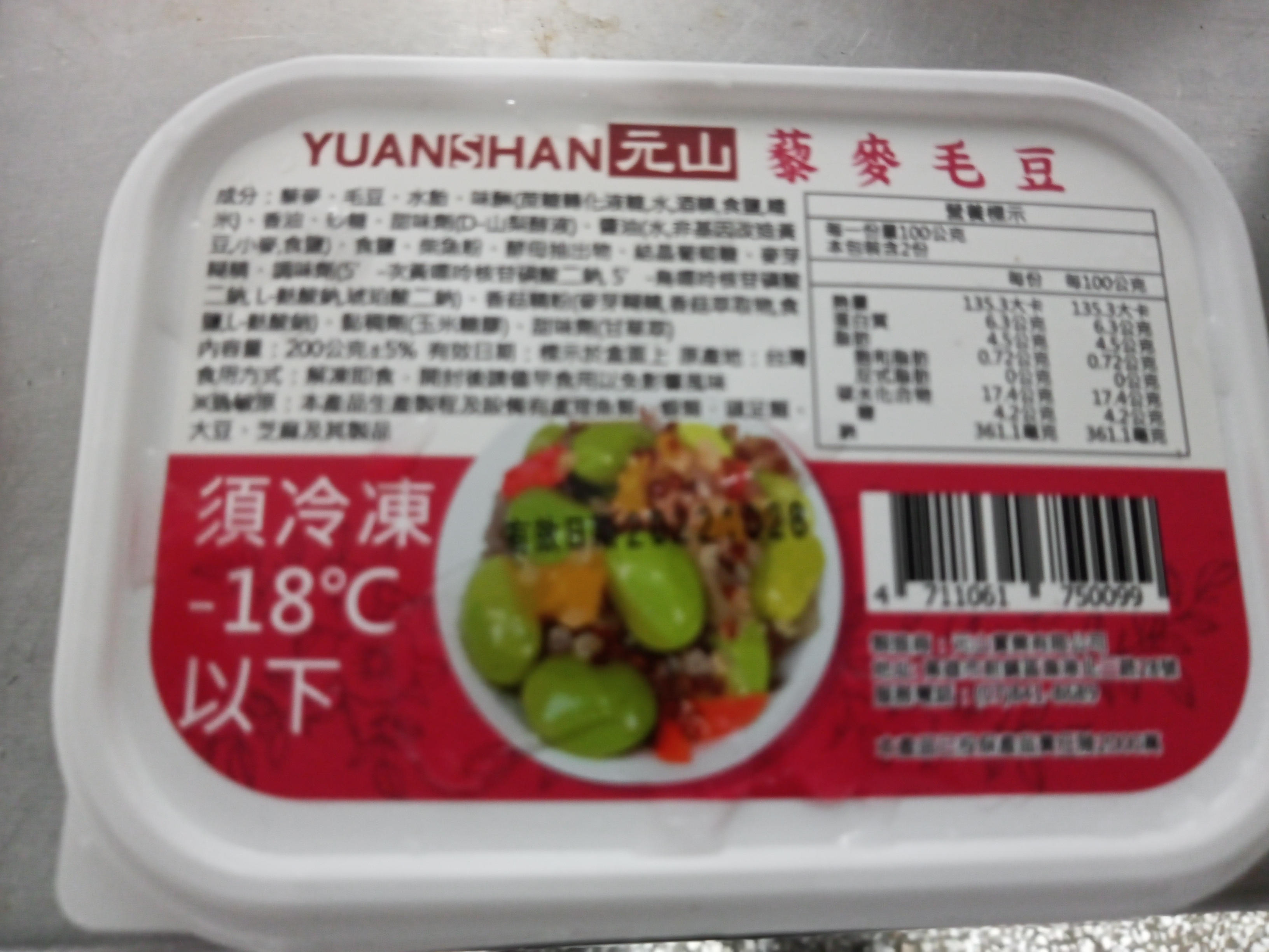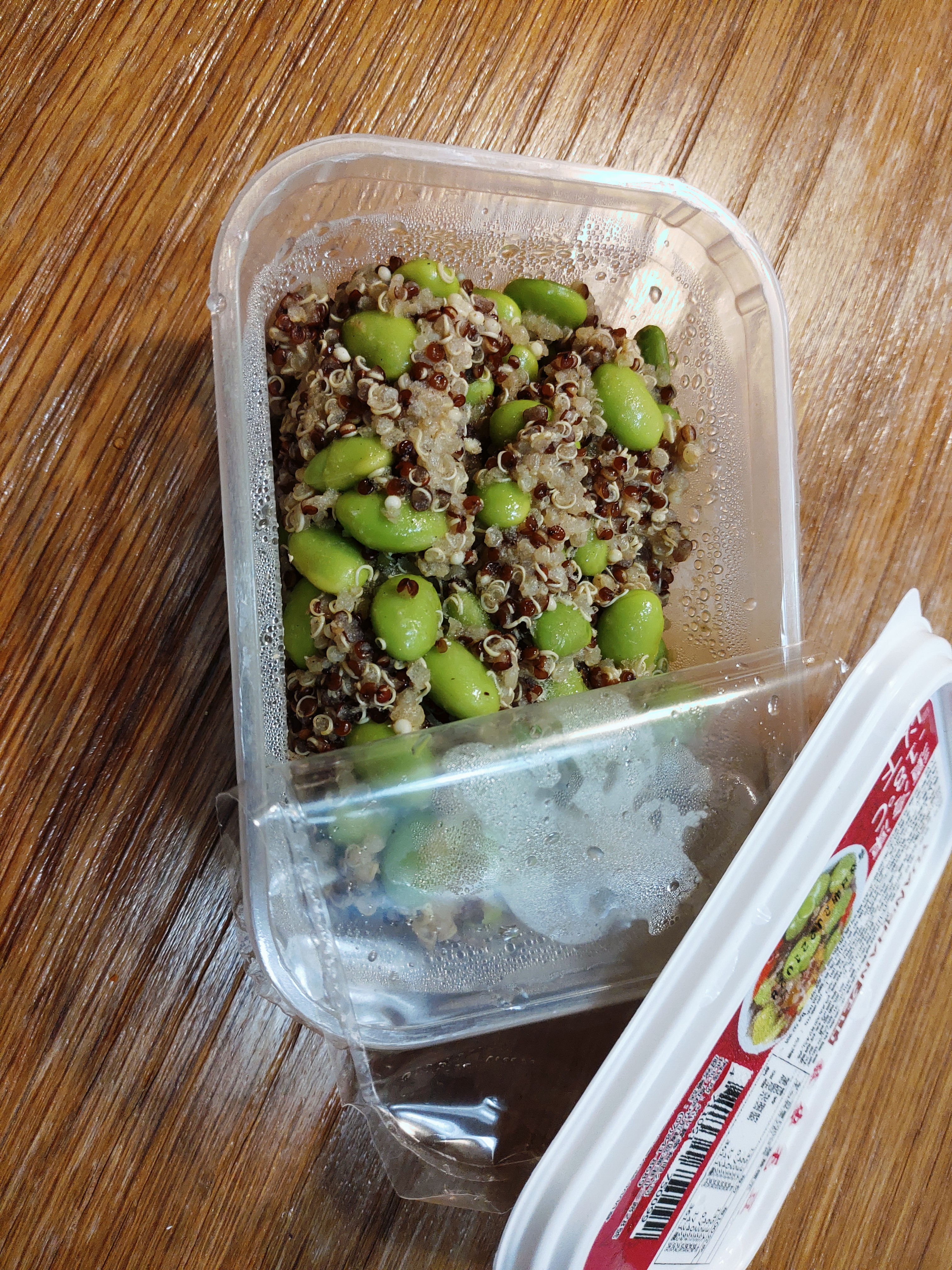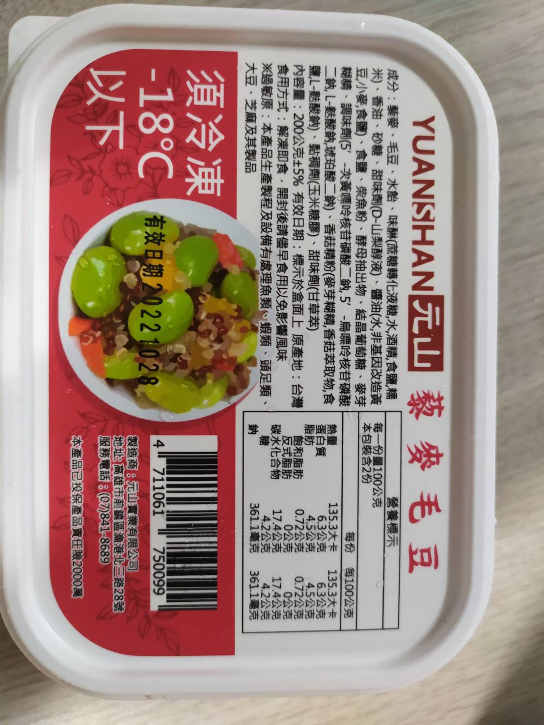 藜麥、毛豆、水飴、味醂、香油、砂糖、甜味劑(D-山梨醇液)、醬油(水,非基因改造黃豆,小麥,食鹽)、食鹽、柴魚粉、酵母抽出物、結晶葡萄糖、麥芽糊精、調味劑(5’-次黃嘌呤核苷磷酸二鈉, 5’-鳥嘌呤核苷磷酸二鈉, L-麩酸鈉,琥珀酸二鈉)、香菇精粉(麥芽糊精,香菇萃取物,食鹽,L-麩酸鈉)、黏稠劑(玉米糖膠)、甜味劑(甘草萃)