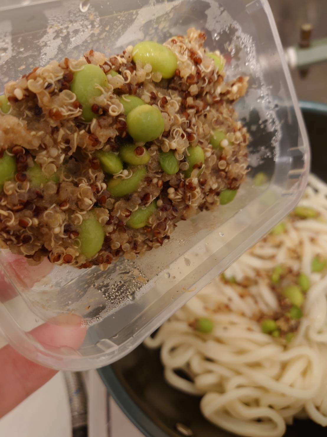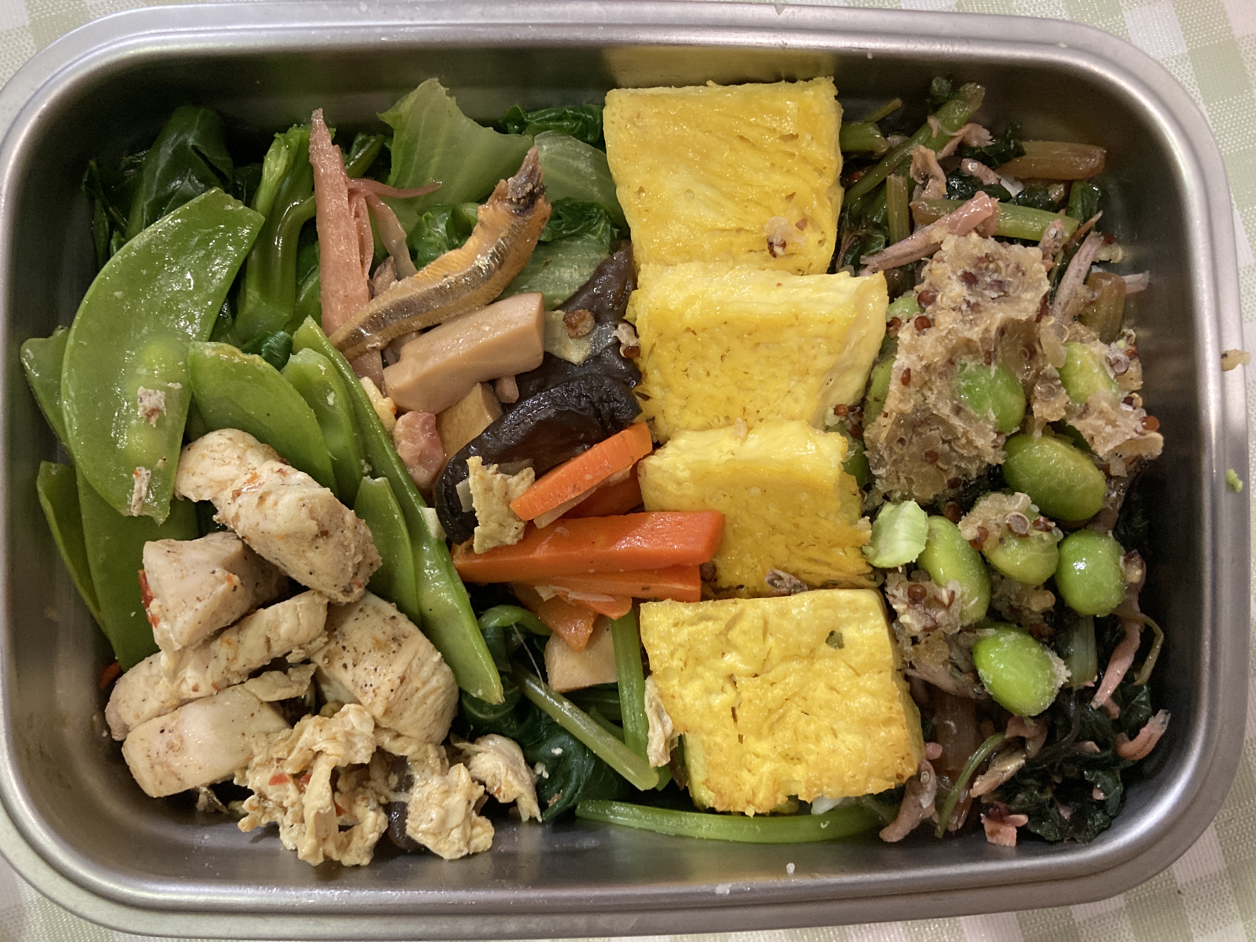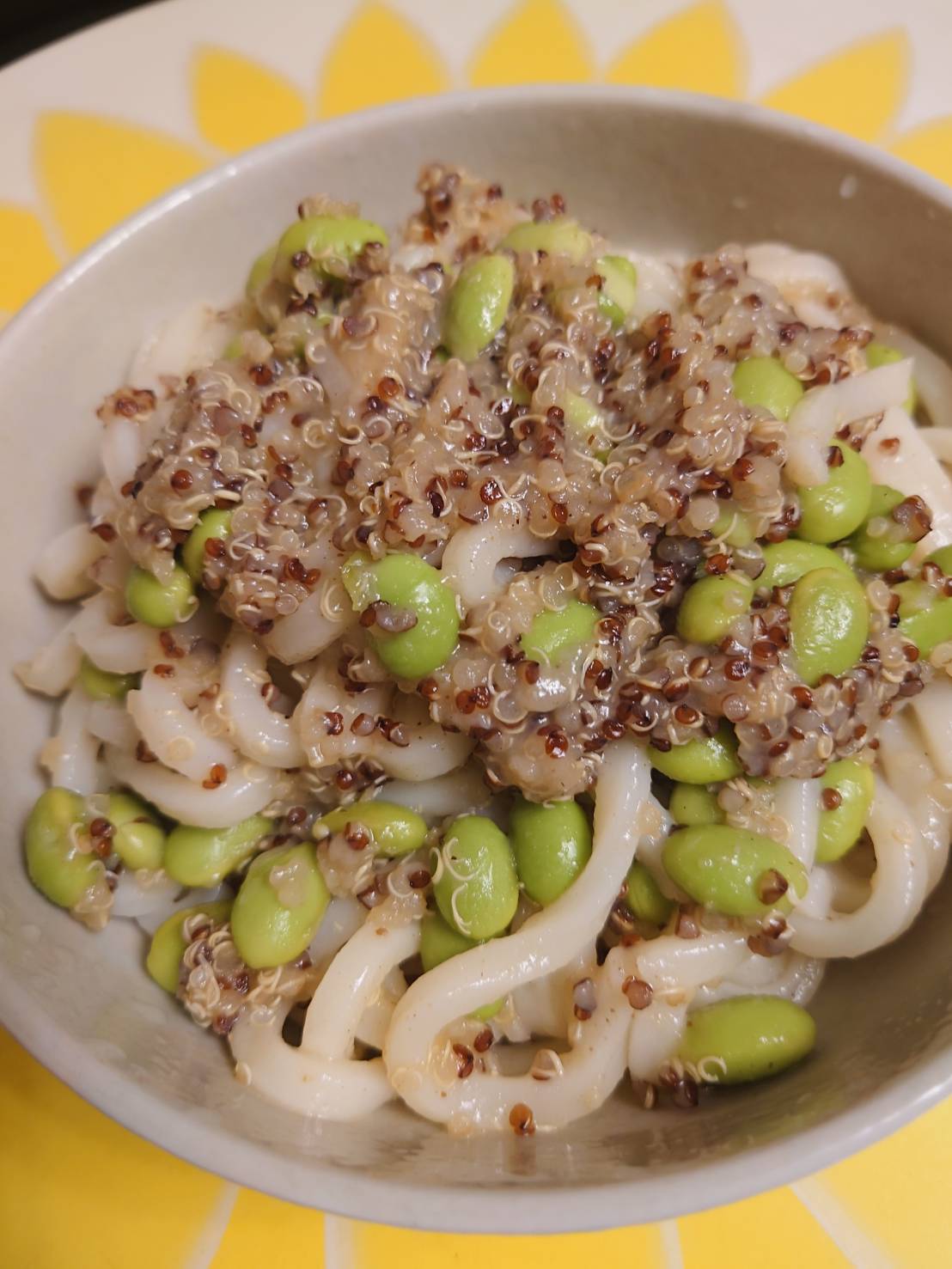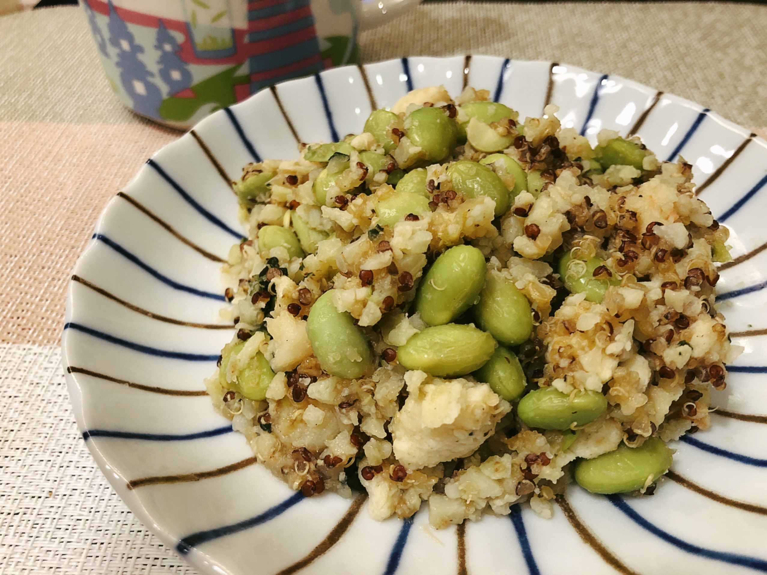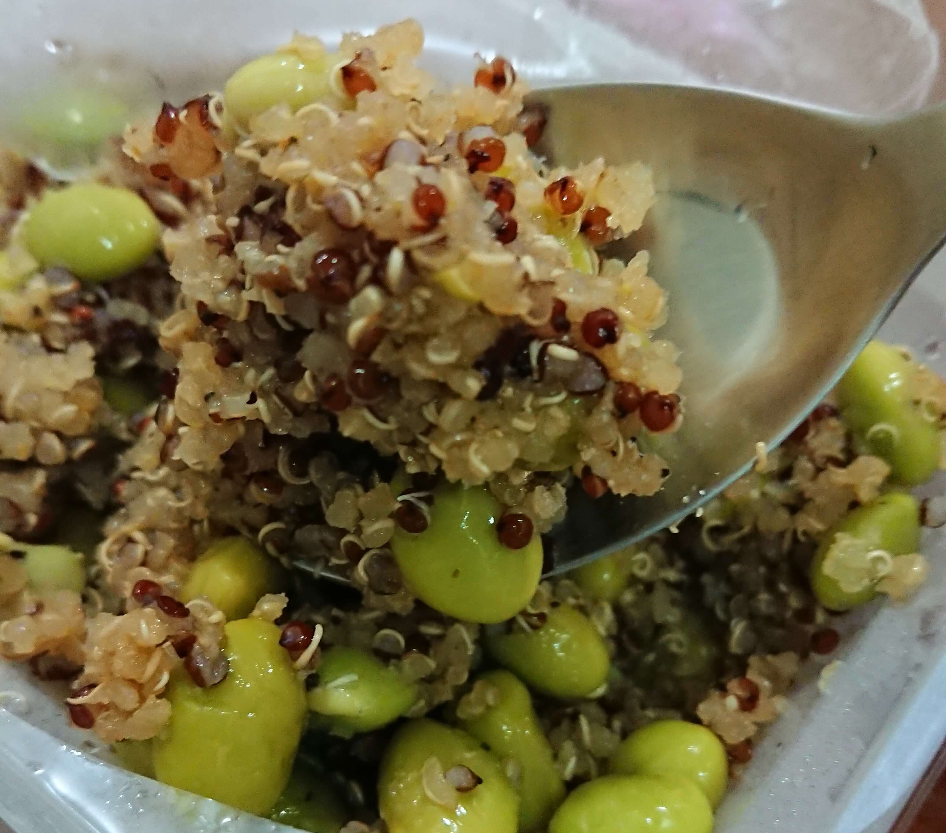 藜麥、毛豆、水飴、味醂、香油、砂糖、甜味劑(D-山梨醇液)、醬油(水,非基因改造黃豆,小麥,食鹽)、食鹽、柴魚粉、酵母抽出物、結晶葡萄糖、麥芽糊精、調味劑(5’-次黃嘌呤核苷磷酸二鈉, 5’-鳥嘌呤核苷磷酸二鈉, L-麩酸鈉,琥珀酸二鈉)、香菇精粉(麥芽糊精,香菇萃取物,食鹽,L-麩酸鈉)、黏稠劑(玉米糖膠)、甜味劑(甘草萃)