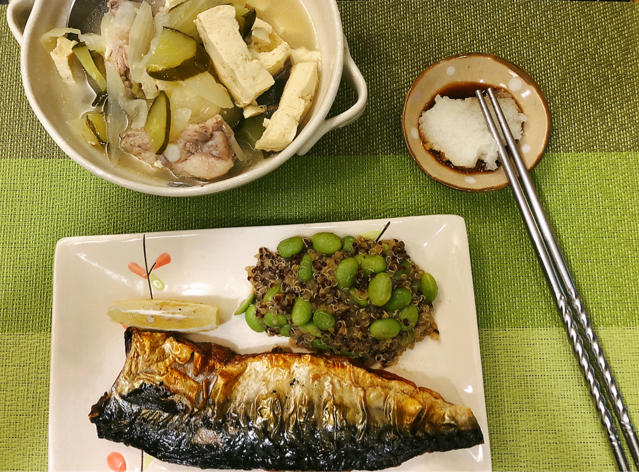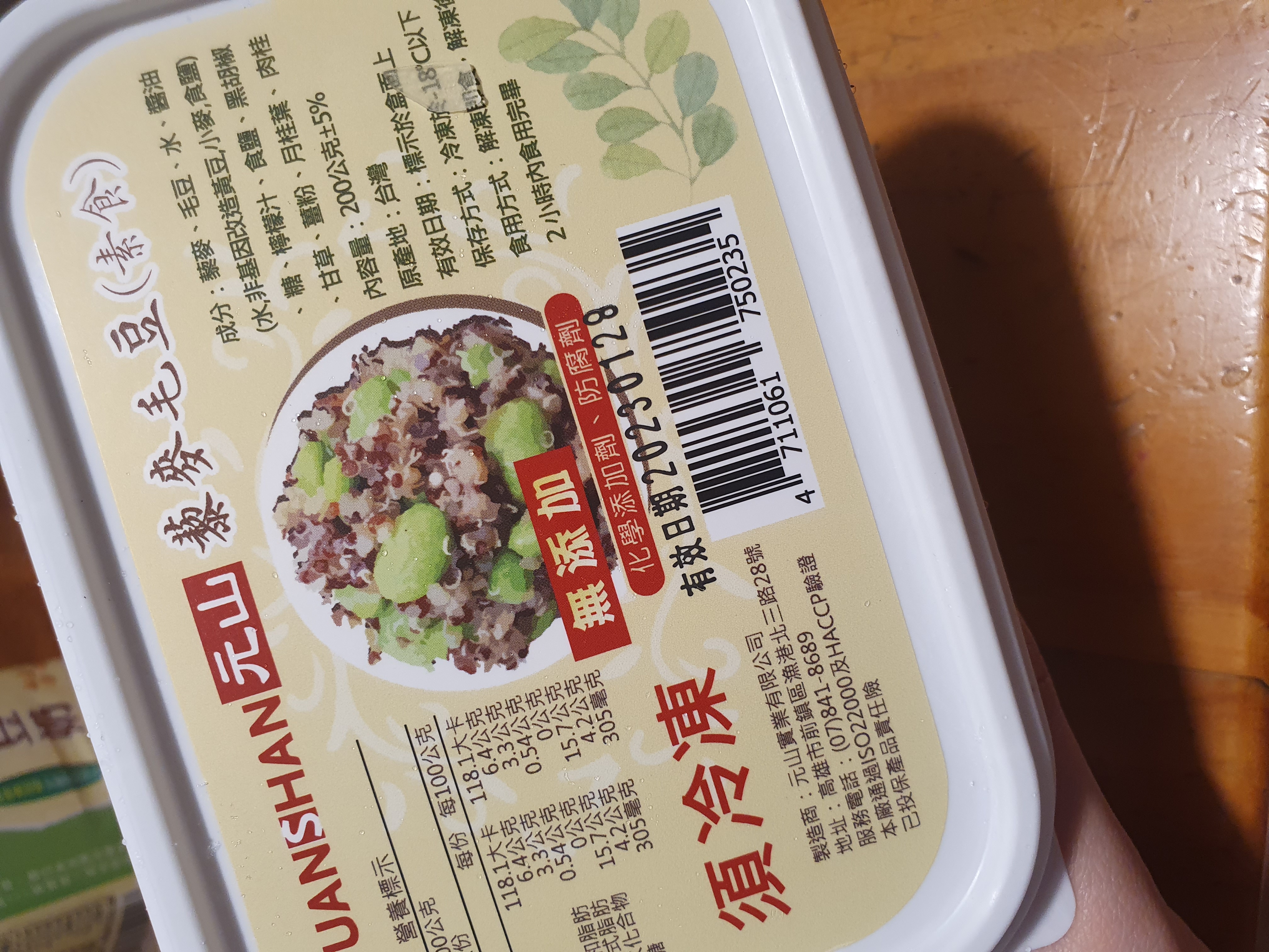 藜麥、毛豆、水、醬油(水,非基因改造黃豆,小麥,食鹽)、 糖、檸檬汁、食鹽、黑胡椒、甘草、薑粉、月桂葉、 肉桂