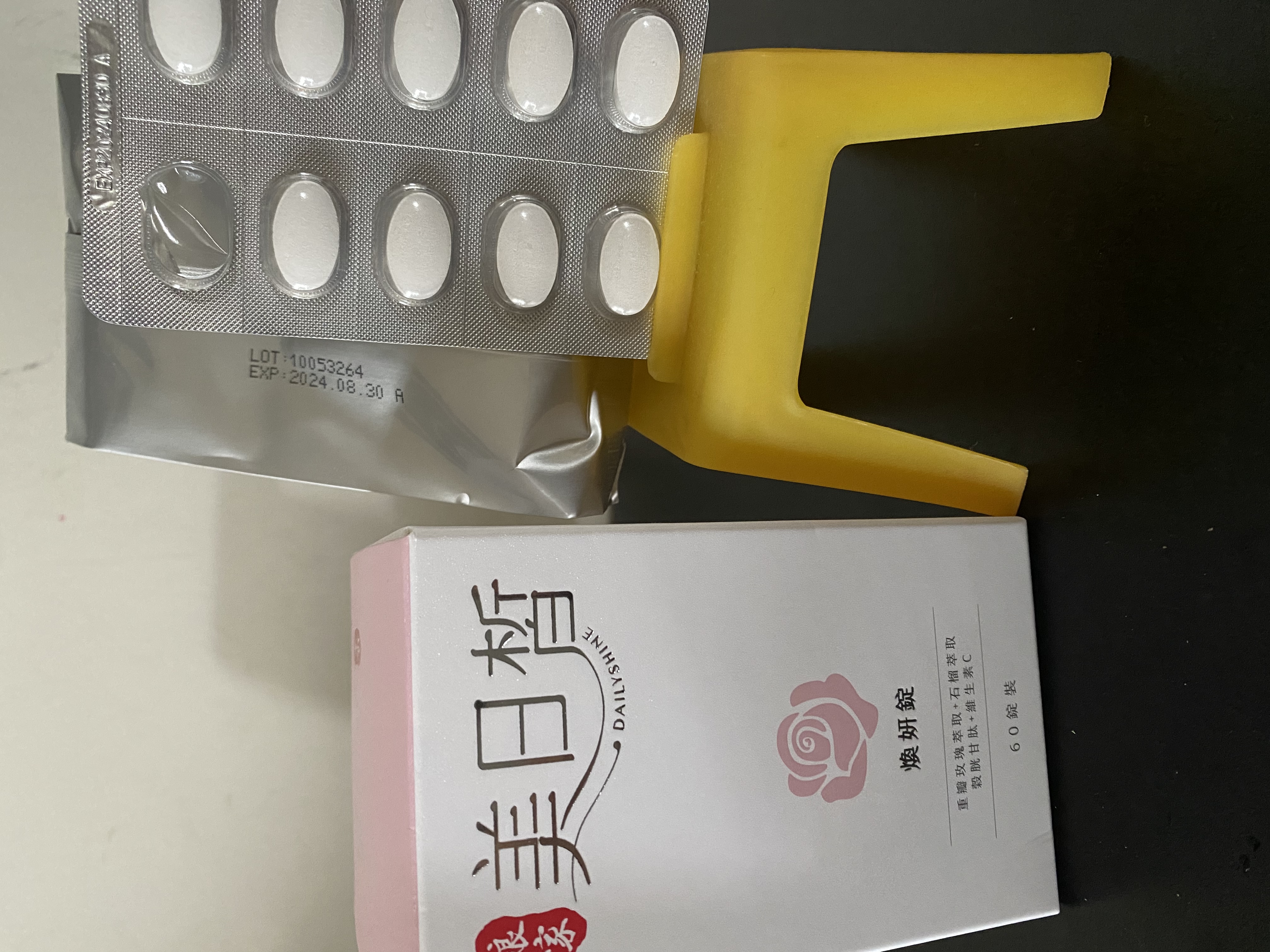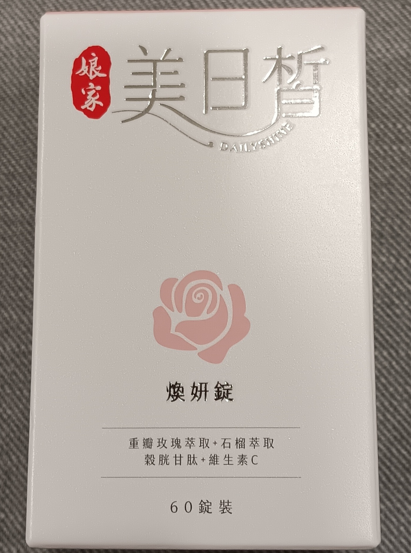 微結晶狀α-纖維素、穀胱甘肽、難消化性麥芽糊精、維生素C、膜衣(羥丙基甲基纖維素、二氧化鈦、微結晶狀α-纖維素、硬脂酸)、石榴發酵粉(麥芽糊精、石榴濃縮汁、檸檬酸)、牛奶鈣、重瓣玫瑰萃取粉(麥芽糊精、重瓣玫瑰花)、氧化鋅、菸鹼醯胺、紅石榴萃取粉(石榴萃取物、麥芽糊精)、余甘子萃取粉、硬脂酸鎂、玫瑰香料、本多酸鈣、荔枝香料、維生素B6 、 維生素B2 、蔗糖素(甜味劑)