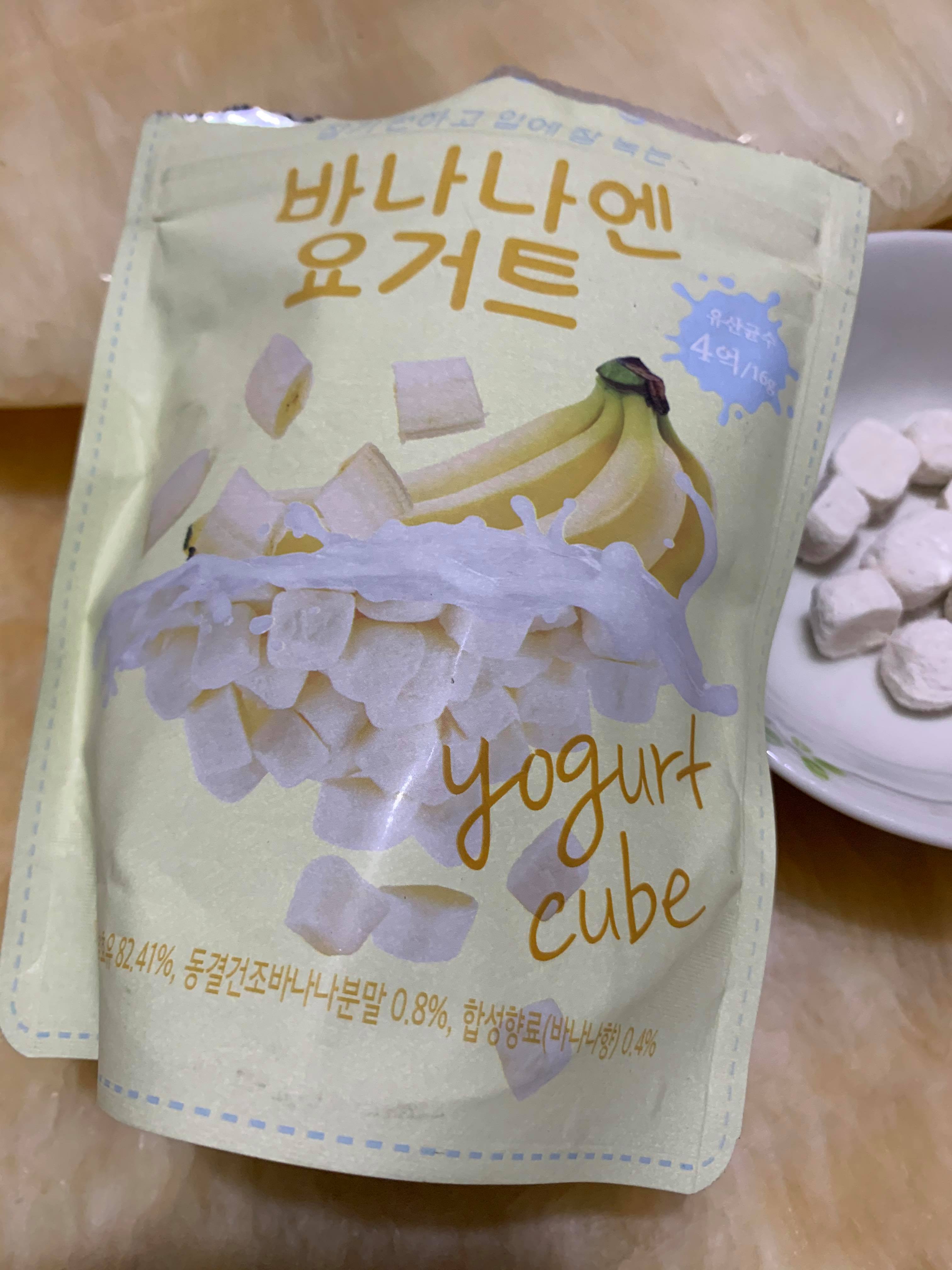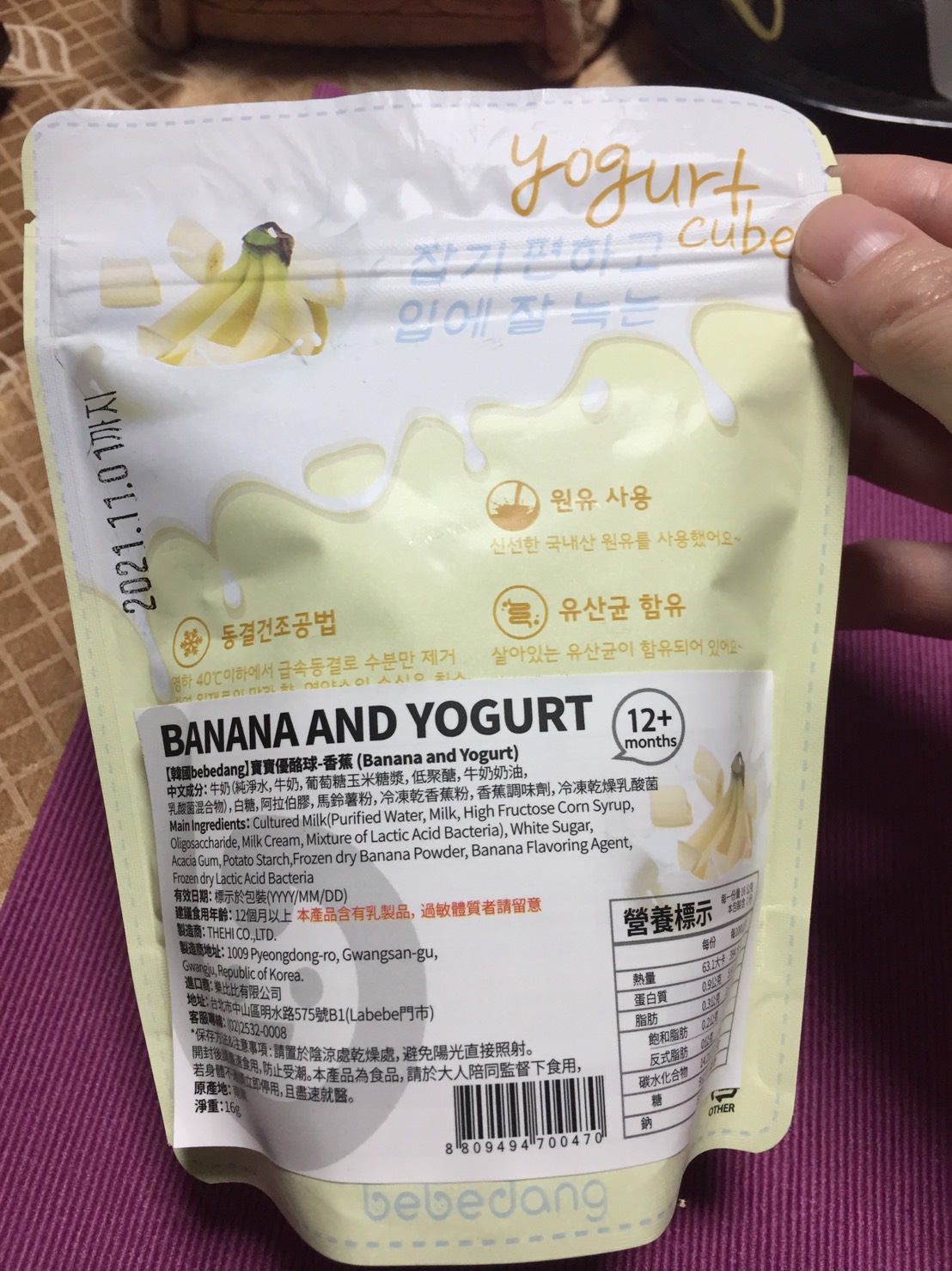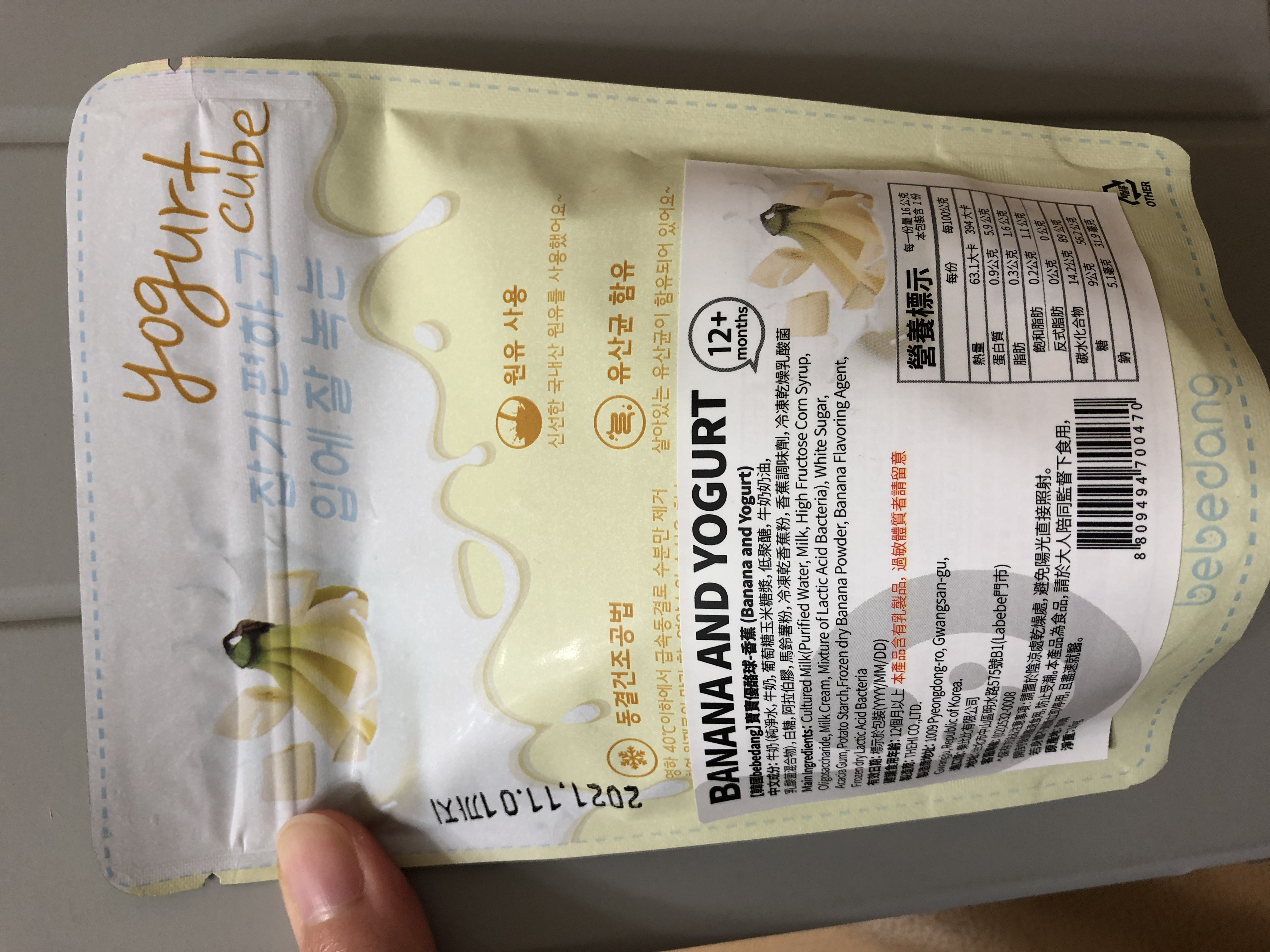 發酵乳【粗糖(韓國),液體果糖,低聚醣,牛奶&奶油(韓國),乳酸0.002%】82.41%白糖,洋木鬼纖維(法國),香蕉粉(菲律賓)0.8%,合成香料(香蕉)0.4%,冷凍乾物質0.12%