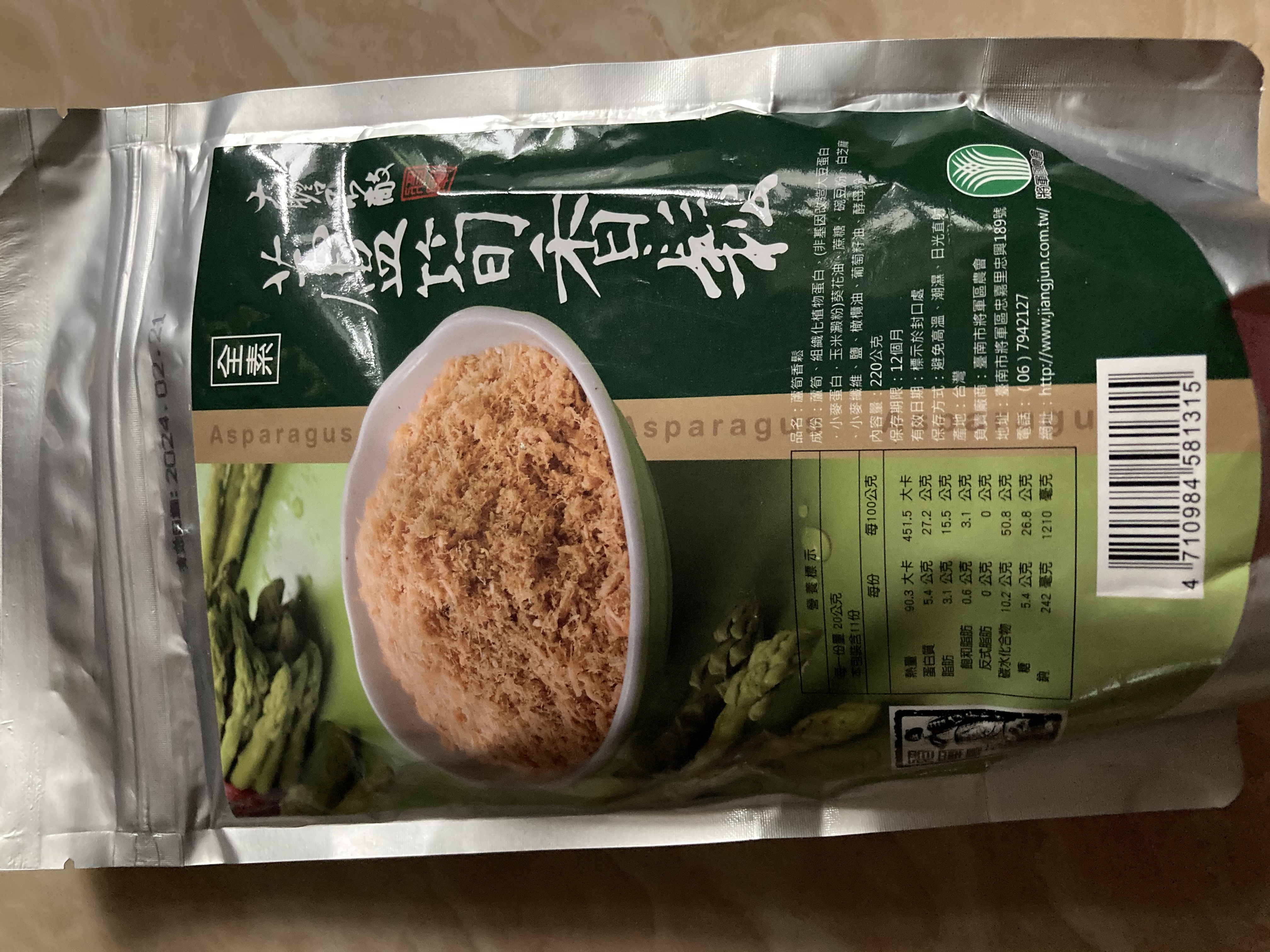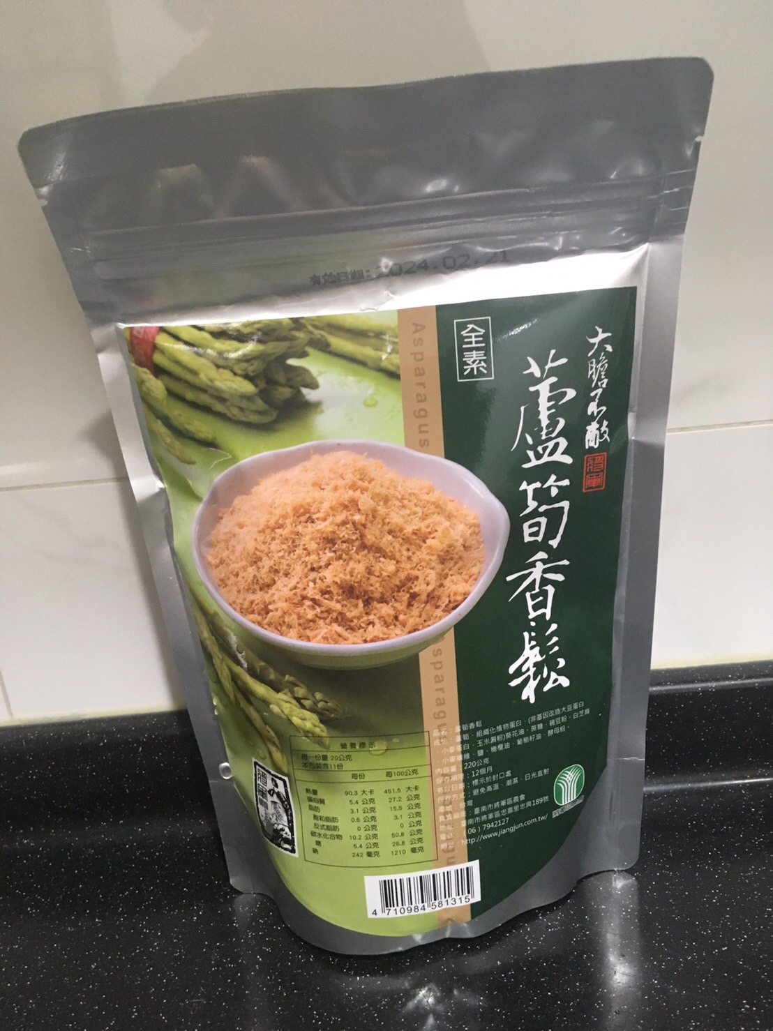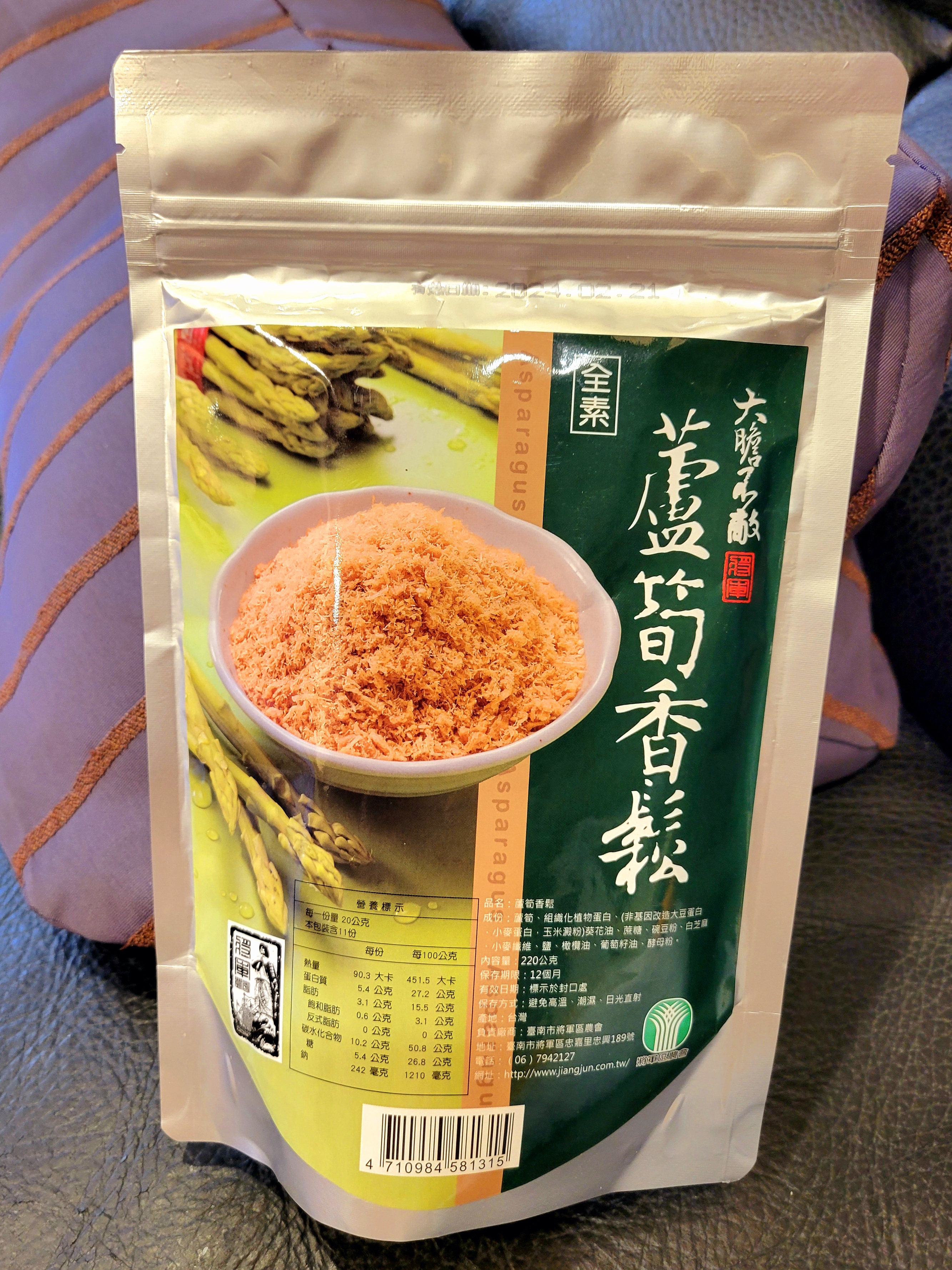 蘆筍、組織化植物蛋白(非基因改造大豆蛋白、小麥蛋白、玉米澱粉)、葵花油、牛蒡、蔗糖、碗豆粉、南瓜、白芝麻、小麥纖維、鹽、橄欖油、葡萄籽油、酵母粉。
