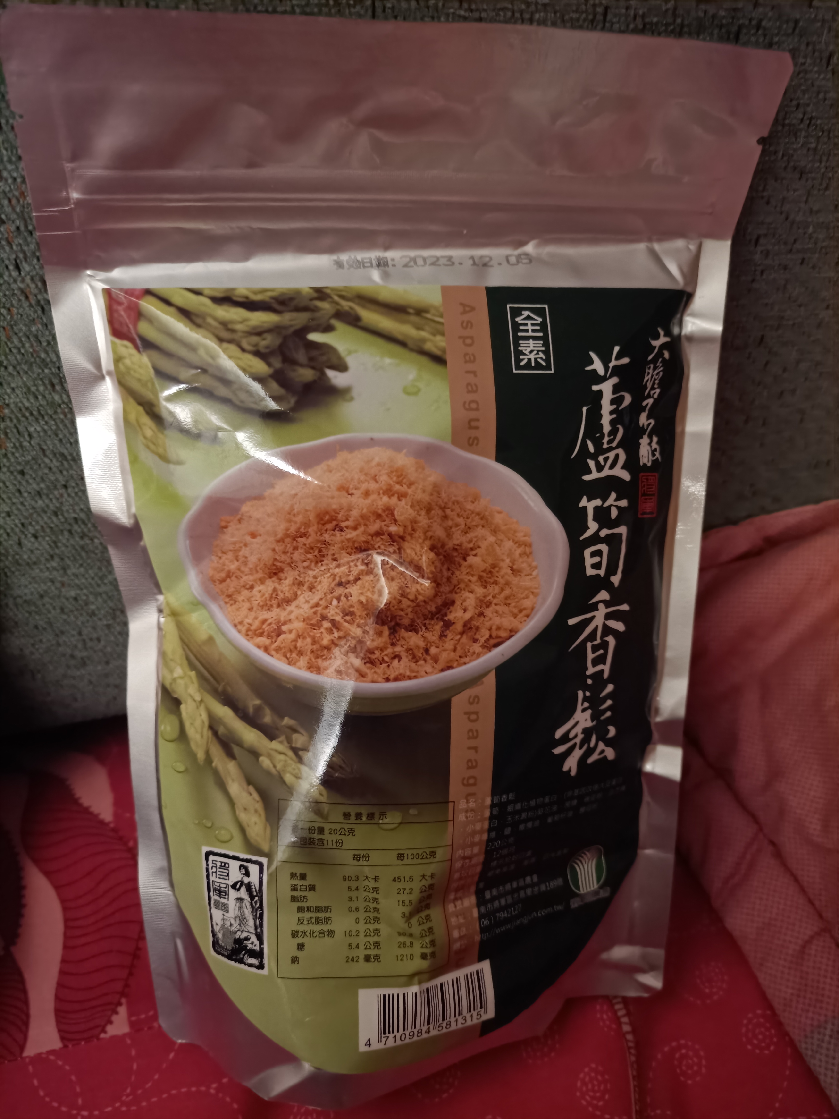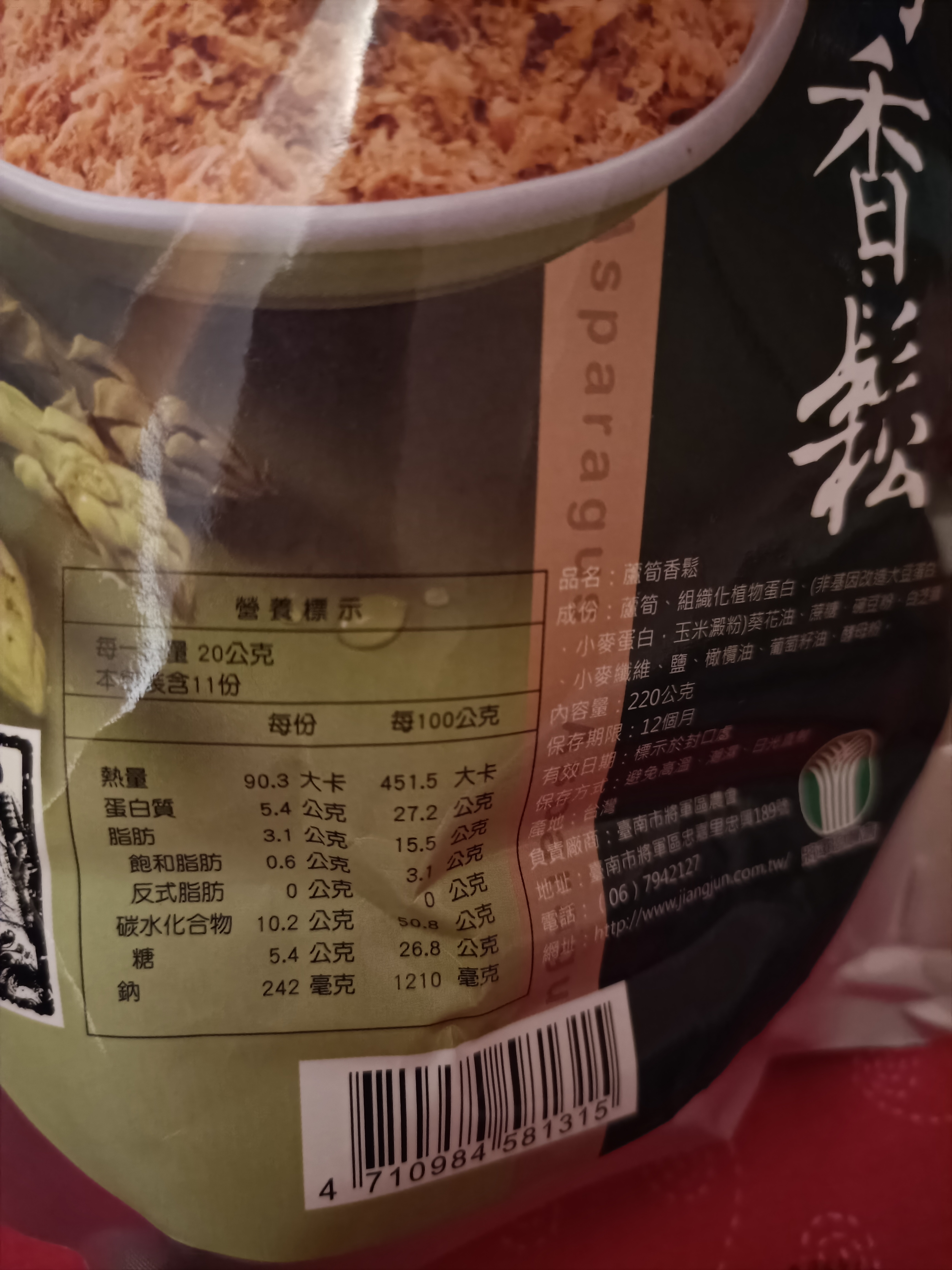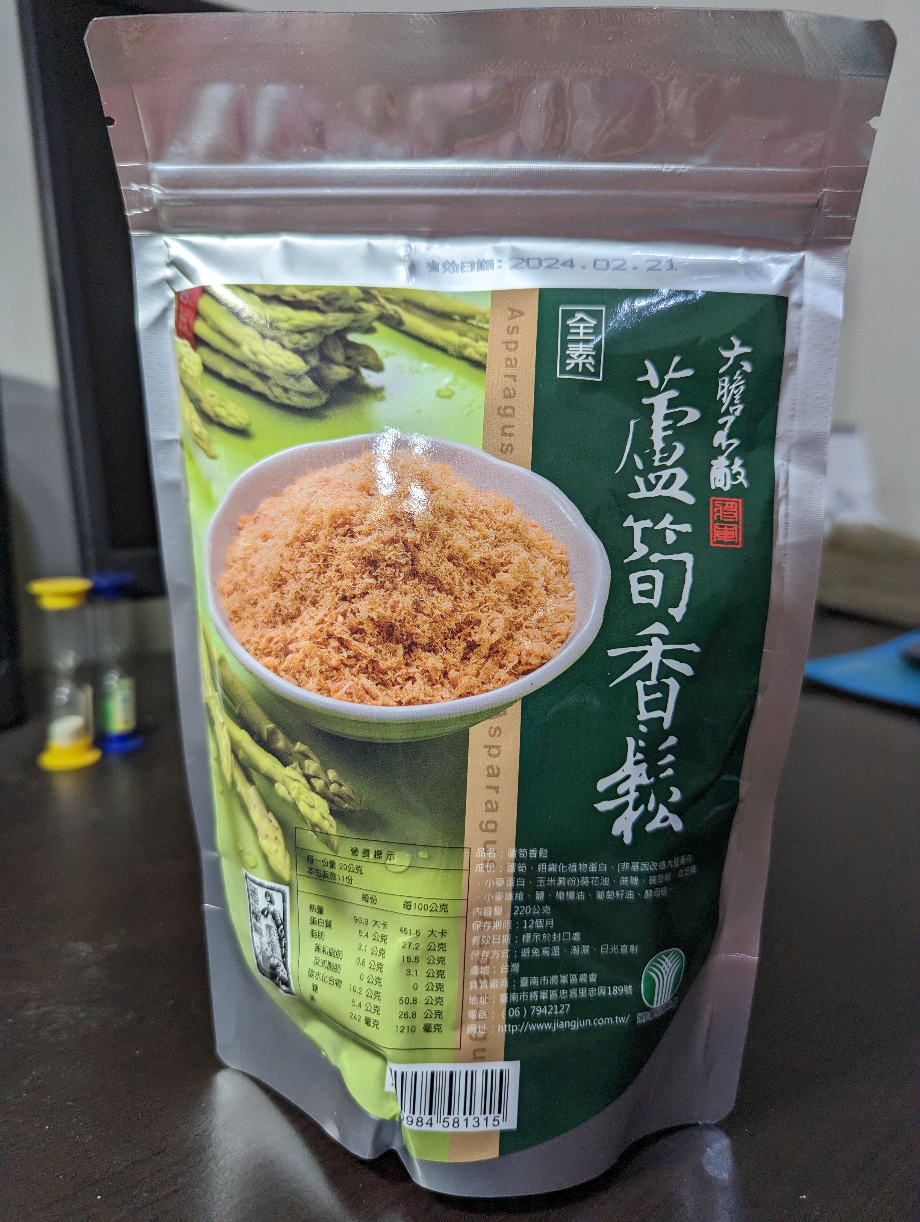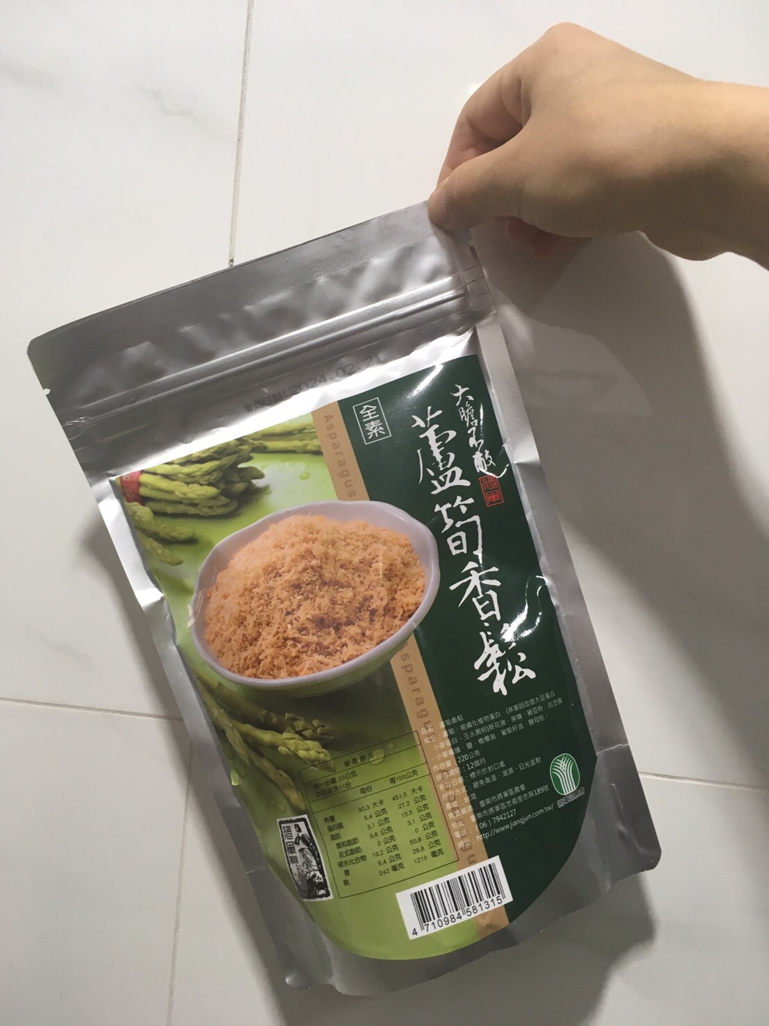 蘆筍、組織化植物蛋白(非基因改造大豆蛋白、小麥蛋白、玉米澱粉)、葵花油、牛蒡、蔗糖、碗豆粉、南瓜、白芝麻、小麥纖維、鹽、橄欖油、葡萄籽油、酵母粉。