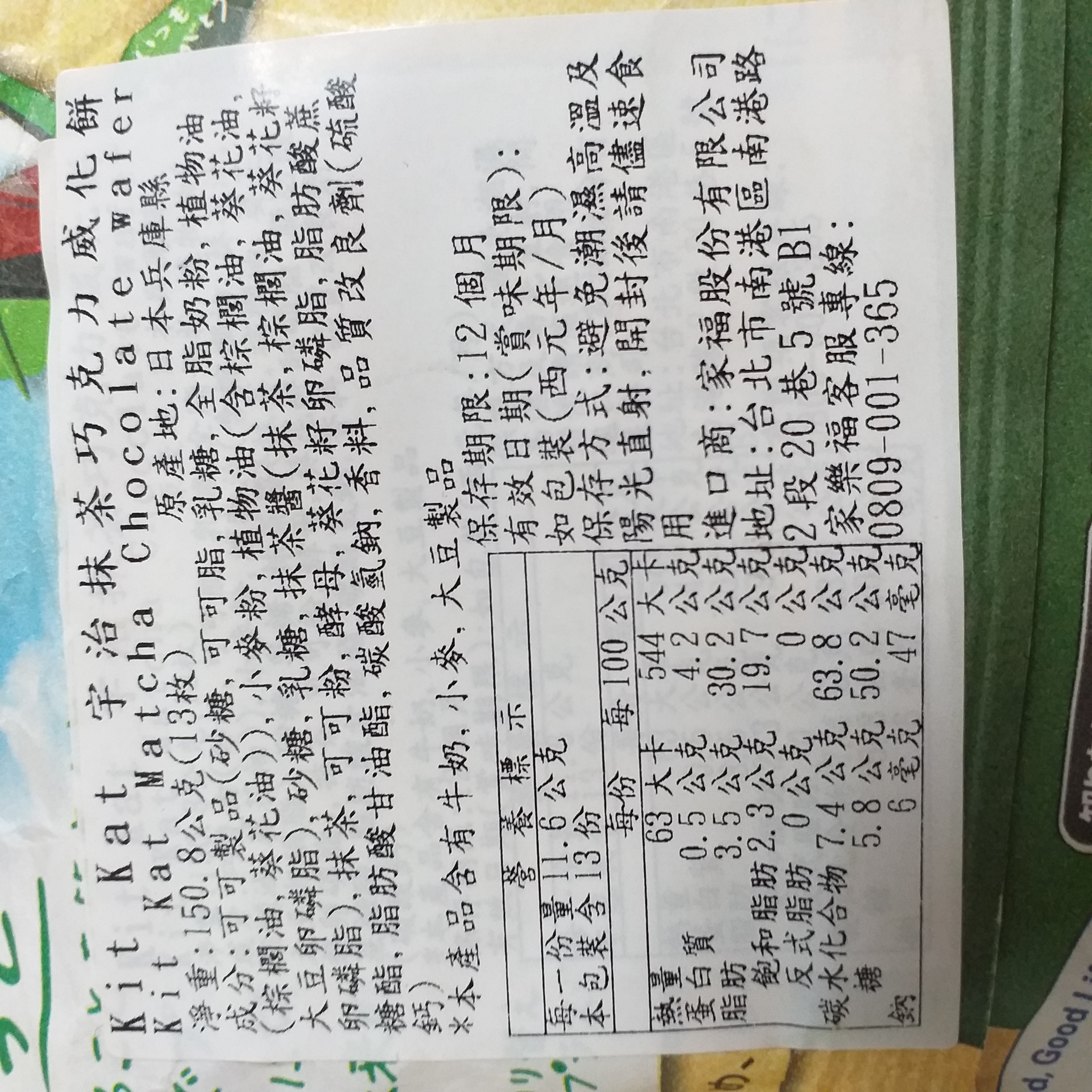 糖、小麥麵粉、乳糖、 乳脂、麥芽糊精、脫脂奶粉、綠茶粉、乳清粉、葡萄糖漿、大豆 卵磷脂、
