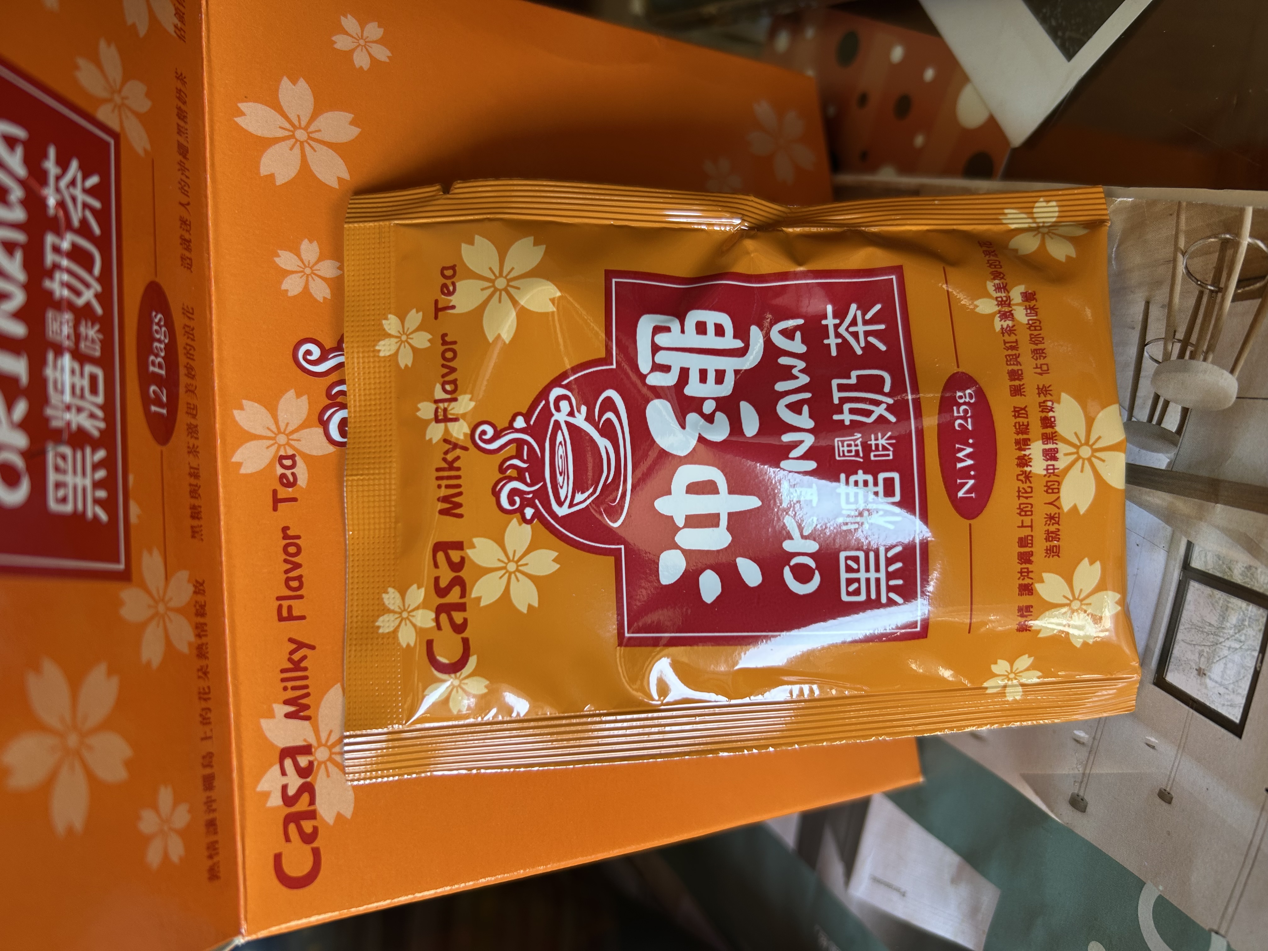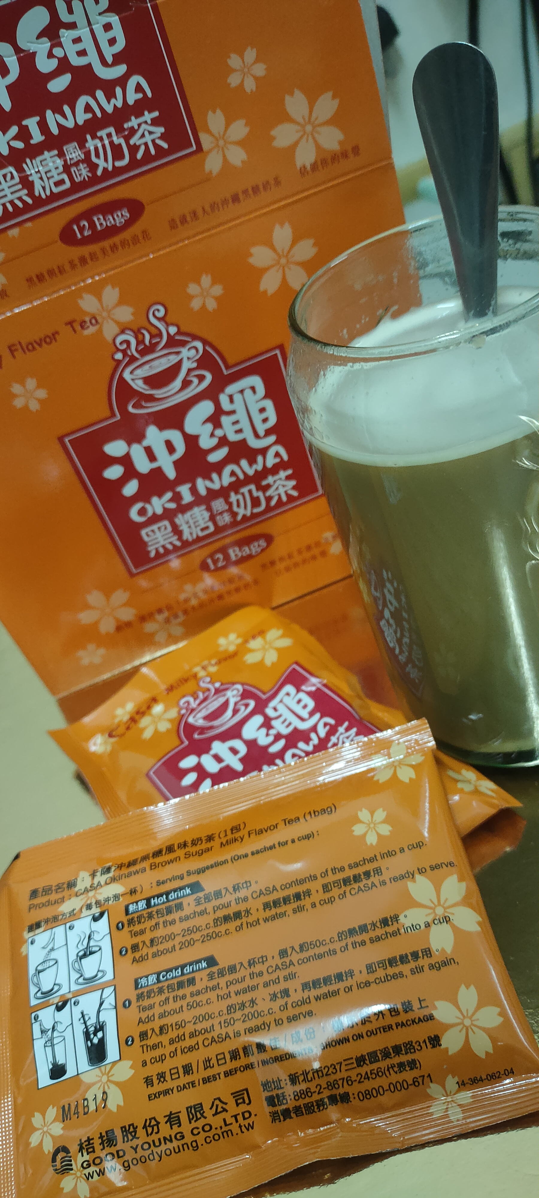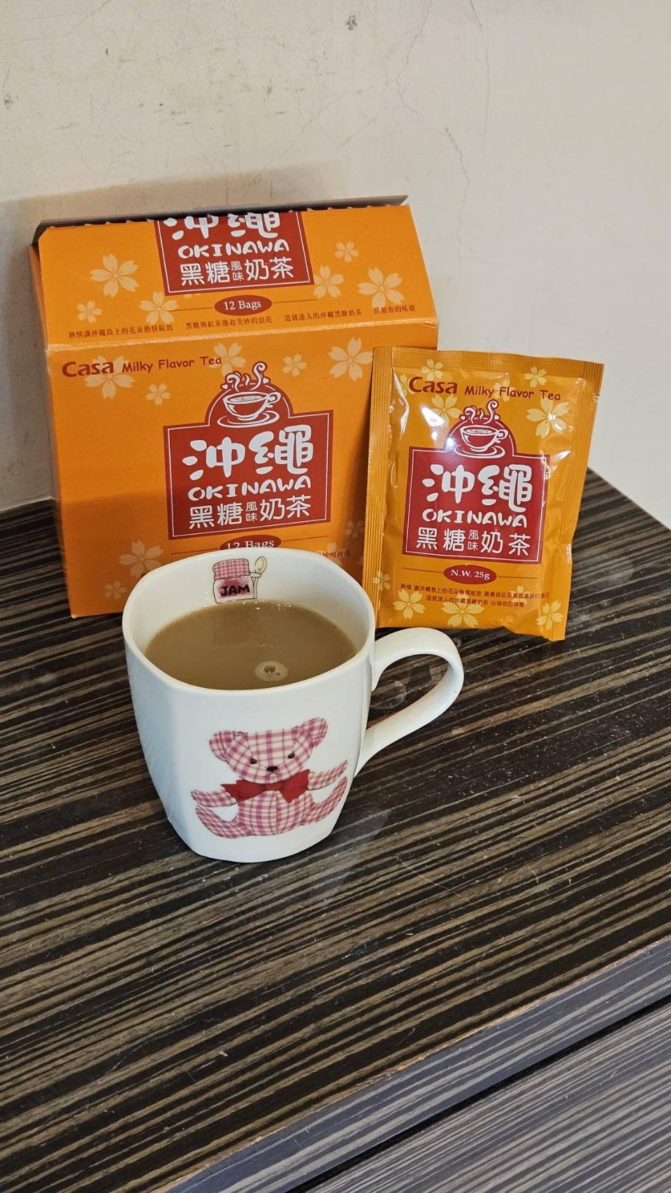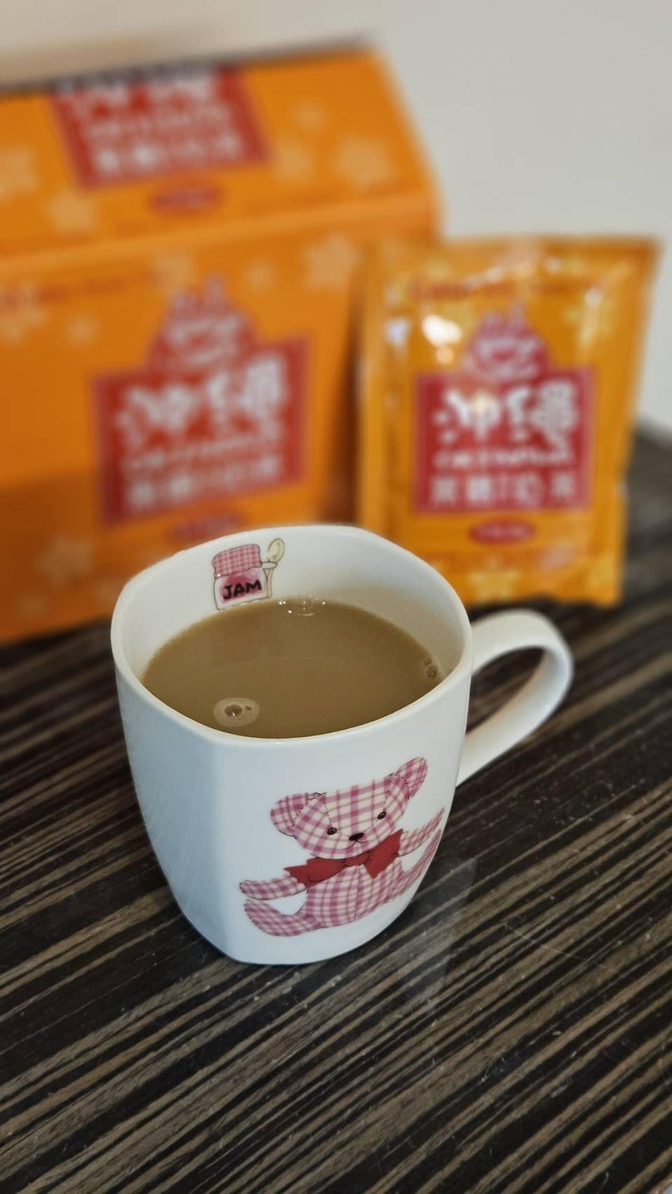 砂糖、奶精【葡萄糖漿、完全氫化棕櫚仁油、乾酪素鈉、磷酸氫二鉀、乳化劑(脂肪酸甘油酯、單及雙脂肪酸甘油二乙醯酒石酸酯)、多磷酸鈉、二氧化矽、食鹽、香料、檸檬酸鈉】、全脂奶粉、即溶紅茶粉、黑糖粉、食鹽、阿拉伯膠、抗結塊劑(二氧化矽)、香料