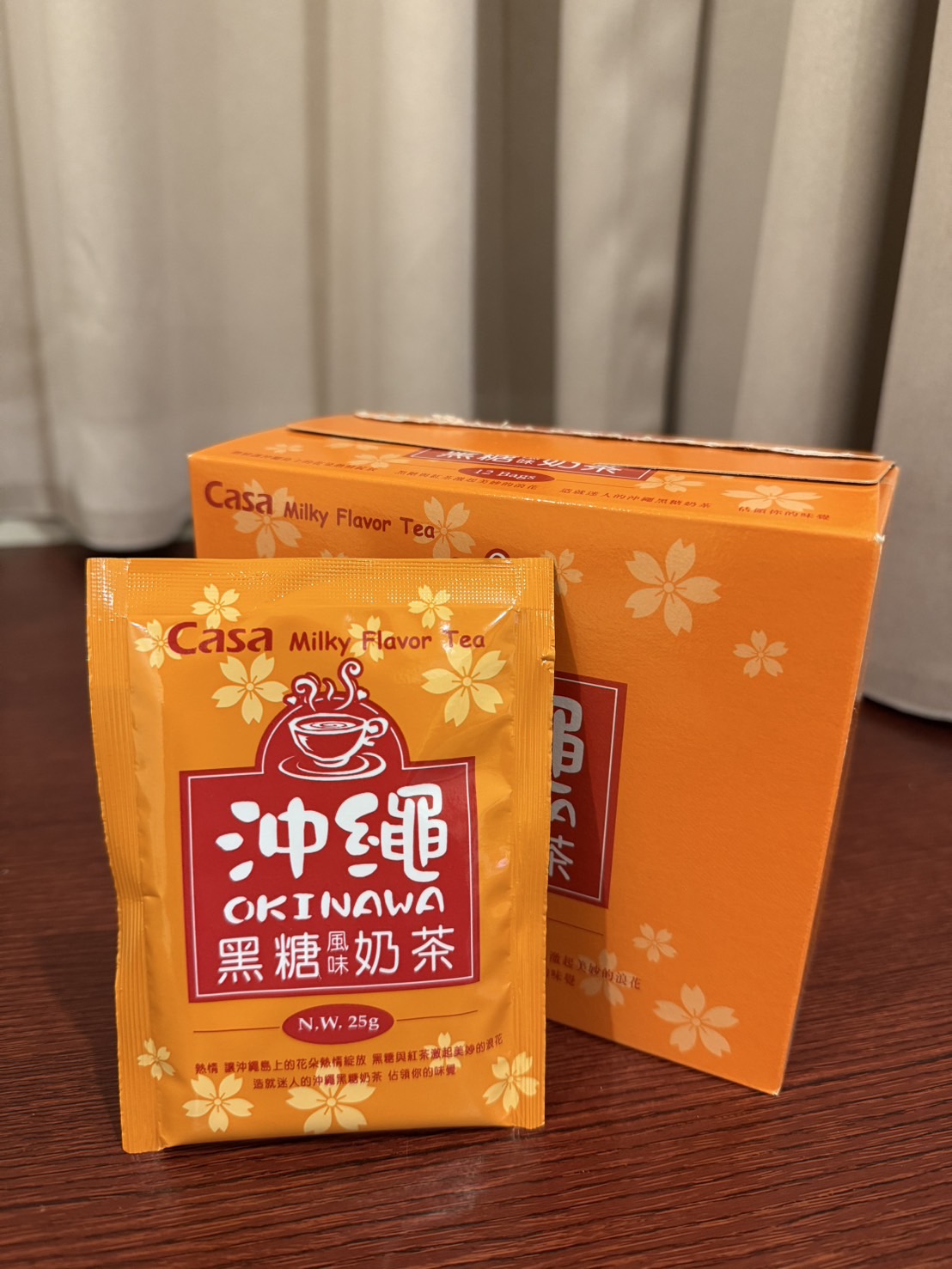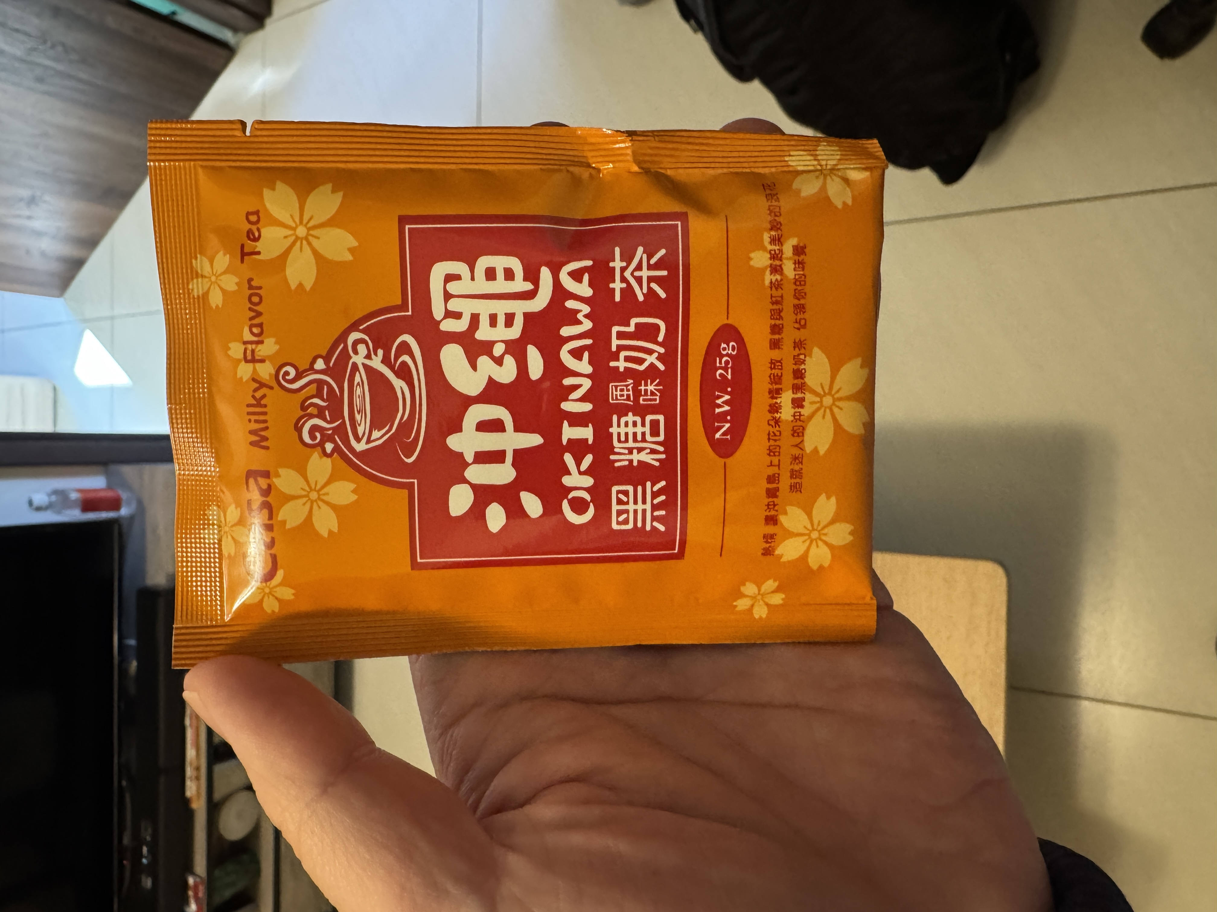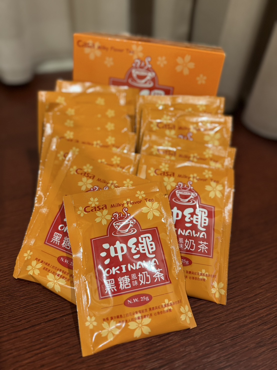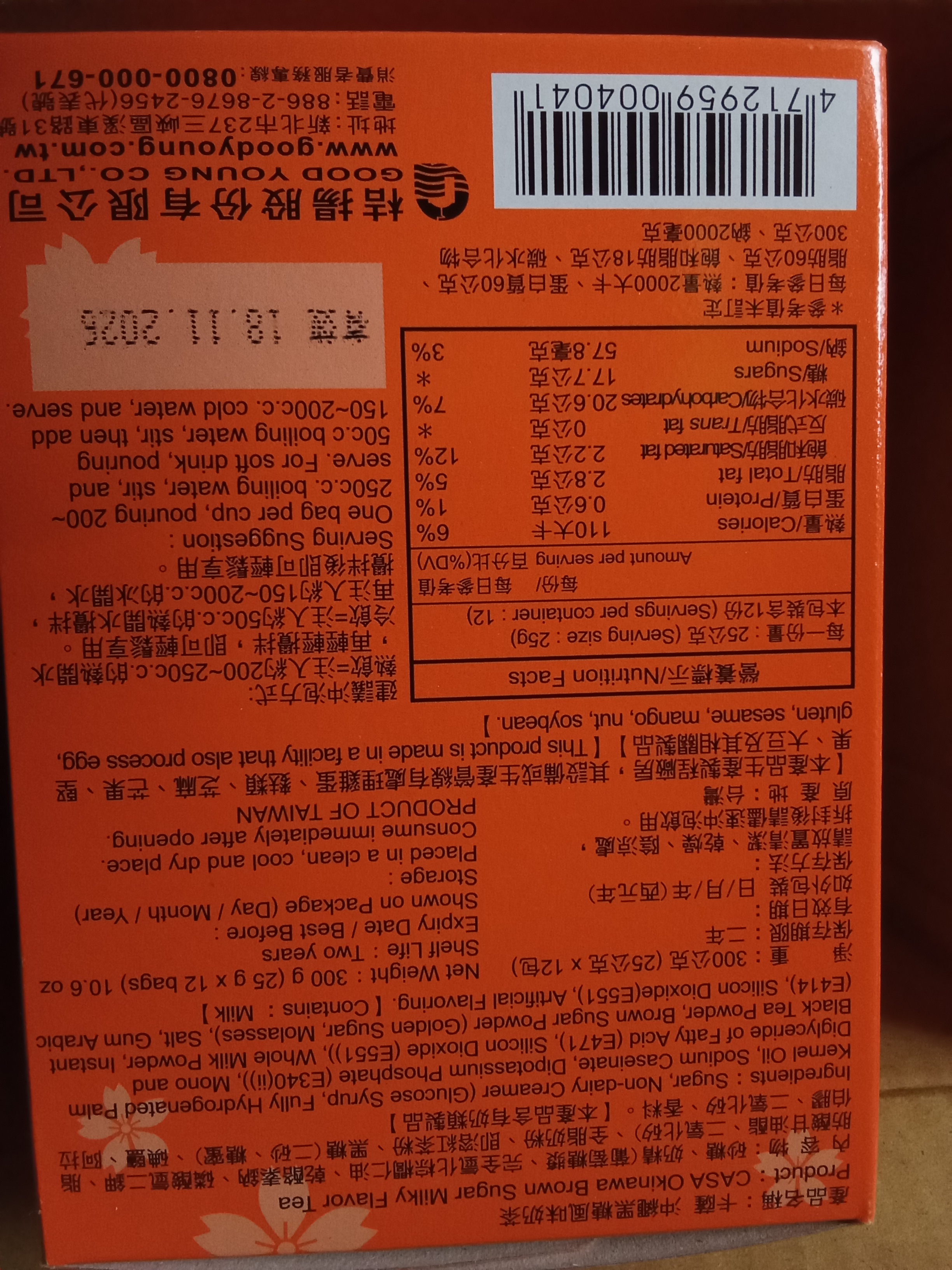 砂糖、奶精【葡萄糖漿、完全氫化棕櫚仁油、乾酪素鈉、磷酸氫二鉀、乳化劑(脂肪酸甘油酯、單及雙脂肪酸甘油二乙醯酒石酸酯)、多磷酸鈉、二氧化矽、食鹽、香料、檸檬酸鈉】、全脂奶粉、即溶紅茶粉、黑糖粉、食鹽、阿拉伯膠、抗結塊劑(二氧化矽)、香料