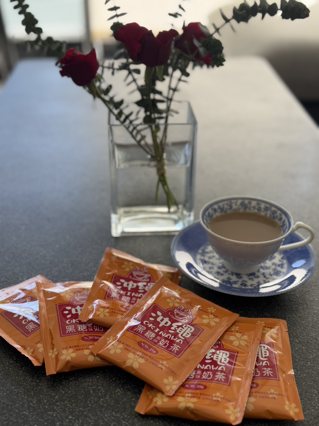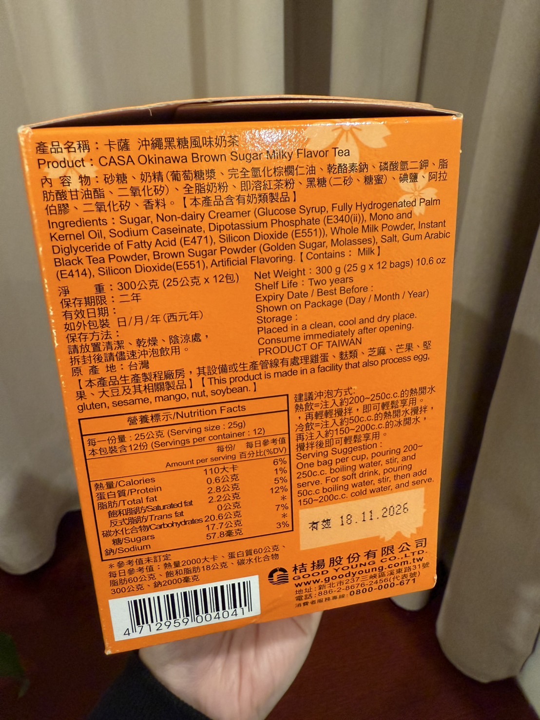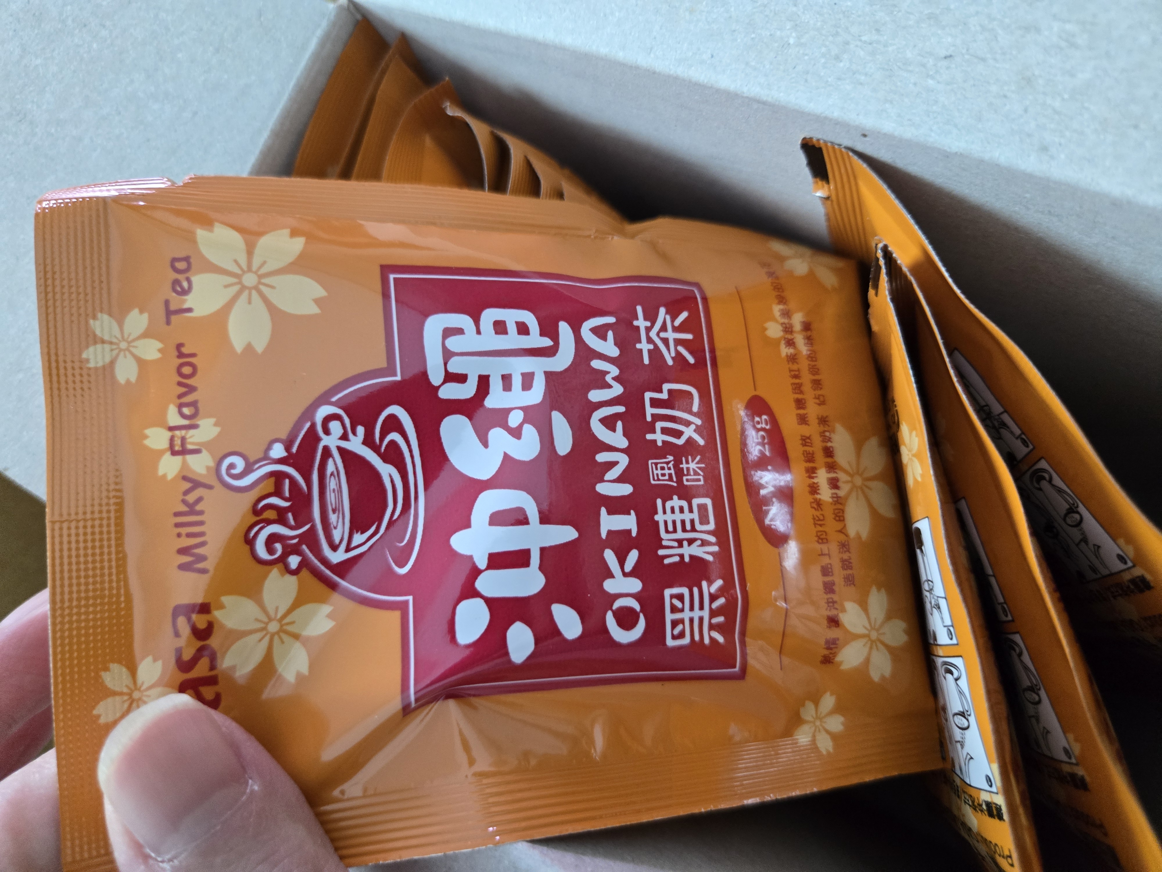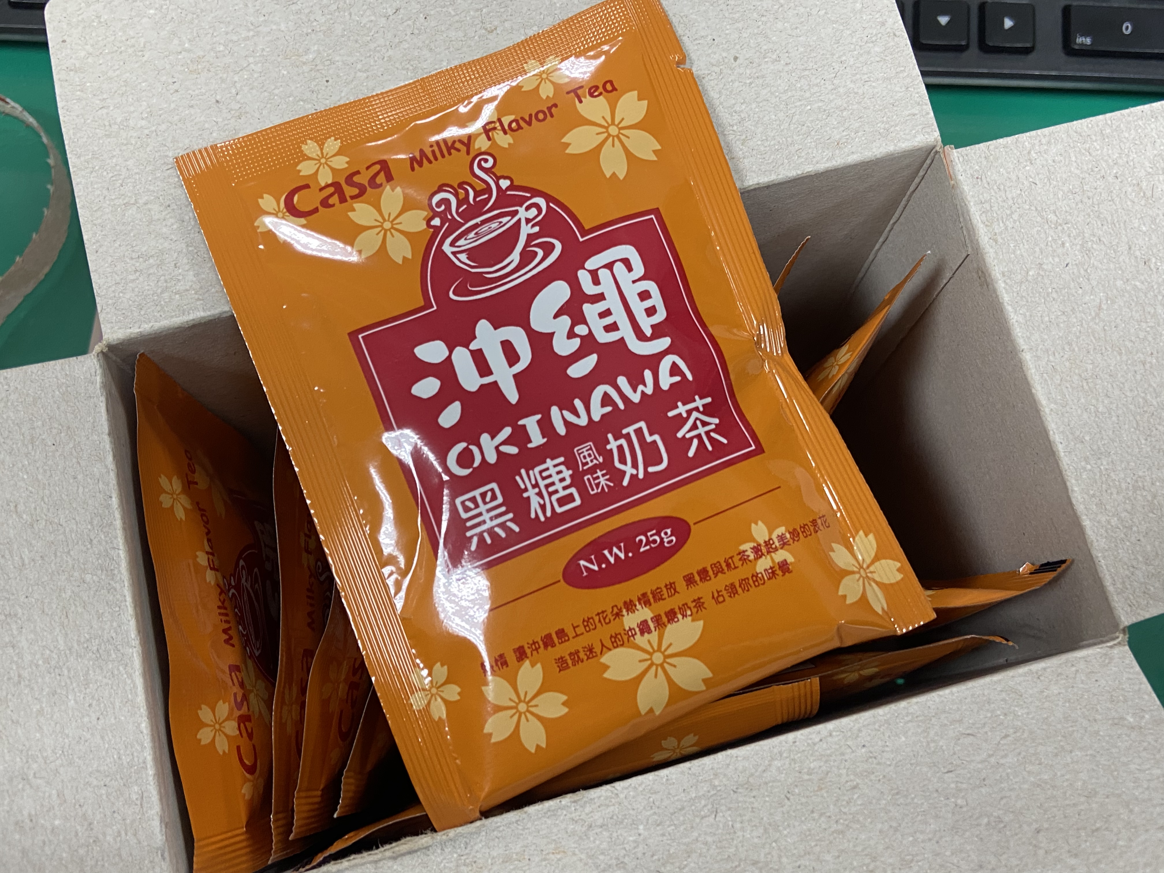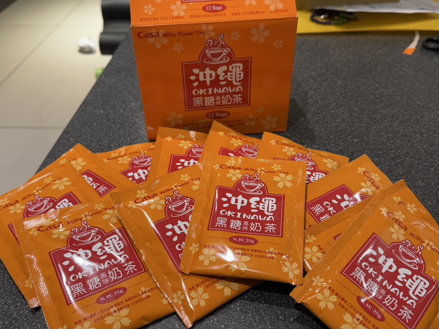 砂糖、奶精【葡萄糖漿、完全氫化棕櫚仁油、乾酪素鈉、磷酸氫二鉀、乳化劑(脂肪酸甘油酯、單及雙脂肪酸甘油二乙醯酒石酸酯)、多磷酸鈉、二氧化矽、食鹽、香料、檸檬酸鈉】、全脂奶粉、即溶紅茶粉、黑糖粉、食鹽、阿拉伯膠、抗結塊劑(二氧化矽)、香料
