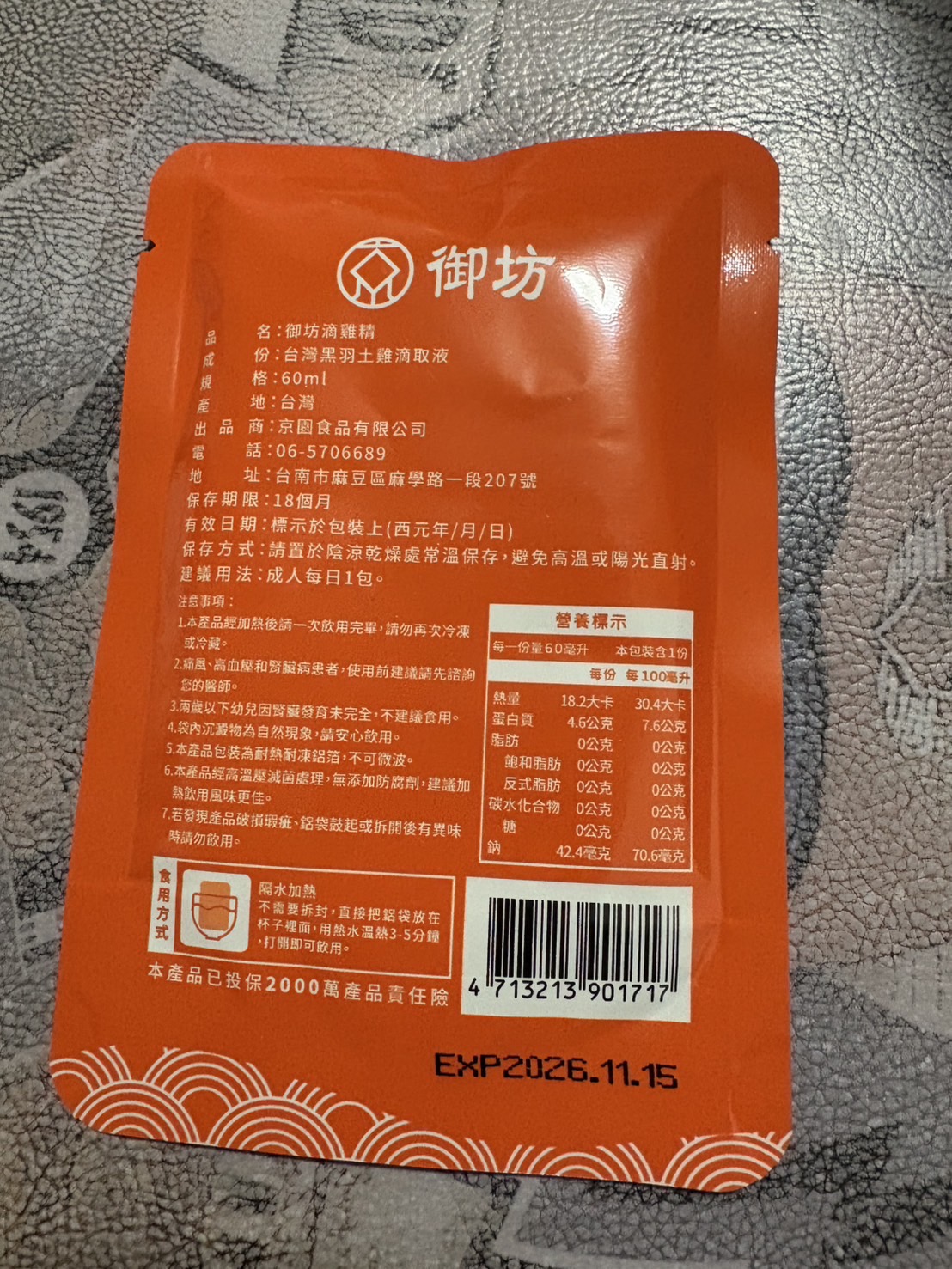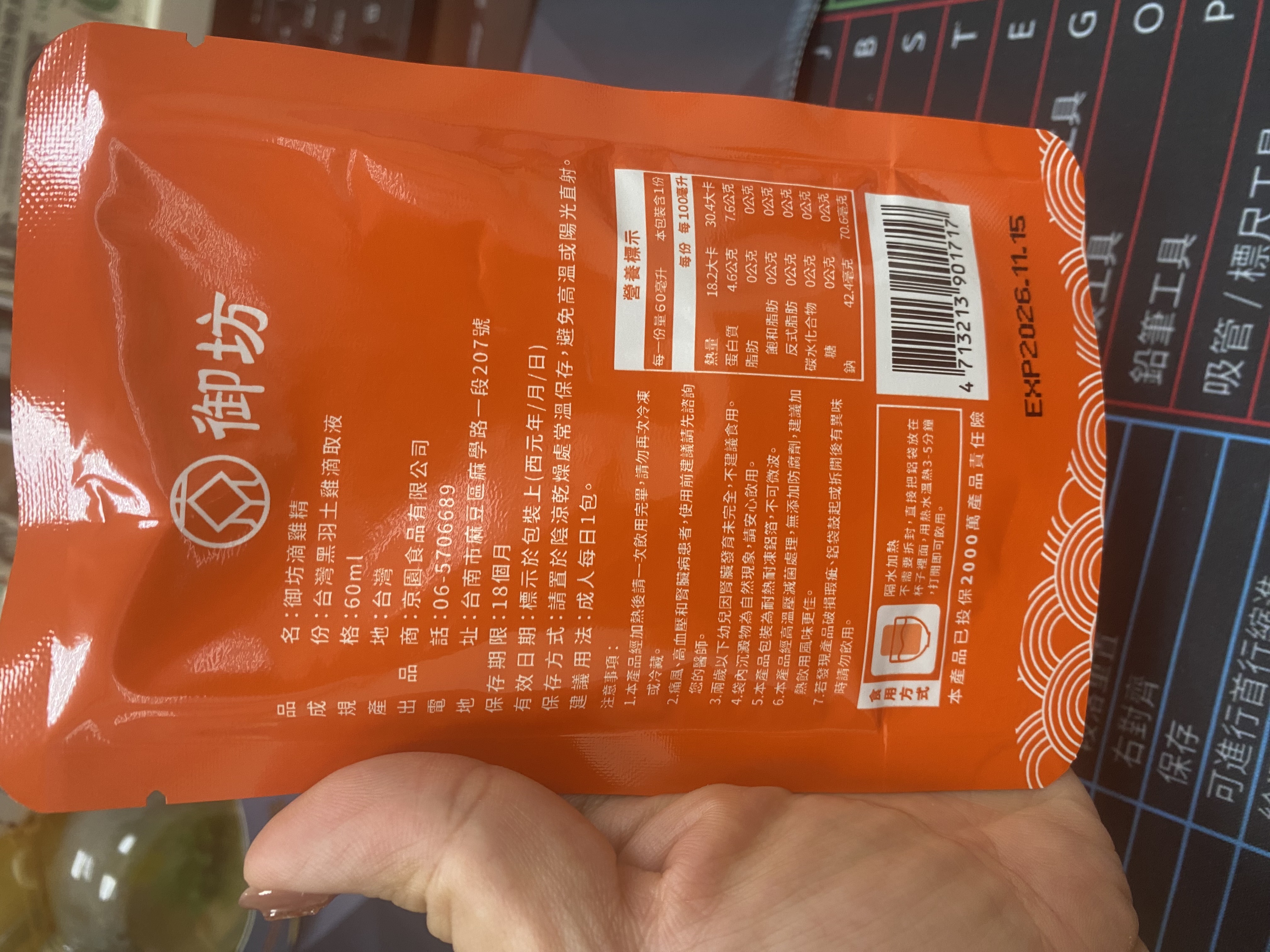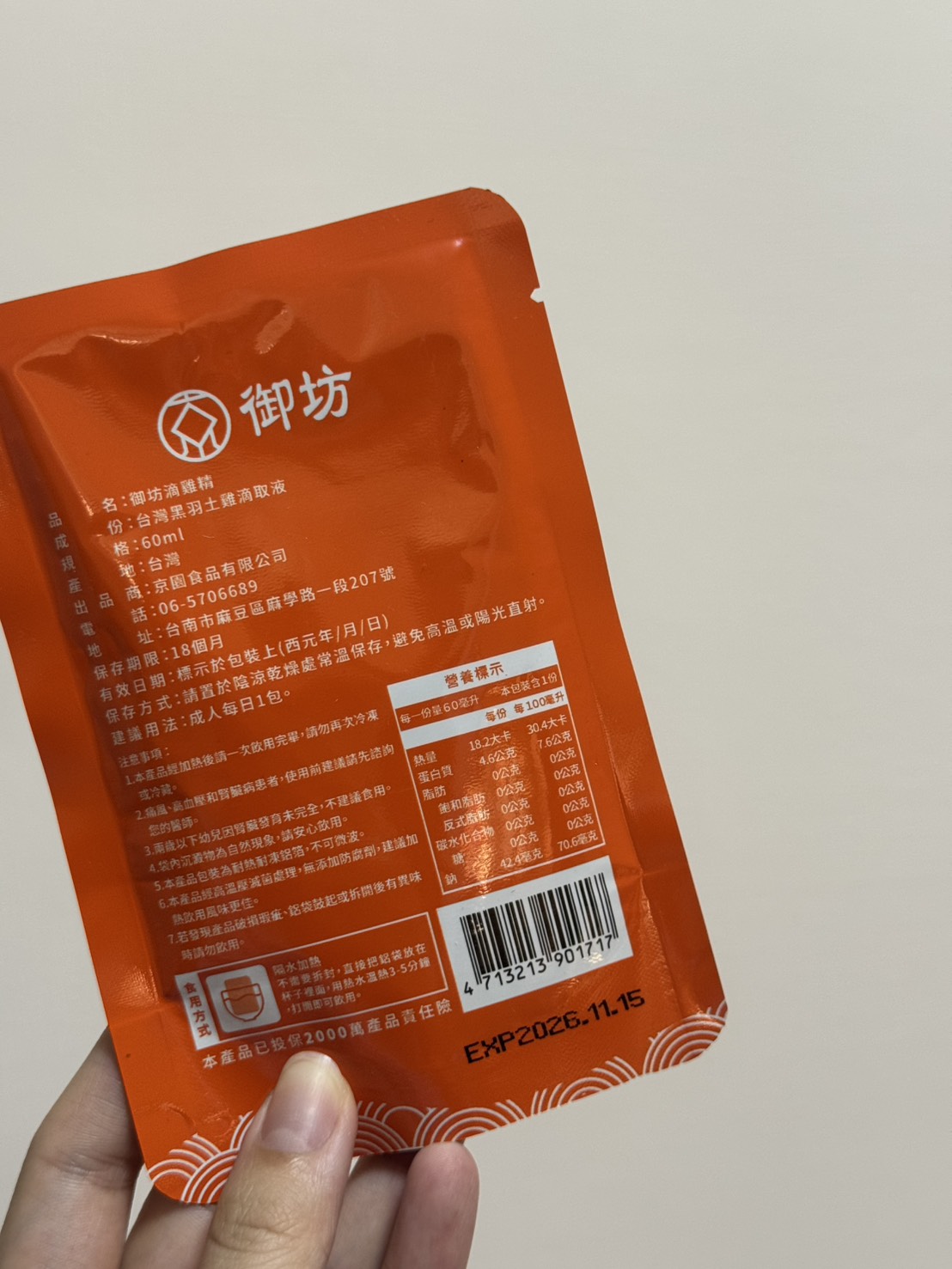 回列表 御坊 亞麻籽土雞滴雞精 滴滴精粹,每日元氣補給 市價130元 (免費申請) 所需等級 一般會員以上 所需學分 50 體驗份數 15 關注人數 990 申請人數 177 申請截止 品牌業者:京園食品有限公司 負責廠商 京園食品有限公司 廠商地址 台南市麻豆區埤頭里麻學路一段207號 產地 台灣 試用產品規格 60毫升*1包 食品業者登錄字號 D145897261-00000-3 投保產品責任險字號 第一產物保險1017字第10PR000629號 心得分享 商品介紹 商品成分 使用方法 注意事項 體驗名單 8.9 御坊 亞麻籽土雞滴雞精 風味濃醇順口 9.1 包裝設計便利 9.1 補充營養效果 8.5 無腥味接受度高 9.1 建議推薦 8.7 心得分享 15則 王美玉 金食達人 51歲 臺南市 2025/08/22 對御坊 亞麻籽土雞滴雞精留下評價 9 很開心能被抽中試飲御坊亞麻籽土雞滴雞精,此商品是選用高營養的亞麻籽為主食的紅羽、黑羽土雞,全雞碎骨切塊在特製陶甕恆溫滴淬12小時,全程不加一滴水,不加任何調味料,零添加物,保留雞汁原汁原味,濃縮出滴滴精粹的高營養價值的胺基酸,而且零脂肪、零膽固醇,熱量低又無負擔,又是小分子胺基酸、胜肽,很好吸收。 將整包放進100度c熱水中約3-5分鐘,剪開鋁袋即可食用,聞起來沒有腥味,喝起來有土雞的鮮美,味道純淨清爽回甘,鹹度適中很好喝。 非常適合體質虛弱想要補充元氣,或銀髮族的營養補給,一天一包簡單又方便。 Heidy 鑽石達人 38歲 新北市 2025/08/23 對御坊 亞麻籽土雞滴雞精留下評價 10 平常就偶爾會自己煮雞湯來喝補元氣,這次剛好很幸運抽中了 御坊 亞麻籽土雞滴雞精 的試用品,一打開包裝就聞到濃郁卻清爽的香氣,讓人很期待第一口的感覺。這次自己加點枸杞,入口的瞬間,真的有驚豔到!它的口感非常順口,完全不油膩,也沒有一般滴雞精有時會出現的腥味或苦味。反而是淡淡的甘甜,溫潤醇厚,喝下去喉嚨很舒服,還會回甘。口中沒有負擔感,反而讓人覺得像在喝一碗細火慢熬的精華湯品,很溫暖。御坊使用亞麻籽飼養的土雞,肉質本身比較清爽,搭配低溫滴煉的方式,難怪能保留這麼純淨又細緻的風味。喝完一包,身體暖暖的,精神也提振不少。這次的試喝體驗真的很不錯,讓我對御坊的印象大加分!之後有機會一定會回購,也推薦給跟我一樣注重口感、又想補氣養身的朋友試試看~ 小劉 鑽石達人 27歲 臺北市 2025/08/24 對御坊 亞麻籽土雞滴雞精留下評價 9 很開心可以試喝亞麻籽土雞滴雞精,獨立包裝適合攜帶,我用杯子裝熱水,泡在熱水裡大概3分鐘內,就可以喝了,使用上來說非常方便,很適合囤放在辦公室或給小孩帶去學校補充體力。一打開包裝是香氣十足的雞香味,沒有雞腥味或油脂味。一入口,濃郁的香氣在口腔內散開,口感非常滑順,讓人忍不住一口接一口,很快就解決一包,是個可以快速補充體力但有非常美味的滴雞精,很推薦需要補身體或容易疲勞的人可以購買,包裝是橘色也很喜慶,拿來送禮也非常適合。 李庭 金食達人 33歲 臺北市 2025/08/25 對御坊 亞麻籽土雞滴雞精留下評價 9 這次收到食力&御坊提供的"亞麻籽土雞滴雞精"試喝標題打著【每日元氣補給】真的是直接大心動呢!為什麼呢?雖然不常發生,但是偶而需要熬夜的隔天,或是身體出現疲憊的狀況,甚至是有一點點感冒徵兆的時候,都會習慣喝上一包雞精補充一下精力:) 畢竟看醫生、吃藥 真的是耗時耗神又傷身吶~這款是可以隔水加熱的產品,必須再次大推,根本是懶人福音> <味道個人覺得偏濃郁,shot掉(?)之後,整個人BUFF疊好補滿!!也不會因為是濃縮精華感覺很油或腥味喔~大力推薦給每一位辛苦的社畜!! 林怡君 金食達人 47歲 新北市 2025/08/26 對御坊 亞麻籽土雞滴雞精留下評價 8 收到產品後.覺得御坊的滴雞精以單入包裝設計,開封即飲,而且外出攜帶包包內不佔空間,十分方便。一般微波加熱,聞著帶有濃郁雞香,入口沒有多餘的腥味或油膩感。覺得口感比一般滴雞精更為清爽順口,飲用完有淡淡甘甜。早上空腹喝下去能快速暖胃,精神比較快恢復清醒。若是工作疲勞,午後補充一包,也會比飲用咖啡更持久飲用後應可減少疲倦感,不會太油重,腸胃接受度高。滴雞精適合上班族、熬夜族、孕期或產後調養者。送禮也都很方便。御坊亞麻籽土雞滴雞精是一款值得持續飲用的健康補品。我認為缺點是試用品僅一包.有點可惜。 Gloria 鑽石達人 45歲 嘉義市 2025/08/26 對御坊 亞麻籽土雞滴雞精留下評價 9 御坊亞麻籽土雞滴雞精,成分很簡單就是台灣黑羽土雞滴取液,食用方式很方便,就像市面上大多數的滴雞精,只要隔水加熱3~5分鐘,打開就可以飲用。喝起來味道香醇、濃郁又順口、不會過鹹、喝完嘴巴也不會覺得很黏膩;我試喝過幾款市售滴雞精,這款算是中上等級,我家小朋友也覺得好喝,所以一定是大家都可接受的口感。包裝使用橘色搭配金色的設計,兩種都是很有精神的顏色,每天從這包滴雞精作開頭,就覺得一整天都元氣滿滿👍 陳柔 鑽石達人 33歲 新北市 2025/08/27 對御坊 亞麻籽土雞滴雞精留下評價 10 御坊滴雞精鋁袋,真的是出乎意料的好喝!一直對滴雞精都有一種特定的印象,打開包裝就能聞到淡淡的香味,喝起來完全沒有腥味!讓人印象深刻!湯色清澈明亮,看起來很純淨,沒有雜質,比起之前喝過的滴雞精,這款真的完全沒有那種讓人不舒服的味道,真是令人驚艷。喝下去的時候能感受到淡淡的甜味,回甘又順口,裡面滿滿的膠質讓口感有點
