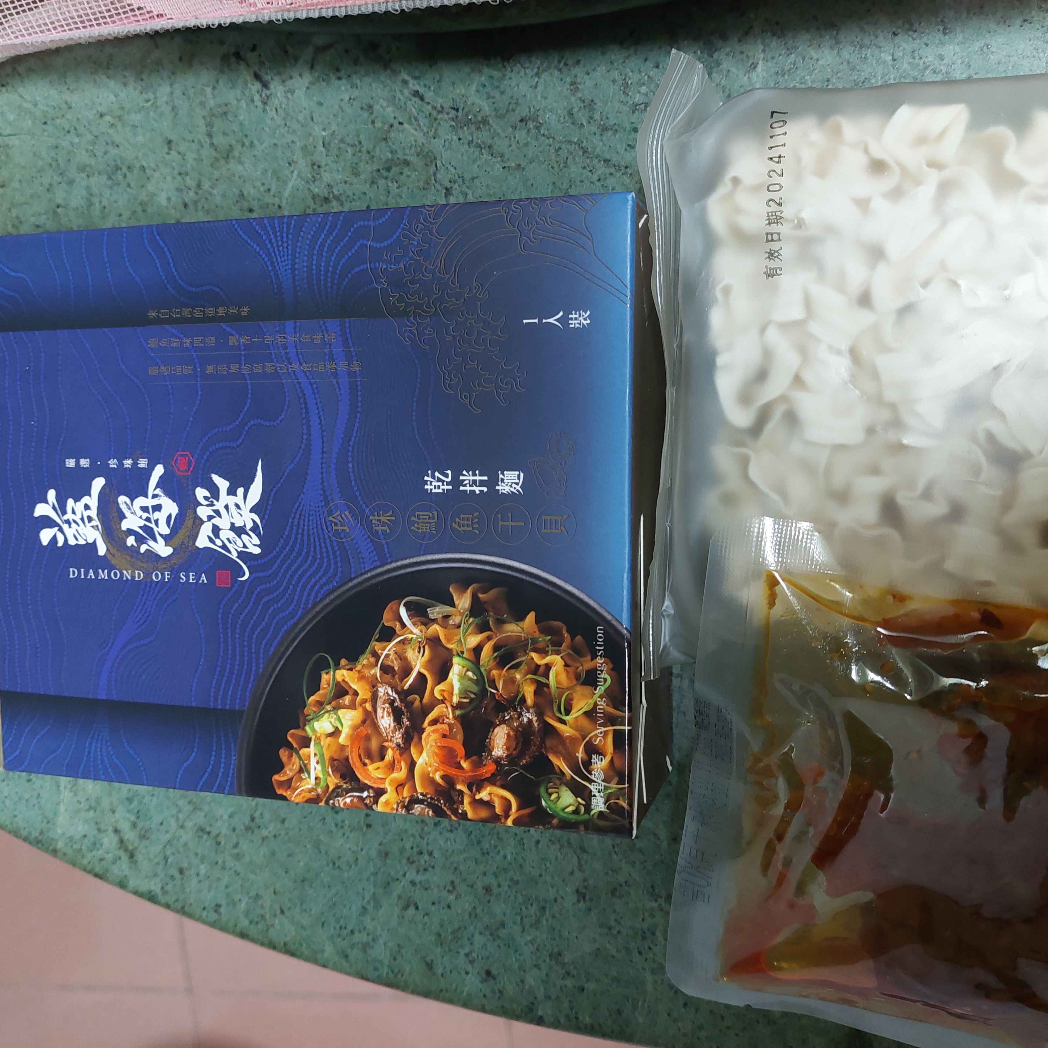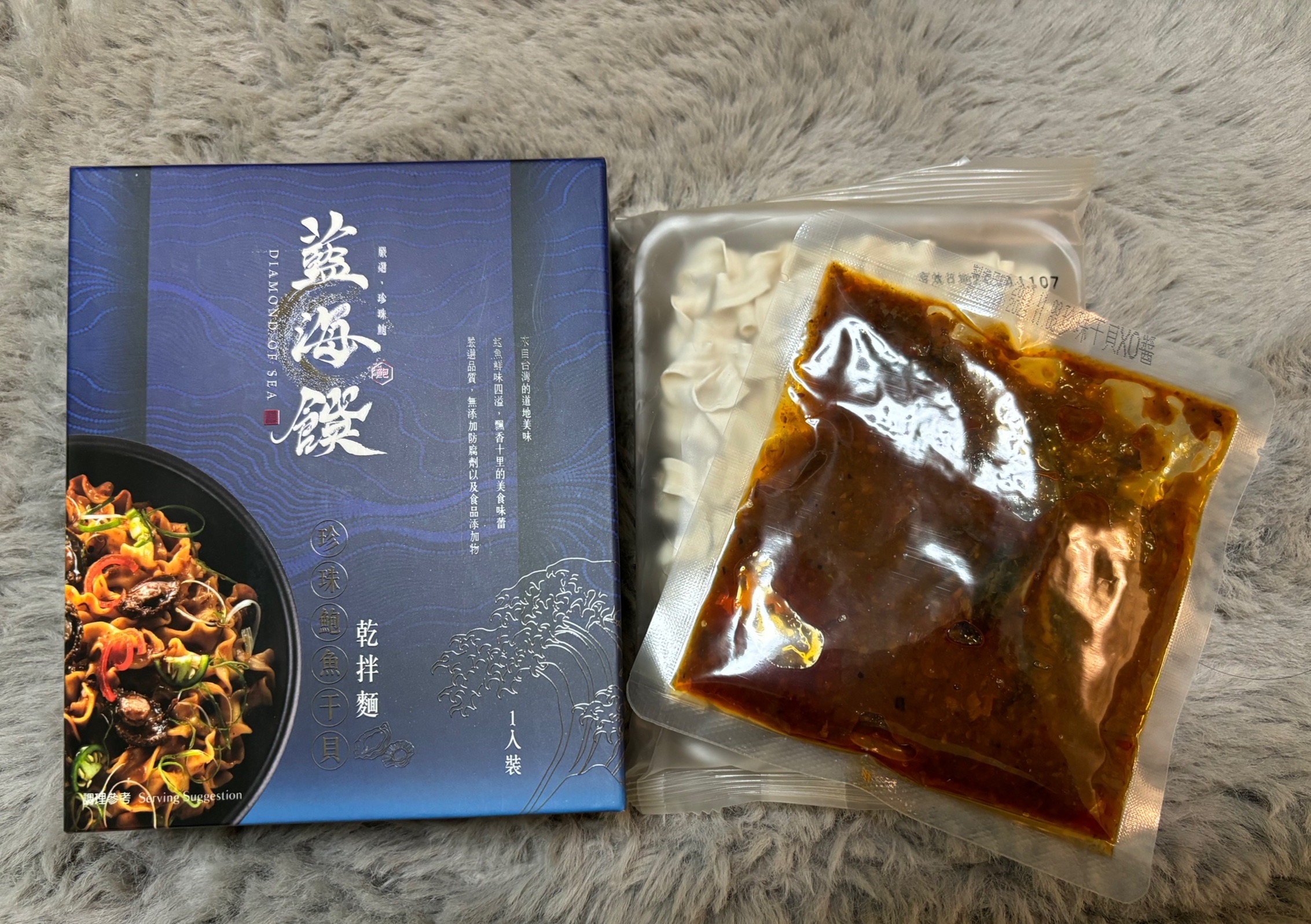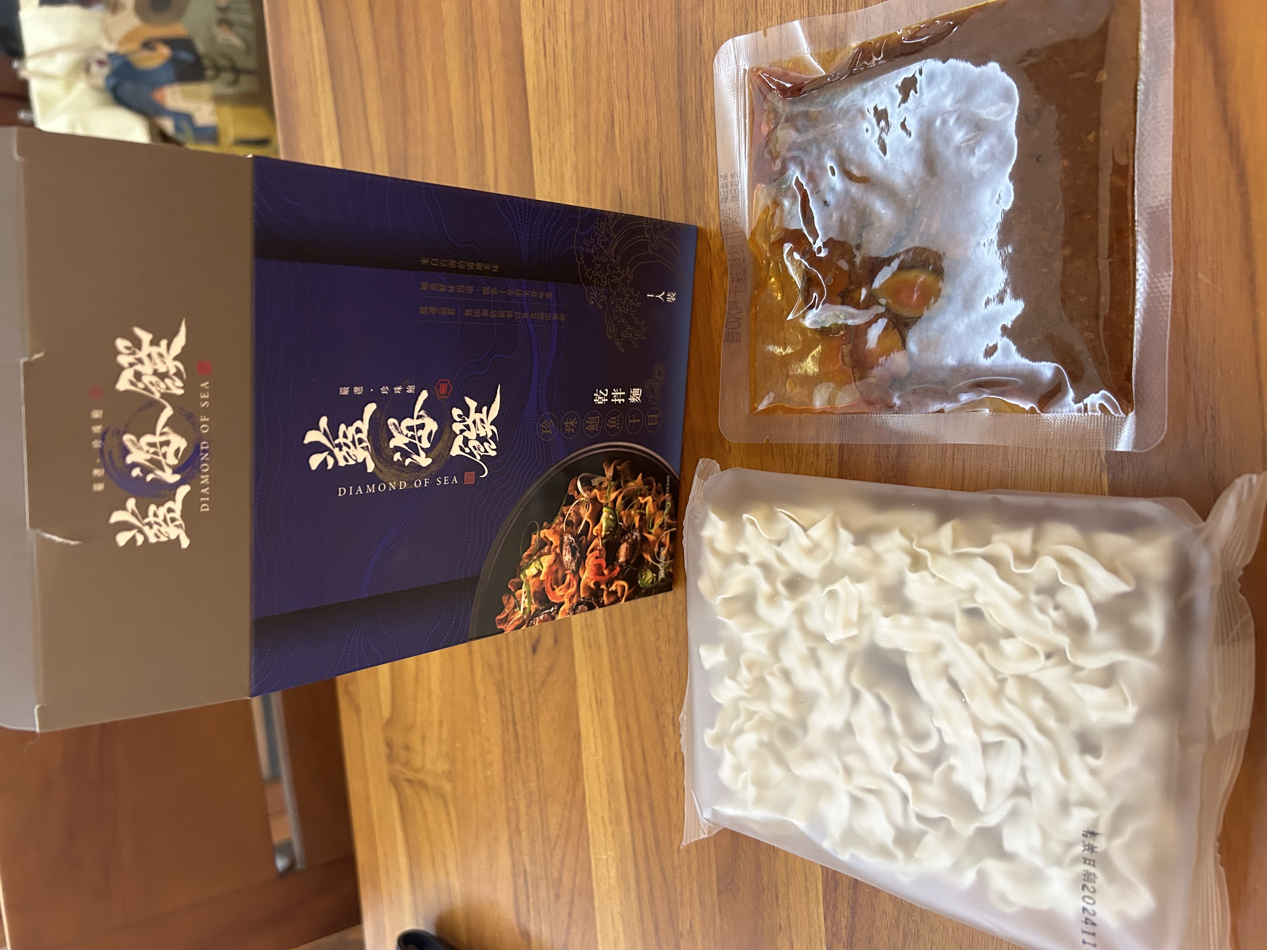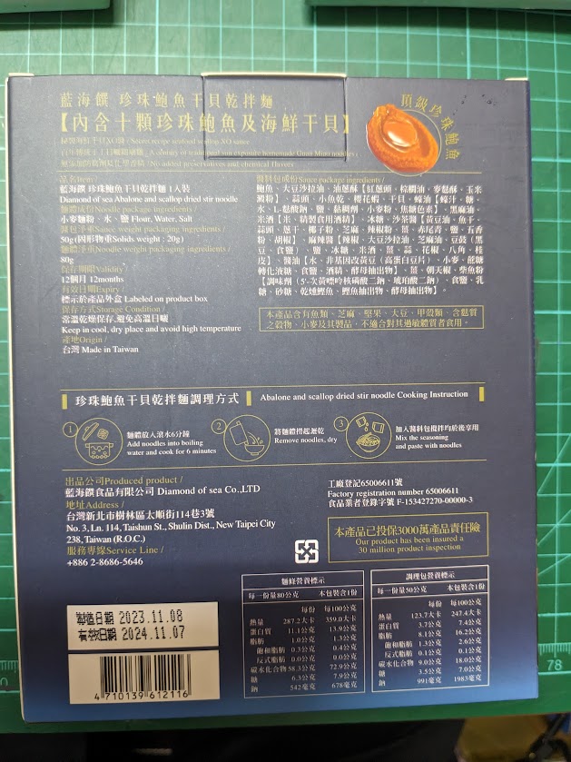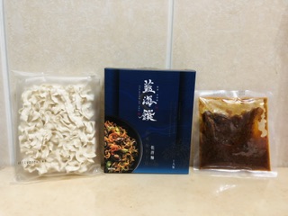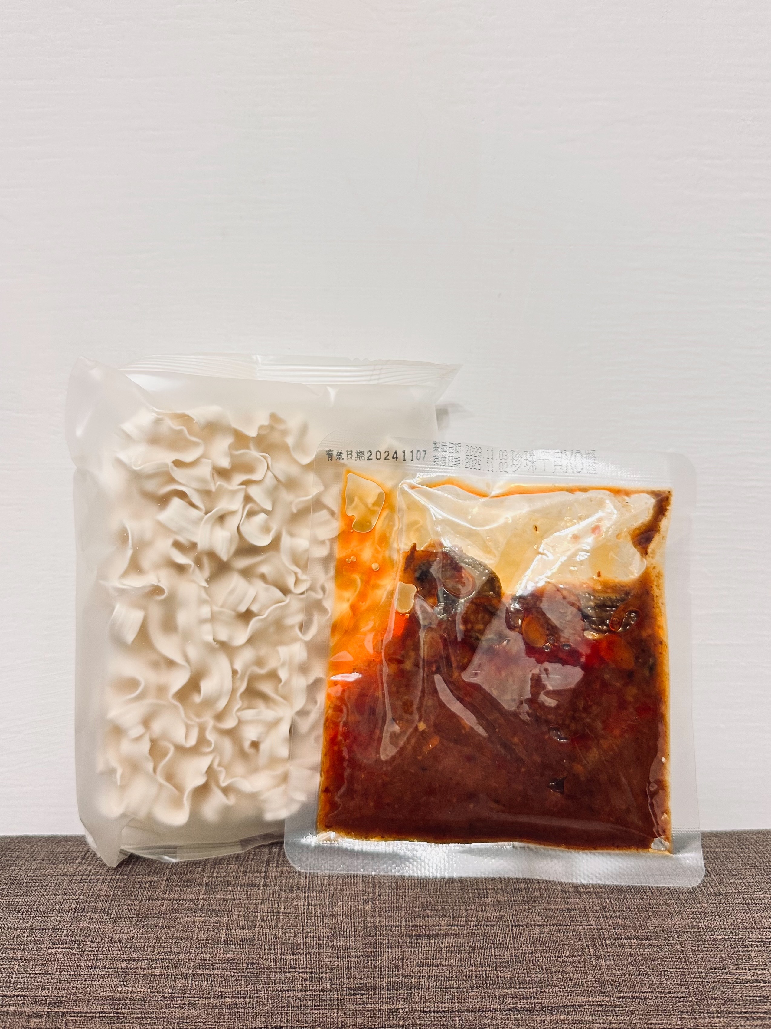 醬包:鮑魚、沙拉油、油蔥酥(紅蔥頭、棕櫚油、麥麩酥、玉米澱粉)、蒜頭、小魚乾、櫻花蝦、蠔油(蠔汁、糖、水、L-麩酸鈉、鹽、黏稠劑、小麥粉、焦糖色素)、黑麻油、米酒(米、精製食用酒精)、珠貝、冰糖、醬油(釀造生醬油(水、非基因改造脫脂黃豆片(原料來源非基因改造黃豆)、小麥、食鹽)、非基因改造脫脂黃豆片胺基酸液、水、轉化液糖(蔗糖、水)、食鹽、著色劑(焦糖色素)、調味劑(DL-蘋果酸)、酵母抽出物、紅麴色素(含酒精)、甜味劑(甘草萃(含糊精、檸檬酸鈉))、麻辣紅油(大豆油、芝麻油、花椒油、辣椒萃取物)、薑、朝天椒、豆瓣醬(水、砂糖、非基因改造黃豆、辣椒、食鹽、純釀造醋)、鮑魚萃取物、干貝萃取物、味精(L-麩酸鈉)、柴魚粉(調味劑(5'-次黃嘌呤核磷酸二鈉、琥珀酸二鈉)、食鹽、乳糖、砂糖、乾燻鰹魚、鰹魚抽出物、酵母抽出物)、麻辣醬(辣椒、大豆沙拉油、豆鼓、鹽、冰糖、素食湯粉(鹽、葡萄糖、素肉精粉、L-麩酸鈉、糖、5'-次黃嘌呤核磷酸二鈉、5'-鳥嘌呤核甘磷酸二鈉、胺基乙酸、DL-胺基丙酸、二氧化矽、檸檬酸)、花椒、八角、桂皮)、水煮醬(大豆油、辣椒、黑豆瓣醬(非基改)、辣椒粉、花椒粉、香油、芝麻、豆鼓、醬油、八角、鹽、米酒、薑、蒜、糖、鮮蔬調味粉(麥芽糊精、鹽、糖、酵母萃取物、高麗菜抽出物、水解植物蛋白、香菇萃取物)、L-麩酸鈉、辣椒抽出物)