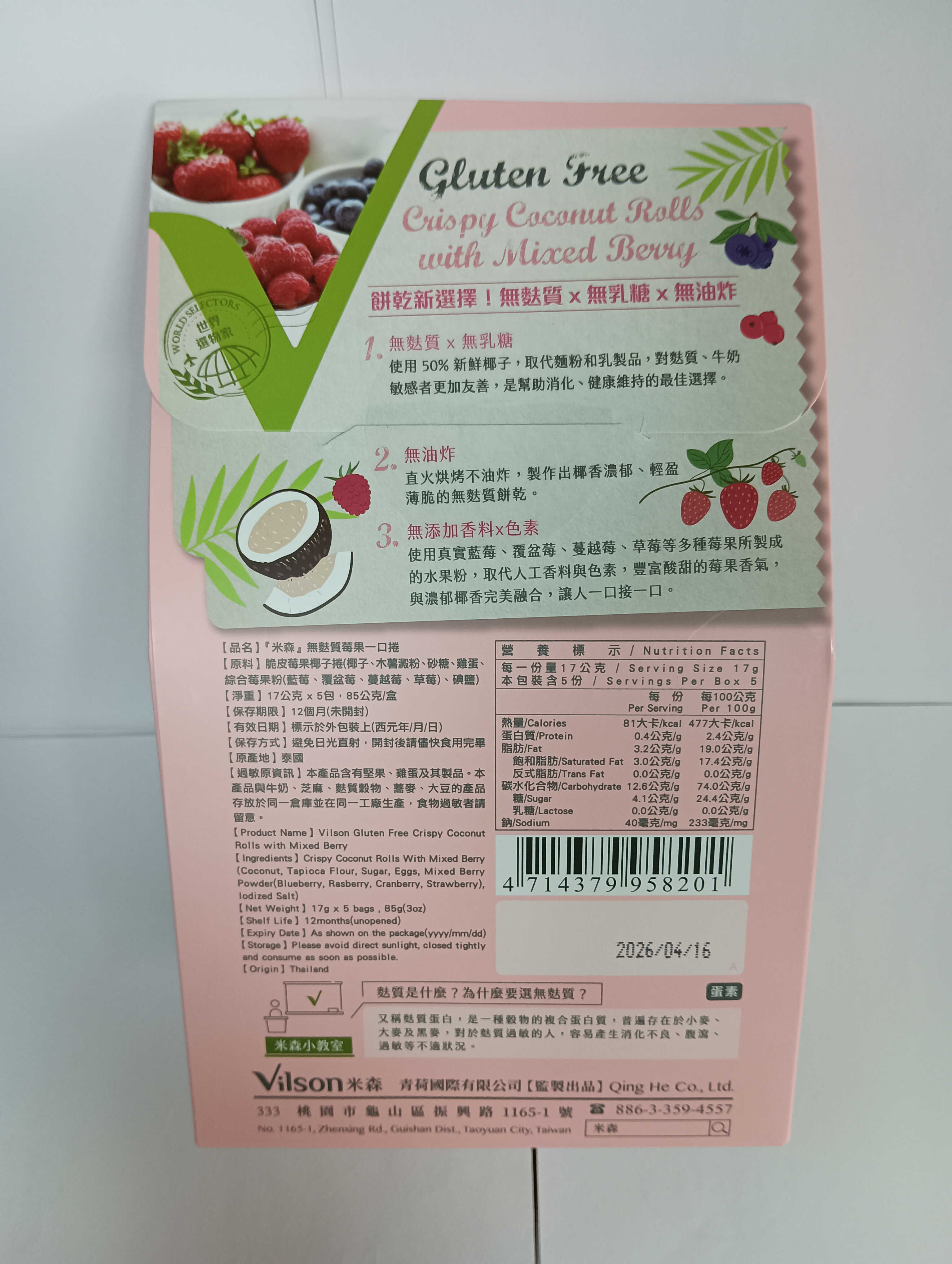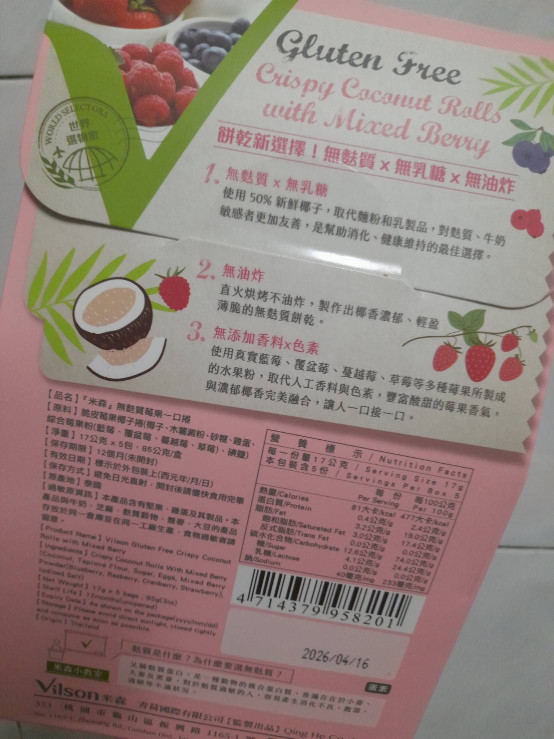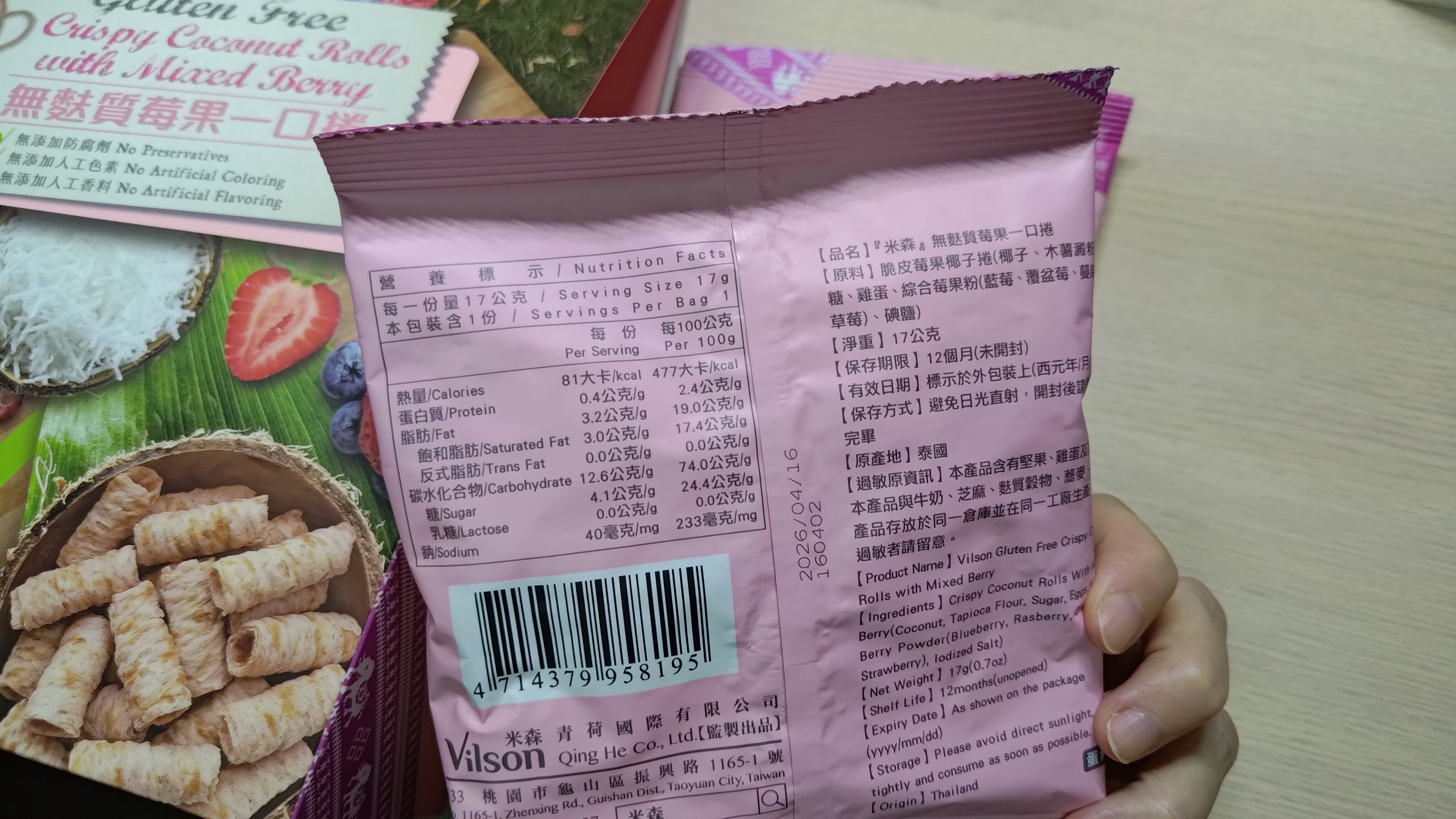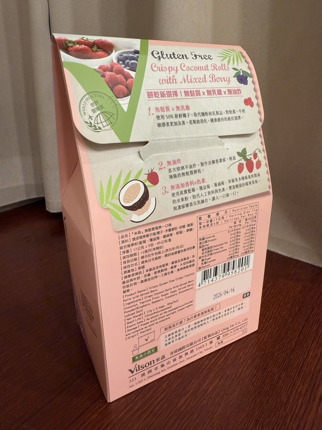 回列表 Vilson米森 無麩質莓果一口捲 舌尖上的輕盈美味提案 所需等級 一般會員以上 所需學分 60 體驗份數 15 關注人數 1293 申請人數 229 申請截止 品牌業者:米森vilson 負責廠商 青荷國際有限公司 廠商地址 桃園市龜山區振興路1165-1號 產地 台灣 試用產品規格 85g 食品業者登錄字號 H-124407269-00000-9 投保產品責任險字號 明台產物保險股份有限公司 0885-13PDT00892 心得分享 商品介紹 商品成分 使用方法 注意事項 體驗名單 9.3 Vilson米森 無麩質莓果一口捲 包裝美學 9.2 整體風味 7.9 酥脆口感 8.1 健康感受 9.3 建議推薦 9.3 心得分享 13則 陳麗婷 鑽石達人 52歲 苗栗縣 2025/10/17 對Vilson米森 無麩質莓果一口捲留下評價 10 Vilson米森 無麩質莓果一口捲 :這款【米森 vilson】無麩質莓果一口捲,口感細膩,莓果香氣濃郁,讓人一口接一口停不下來,適合追求健康與美味的消費者,是健康的小點心首選!像我自己本身就有乳糖不耐,這款專業無麩質(Gluten Free)安心製程,乳糖不耐症也可以輕鬆享用,無添加防腐劑、無添加人工色素香料,專業低溫烘焙,保留口感及營養,香氣濃郁的50%足量椰子,真實綜合莓果粉,適合全家人的好餅乾~~它是以香氣濃郁的50%足量椰子為基底,搭配真實綜合莓果粉,經過多次配方調整,設計出完美一口不掉屑的尺寸,全程無添加人工香料、色素及甜味劑,無乳糖,打造出口感與營養兼具,以便利隨手包,每一口都是停不下來的雙重享受!Vilson米森無麩質莓果一口捲~~原料很單純:椰子、木薯澱粉、砂糖、雞蛋、綜合莓果粉(藍莓、覆盆莓、蔓越莓、草莓)、碘鹽~~這次體驗唯一美中不足的是,一口捲容易碎,而且一袋只有5包,雖然獨立包裝,但份量好小啊~~哈哈~每一小袋裡面約8~9根不等的一口捲,口感細緻,真的蠻好吃的~~雖然份量很空虛,可是它是好吃的哦~無添加無負擔的健康零嘴~~ 張若君 鑽石達人 57歲 新北市 2025/10/18 對Vilson米森 無麩質莓果一口捲留下評價 10 真的對米森這一款無麩質莓果一口捲感到驚艷。首先是外包裝相當的吸睛,有產品的實質照片,讓人了解內容物的樣貌,其次是產品名辨識度高,且於包装上直接列出其無防腐劑、無人工色素、無人工香料等特色,讓消費者於外包裝就清楚明白自己選購的是何種產品。內含5包獨立包装,只是一口捲的圖片換成了椰絲,也讓人期待吃到產品時的風味。實際試吃之後的等一感覺是「哇!也太好吃了」。稍稍偏硬的酥脆口感,不會咬不動,卻可以享受咀嚼的快感。再來是幾種味道的層層堆疊,莓果的香氣伴隨著濃郁的椰香,每一口咀嚼都是享受。而且除了無色素、無香料、無防腐劑,更無麩質,可說是適合一家大小安心食用的好商品,值得推薦。 Jessica Su 鑽石達人 40歲 雲林縣 2025/10/20 對Vilson米森 無麩質莓果一口捲留下評價 10 感謝食力食驗室這次提供寶貴的機會體驗"Vilson米森 無麩質莓果一口捲"這次體驗的產品主打 "湖鹽黑芝麻糕 入口越嚼越香"推薦"Vilson米森 無麩質莓果一口捲"的理由1.產品成分單純,沒想到不加香料的產品也能這麼好吃!!!椰子含量佔了50%!!整體椰奶香氣十足,融合了莓果的自然酸甜香氣,沒想到椰奶產品居然能如此清爽順口不甜膩~2.產品主打無麩質、乳糖不耐症的人也能吃~給家人小孩吃也安心,讓人感覺吃了無負擔3.收到試吃包的時候看到單包沒有膨膨的,心裡覺得裡面的餅乾應該都碎裂了,沒想到打開時居然根根都完好的!!產品硬度做的很剛好~比一般捲心酥稍硬一點,不但耐得住碰撞咬起來也很過癮~希望改善的地方~1.這次的心得評分系統有點怪~零食餅乾居然要評分湯頭風味跟雞肉口感? 是在測試有沒有在看題目嗎~? 這個產品很好吃~希望不會影響到產品的總評價~感謝食力食驗室提供這次體驗機會,希望下次還能有機會體驗其他產品~~ 吳采樺 金食達人 34歲 高雄市 2025/10/20 對Vilson米森 無麩質莓果一口捲留下評價 10 這款「Vilson 米森無麩質莓果一口捲」是一款適合追求健康飲食與無麩質需求者的點心。外型小巧可愛,一口剛好,方便入口且不易掉屑,十分適合辦公室或旅行攜帶。打開包裝後,有淡淡的莓果香氣撲鼻,不會過於濃烈,吃起來自然清爽。餅乾的口感酥脆,不硬也不油膩,咬下去有輕盈的鬆脆感。甜度中等適合搭配無糖茶或黑咖啡一起食用,能夠平衡口中的甜感。由於採用椰子與木薯澱粉製作,口感與一般麵粉餅乾略有不同,少了些許麵香,但多了一種獨特的輕盈感。整體而言,是一款適合對麩質過敏、乳糖不耐或在意食品添加物的消費者選擇的健康零食,但若偏好濃郁口味者可能會覺得風味稍淡。 陳昭安 鑽石達人 34歲 雲林縣 2025/10/20 對Vilson米森 無麩質莓果一口捲留下評價 10 *首先謝謝食力和米森vilson,很高興可以抽中Vilson米森 無麩質莓果一口捲試吃活動。*這次收到一盒內有5包無麩質莓果一口捲小包裝入,素食者可食用。*商品有明確標示商品的成分及營養成分及使用方法。*食用心得:*餅乾小包裝,方便攜帶。*主打無麩質安心製成,讓乳糖不耐症的人都可食用。*外包裝,有標示「無添加防腐劑」,「無添加人工色素」及「無添加人工香料」,無油炸,外包裝顯示註明,讓人選擇安心,很讚。*口味素食,成分很單純。*口味微甜但不會太甜,小段小段的好拿取,餅乾酥脆卡滋卡滋,每一口的椰香和莓果香讓人一口接一口,然後椰香不會有死甜味,吃起來還不錯。*總結,健康的餅乾,小包裝好攜帶,推薦給大家