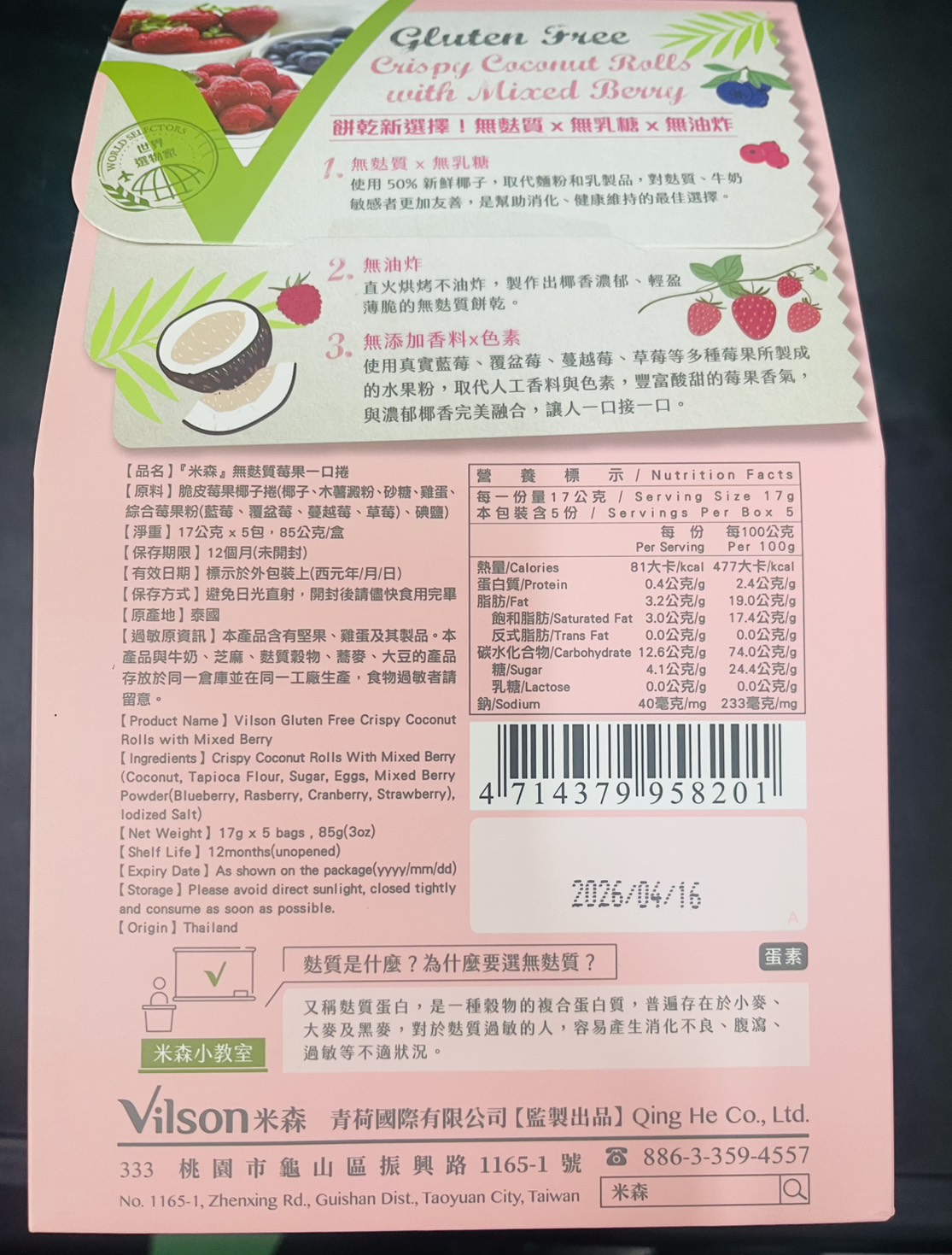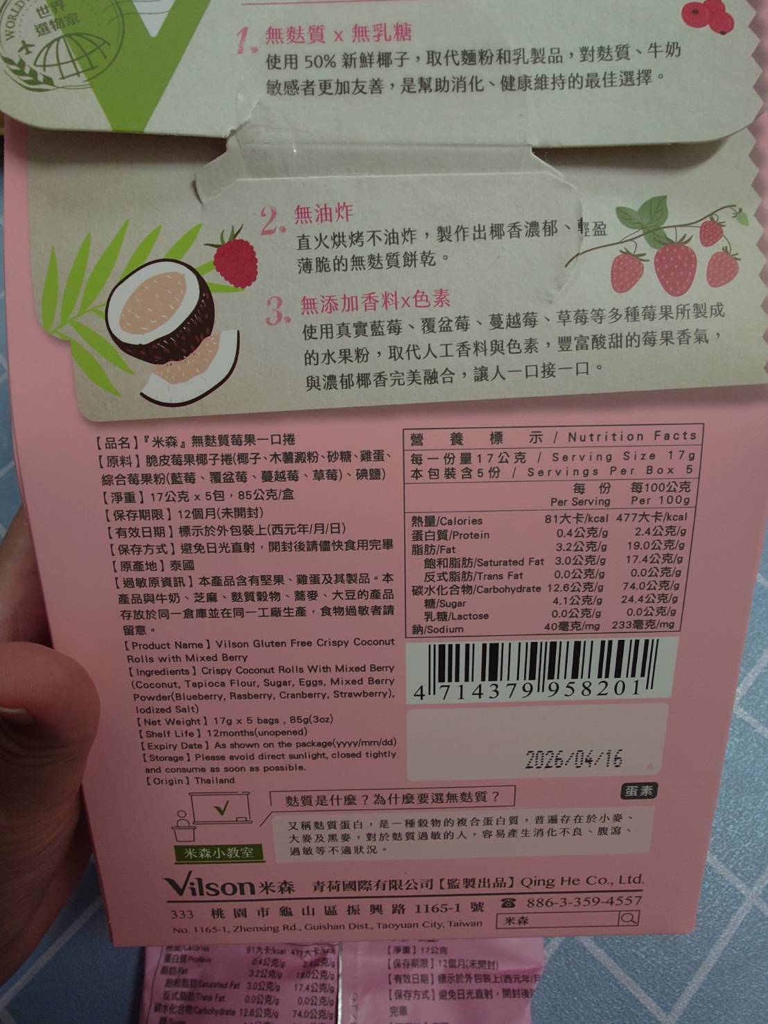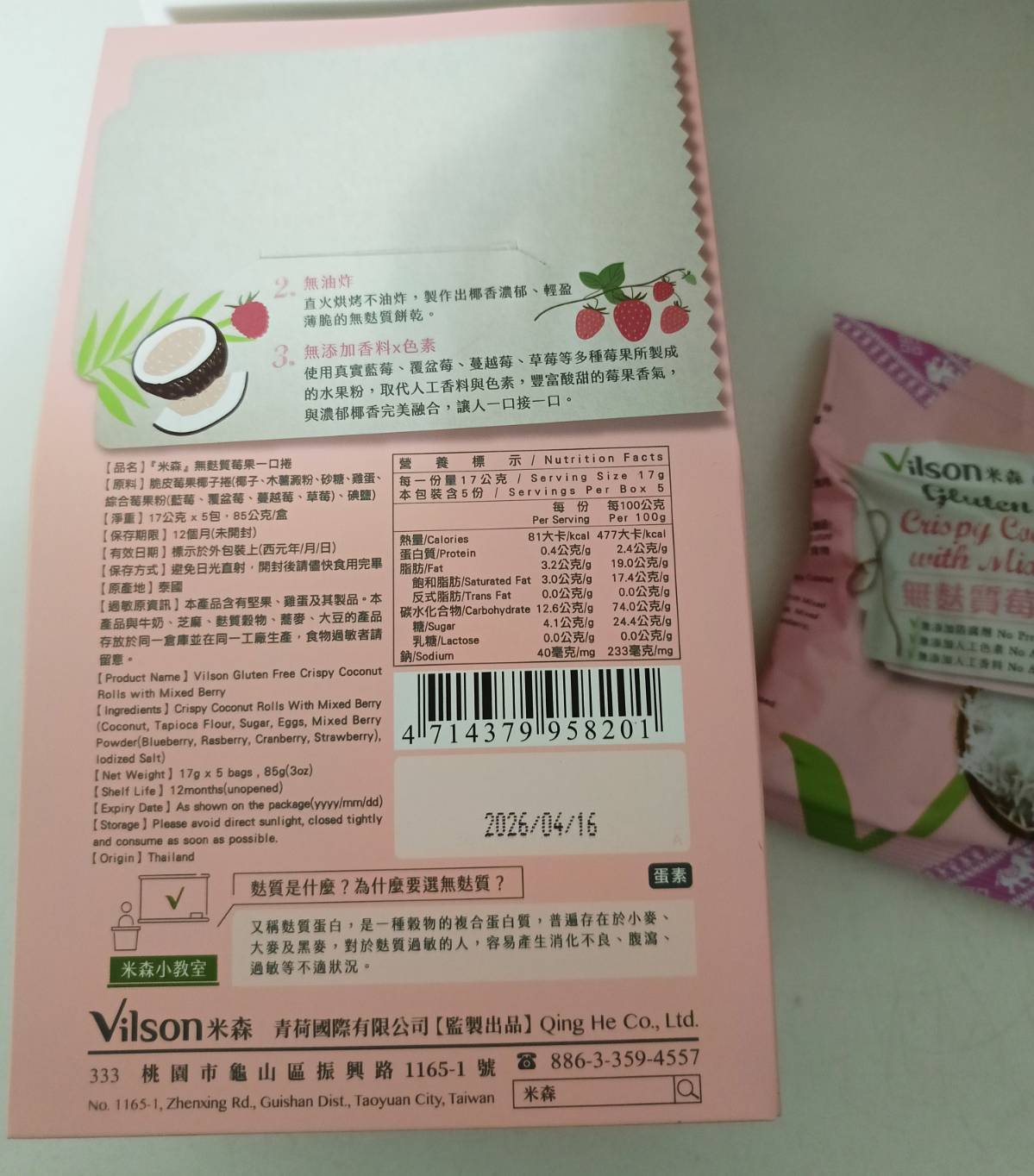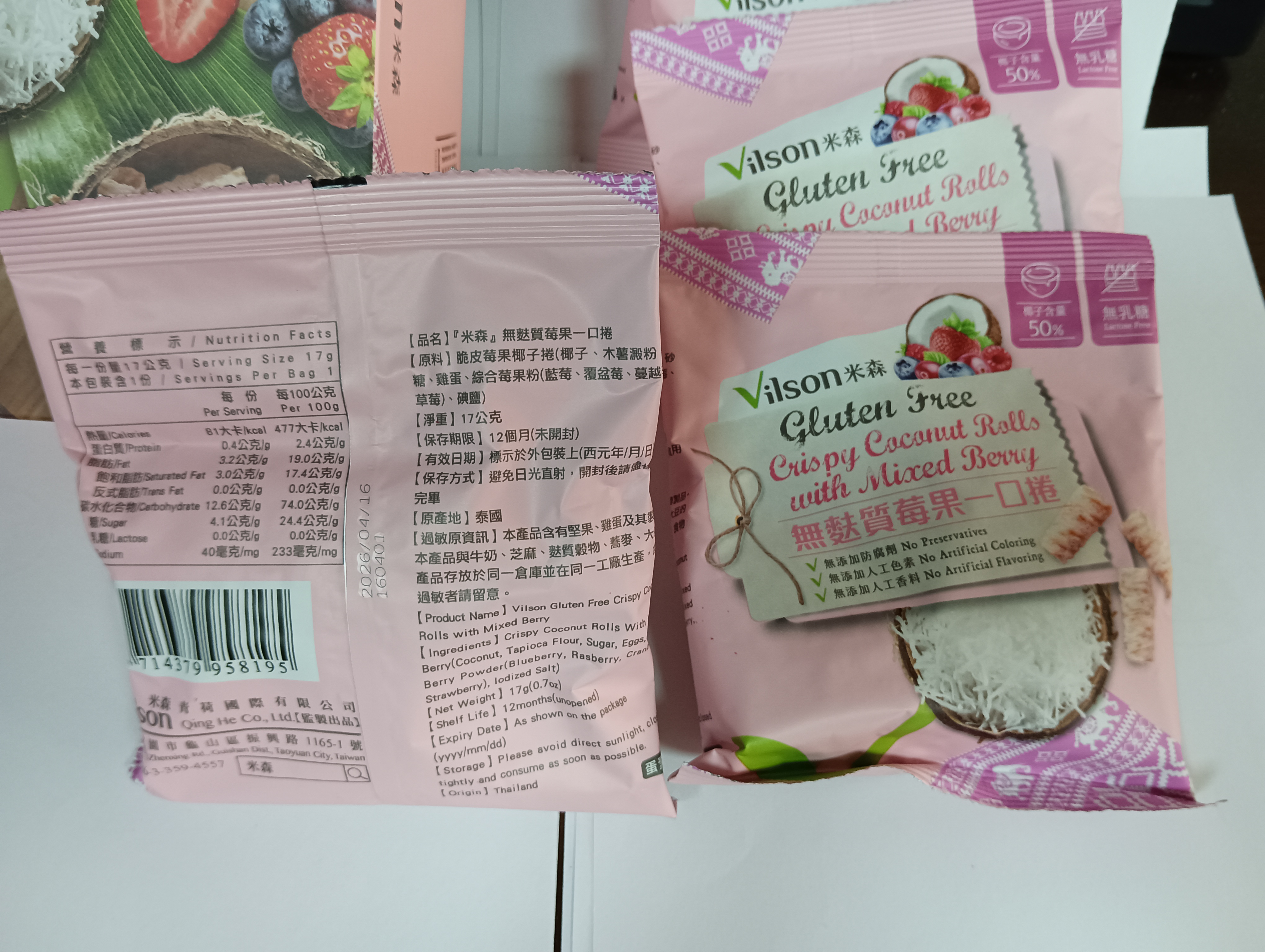 回列表 Vilson米森 無麩質莓果一口捲 舌尖上的輕盈美味提案 所需等級 一般會員以上 所需學分 60 體驗份數 15 關注人數 1293 申請人數 229 申請截止 品牌業者:米森vilson 負責廠商 青荷國際有限公司 廠商地址 桃園市龜山區振興路1165-1號 產地 台灣 試用產品規格 85g 食品業者登錄字號 H-124407269-00000-9 投保產品責任險字號 明台產物保險股份有限公司 0885-13PDT00892 心得分享 商品介紹 商品成分 使用方法 注意事項 體驗名單 9.3 Vilson米森 無麩質莓果一口捲 包裝美學 9.2 整體風味 7.9 酥脆口感 8.1 健康感受 9.3 建議推薦 9.3 心得分享 13則 陳麗婷 鑽石達人 52歲 苗栗縣 2025/10/17 對Vilson米森 無麩質莓果一口捲留下評價 10 Vilson米森 無麩質莓果一口捲 :這款【米森 vilson】無麩質莓果一口捲,口感細膩,莓果香氣濃郁,讓人一口接一口停不下來,適合追求健康與美味的消費者,是健康的小點心首選!像我自己本身就有乳糖不耐,這款專業無麩質(Gluten Free)安心製程,乳糖不耐症也可以輕鬆享用,無添加防腐劑、無添加人工色素香料,專業低溫烘焙,保留口感及營養,香氣濃郁的50%足量椰子,真實綜合莓果粉,適合全家人的好餅乾~~它是以香氣濃郁的50%足量椰子為基底,搭配真實綜合莓果粉,經過多次配方調整,設計出完美一口不掉屑的尺寸,全程無添加人工香料、色素及甜味劑,無乳糖,打造出口感與營養兼具,以便利隨手包,每一口都是停不下來的雙重享受!Vilson米森無麩質莓果一口捲~~原料很單純:椰子、木薯澱粉、砂糖、雞蛋、綜合莓果粉(藍莓、覆盆莓、蔓越莓、草莓)、碘鹽~~這次體驗唯一美中不足的是,一口捲容易碎,而且一袋只有5包,雖然獨立包裝,但份量好小啊~~哈哈~每一小袋裡面約8~9根不等的一口捲,口感細緻,真的蠻好吃的~~雖然份量很空虛,可是它是好吃的哦~無添加無負擔的健康零嘴~~ 張若君 鑽石達人 57歲 新北市 2025/10/18 對Vilson米森 無麩質莓果一口捲留下評價 10 真的對米森這一款無麩質莓果一口捲感到驚艷。首先是外包裝相當的吸睛,有產品的實質照片,讓人了解內容物的樣貌,其次是產品名辨識度高,且於包装上直接列出其無防腐劑、無人工色素、無人工香料等特色,讓消費者於外包裝就清楚明白自己選購的是何種產品。內含5包獨立包装,只是一口捲的圖片換成了椰絲,也讓人期待吃到產品時的風味。實際試吃之後的等一感覺是「哇!也太好吃了」。稍稍偏硬的酥脆口感,不會咬不動,卻可以享受咀嚼的快感。再來是幾種味道的層層堆疊,莓果的香氣伴隨著濃郁的椰香,每一口咀嚼都是享受。而且除了無色素、無香料、無防腐劑,更無麩質,可說是適合一家大小安心食用的好商品,值得推薦。 Jessica Su 鑽石達人 40歲 雲林縣 2025/10/20 對Vilson米森 無麩質莓果一口捲留下評價 10 感謝食力食驗室這次提供寶貴的機會體驗"Vilson米森 無麩質莓果一口捲"這次體驗的產品主打 "湖鹽黑芝麻糕 入口越嚼越香"推薦"Vilson米森 無麩質莓果一口捲"的理由1.產品成分單純,沒想到不加香料的產品也能這麼好吃!!!椰子含量佔了50%!!整體椰奶香氣十足,融合了莓果的自然酸甜香氣,沒想到椰奶產品居然能如此清爽順口不甜膩~2.產品主打無麩質、乳糖不耐症的人也能吃~給家人小孩吃也安心,讓人感覺吃了無負擔3.收到試吃包的時候看到單包沒有膨膨的,心裡覺得裡面的餅乾應該都碎裂了,沒想到打開時居然根根都完好的!!產品硬度做的很剛好~比一般捲心酥稍硬一點,不但耐得住碰撞咬起來也很過癮~希望改善的地方~1.這次的心得評分系統有點怪~零食餅乾居然要評分湯頭風味跟雞肉口感? 是在測試有沒有在看題目嗎~? 這個產品很好吃~希望不會影響到產品的總評價~感謝食力食驗室提供這次體驗機會,希望下次還能有機會體驗其他產品~~ 吳采樺 金食達人 34歲 高雄市 2025/10/20 對Vilson米森 無麩質莓果一口捲留下評價 10 這款「Vilson 米森無麩質莓果一口捲」是一款適合追求健康飲食與無麩質需求者的點心。外型小巧可愛,一口剛好,方便入口且不易掉屑,十分適合辦公室或旅行攜帶。打開包裝後,有淡淡的莓果香氣撲鼻,不會過於濃烈,吃起來自然清爽。餅乾的口感酥脆,不硬也不油膩,咬下去有輕盈的鬆脆感。甜度中等適合搭配無糖茶或黑咖啡一起食用,能夠平衡口中的甜感。由於採用椰子與木薯澱粉製作,口感與一般麵粉餅乾略有不同,少了些許麵香,但多了一種獨特的輕盈感。整體而言,是一款適合對麩質過敏、乳糖不耐或在意食品添加物的消費者選擇的健康零食,但若偏好濃郁口味者可能會覺得風味稍淡。 陳昭安 鑽石達人 34歲 雲林縣 2025/10/20 對Vilson米森 無麩質莓果一口捲留下評價 10 *首先謝謝食力和米森vilson,很高興可以抽中Vilson米森 無麩質莓果一口捲試吃活動。*這次收到一盒內有5包無麩質莓果一口捲小包裝入,素食者可食用。*商品有明確標示商品的成分及營養成分及使用方法。*食用心得:*餅乾小包裝,方便攜帶。*主打無麩質安心製成,讓乳糖不耐症的人都可食用。*外包裝,有標示「無添加防腐劑」,「無添加人工色素」及「無添加人工香料」,無油炸,外包裝顯示註明,讓人選擇安心,很讚。*口味素食,成分很單純。*口味微甜但不會太甜,小段小段的好拿取,餅乾酥脆卡滋卡滋,每一口的椰香和莓果香讓人一口接一口,然後椰香不會有死甜味,吃起來還不錯。*總結,健康的餅乾,小包裝好攜帶,推薦給大家