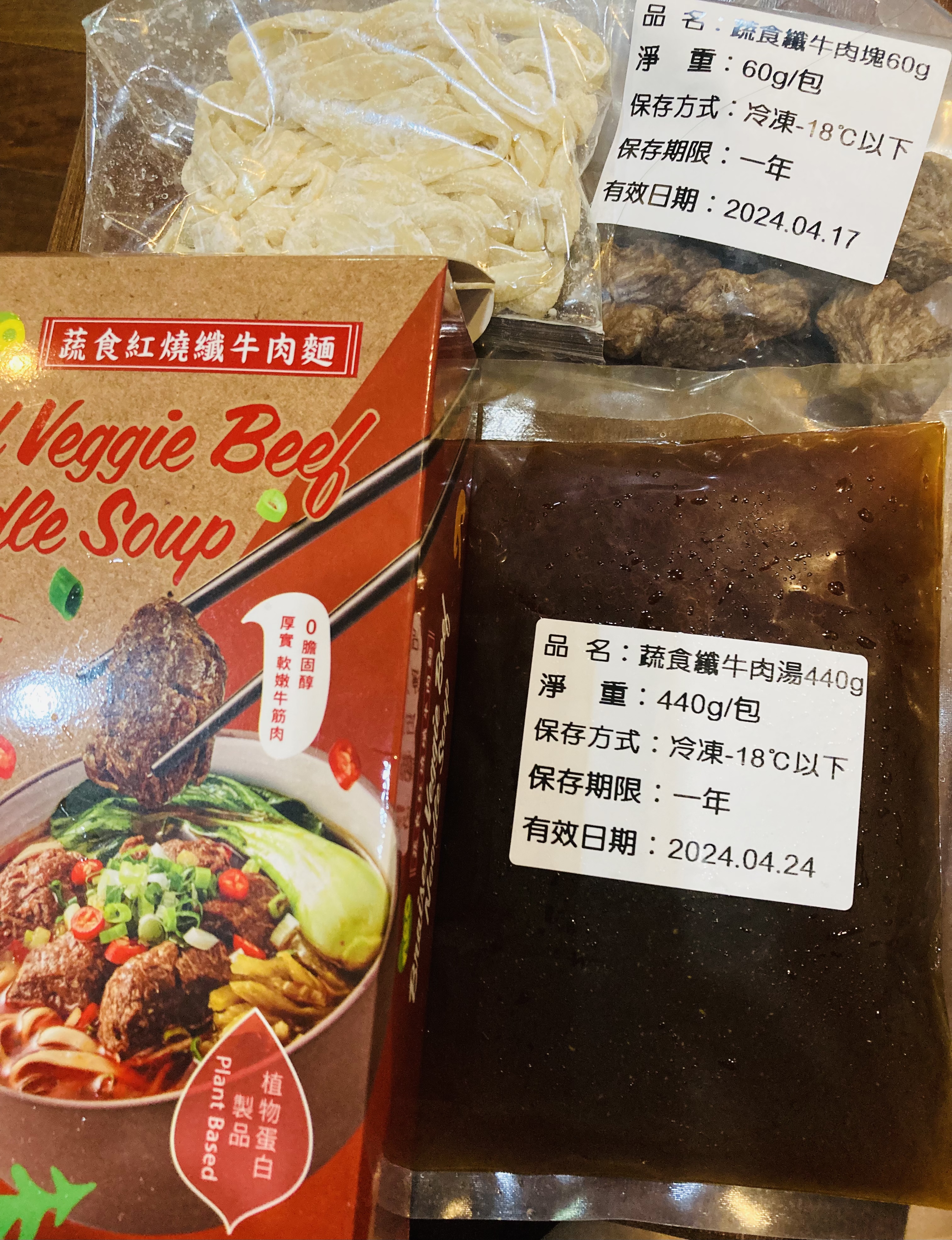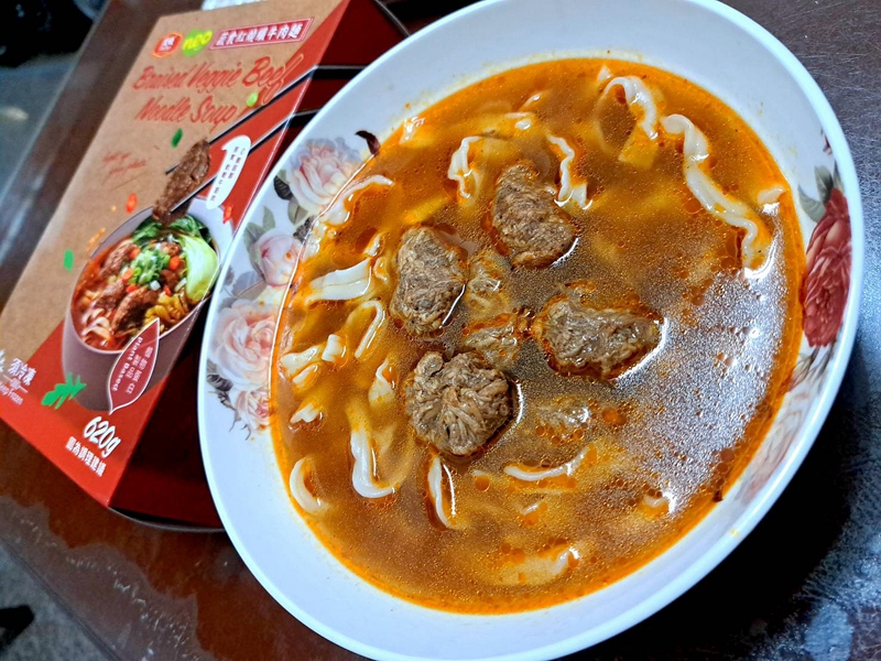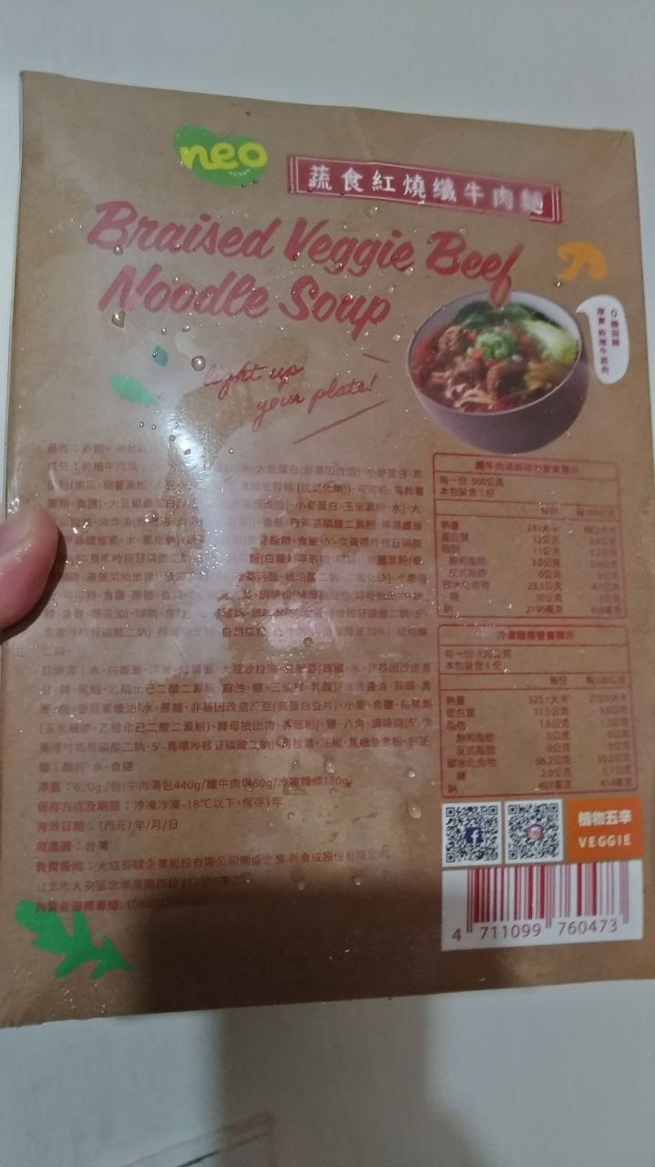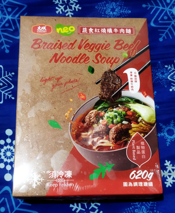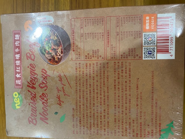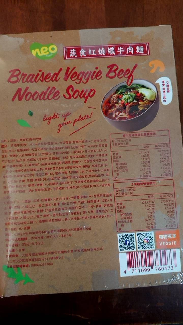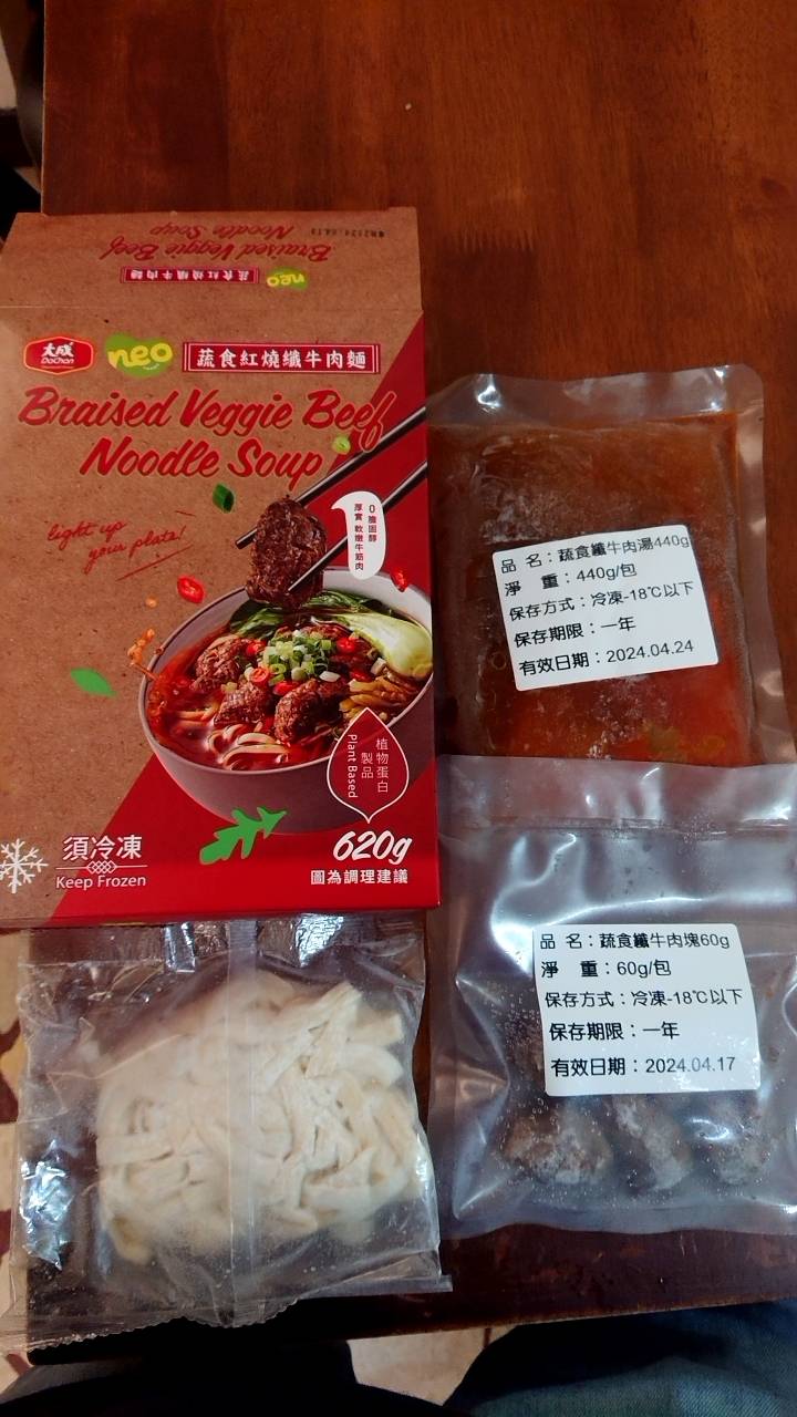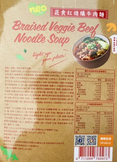 *紅燒湯:水、白蘿蔔、洋蔥、紅蘿蔔、大豆沙拉油、豆瓣醬[辣椒、水、非基因改造黃豆、鹽、蔗糖、乙醯化己二酸二澱粉、麻油、糖、三仙膠、乳酸]、釀造醬油、蒜頭、青蔥、香菇素蠔油[水、蔗糖、非基因改造黃豆(高蛋白豆片)、小麥、食鹽、黏稠劑(玉米糖膠、乙醯化己二酸二澱粉)、酵母抽出物、香菇粉]、鹽、八角、調味劑(5'-次黃嘌呤核苷磷酸二鈉、5'-鳥嘌呤核苷磷酸二鈉)、月桂葉、花椒、焦糖色素粉、白芷
