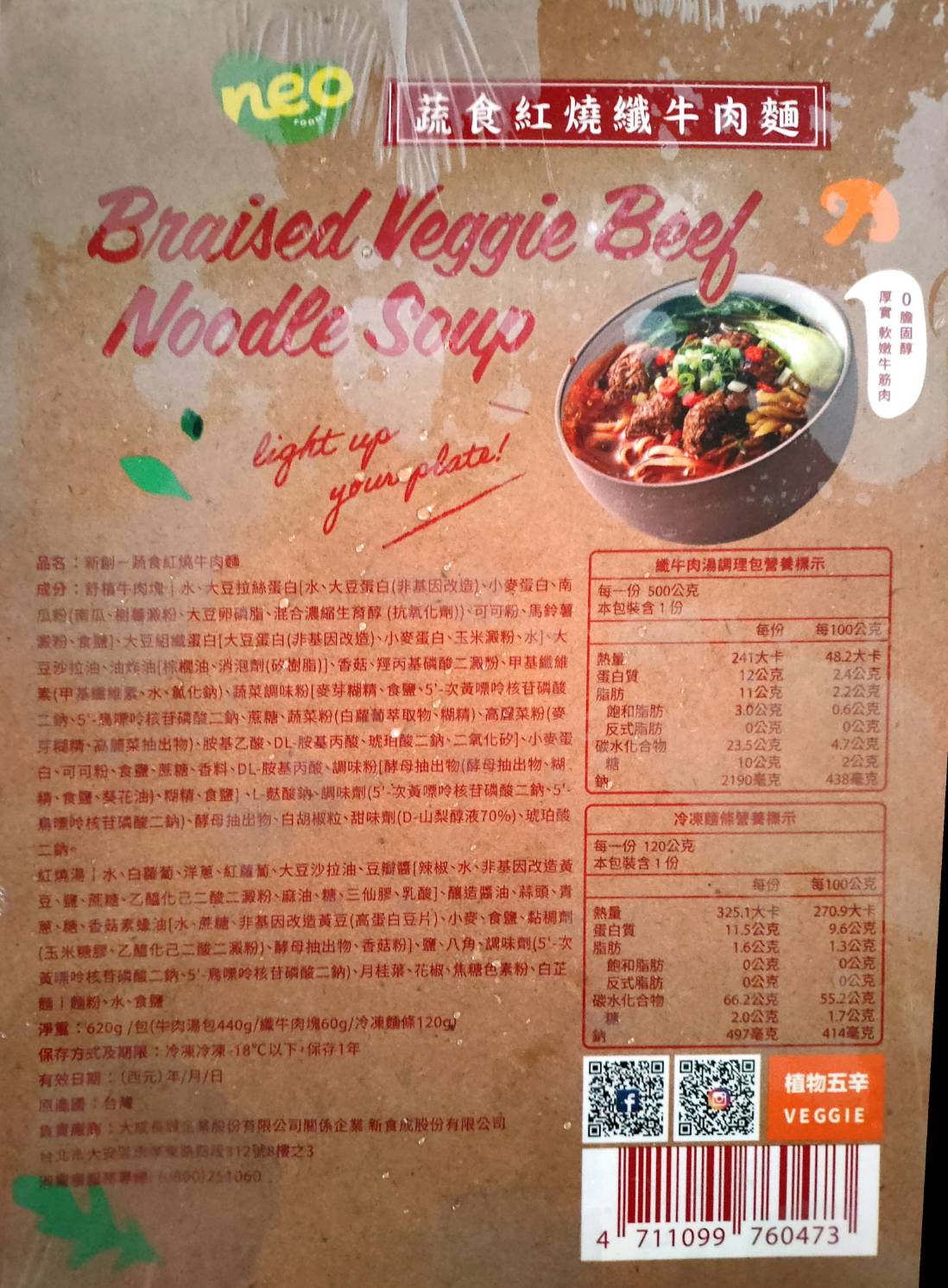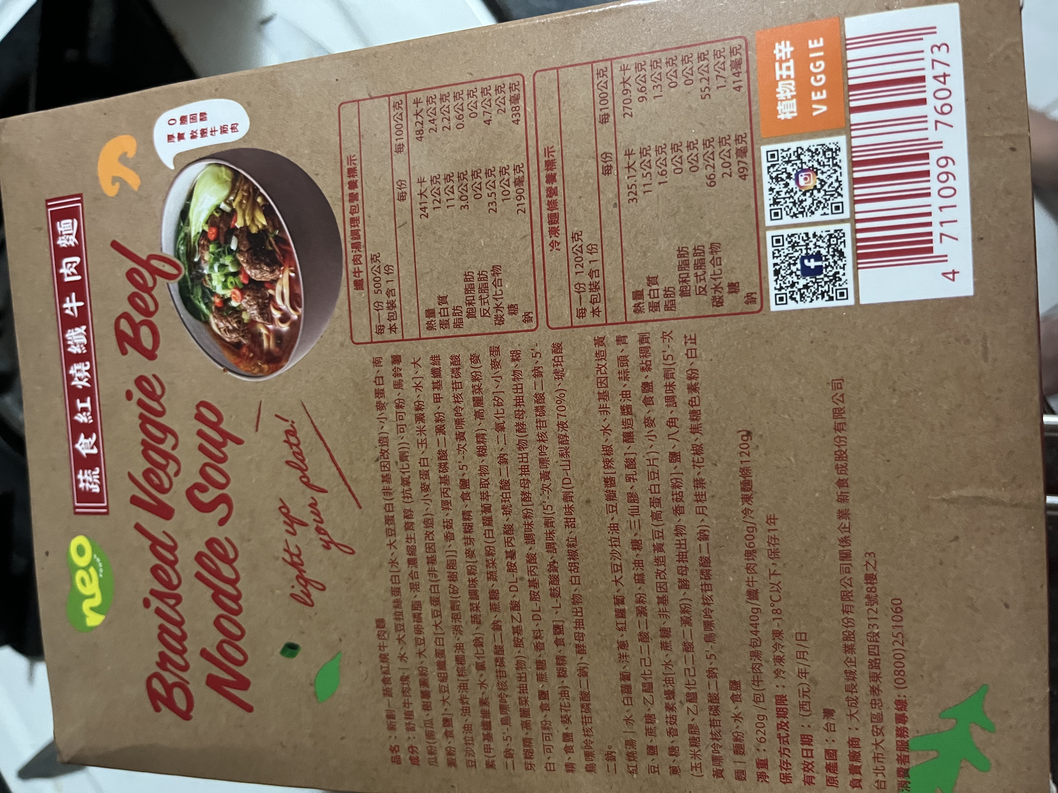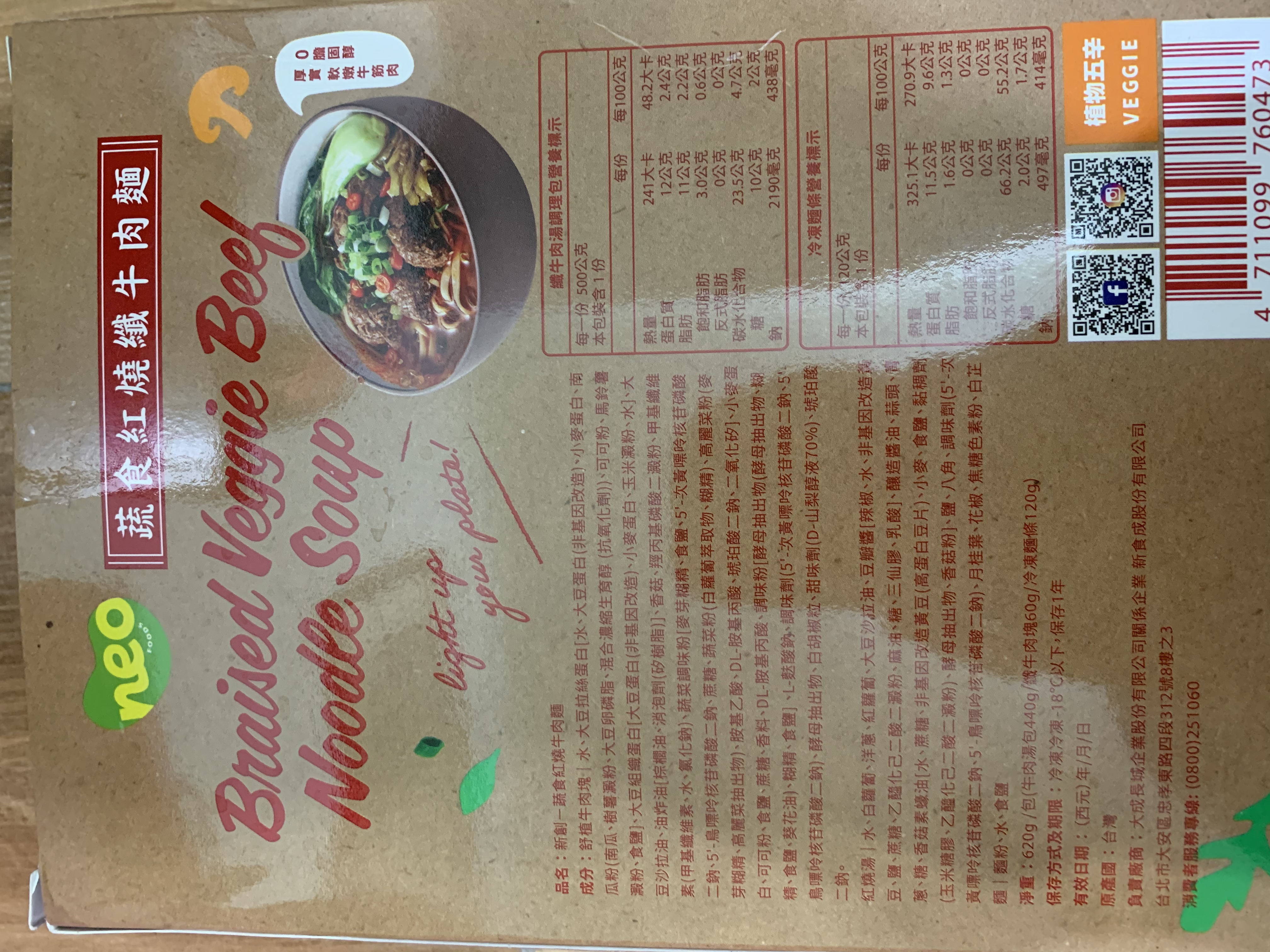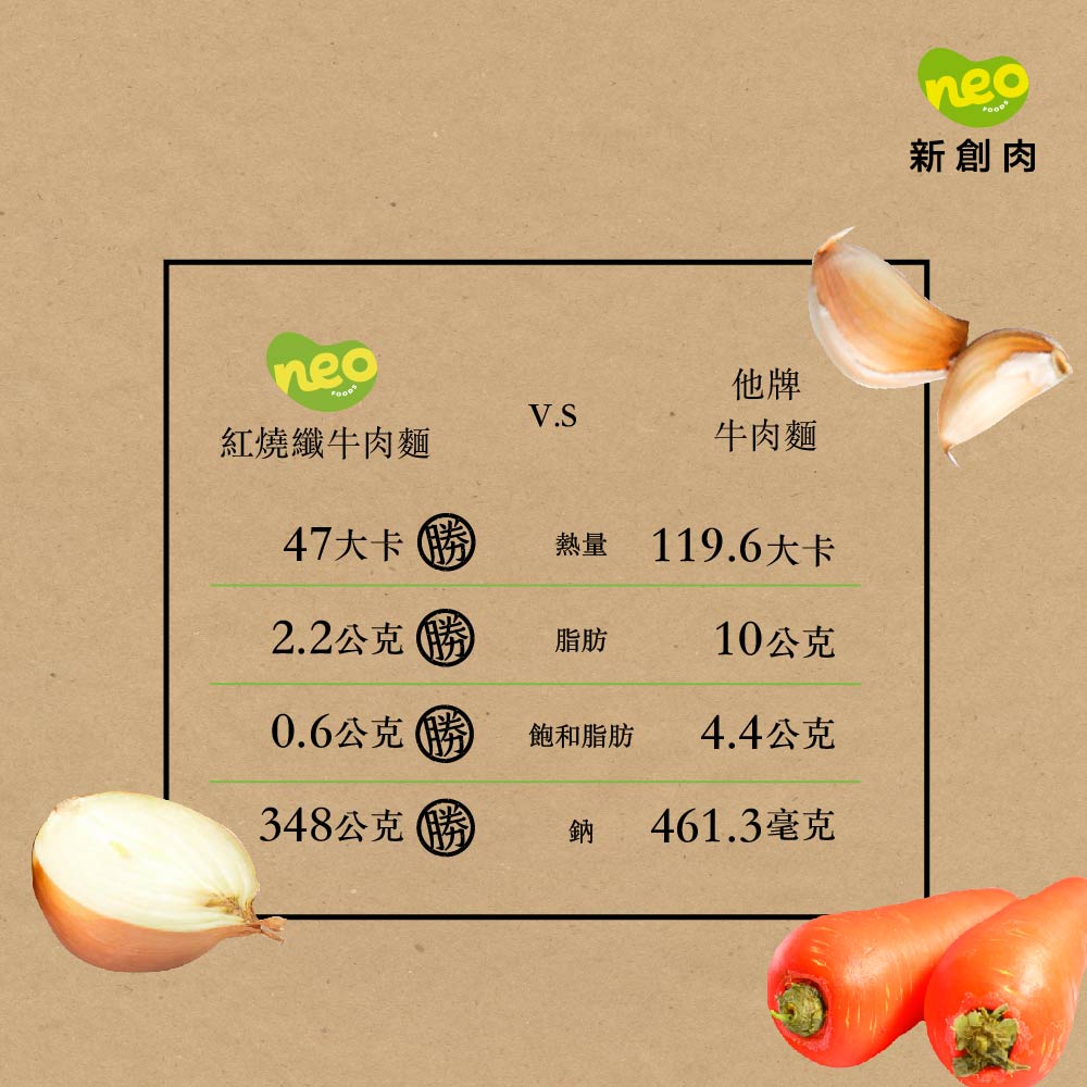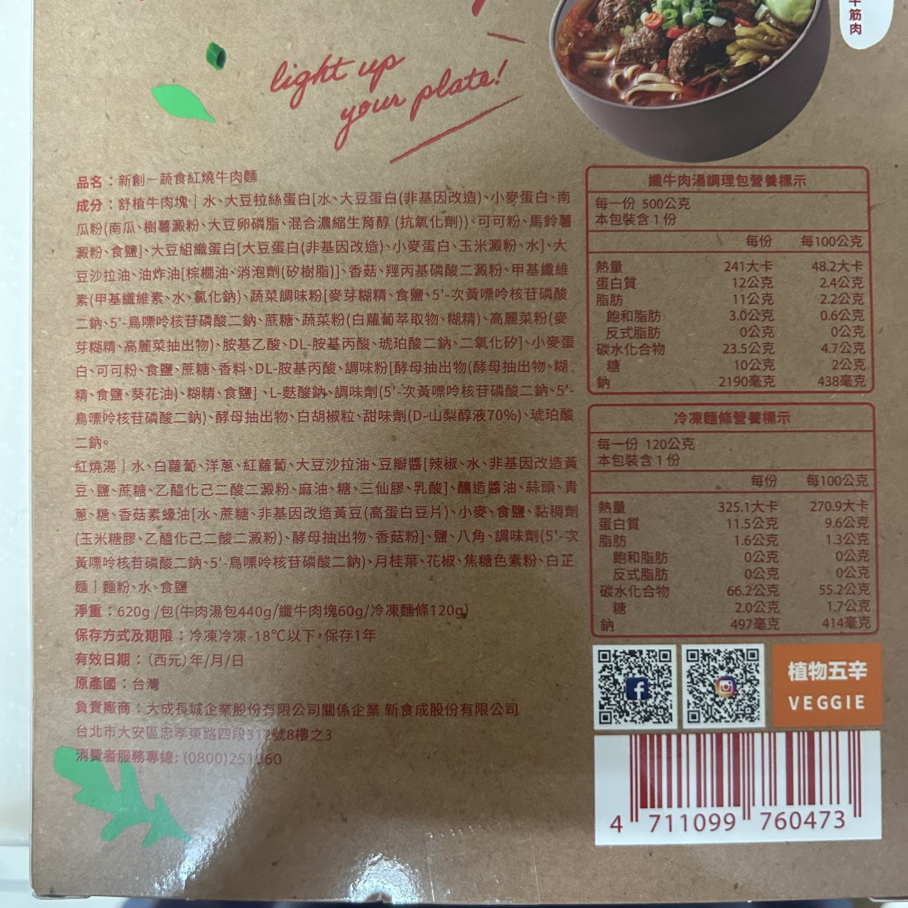 *紅燒湯:水、白蘿蔔、洋蔥、紅蘿蔔、大豆沙拉油、豆瓣醬[辣椒、水、非基因改造黃豆、鹽、蔗糖、乙醯化己二酸二澱粉、麻油、糖、三仙膠、乳酸]、釀造醬油、蒜頭、青蔥、香菇素蠔油[水、蔗糖、非基因改造黃豆(高蛋白豆片)、小麥、食鹽、黏稠劑(玉米糖膠、乙醯化己二酸二澱粉)、酵母抽出物、香菇粉]、鹽、八角、調味劑(5'-次黃嘌呤核苷磷酸二鈉、5'-鳥嘌呤核苷磷酸二鈉)、月桂葉、花椒、焦糖色素粉、白芷