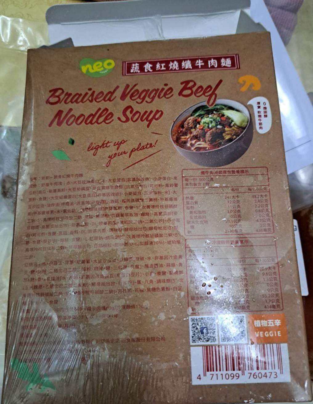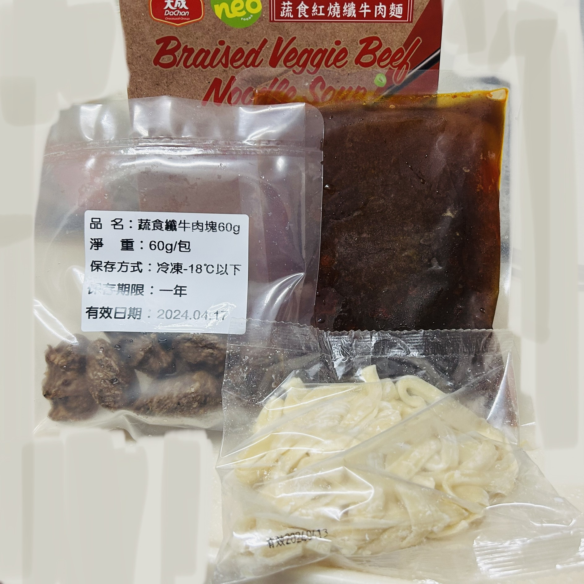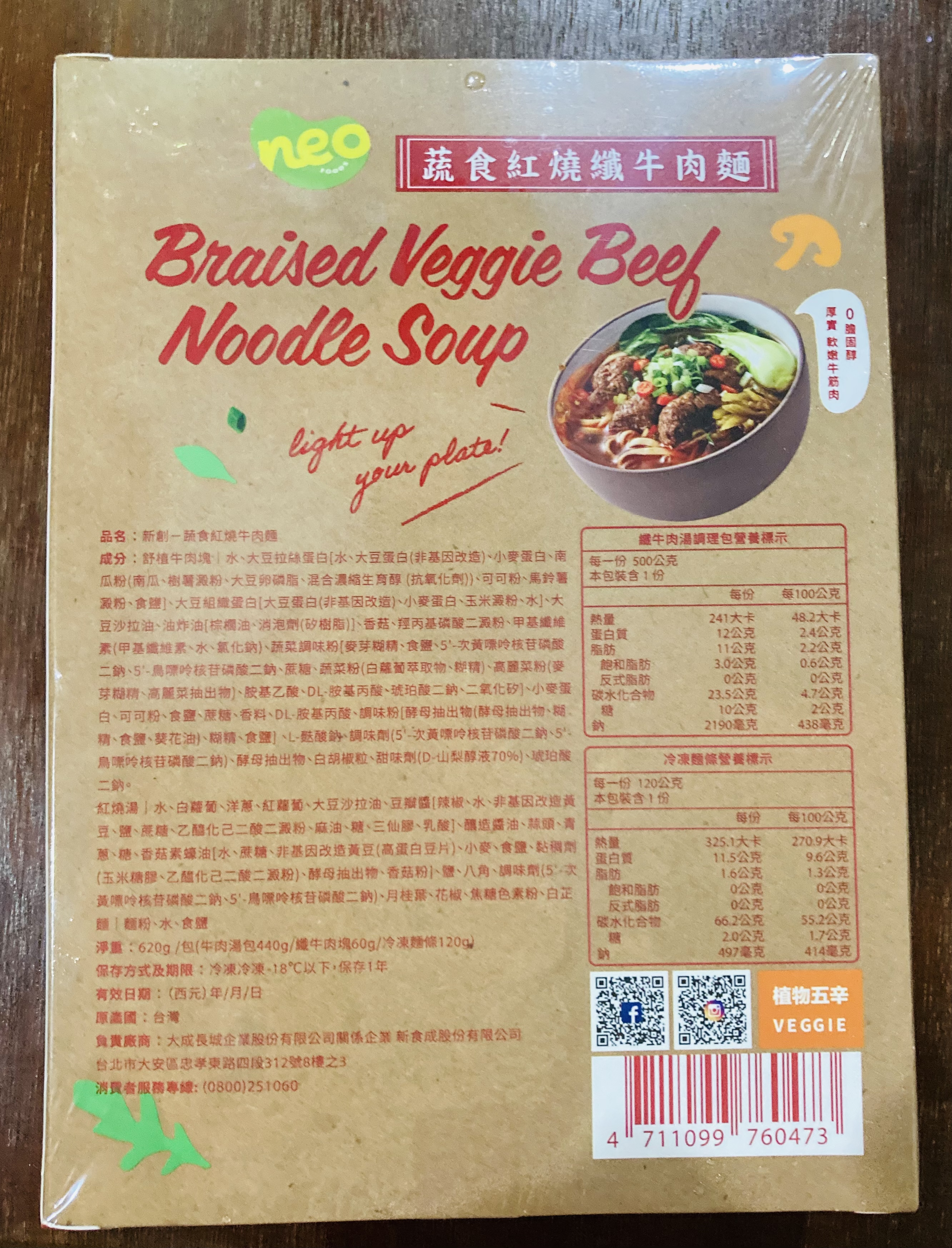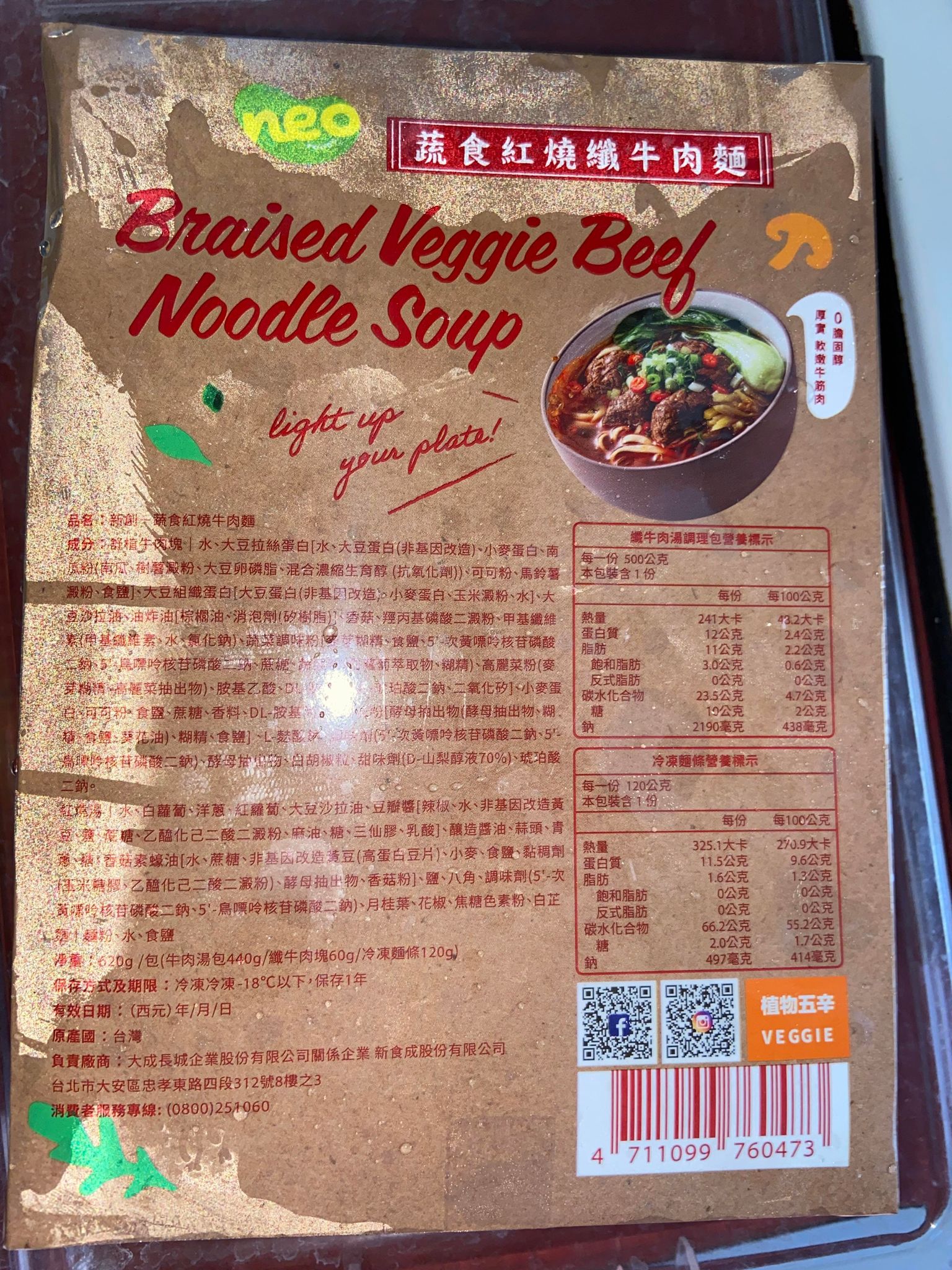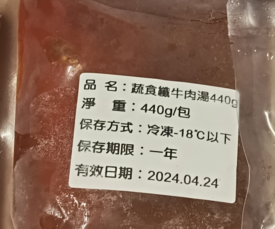 *紅燒湯:水、白蘿蔔、洋蔥、紅蘿蔔、大豆沙拉油、豆瓣醬[辣椒、水、非基因改造黃豆、鹽、蔗糖、乙醯化己二酸二澱粉、麻油、糖、三仙膠、乳酸]、釀造醬油、蒜頭、青蔥、香菇素蠔油[水、蔗糖、非基因改造黃豆(高蛋白豆片)、小麥、食鹽、黏稠劑(玉米糖膠、乙醯化己二酸二澱粉)、酵母抽出物、香菇粉]、鹽、八角、調味劑(5'-次黃嘌呤核苷磷酸二鈉、5'-鳥嘌呤核苷磷酸二鈉)、月桂葉、花椒、焦糖色素粉、白芷