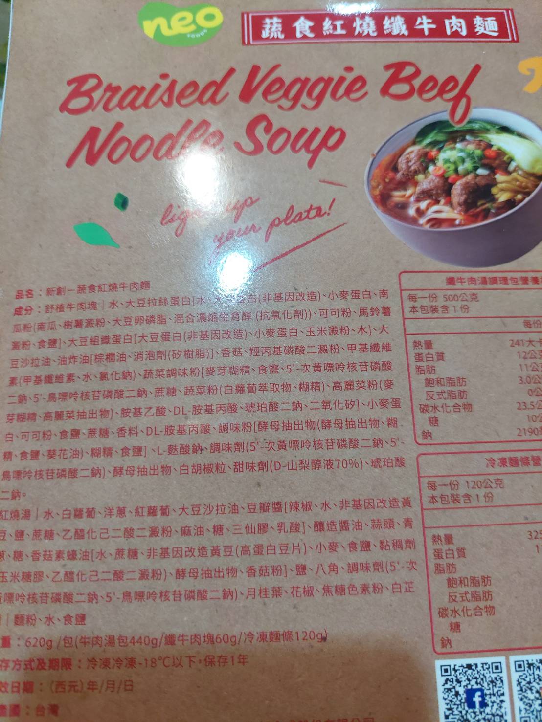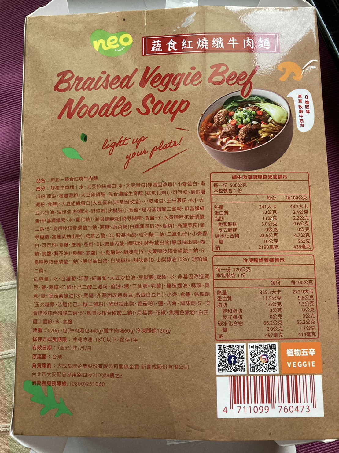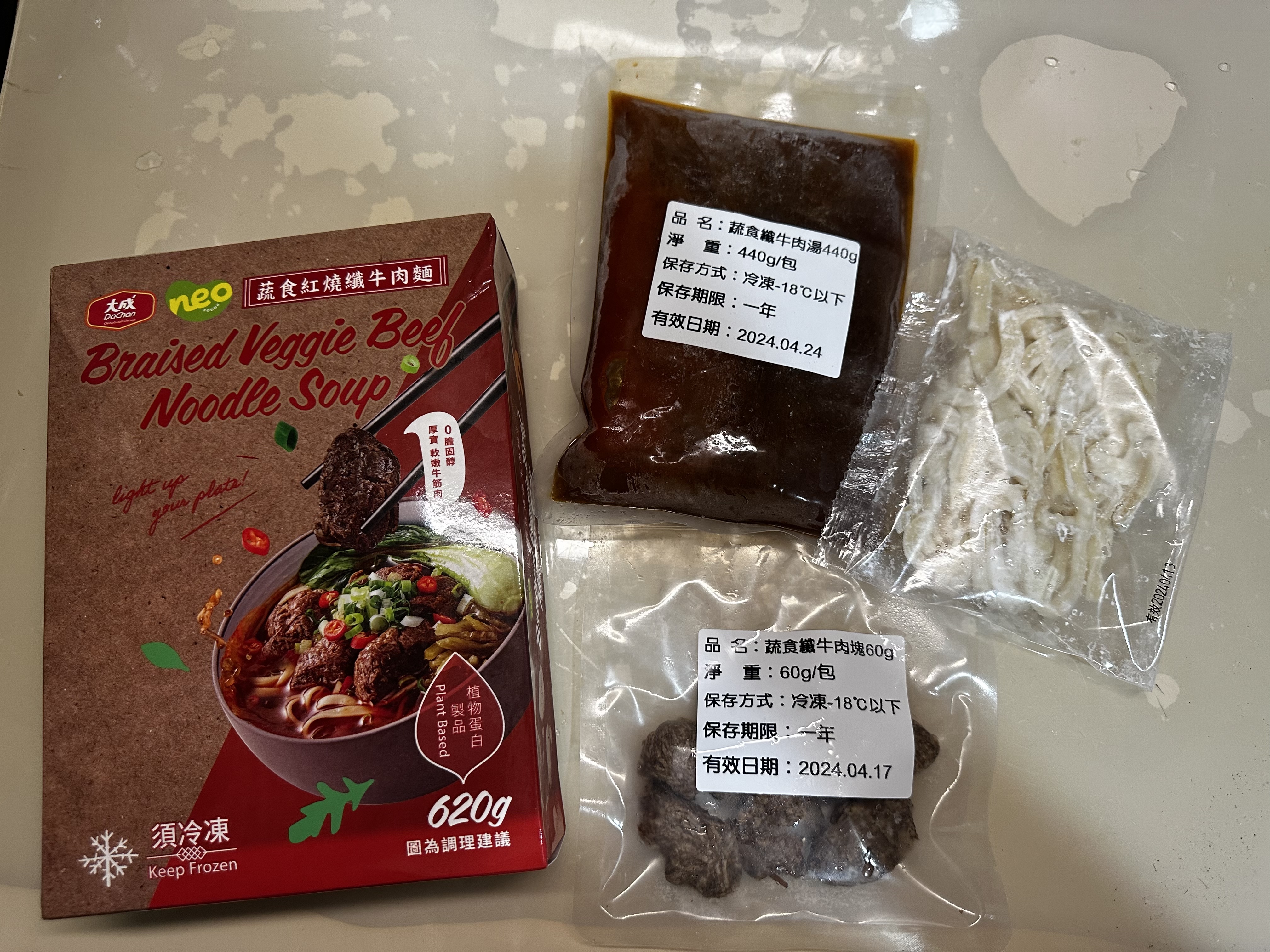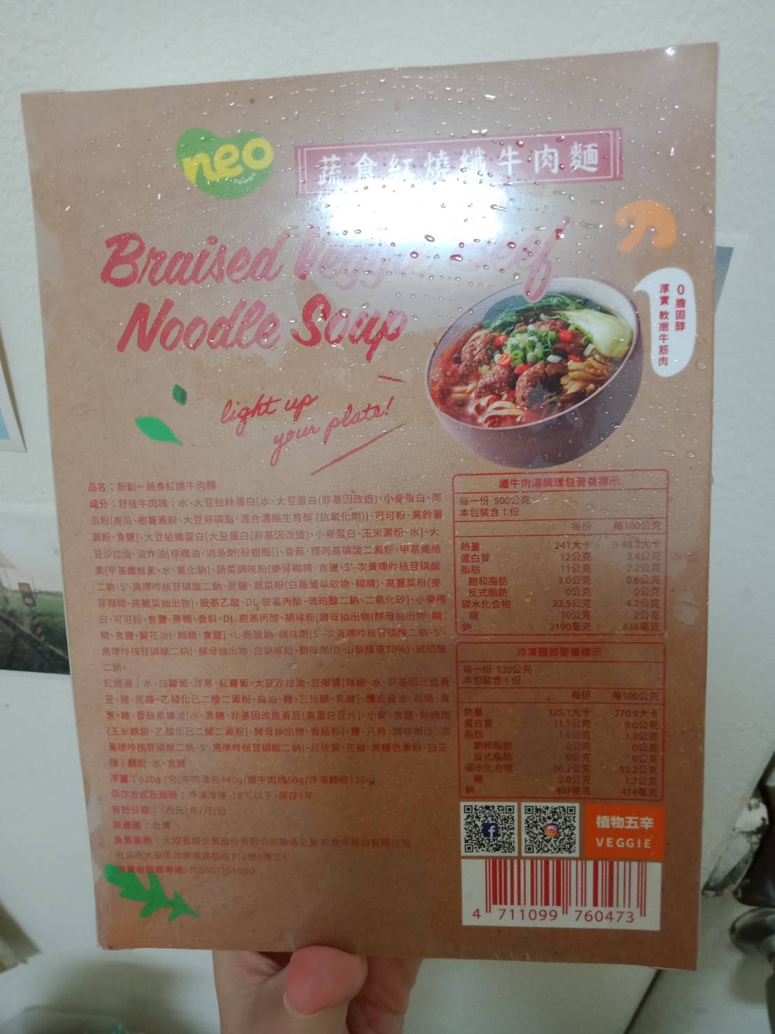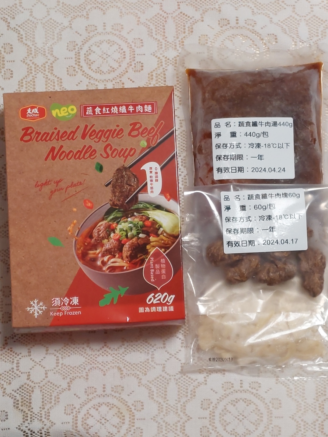 *紅燒湯:水、白蘿蔔、洋蔥、紅蘿蔔、大豆沙拉油、豆瓣醬[辣椒、水、非基因改造黃豆、鹽、蔗糖、乙醯化己二酸二澱粉、麻油、糖、三仙膠、乳酸]、釀造醬油、蒜頭、青蔥、香菇素蠔油[水、蔗糖、非基因改造黃豆(高蛋白豆片)、小麥、食鹽、黏稠劑(玉米糖膠、乙醯化己二酸二澱粉)、酵母抽出物、香菇粉]、鹽、八角、調味劑(5'-次黃嘌呤核苷磷酸二鈉、5'-鳥嘌呤核苷磷酸二鈉)、月桂葉、花椒、焦糖色素粉、白芷