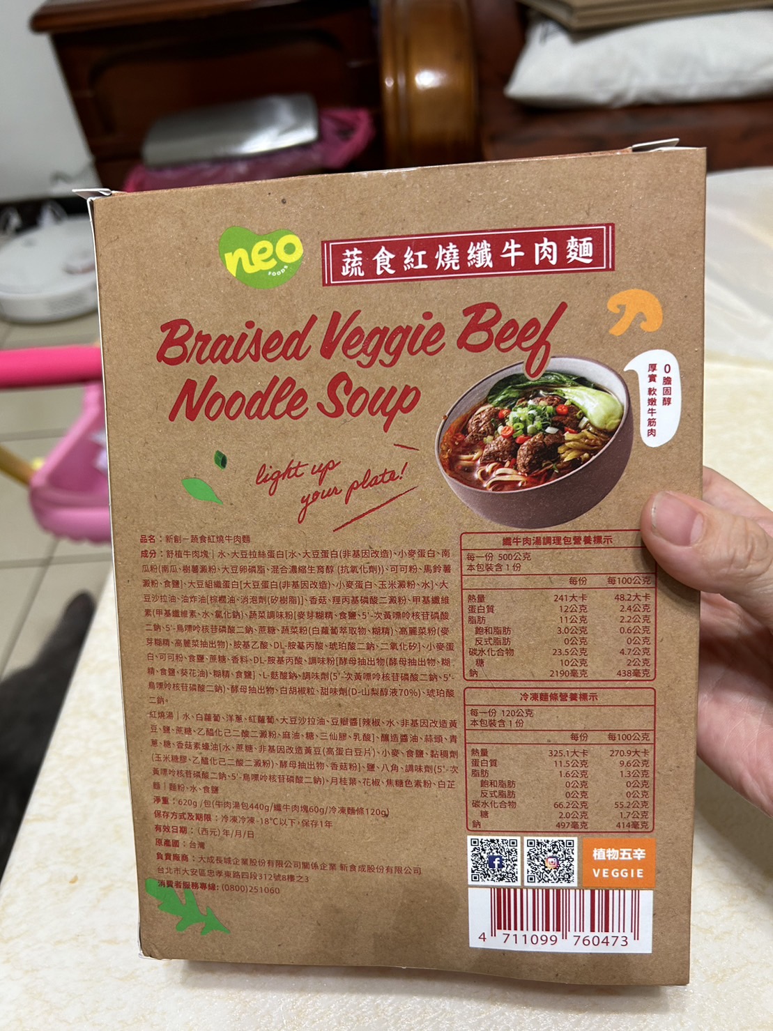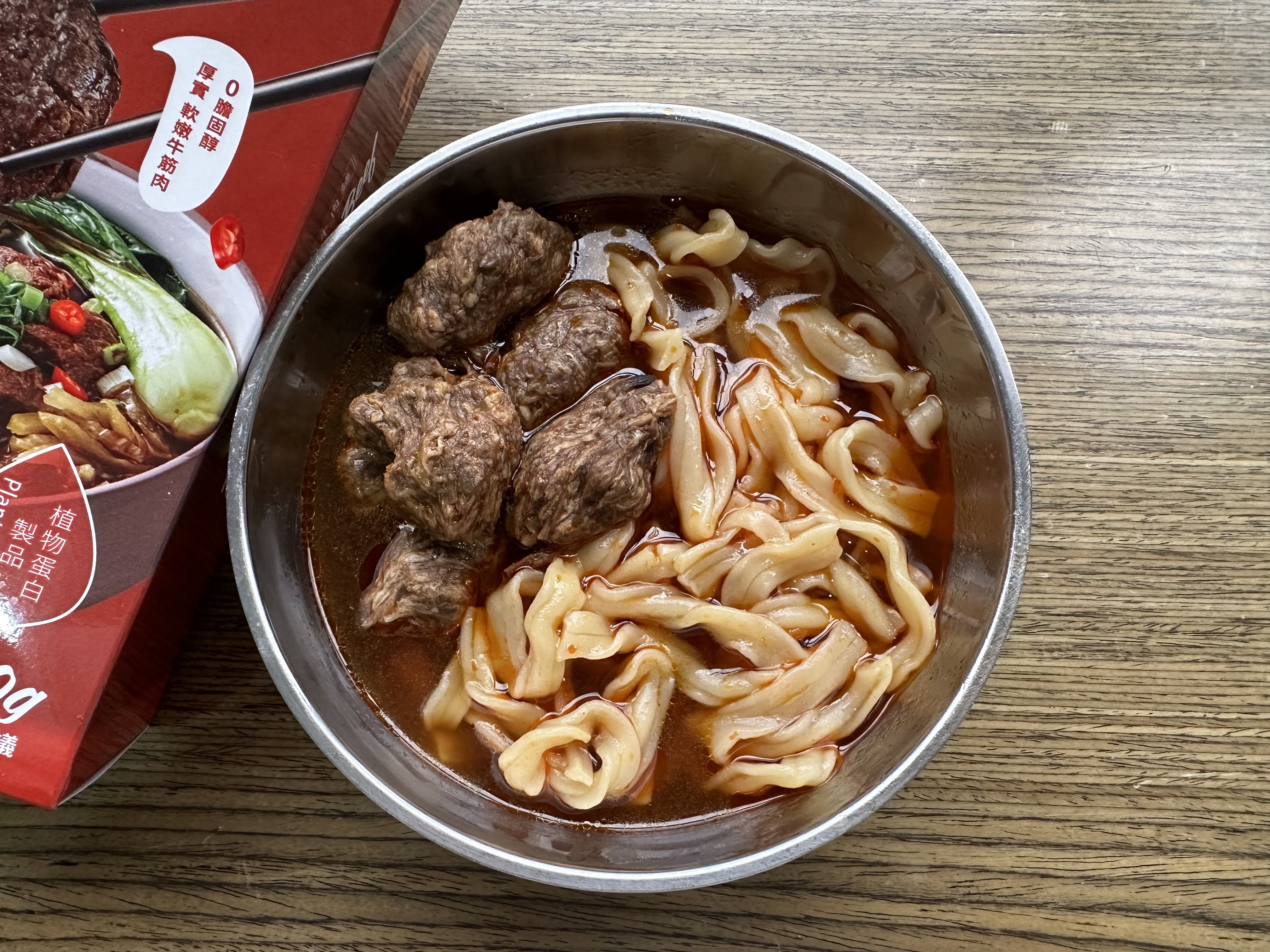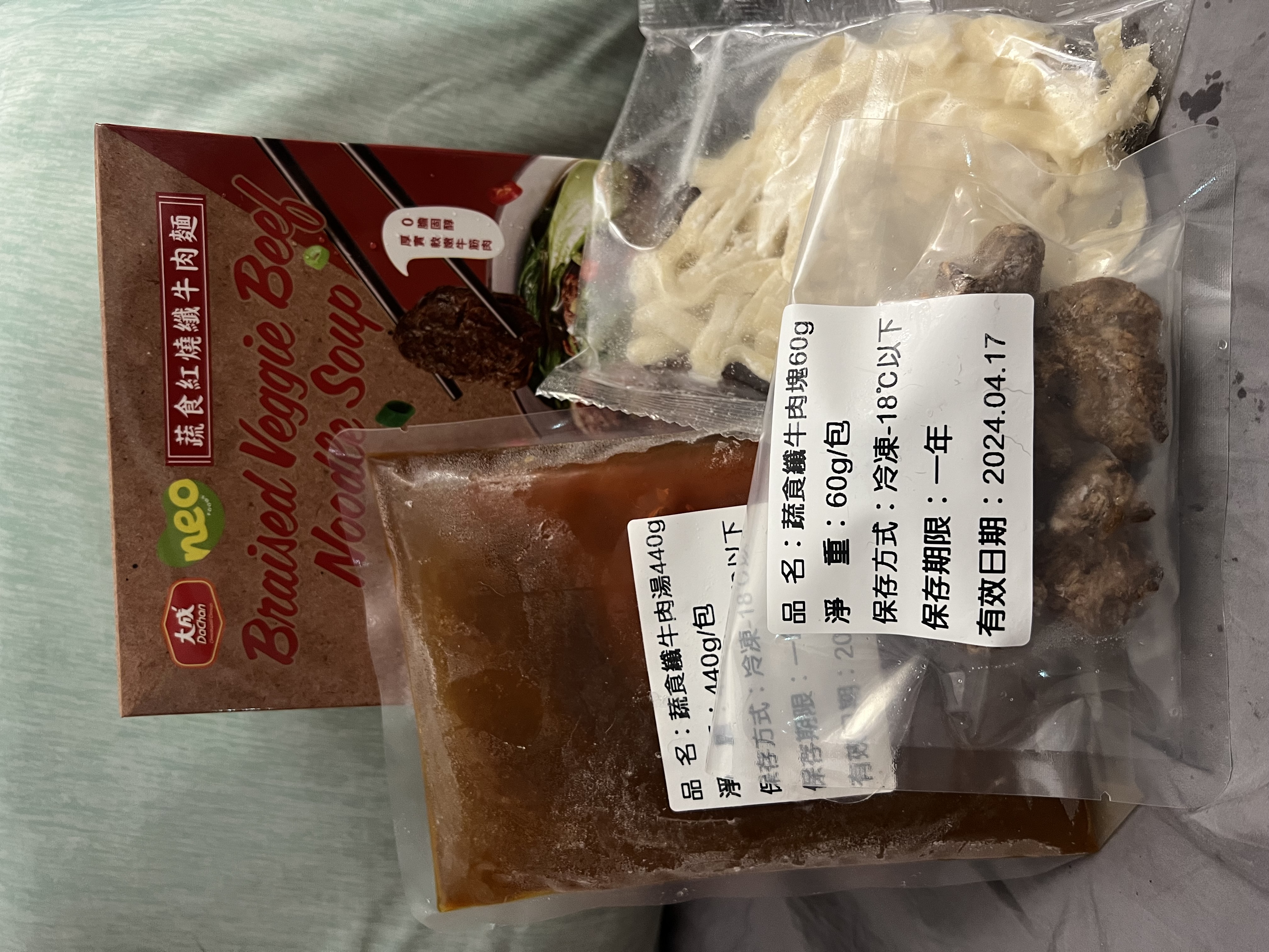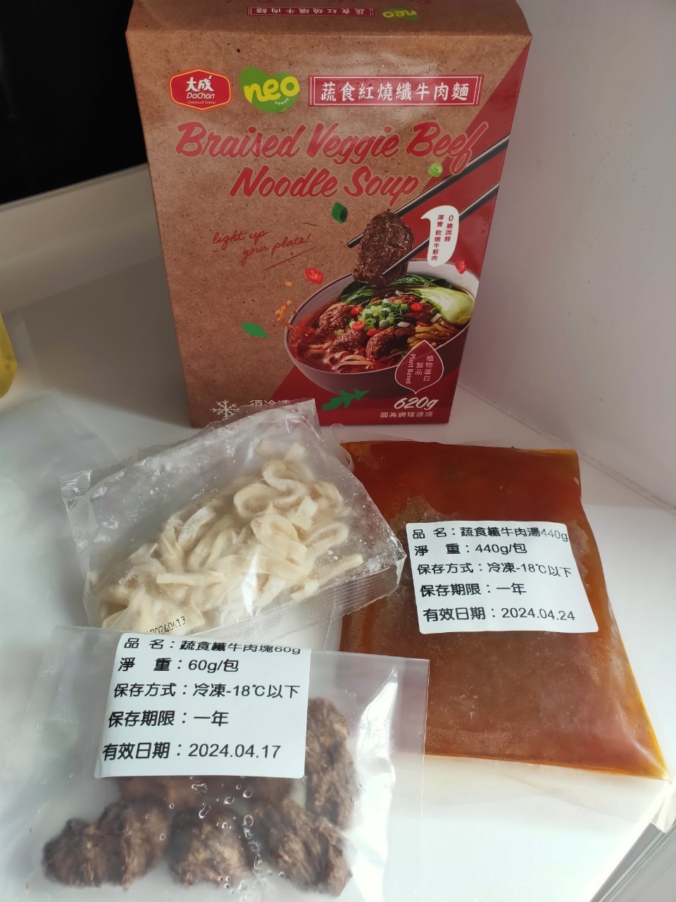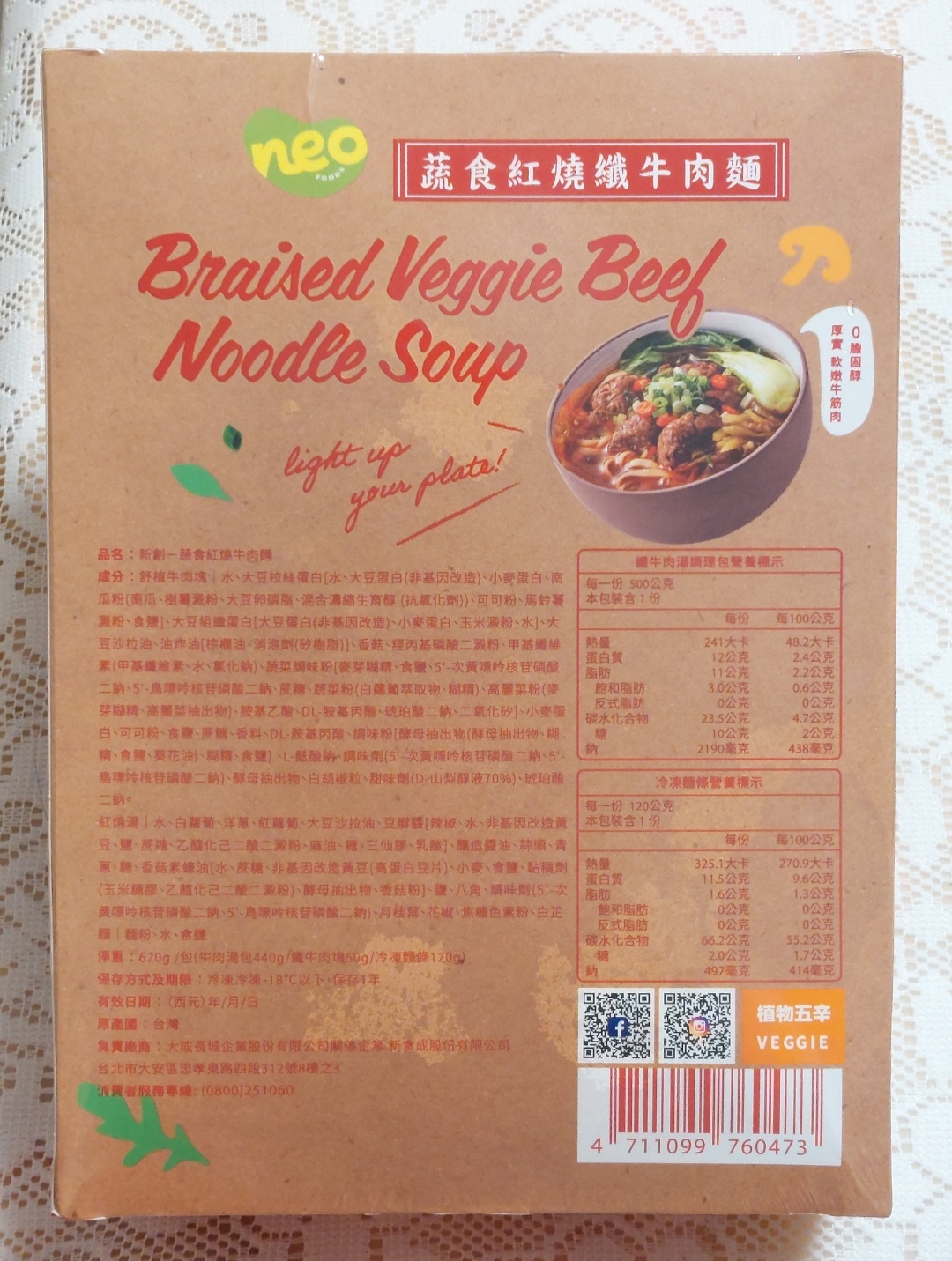 *紅燒湯:水、白蘿蔔、洋蔥、紅蘿蔔、大豆沙拉油、豆瓣醬[辣椒、水、非基因改造黃豆、鹽、蔗糖、乙醯化己二酸二澱粉、麻油、糖、三仙膠、乳酸]、釀造醬油、蒜頭、青蔥、香菇素蠔油[水、蔗糖、非基因改造黃豆(高蛋白豆片)、小麥、食鹽、黏稠劑(玉米糖膠、乙醯化己二酸二澱粉)、酵母抽出物、香菇粉]、鹽、八角、調味劑(5'-次黃嘌呤核苷磷酸二鈉、5'-鳥嘌呤核苷磷酸二鈉)、月桂葉、花椒、焦糖色素粉、白芷