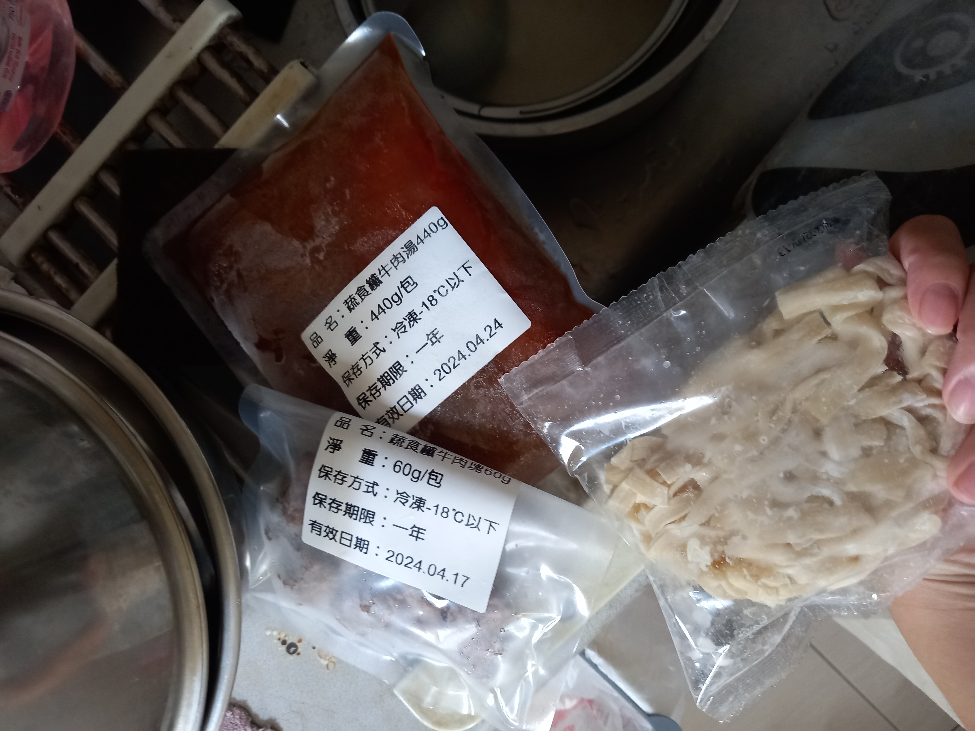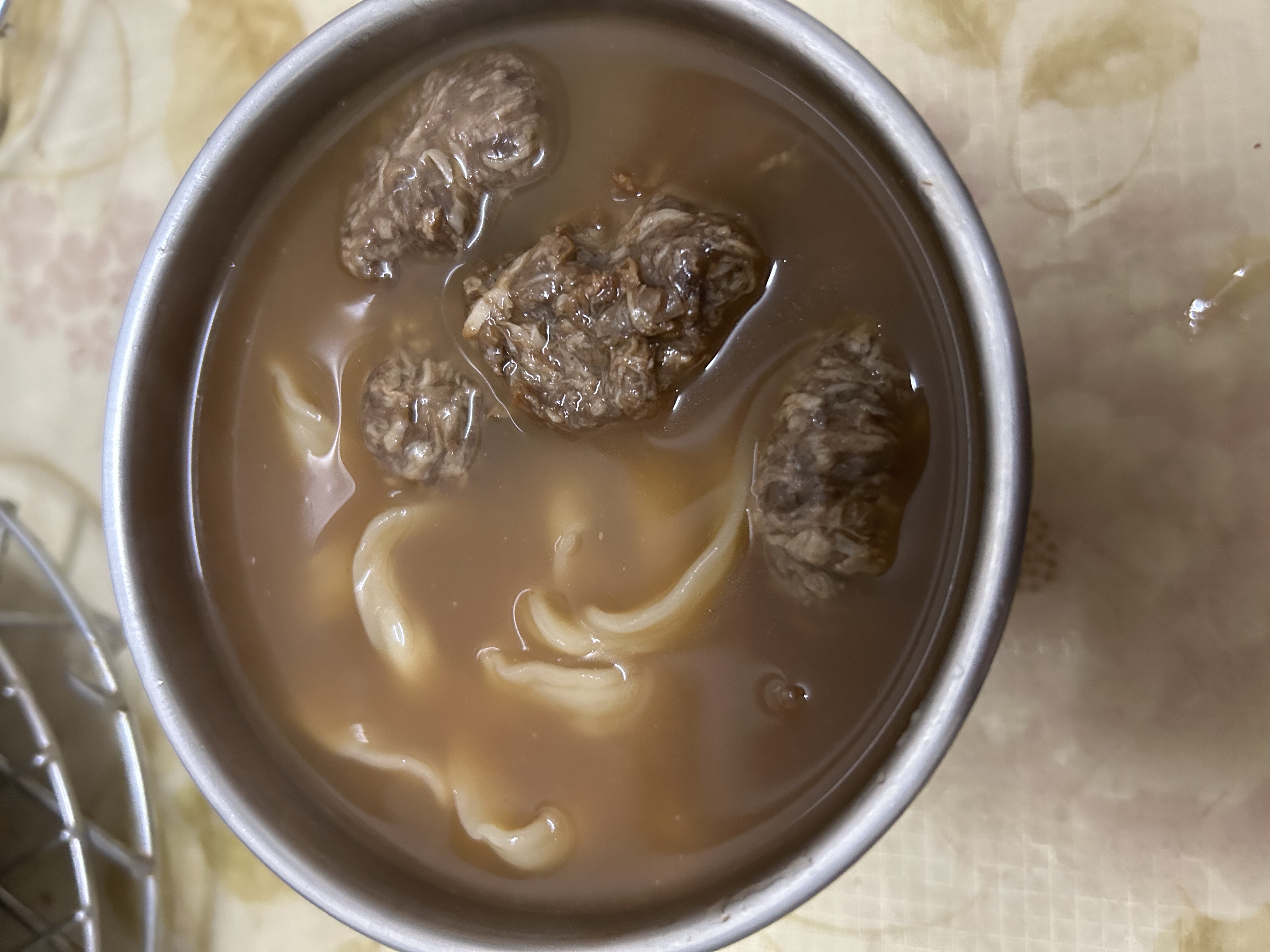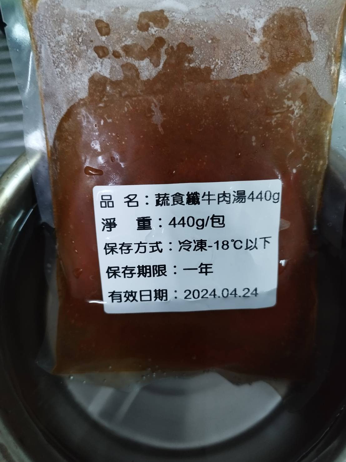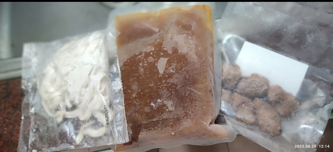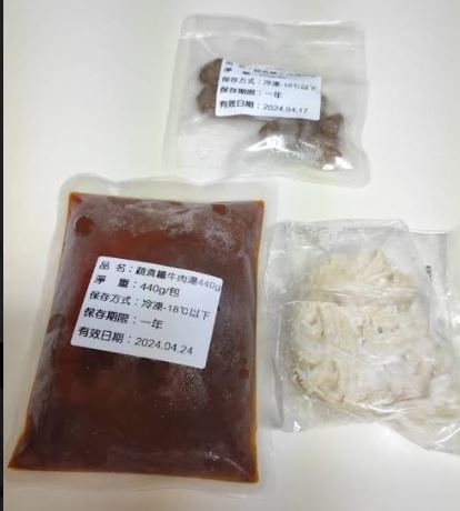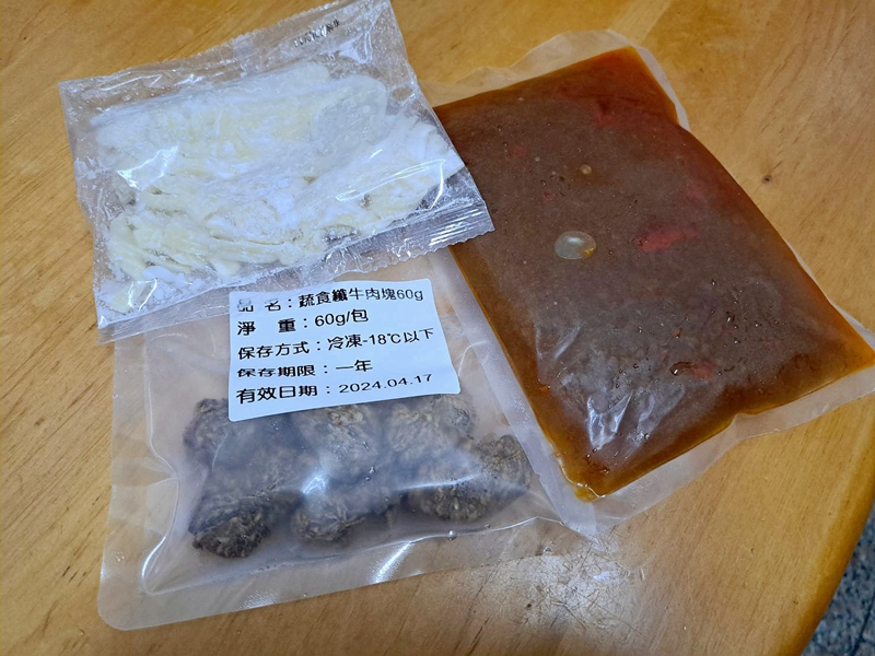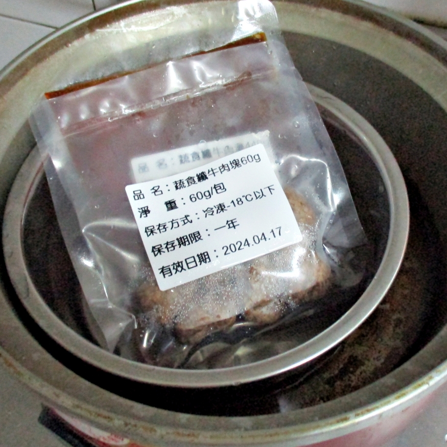 3)蒸煮加熱:將解凍後之調理包及牛肉塊包拆袋後,倒入容器蒸煮約 7-8 分鐘。