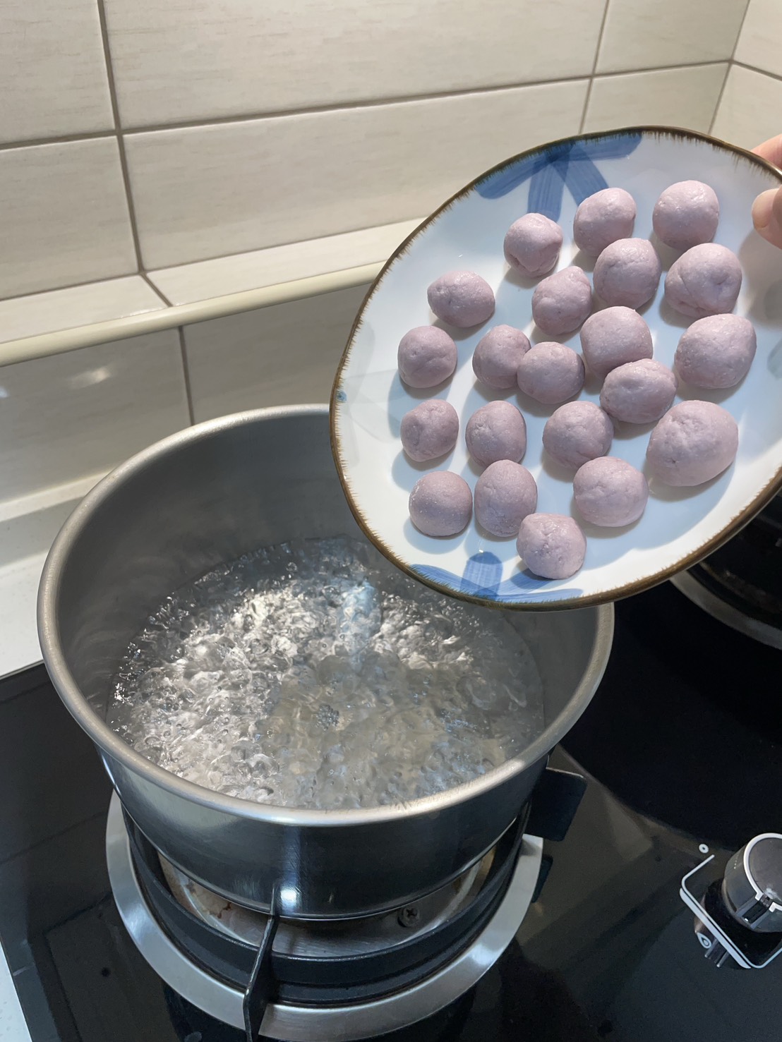 步驟一:小心將75cc 沸騰的熱水倒入芋圓粉中