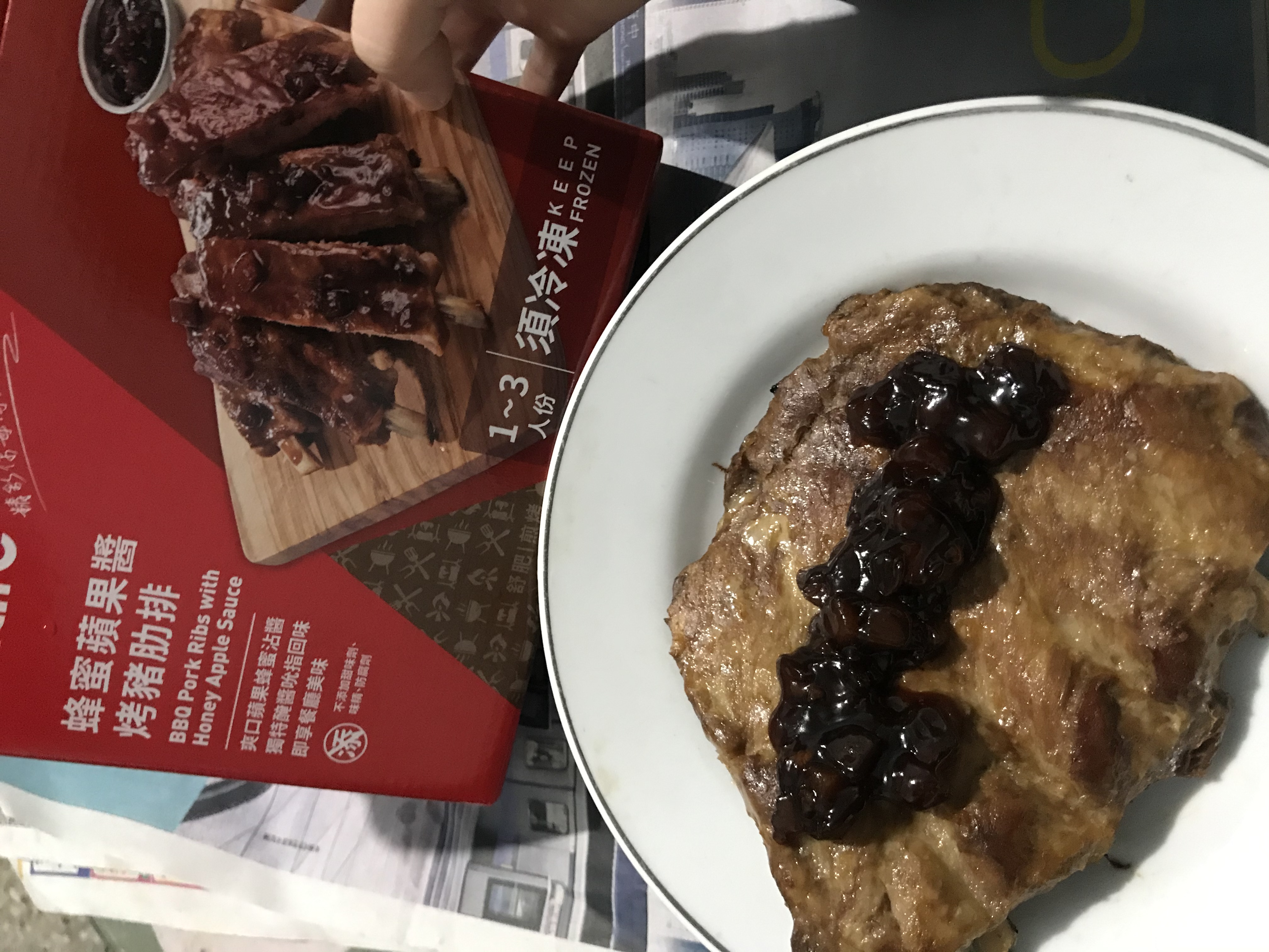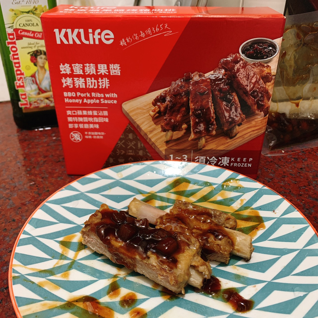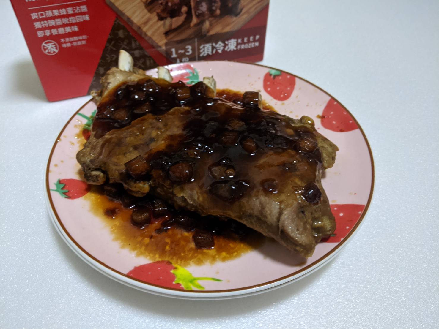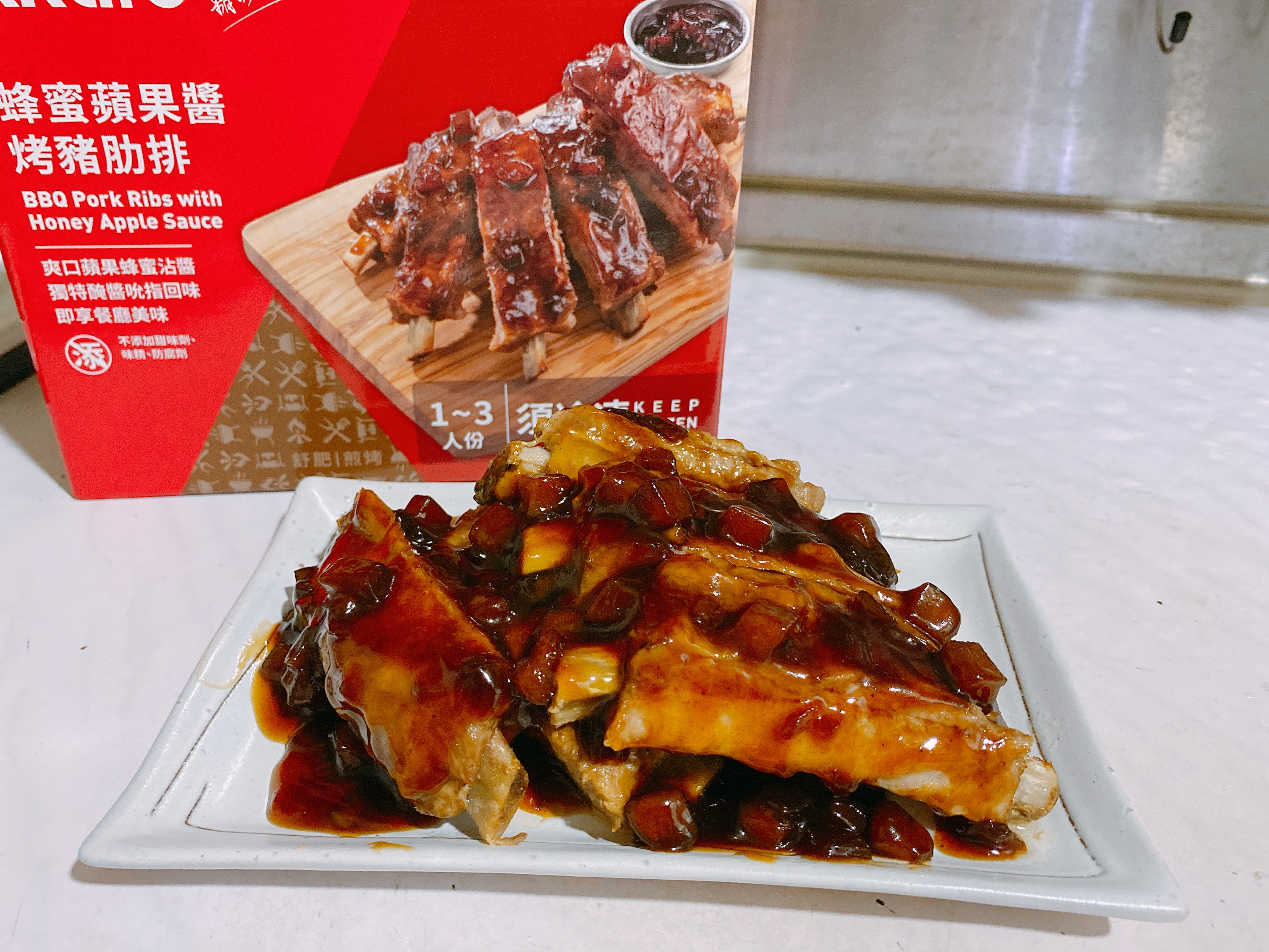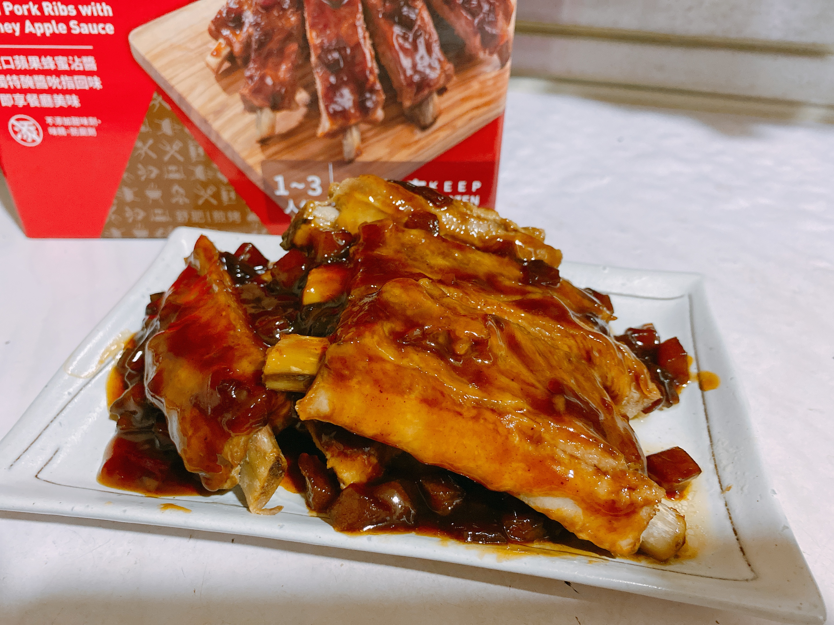 肋排解凍後,經過烤箱簡單復熱後的豬肋排,淋上蜂蜜蘋果醬,創造出豬肋排多層次甜而不膩、軟嫩入味的獨家風味,讓你吮指回味。