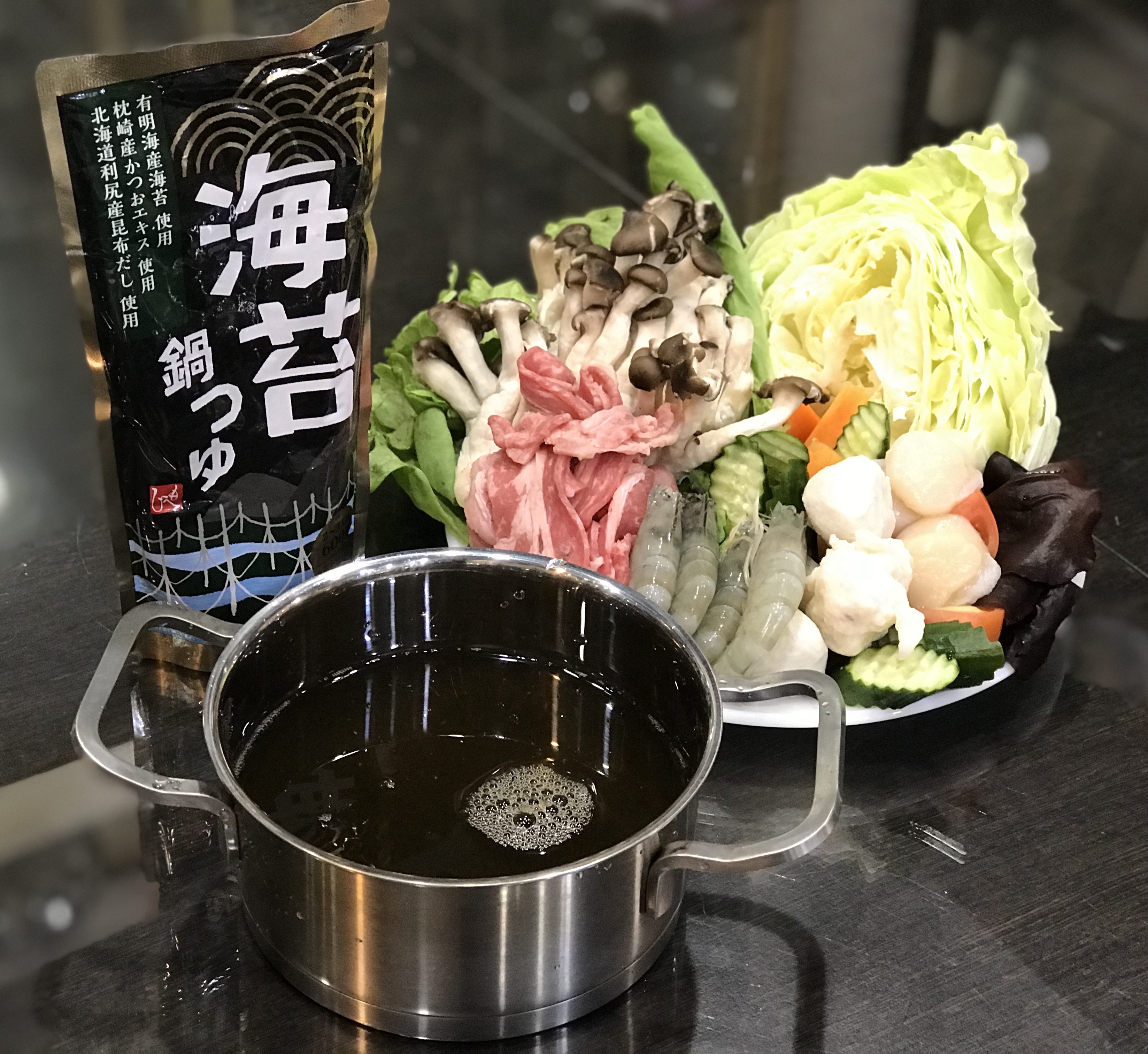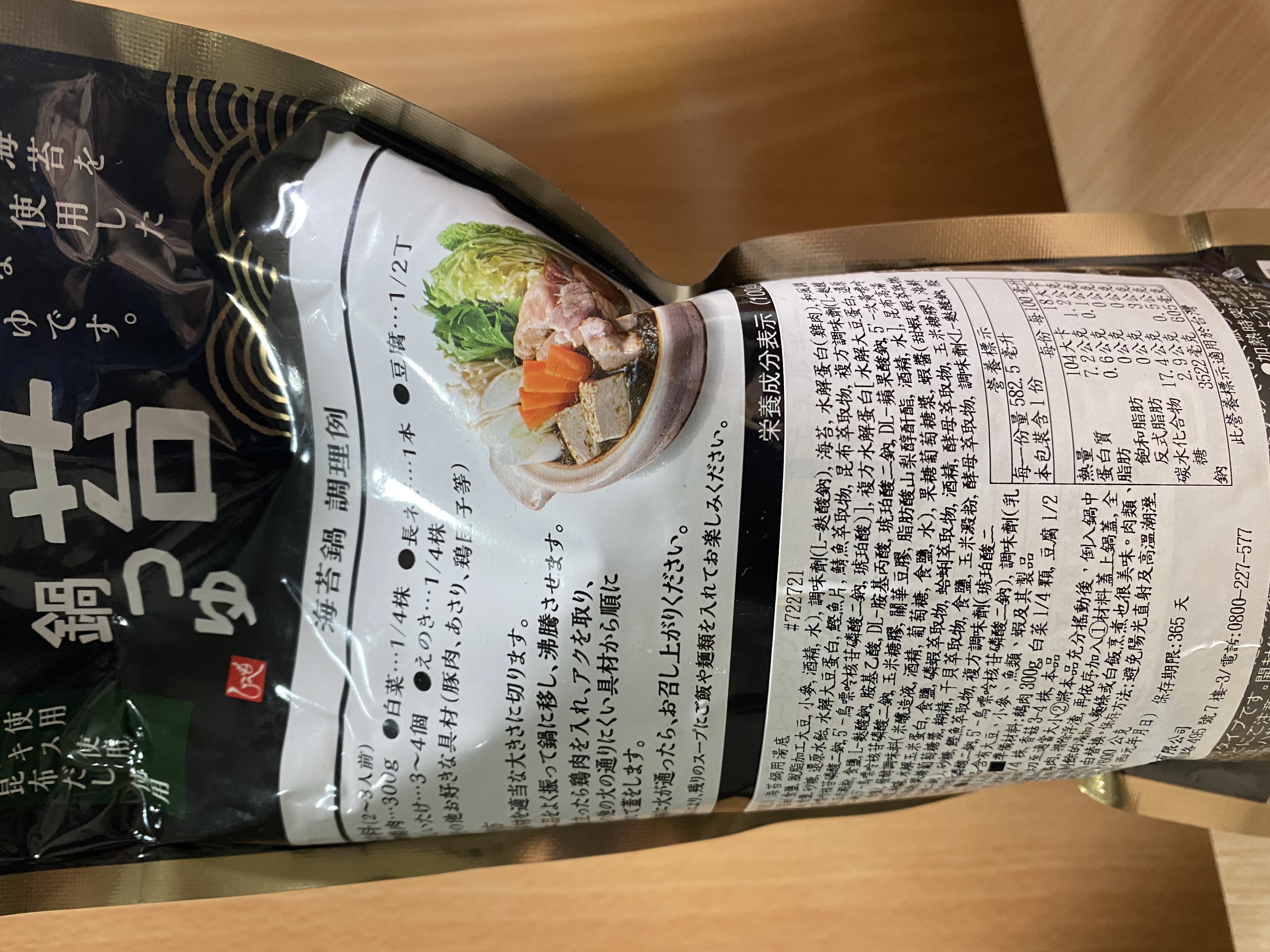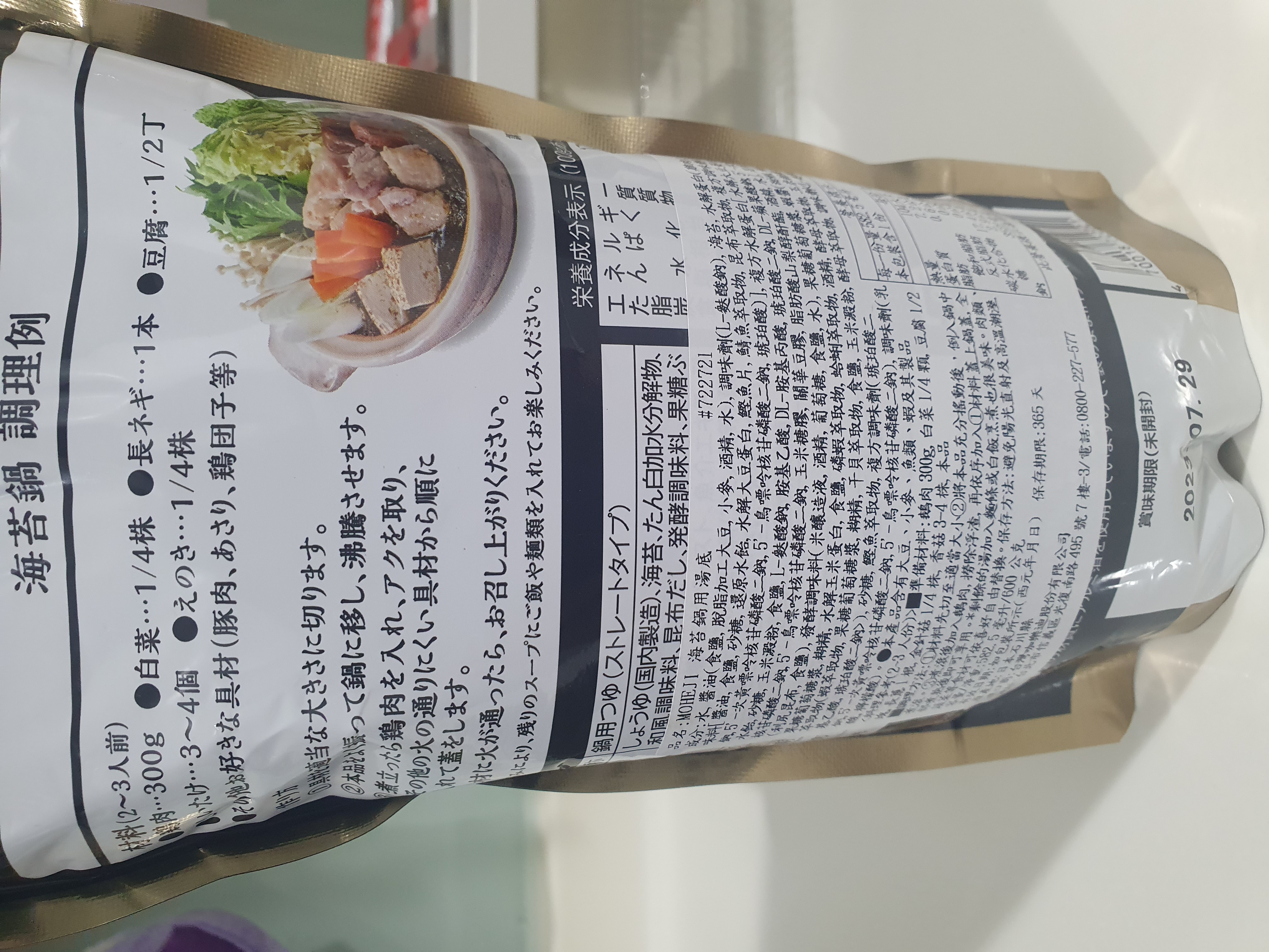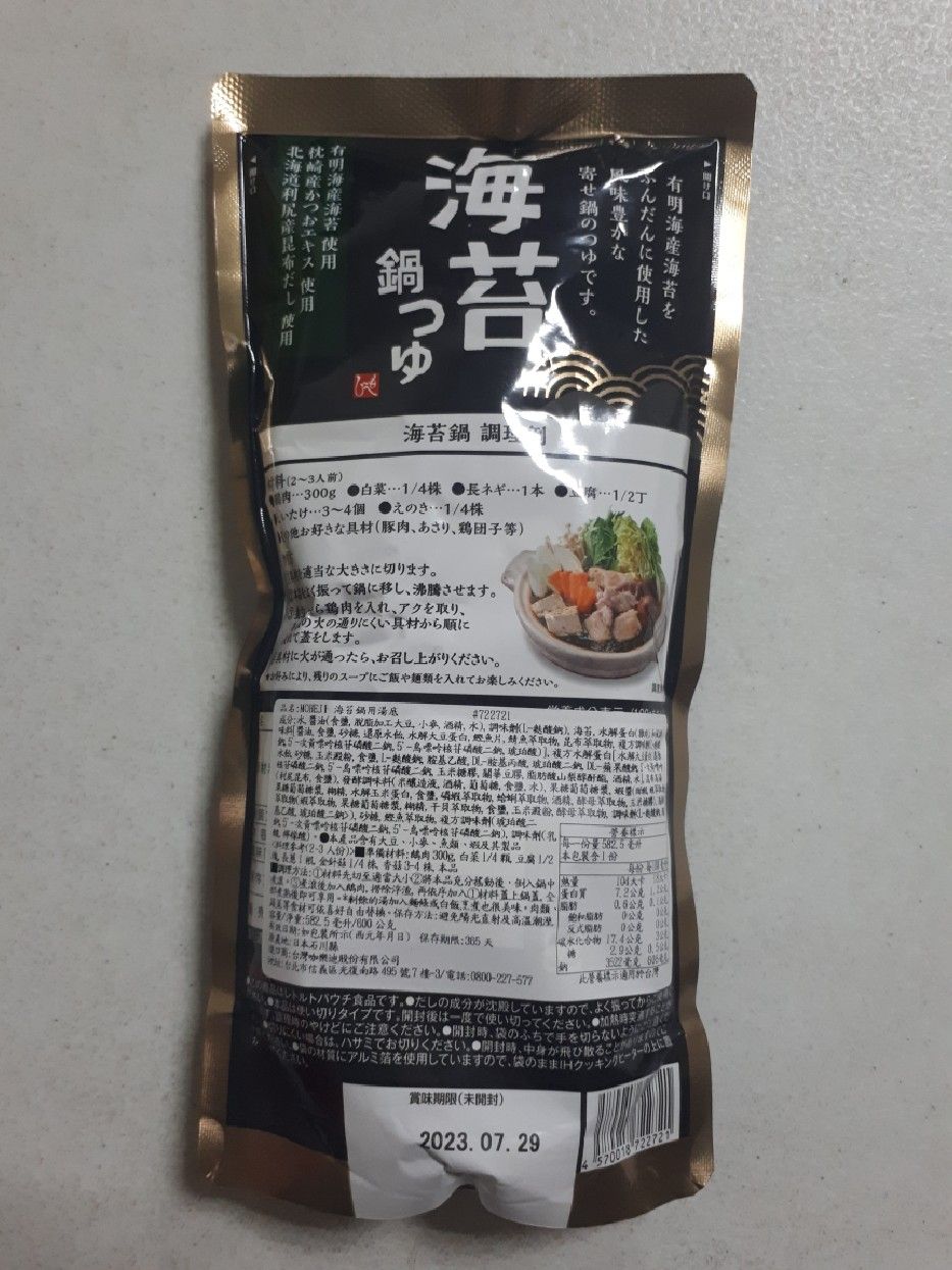 水、醬油、調味劑、海苔、水解蛋白、和風調味料、複方水解蛋白、昆布高湯、發酵調味料、果糖葡萄糖漿、蝦醬、海鮮萃取物、沙糖、鰹魚萃取物、複方調味劑