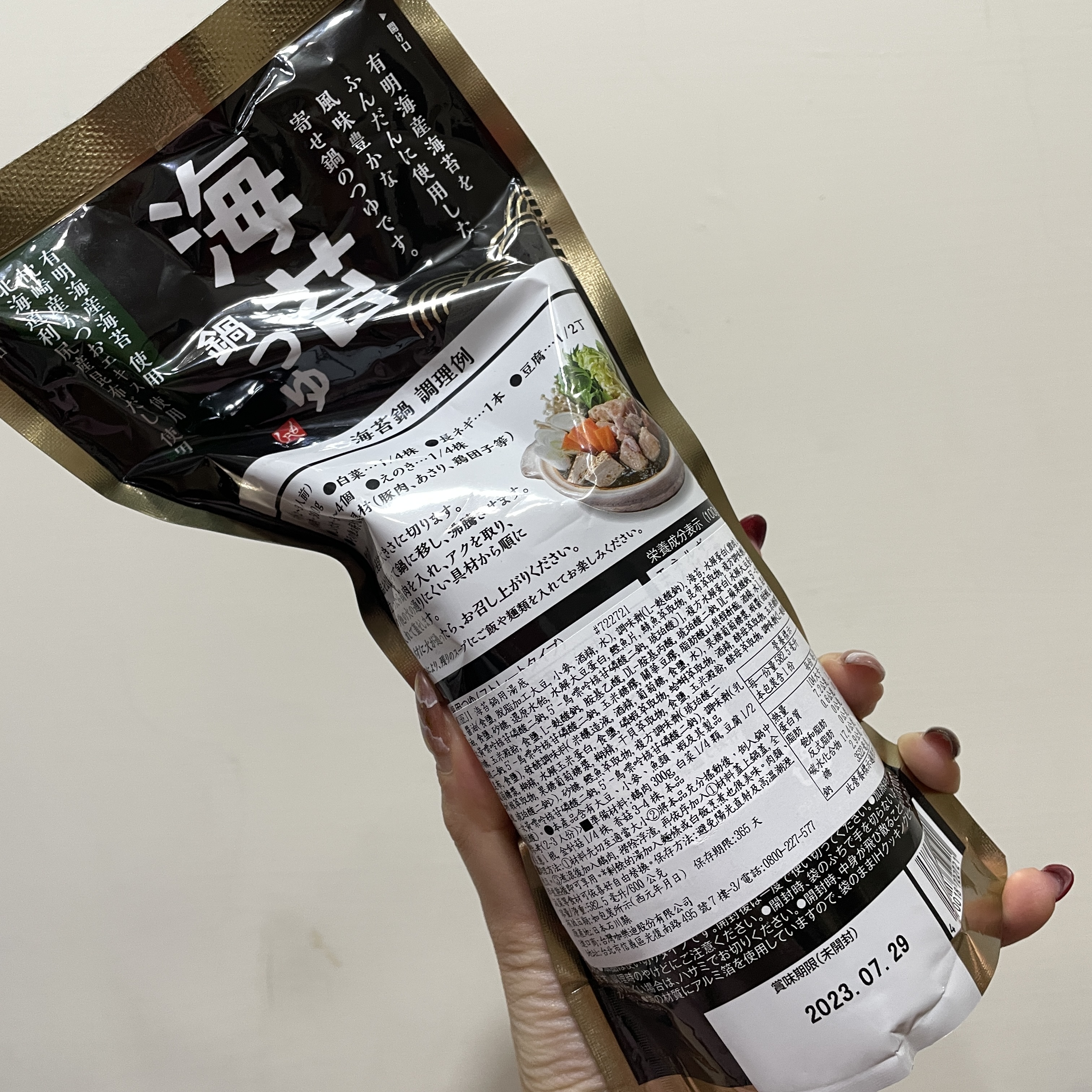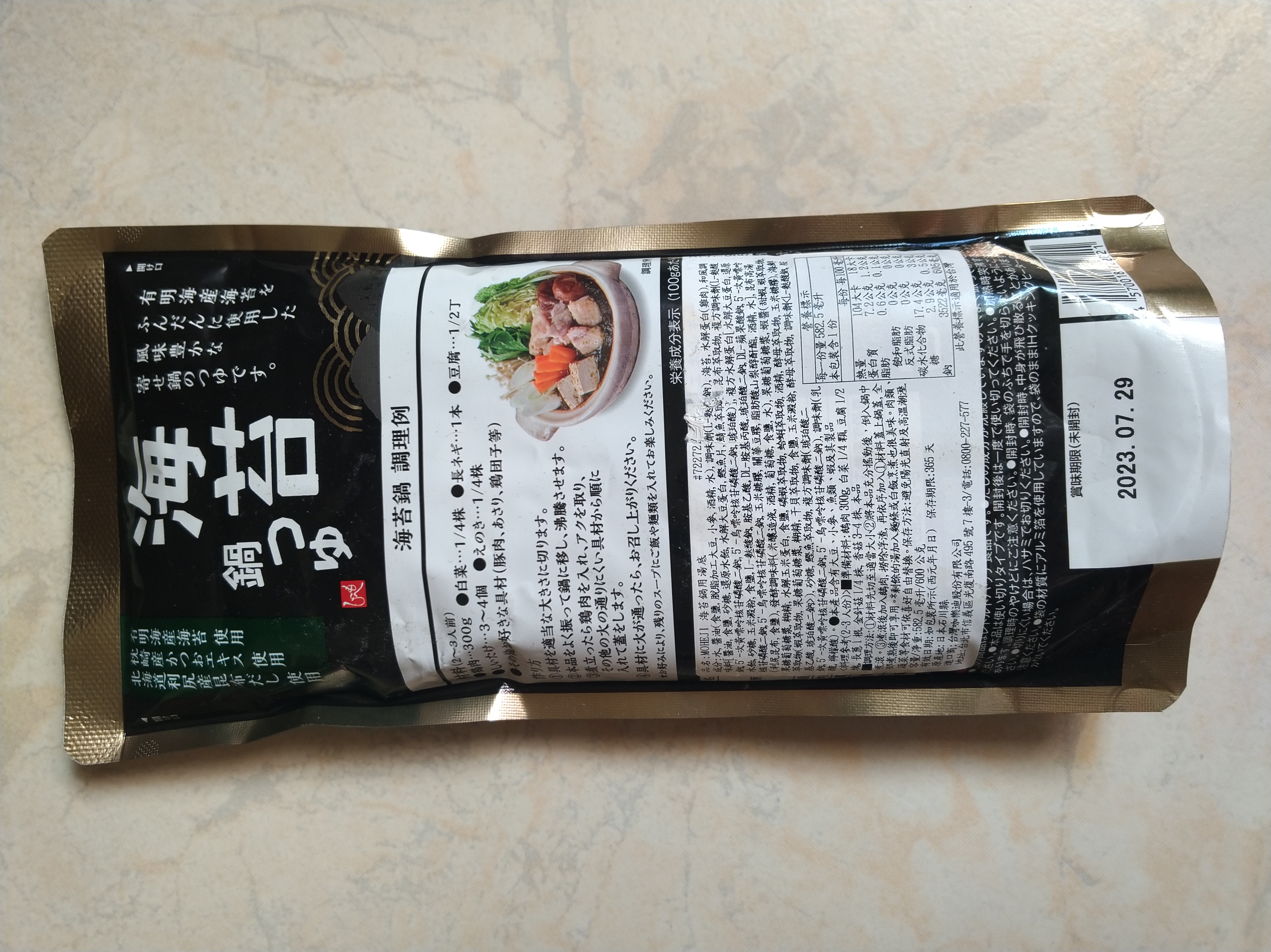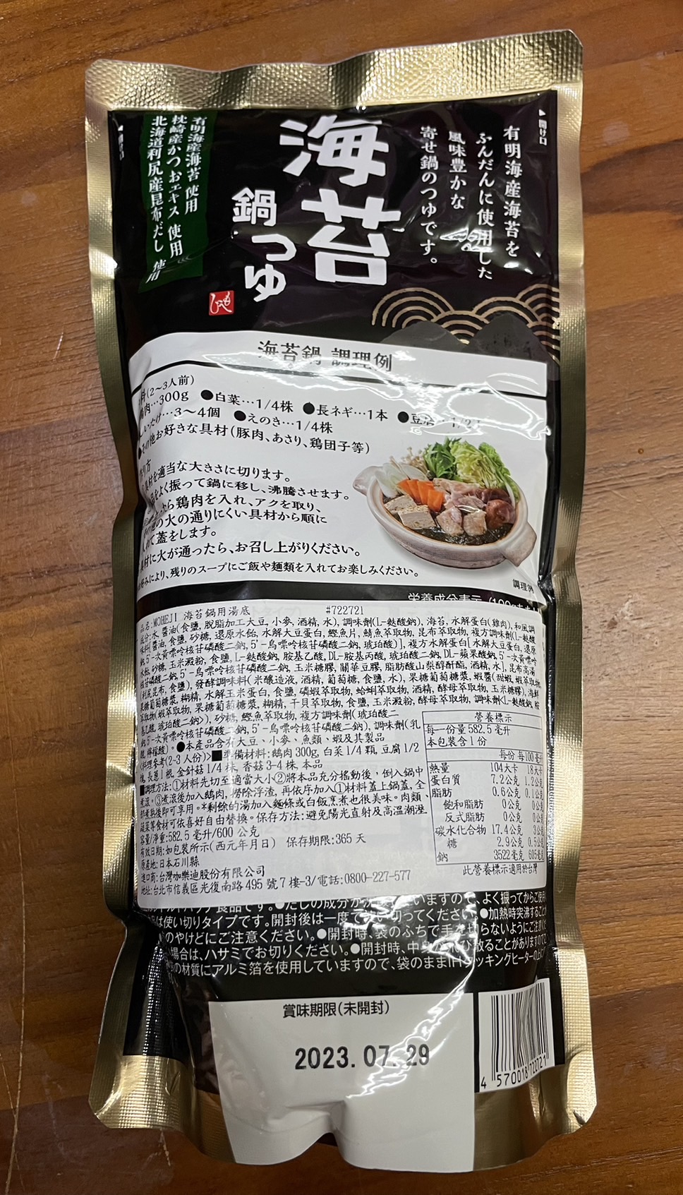 水、醬油、調味劑、海苔、水解蛋白、和風調味料、複方水解蛋白、昆布高湯、發酵調味料、果糖葡萄糖漿、蝦醬、海鮮萃取物、沙糖、鰹魚萃取物、複方調味劑