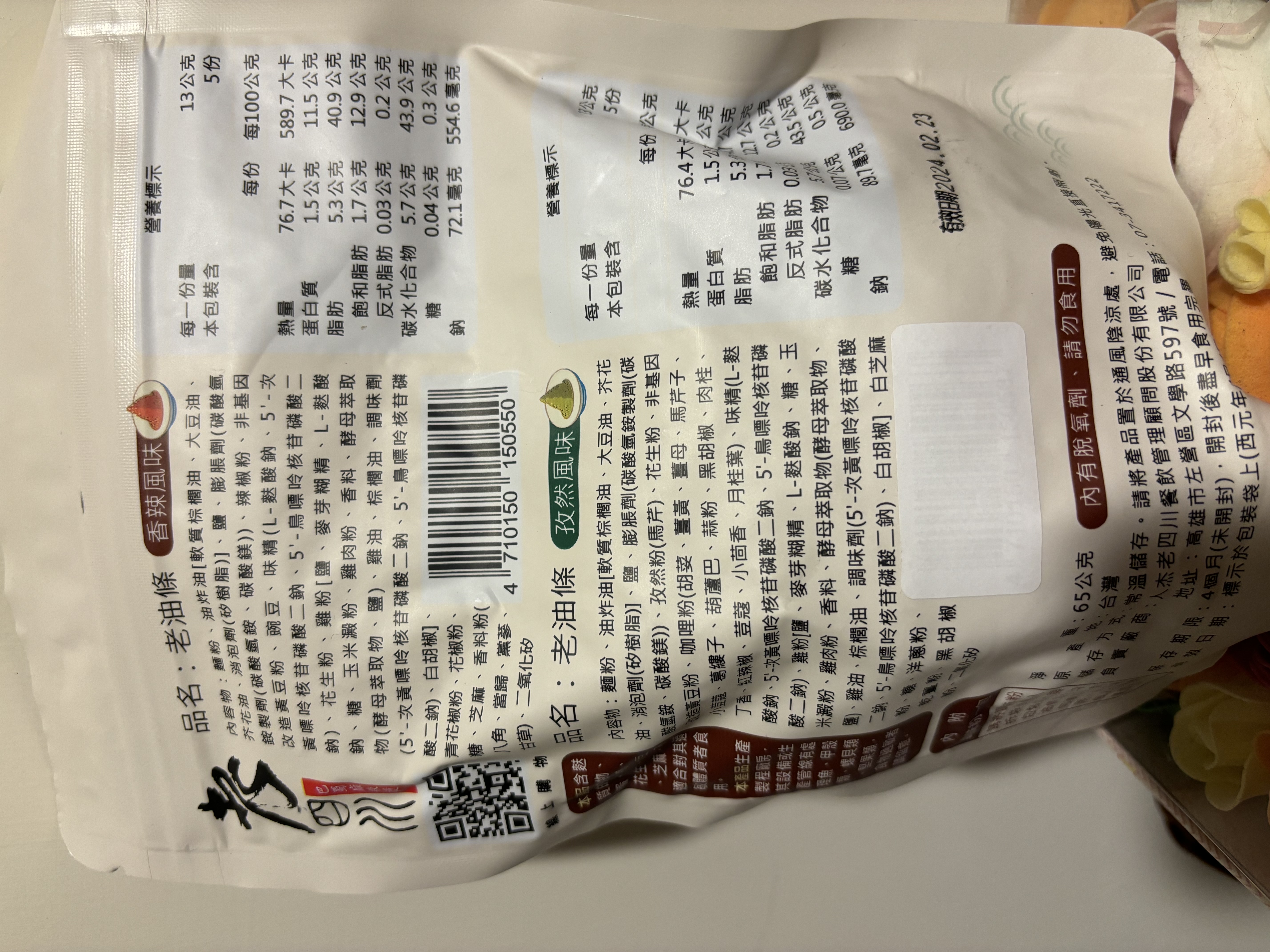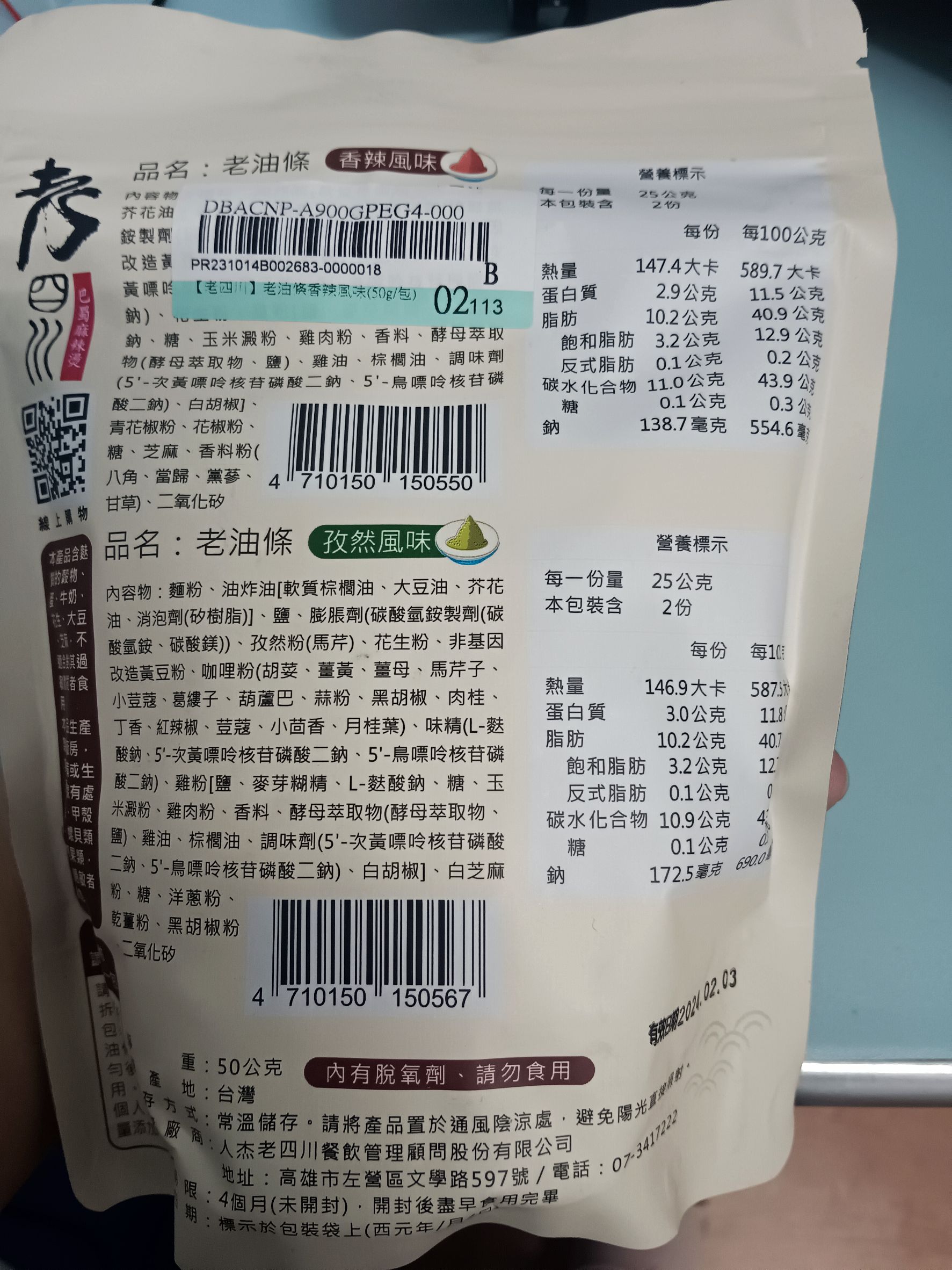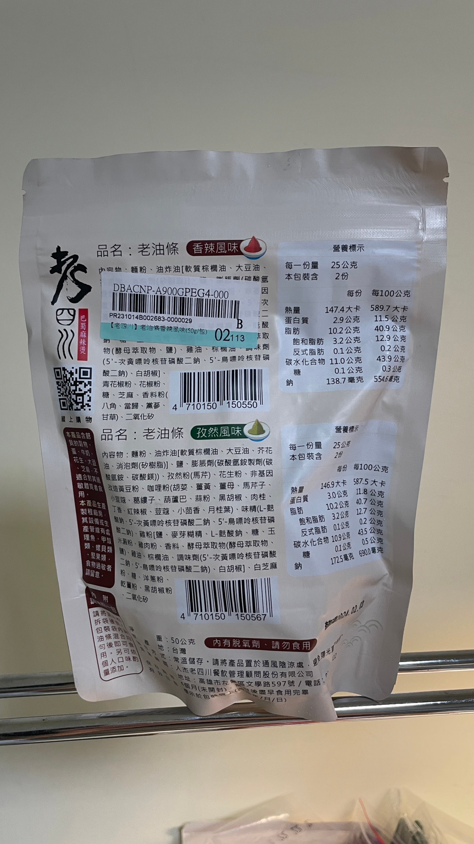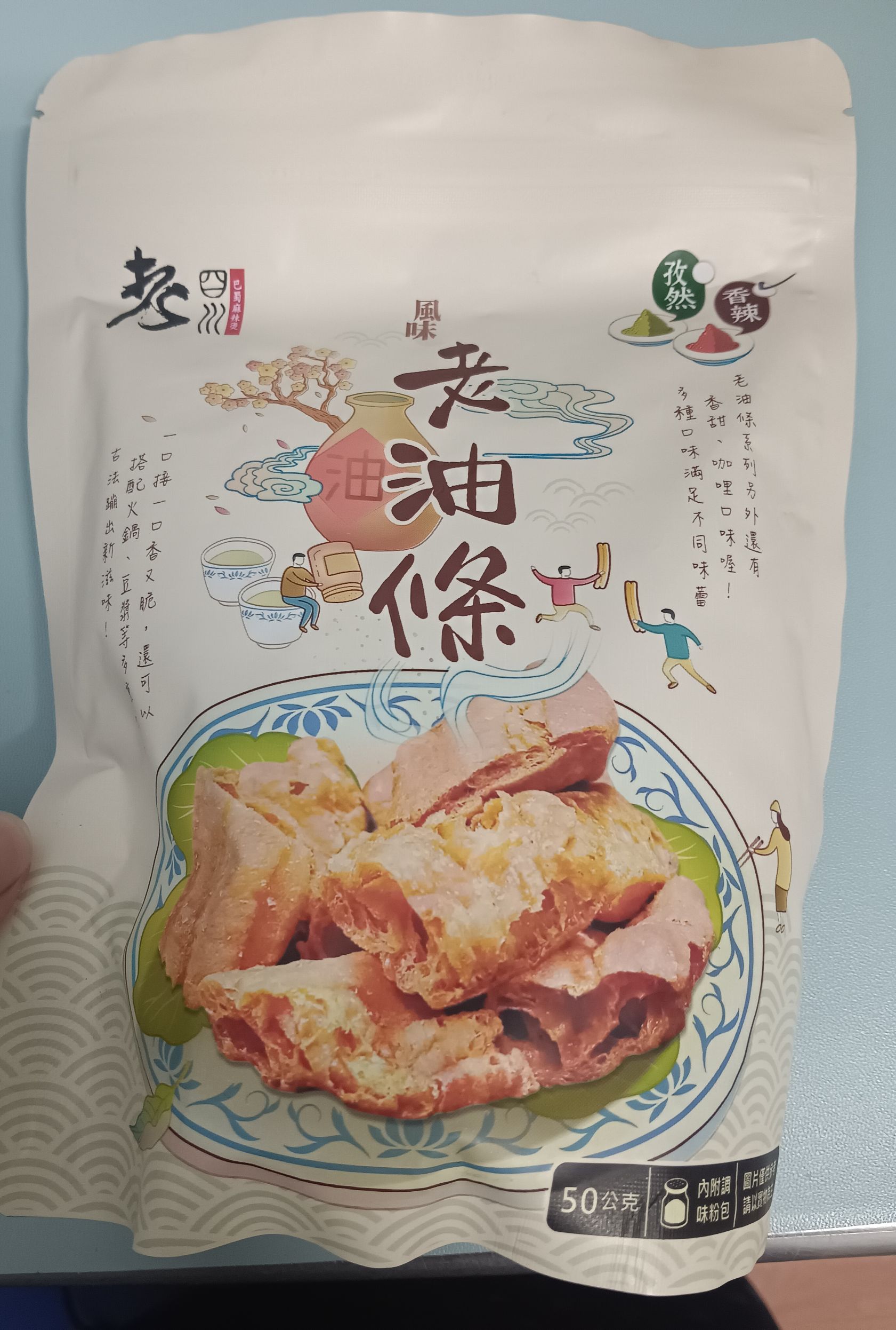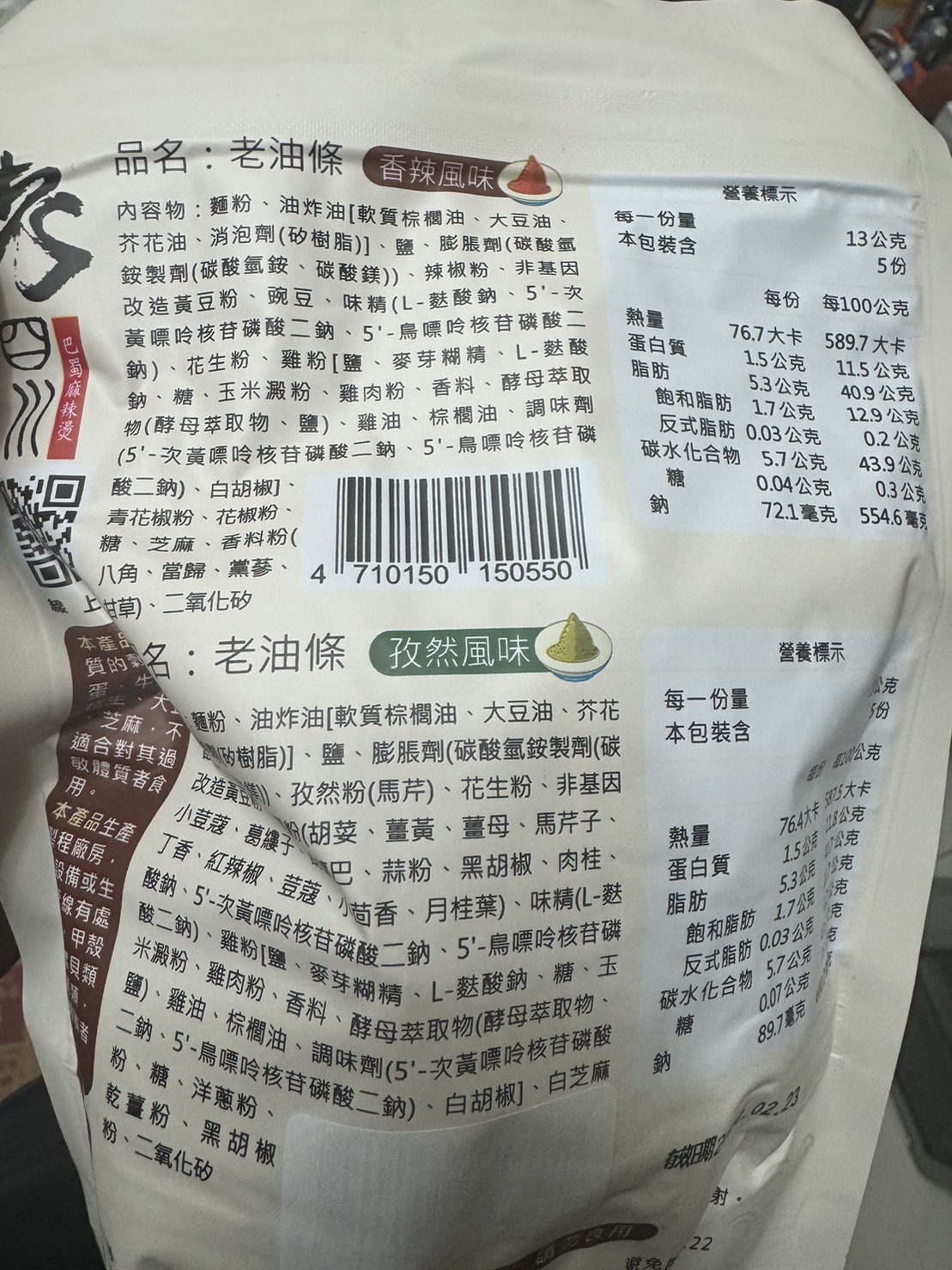 麵粉、油炸油(軟質棕櫚油、大豆油、芥花油、消泡劑(矽樹脂))、鹽、膨脹劑(碳酸氫銨製劑(碳酸氫銨、碳酸鎂))、辣椒粉、非基因改造黃豆粉、豌豆、味精(L-麩酸鈉、5'-次黃嘌呤核苷磷酸二鈉、5'-鳥嘌呤核苷磷酸二鈉)、花生粉、香菇粉(食鹽、香菇、L-麩酸鈉、砂糖、麥芽糊精、葡萄糖、大豆水解蛋白、醬油、蘑菇、5'-次黃嘌呤核苷磷酸二鈉、5'-鳥嘌呤核苷磷酸二鈉、胺基乙酸、酵母抽出物、黑胡椒、氧化澱粉、葵花籽油、芥花油、糊精、琥珀酸、碳酸鉀、檸檬酸)、青花椒粉、花椒粉、糖、芝麻、香料粉(八角、當歸、黨蔘、甘草)、二氧化矽