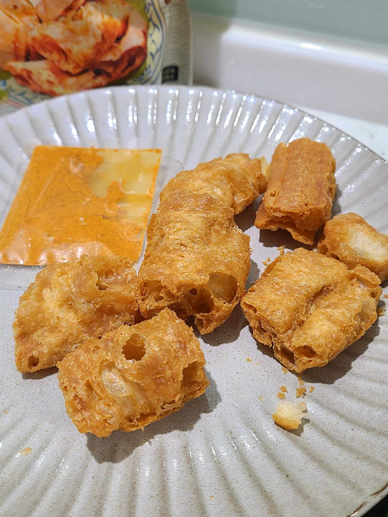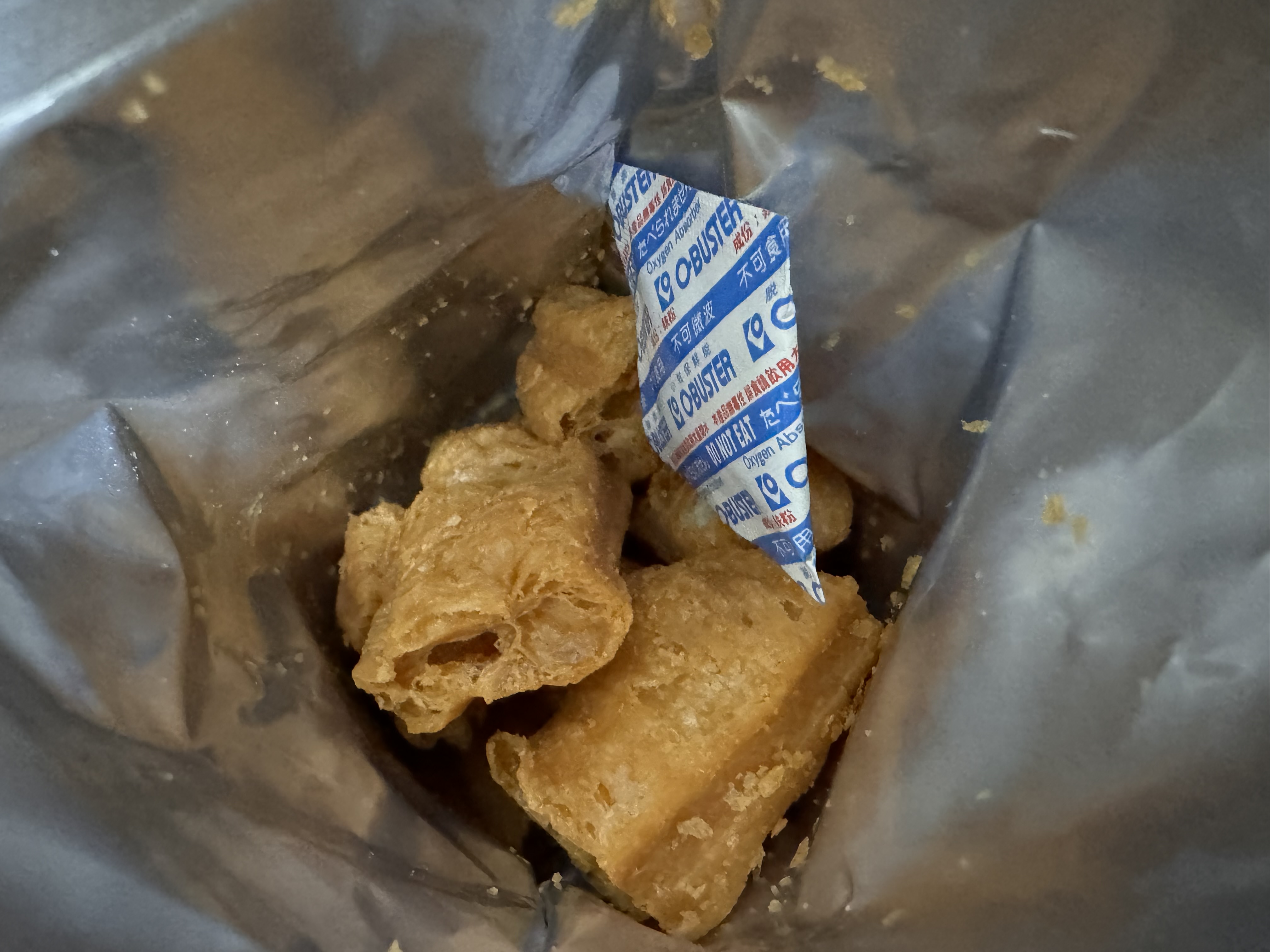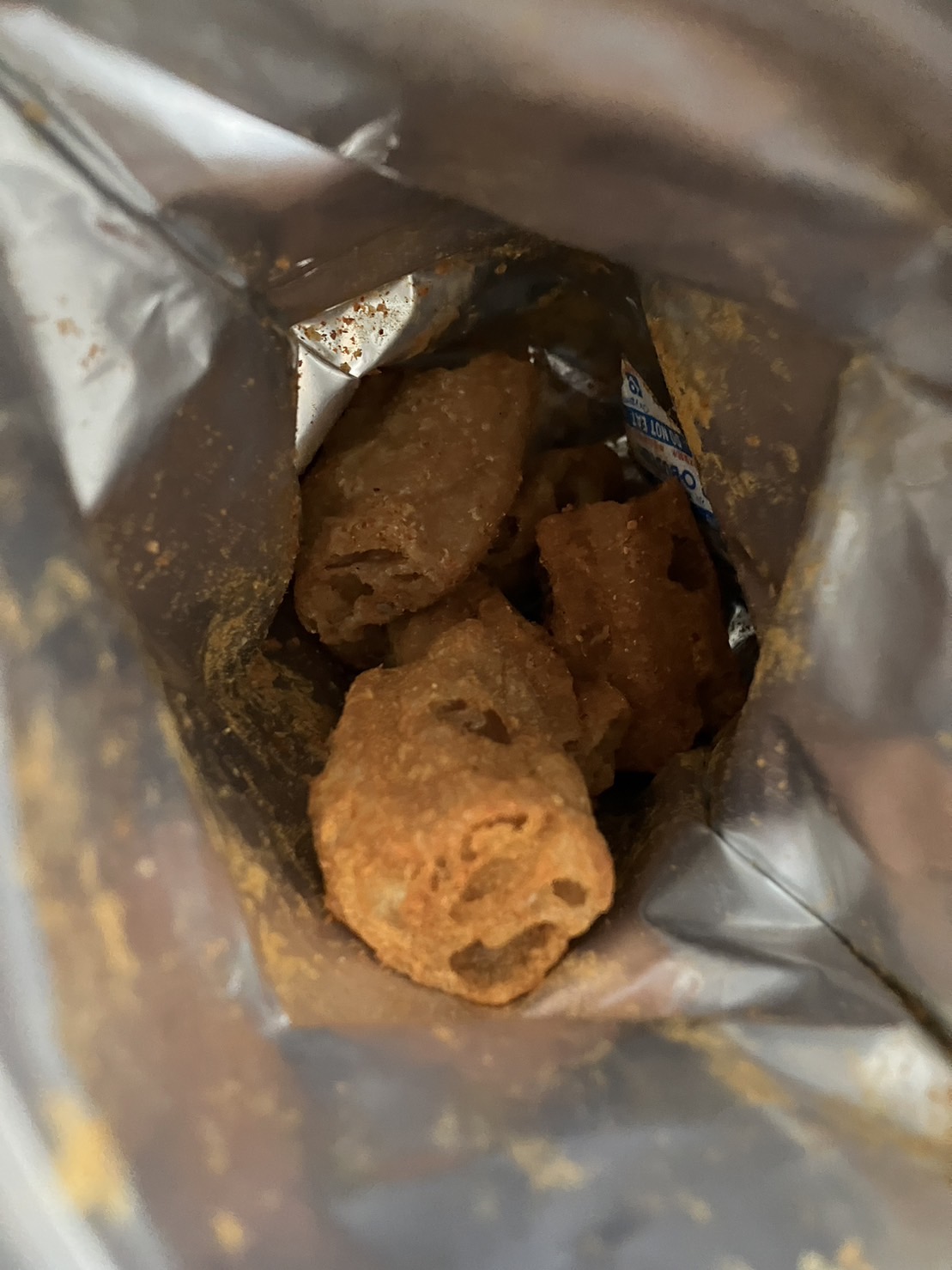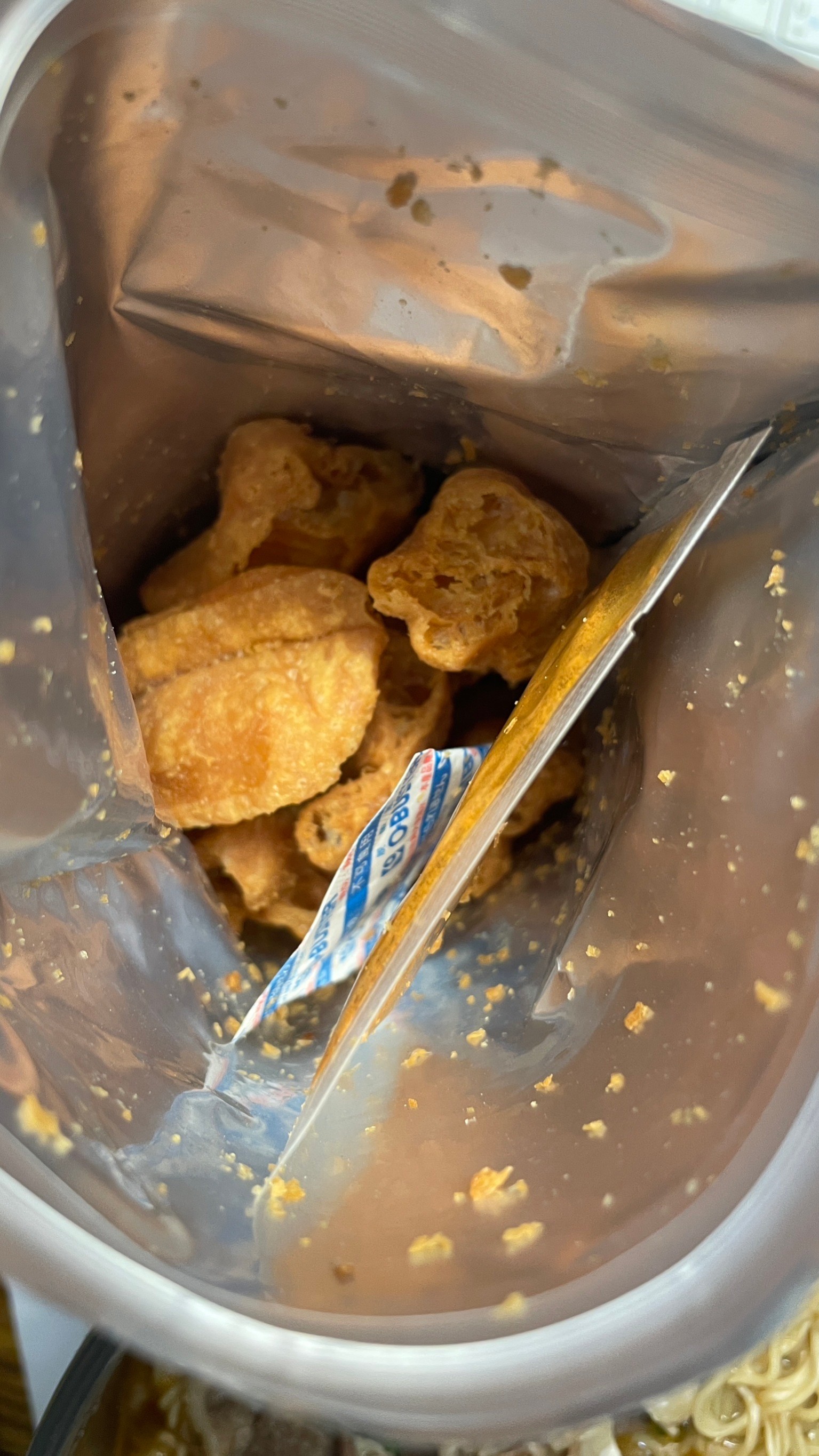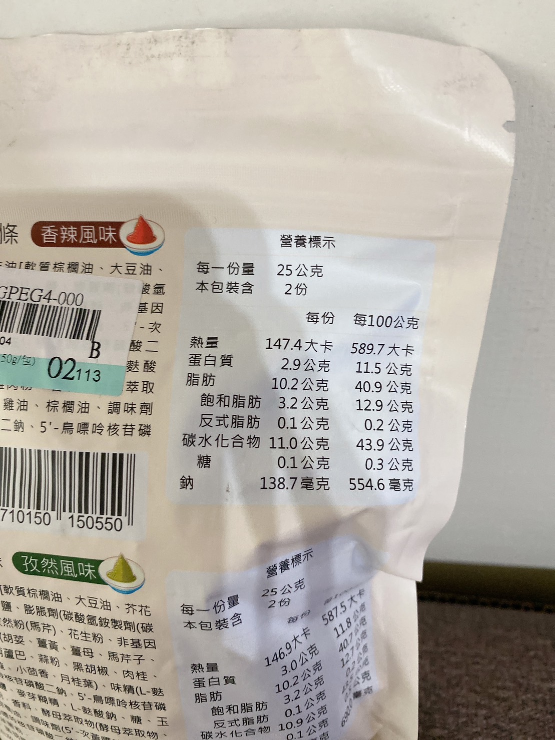 麵粉、油炸油(軟質棕櫚油、大豆油、芥花油、消泡劑(矽樹脂))、鹽、膨脹劑(碳酸氫銨製劑(碳酸氫銨、碳酸鎂))、辣椒粉、非基因改造黃豆粉、豌豆、味精(L-麩酸鈉、5'-次黃嘌呤核苷磷酸二鈉、5'-鳥嘌呤核苷磷酸二鈉)、花生粉、香菇粉(食鹽、香菇、L-麩酸鈉、砂糖、麥芽糊精、葡萄糖、大豆水解蛋白、醬油、蘑菇、5'-次黃嘌呤核苷磷酸二鈉、5'-鳥嘌呤核苷磷酸二鈉、胺基乙酸、酵母抽出物、黑胡椒、氧化澱粉、葵花籽油、芥花油、糊精、琥珀酸、碳酸鉀、檸檬酸)、青花椒粉、花椒粉、糖、芝麻、香料粉(八角、當歸、黨蔘、甘草)、二氧化矽
