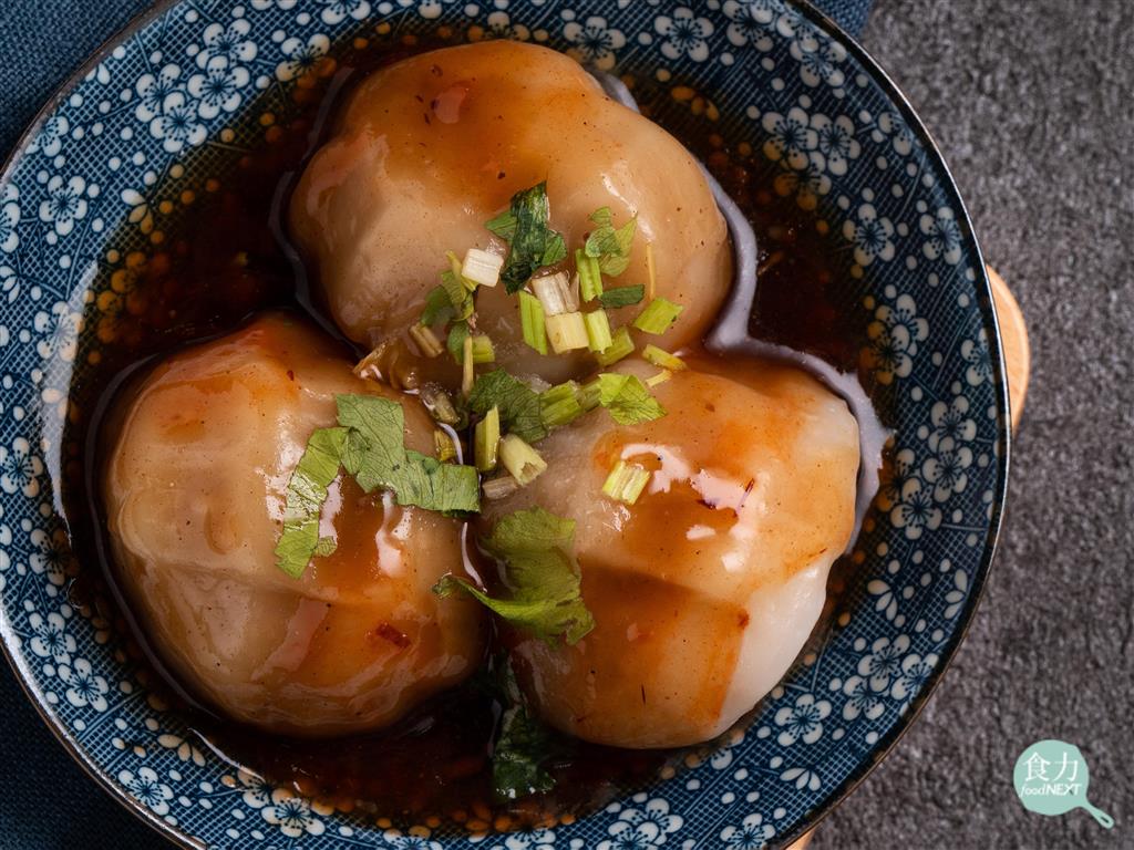 不過也有像是「阿三肉圓」和「北門口」這種炸到皮酥的肉圓,內餡有北海道干貝、豬肉絲、花菇與鴨蛋。肉圓保留一些部分不要蘸到醬汁的話,更能享受到它獨特的口感。配上一碗以豬的脊椎骨抽出的骨髓與蛋做成的蒸蛋再沖入高湯的龍骨髓湯,極美。